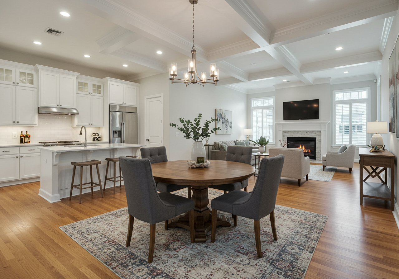 Within walking distance of the community pool, playgrounds, a local coffee shop, fishing ponds, walking trails, bocce ball court, fire pits, and only four miles away from Wrightsville Beach. This home is light and bright with an open flowing floor plan with quiet serenity that provides the perfect escape from life's hustle and bustle. Upon entry, you're greeted with a cozy living room featuring 10 ft. coffered ceilings, a fireplace with gas logs, the dining area, and kitchen. The beautifully designed kitchen boasts custom upper and lower cabinetry, stainless steel appliances, and granite countertops. Brazilian KOA hardwood flooring on the main floor provides a rich earthy feeling as you move from room to room. The first floor offers a spacious Ensuite Primary Bedroom with dual vanities.