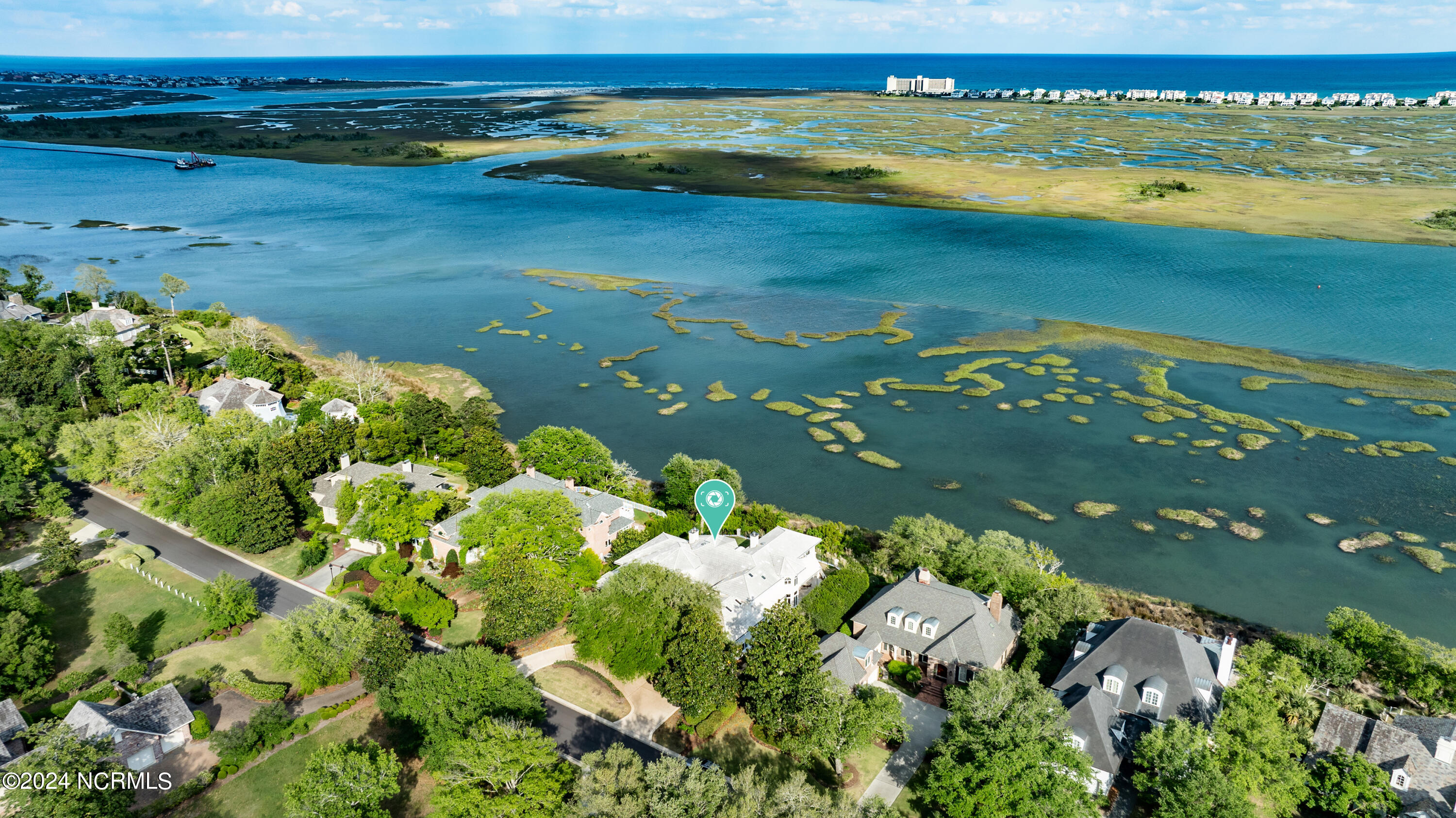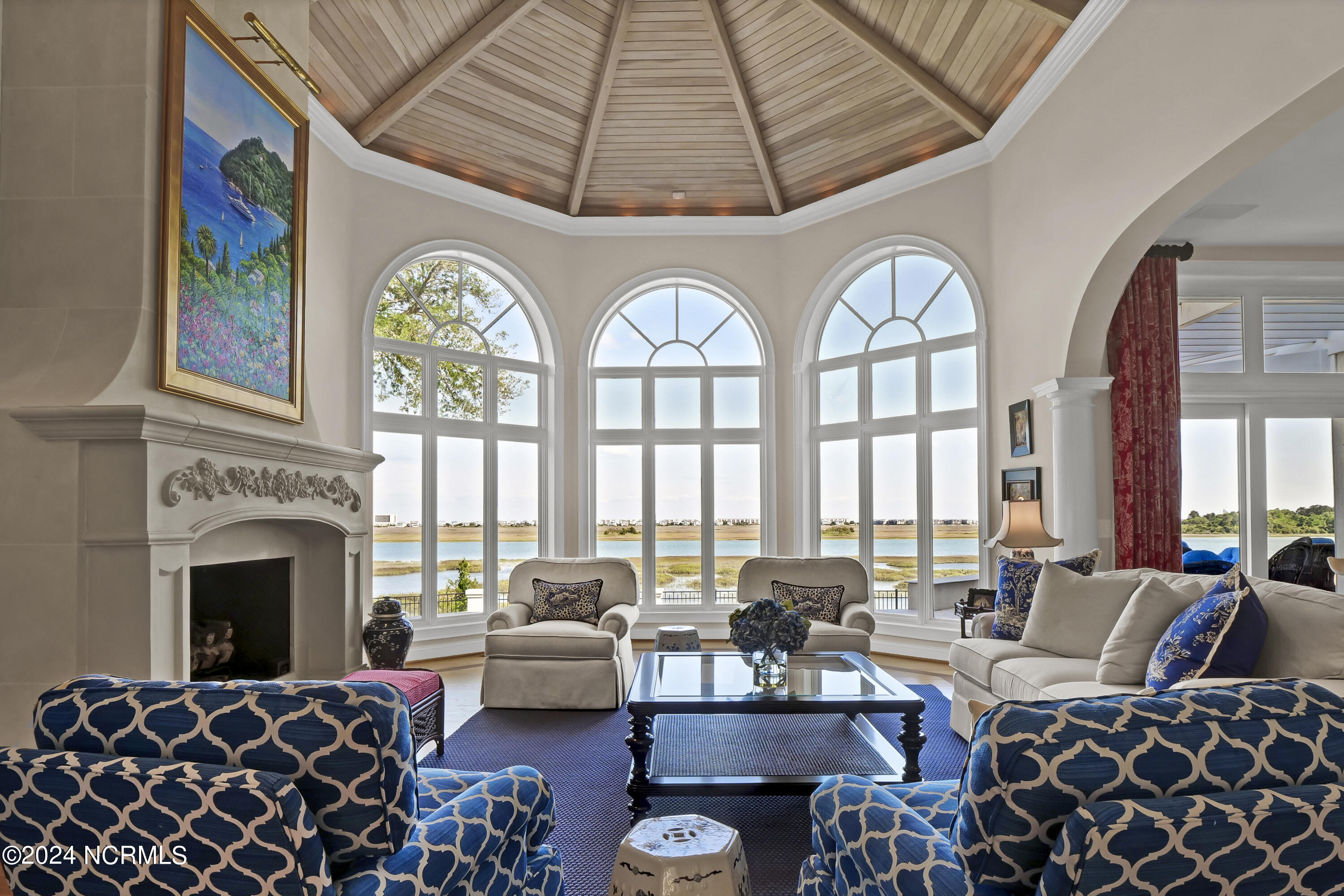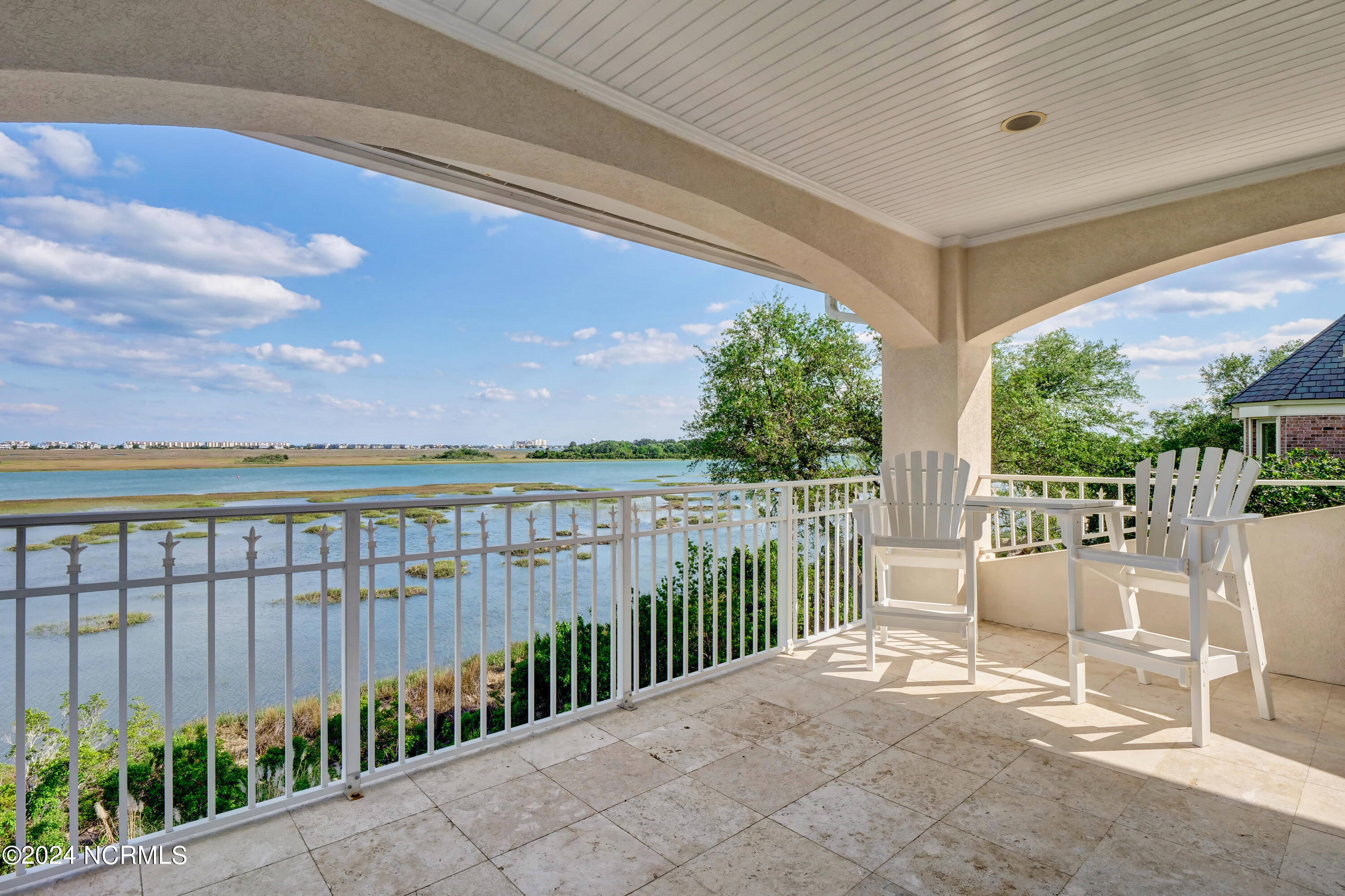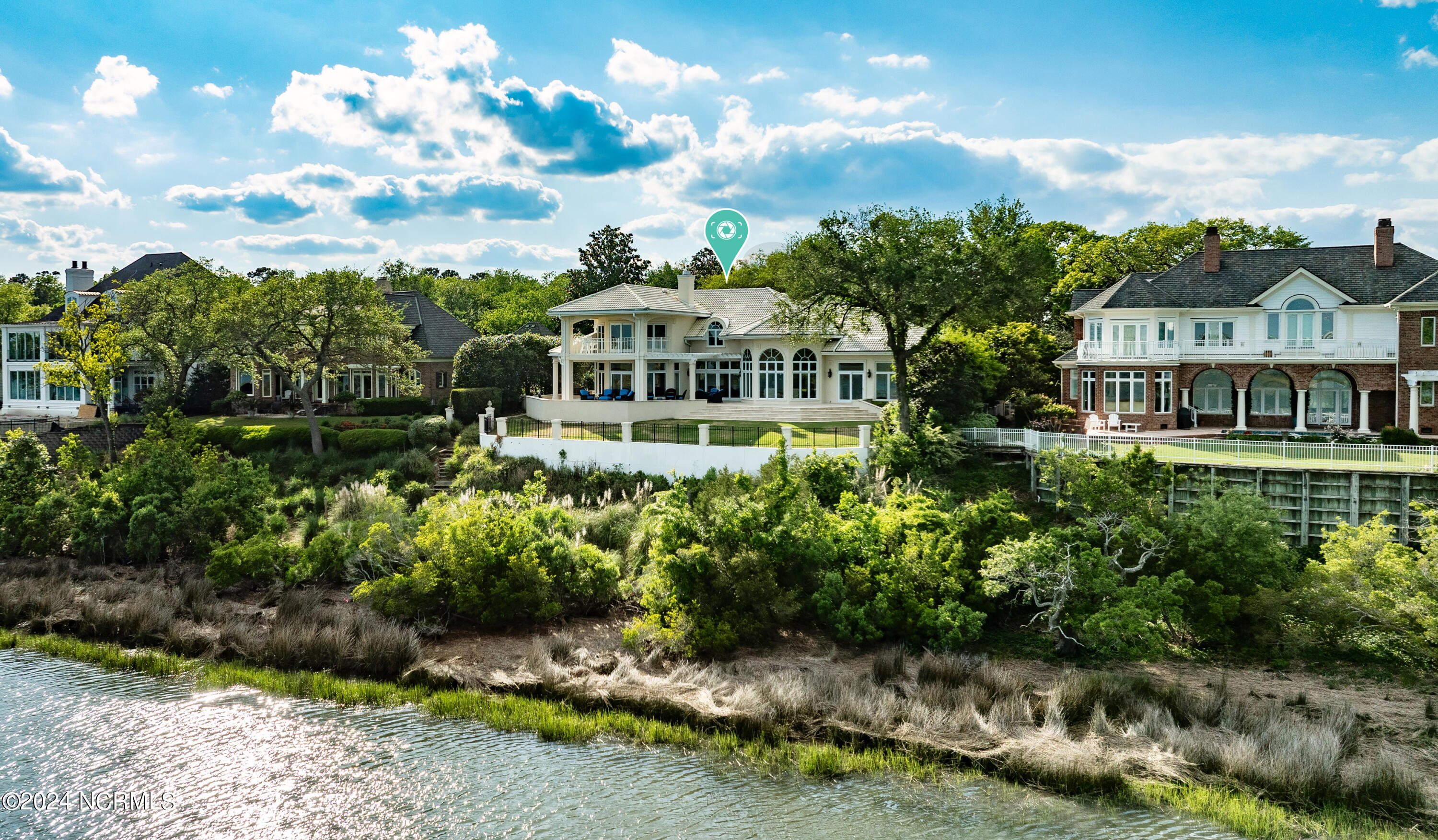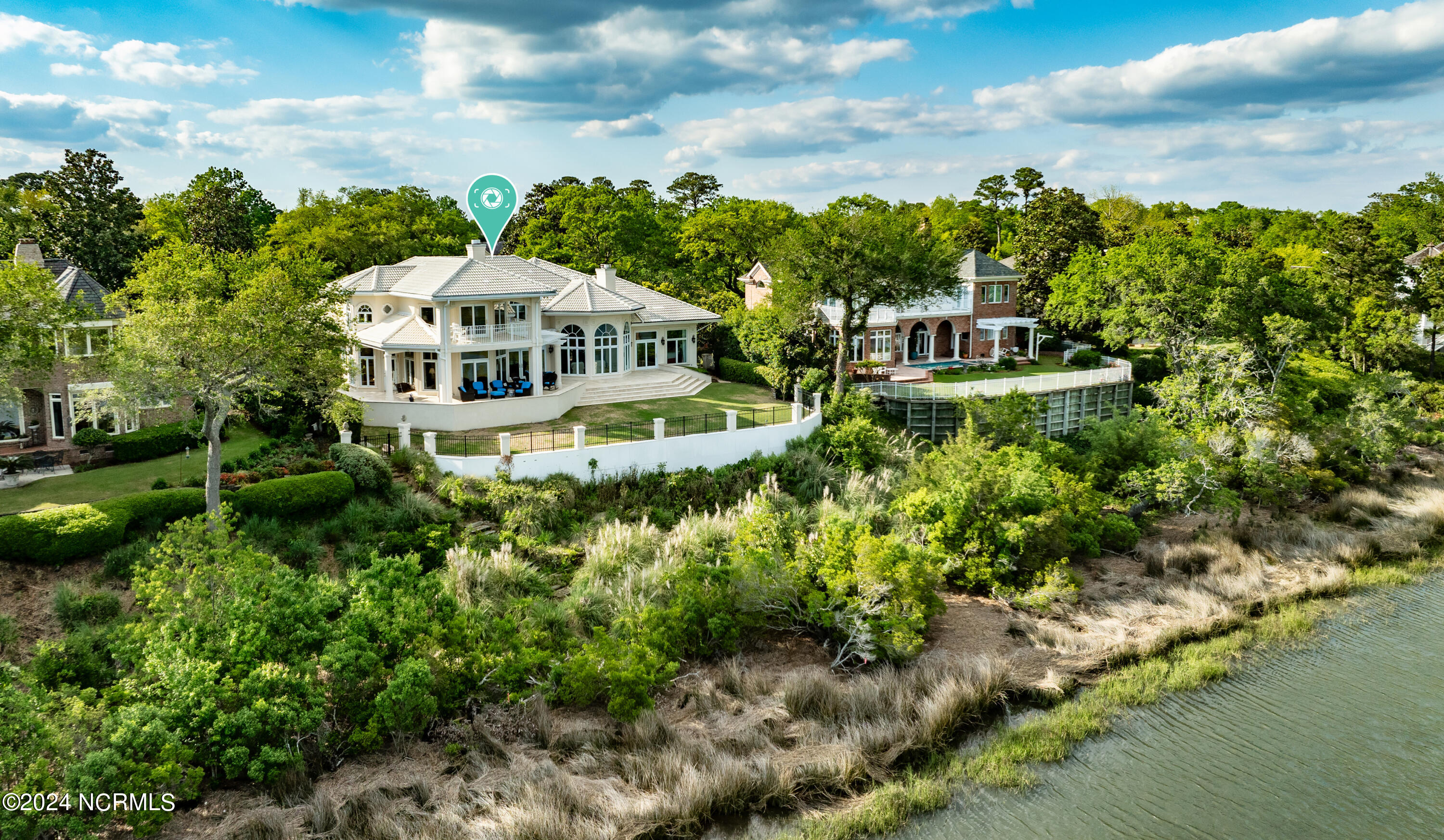 Situated on the Intracoastal Waterway in Landfall, with spectacular views of the ocean and Mason's Inlet, this home is an extraordinary Mediterranean-inspired masterpiece located on Ocean Ridge Drive. The grand entry foyer evokes warmth and luxury with its elegant marble floor, exquisite massive chandelier, and custom wood cathedral ceiling. Curved archways, stately columns, chandelier fixtures, detailed moldings, and gracious arched palladium windows frame the sweeping views of the Intracoastal Waterway, Wrightsville Beach, and Figure 8 Island. Outside, panoramic water views provide the perfect backdrop for outdoor entertaining on the expansive covered porch and patio. The kitchen features an oversized center island and breakfast nook, Thermador gas cooktop, Sub-Zero Designer Series refrigerator, and granite countertops. The kitchen opens up to an inviting sun and sitting room with marble fireplace and large windows overlooking the water views. The formal living great room features a custom wood burning, marble fireplace and walls of two-story palladium windows, a majestic wood cathedral ceiling, and formal dining area overlooking the water views. Entertain your guests from the adjoining full-sized custom bar area with beveled glass shelving, custom stained glass window, sink, cooler, and built-in wine rack. The generous sized main floor owner's suite has a tray ceiling with backlighting, crown molding, and wood-burning marble fireplace flanked by custom built-in cabinets and shelving, double walk-in closets. The marble tile bathroom features designer Sherle Wagner fixtures. Beautiful wallpaper accents the luxury ensuite as well as the two powder rooms and laundry room on the main floor. The three elegant guest rooms upstairs are also complemented with beautiful wall-papered ensuite baths, and one bedroom balcony overlooking water views. The second floor also boasts a beautiful custom walk-in closet and large bonus room.