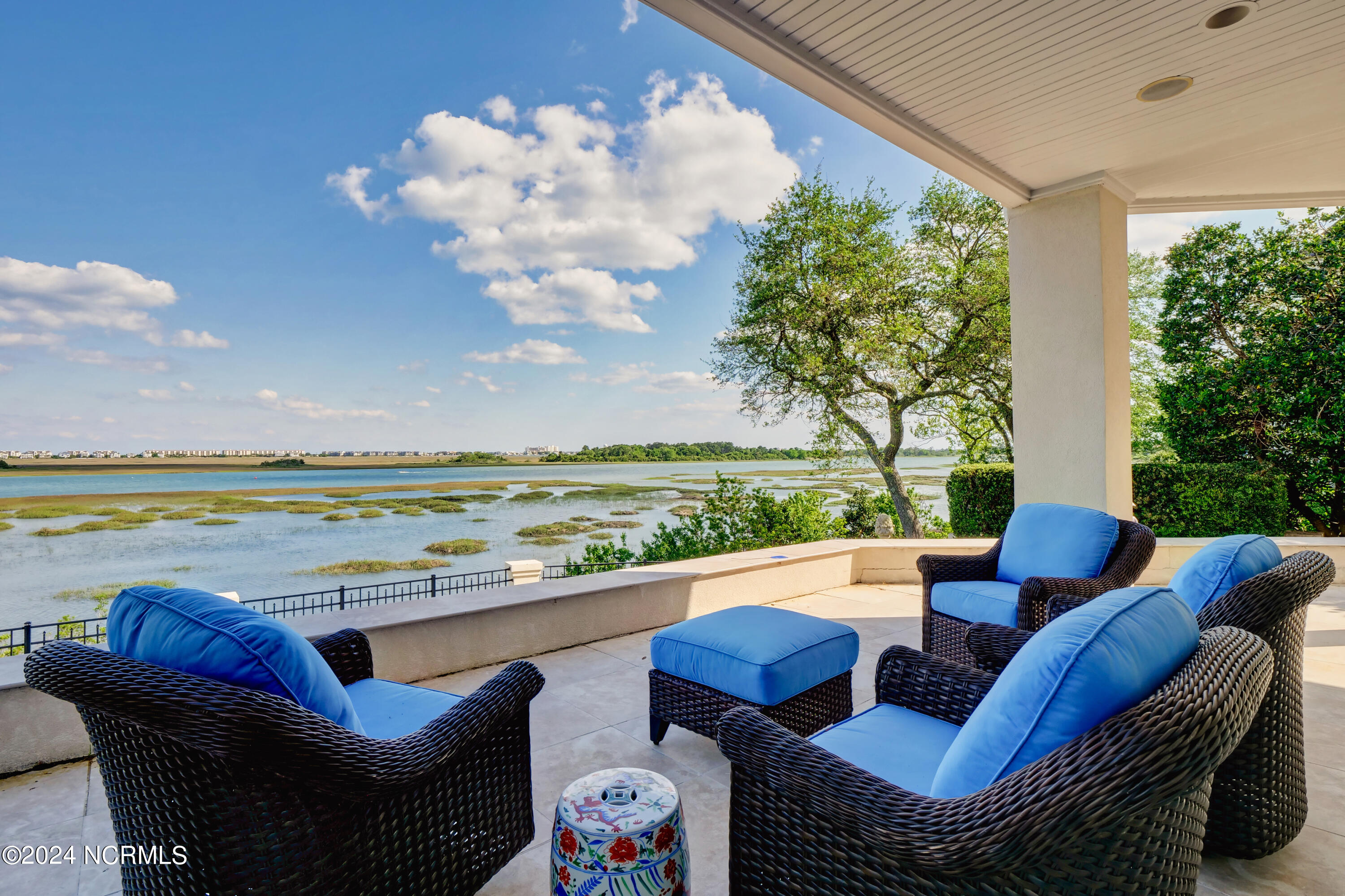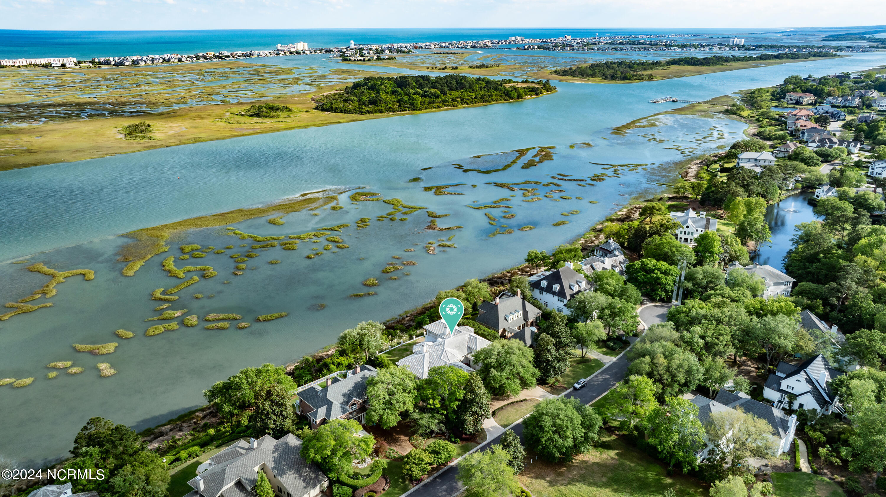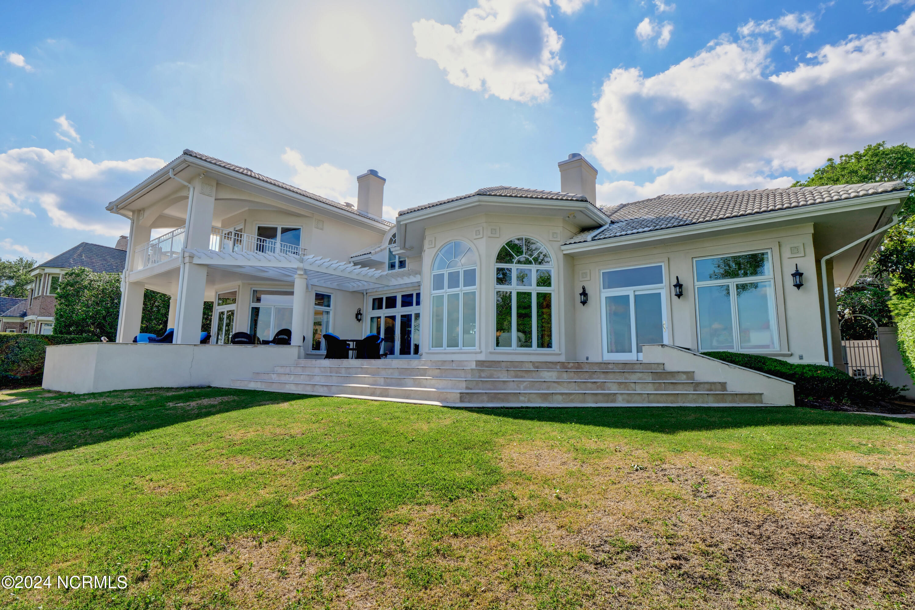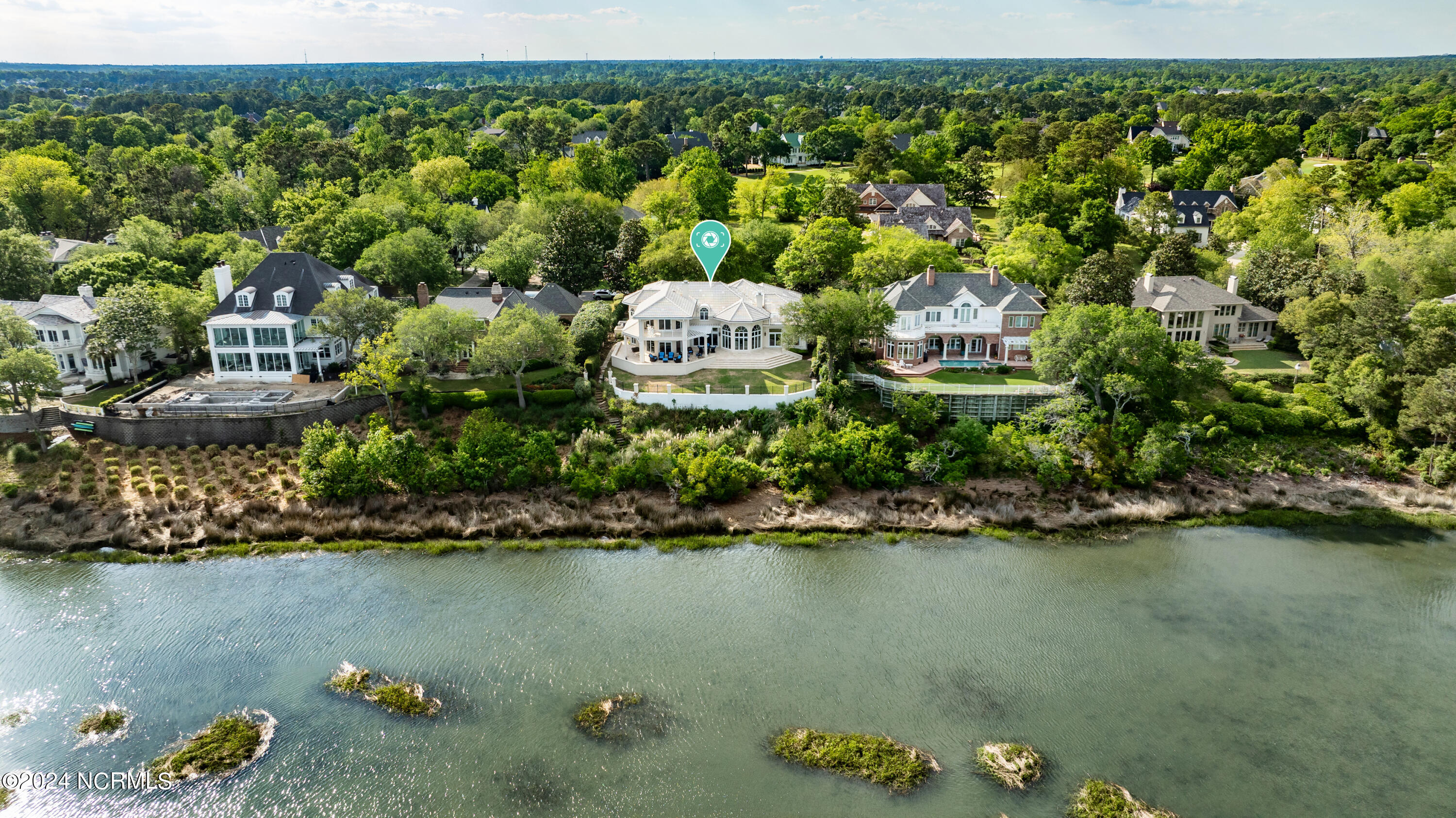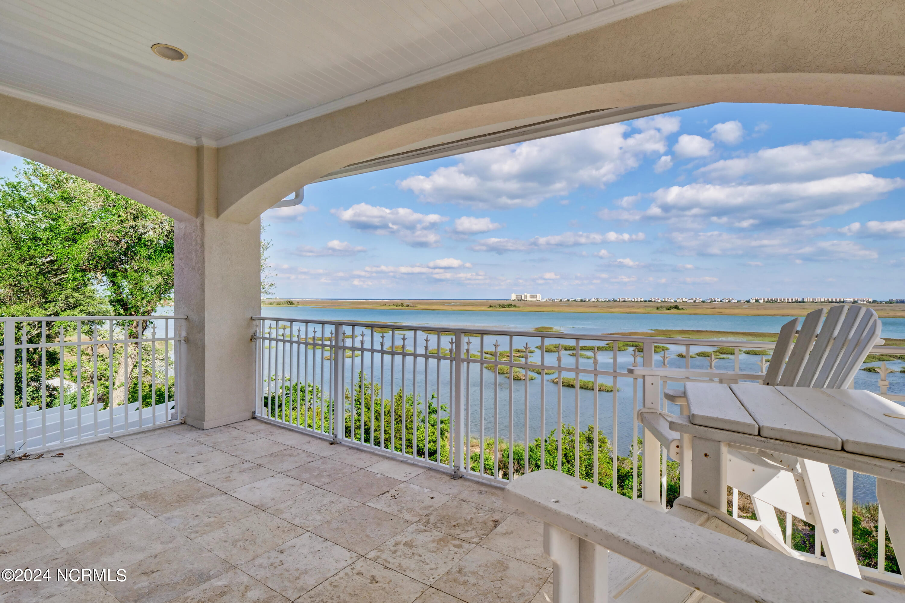 Situated on the Intracoastal Waterway in Landfall, with spectacular views of the ocean and Mason's Inlet, this home is an extraordinary Mediterranean-inspired masterpiece located on Ocean Ridge Drive. The grand entry foyer evokes warmth and luxury with its elegant marble floor, exquisite massive chandelier, and custom wood cathedral ceiling. Curved archways, stately columns, chandelier fixtures, detailed moldings, and gracious arched palladium windows frame the sweeping views of the Intracoastal Waterway, Wrightsville Beach, and Figure 8 Island. Outside, panoramic water views provide the perfect backdrop for outdoor entertaining on the expansive covered porch and patio. The kitchen features an oversized center island and breakfast nook, Thermador gas cooktop, Sub-Zero Designer Series refrigerator, and granite countertops. The kitchen opens up to an inviting sun and sitting room with marble fireplace and large windows overlooking the water views. The formal living great room features a custom wood burning, marble fireplace and walls of two-story palladium windows, a majestic wood cathedral ceiling, and formal dining area overlooking the water views. Entertain your guests from the adjoining full-sized custom bar area with beveled glass shelving, custom stained glass window, sink, cooler, and built-in wine rack. The generous sized main floor owner's suite has a tray ceiling with backlighting, crown molding, and wood-burning marble fireplace flanked by custom built-in cabinets and shelving, double walk-in closets. The marble tile bathroom features designer Sherle Wagner fixtures. Beautiful wallpaper accents the luxury ensuite as well as the two powder rooms and laundry room on the main floor. The three elegant guest rooms upstairs are also complemented with beautiful wall-papered ensuite baths, and one bedroom balcony overlooking water views. The second floor also boasts a beautiful custom walk-in closet and large bonus room.