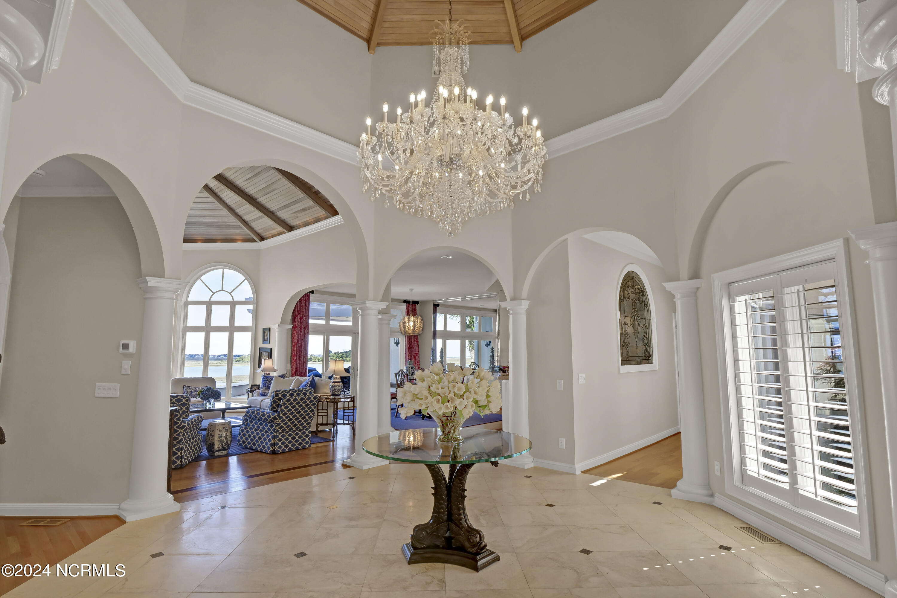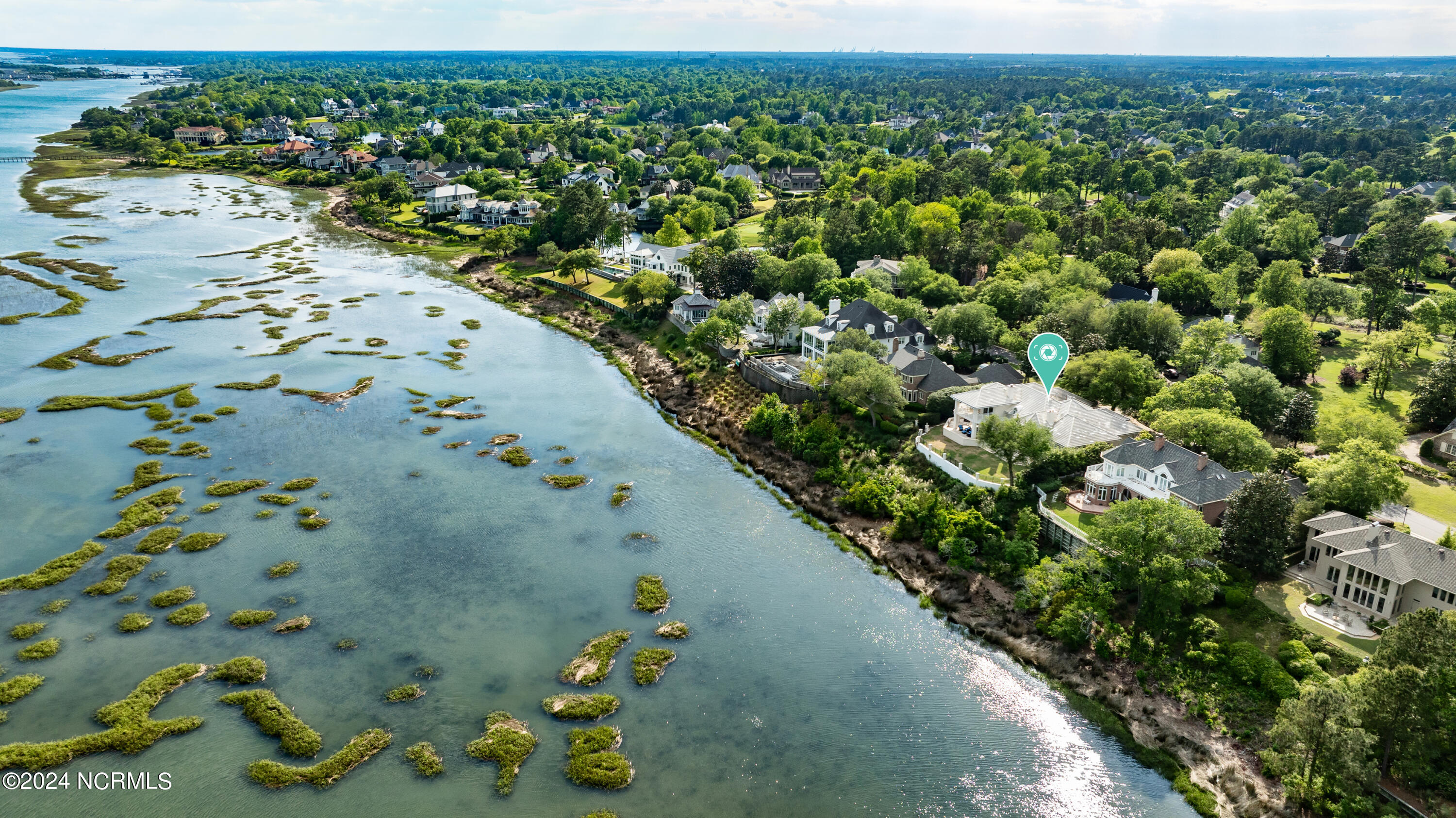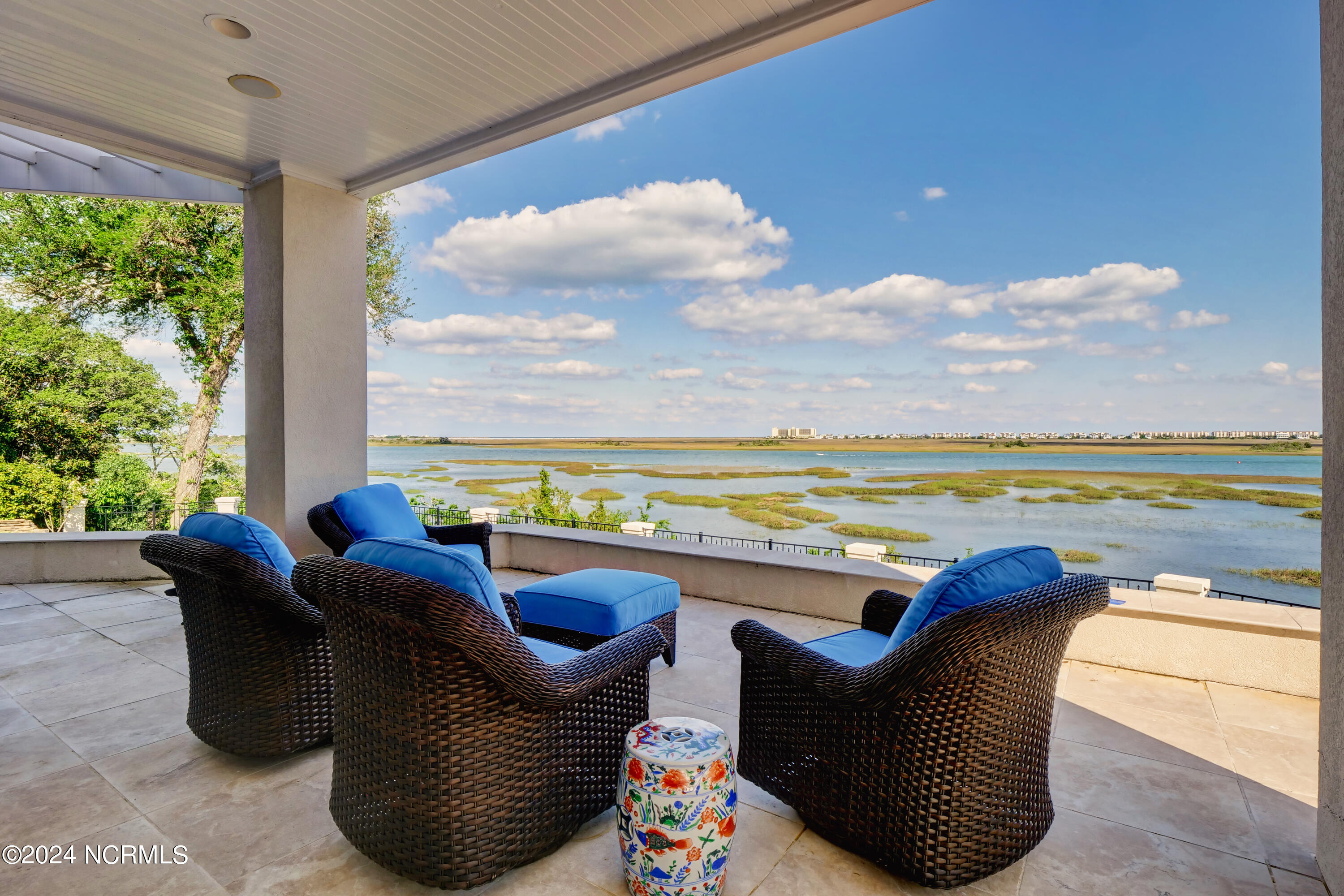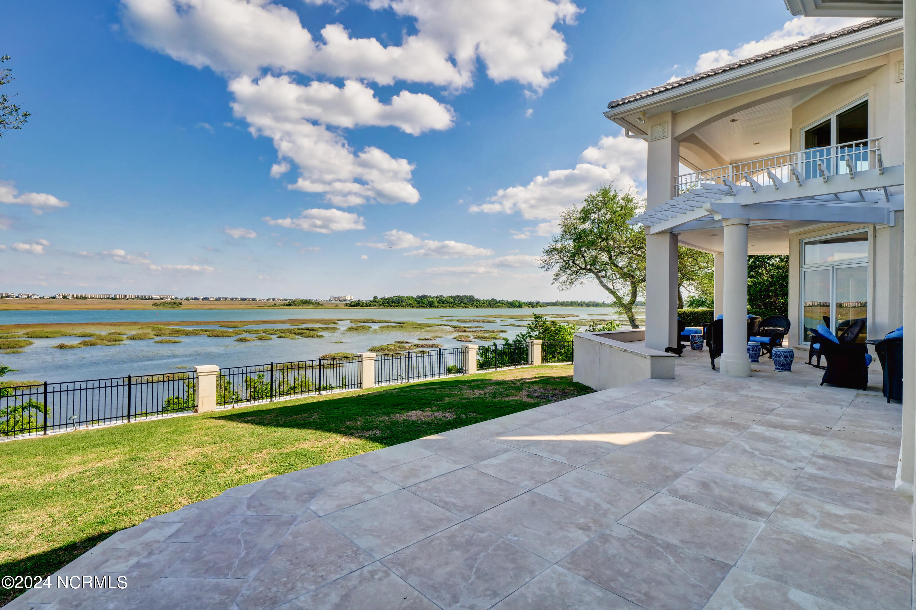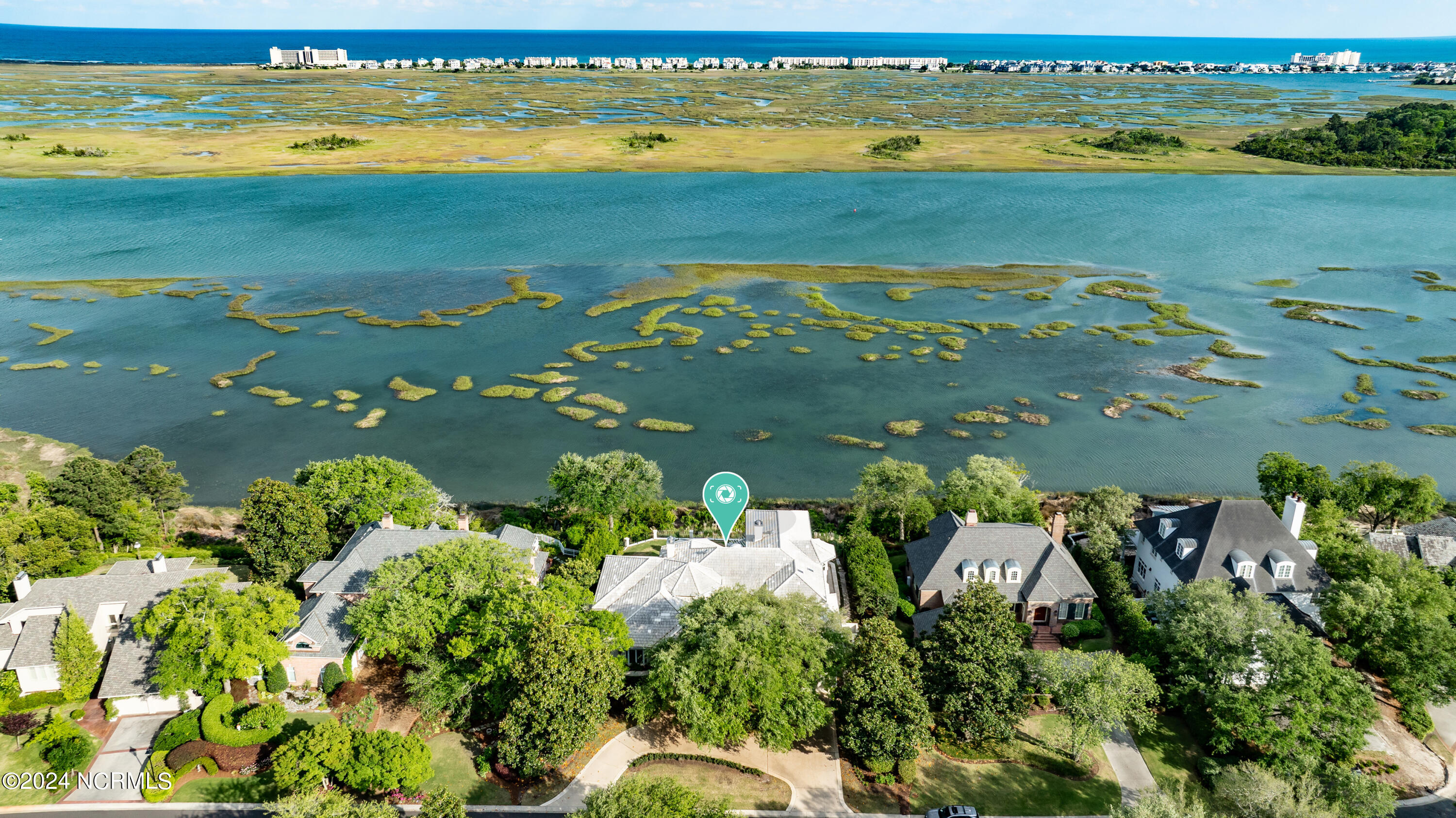 Situated on the Intracoastal Waterway in Landfall, with spectacular views of the ocean and Mason's Inlet, this home is an extraordinary Mediterranean-inspired masterpiece located on Ocean Ridge Drive. The grand entry foyer evokes warmth and luxury with its elegant marble floor, exquisite massive chandelier, and custom wood cathedral ceiling. Curved archways, stately columns, chandelier fixtures, detailed moldings, and gracious arched palladium windows frame the sweeping views of the Intracoastal Waterway, Wrightsville Beach, and Figure 8 Island. Outside, panoramic water views provide the perfect backdrop for outdoor entertaining on the expansive covered porch and patio. The kitchen features an oversized center island and breakfast nook, Thermador gas cooktop, Sub-Zero Designer Series refrigerator, and granite countertops. The kitchen opens up to an inviting sun and sitting room with marble fireplace and large windows overlooking the water views. The formal living great room features a custom wood burning, marble fireplace and walls of two-story palladium windows, a majestic wood cathedral ceiling, and formal dining area overlooking the water views. Entertain your guests from the adjoining full-sized custom bar area with beveled glass shelving, custom stained glass window, sink, cooler, and built-in wine rack. The generous sized main floor owner's suite has a tray ceiling with backlighting, crown molding, and wood-burning marble fireplace flanked by custom built-in cabinets and shelving, double walk-in closets. The marble tile bathroom features designer Sherle Wagner fixtures. Beautiful wallpaper accents the luxury ensuite as well as the two powder rooms and laundry room on the main floor. The three elegant guest rooms upstairs are also complemented with beautiful wall-papered ensuite baths, and one bedroom balcony overlooking water views. The second floor also boasts a beautiful custom walk-in closet and large bonus room.
