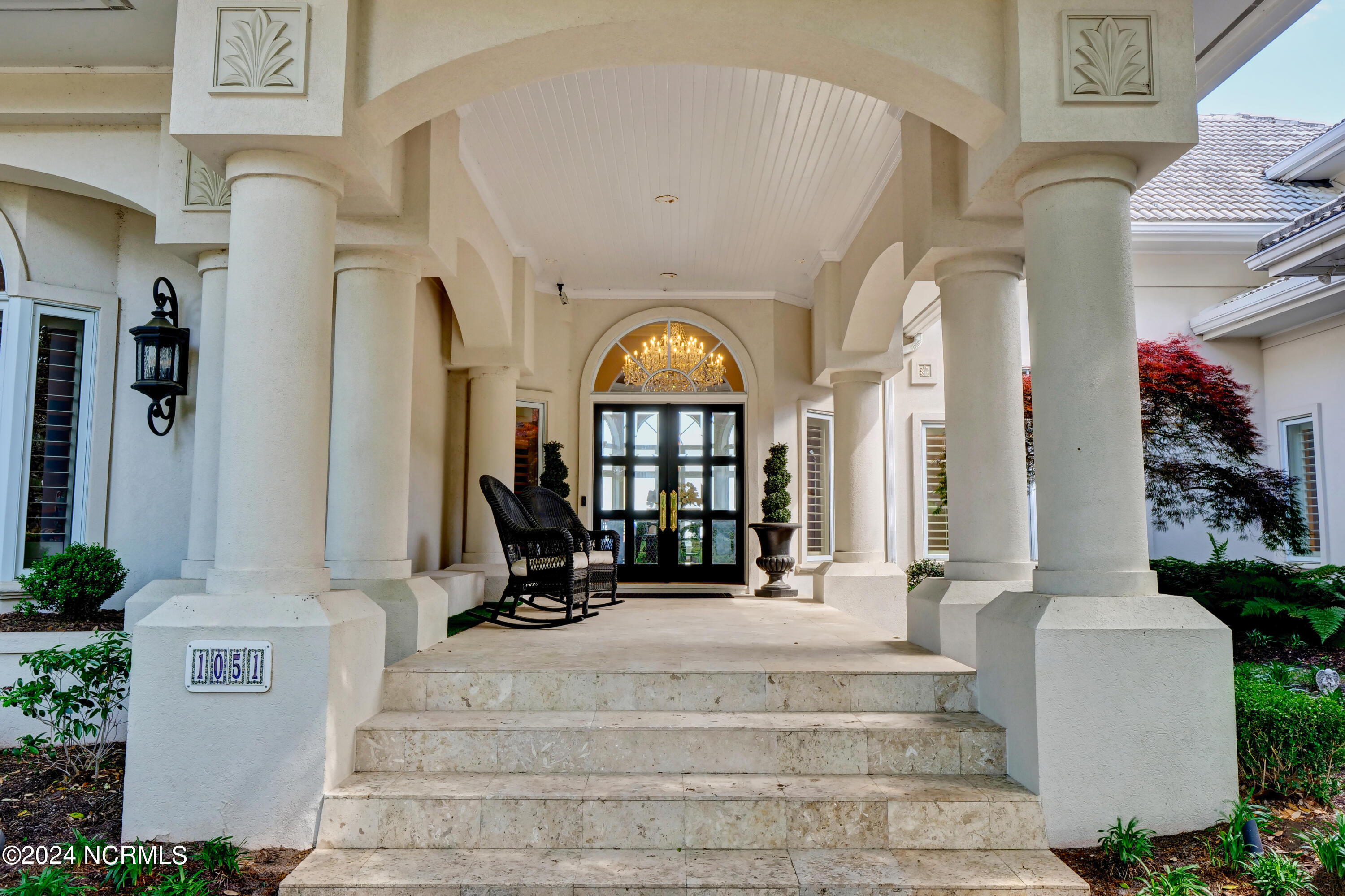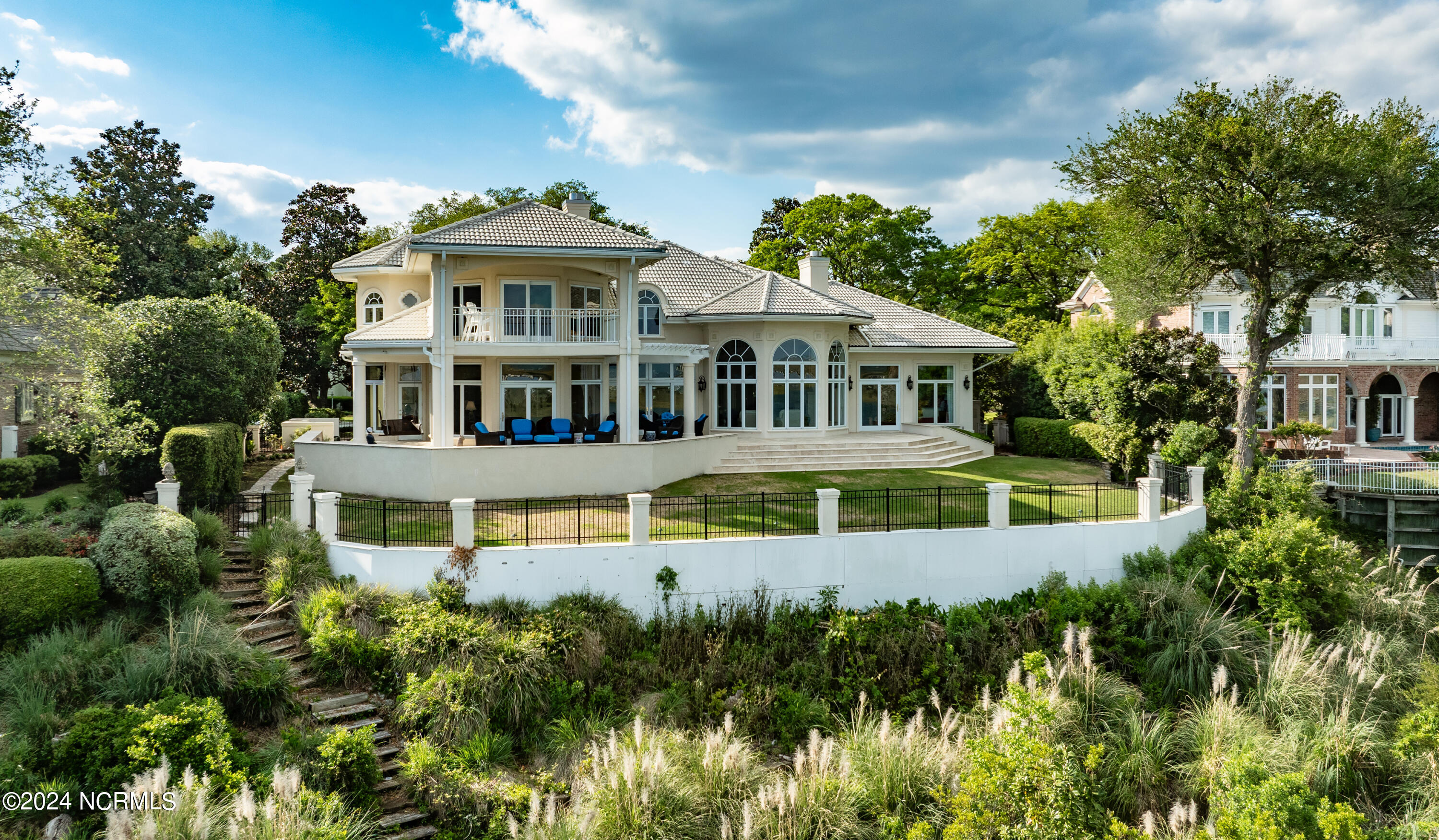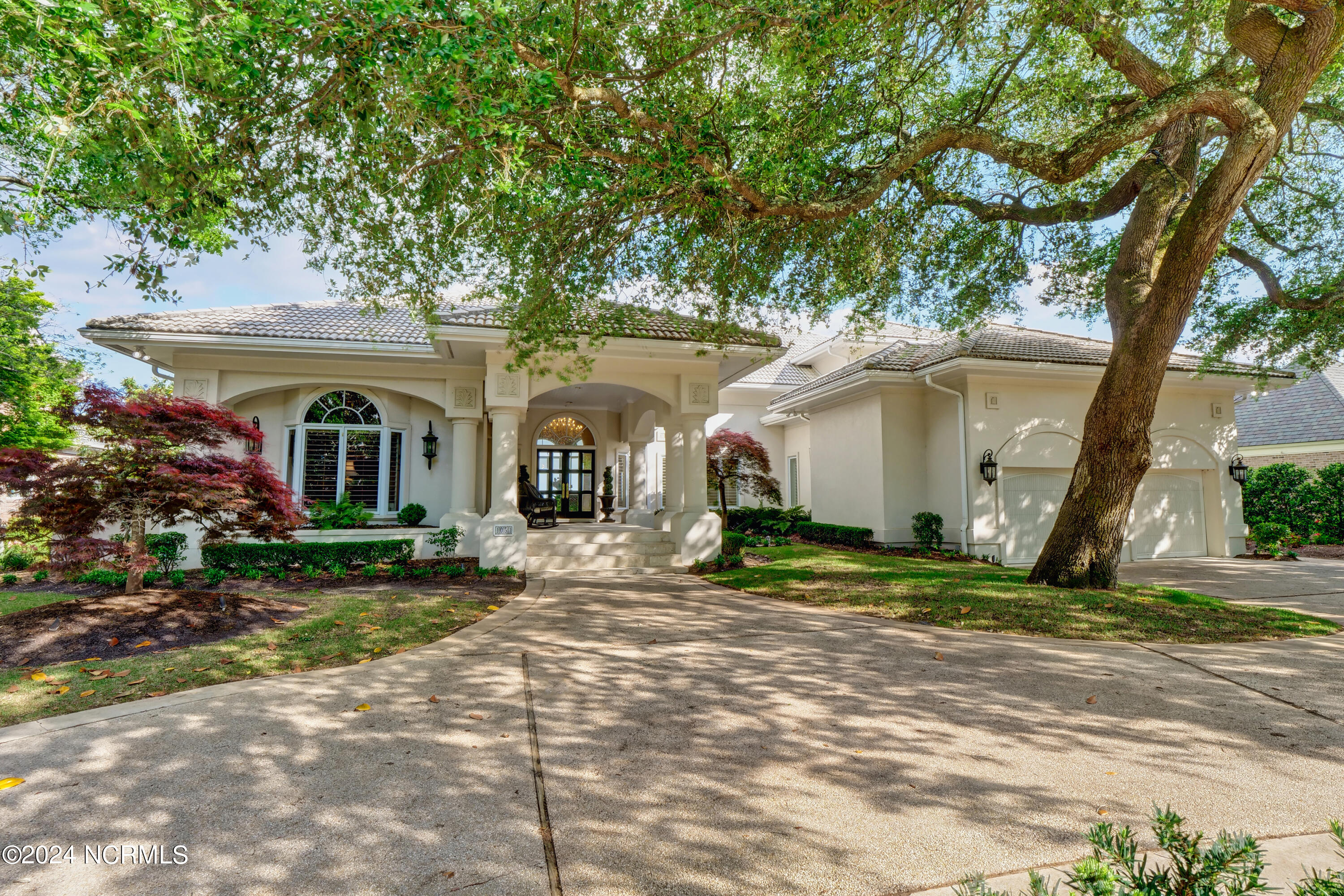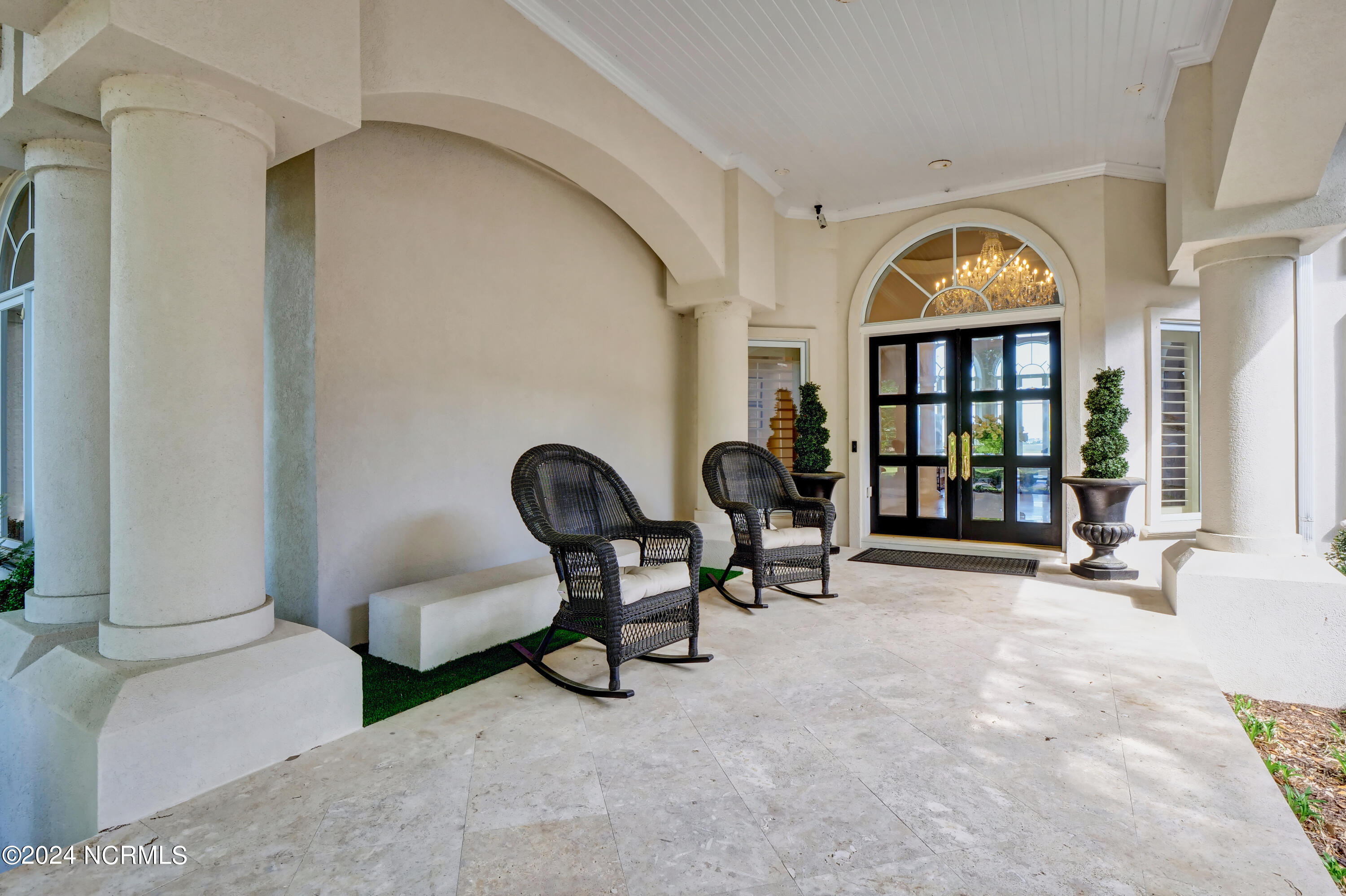 Situated on the Intracoastal Waterway in Landfall, with spectacular views of the ocean and Mason's Inlet, this home is an extraordinary Mediterranean-inspired masterpiece located on Ocean Ridge Drive. The grand entry foyer evokes warmth and luxury with its elegant marble floor, exquisite massive chandelier, and custom wood cathedral ceiling. Curved archways, stately columns, chandelier fixtures, detailed moldings, and gracious arched palladium windows frame the sweeping views of the Intracoastal Waterway, Wrightsville Beach, and Figure 8 Island. Outside, panoramic water views provide the perfect backdrop for outdoor entertaining on the expansive covered porch and patio. The kitchen features an oversized center island and breakfast nook, Thermador gas cooktop, Sub-Zero Designer Series refrigerator, and granite countertops. The kitchen opens up to an inviting sun and sitting room with marble fireplace and large windows overlooking the water views. The formal living great room features a custom wood burning, marble fireplace and walls of two-story palladium windows, a majestic wood cathedral ceiling, and formal dining area overlooking the water views. Entertain your guests from the adjoining full-sized custom bar area with beveled glass shelving, custom stained glass window, sink, cooler, and built-in wine rack. The generous sized main floor owner's suite has a tray ceiling with backlighting, crown molding, and wood-burning marble fireplace flanked by custom built-in cabinets and shelving, double walk-in closets. The marble tile bathroom features designer Sherle Wagner fixtures. Beautiful wallpaper accents the luxury ensuite as well as the two powder rooms and laundry room on the main floor. The three elegant guest rooms upstairs are also complemented with beautiful wall-papered ensuite baths, and one bedroom balcony overlooking water views. The second floor also boasts a beautiful custom walk-in closet and large bonus room.