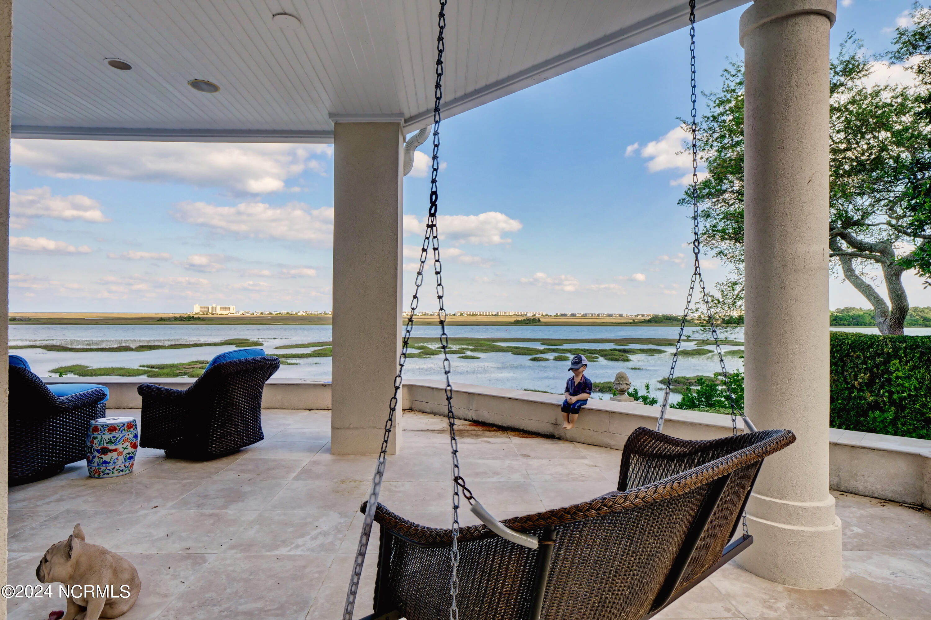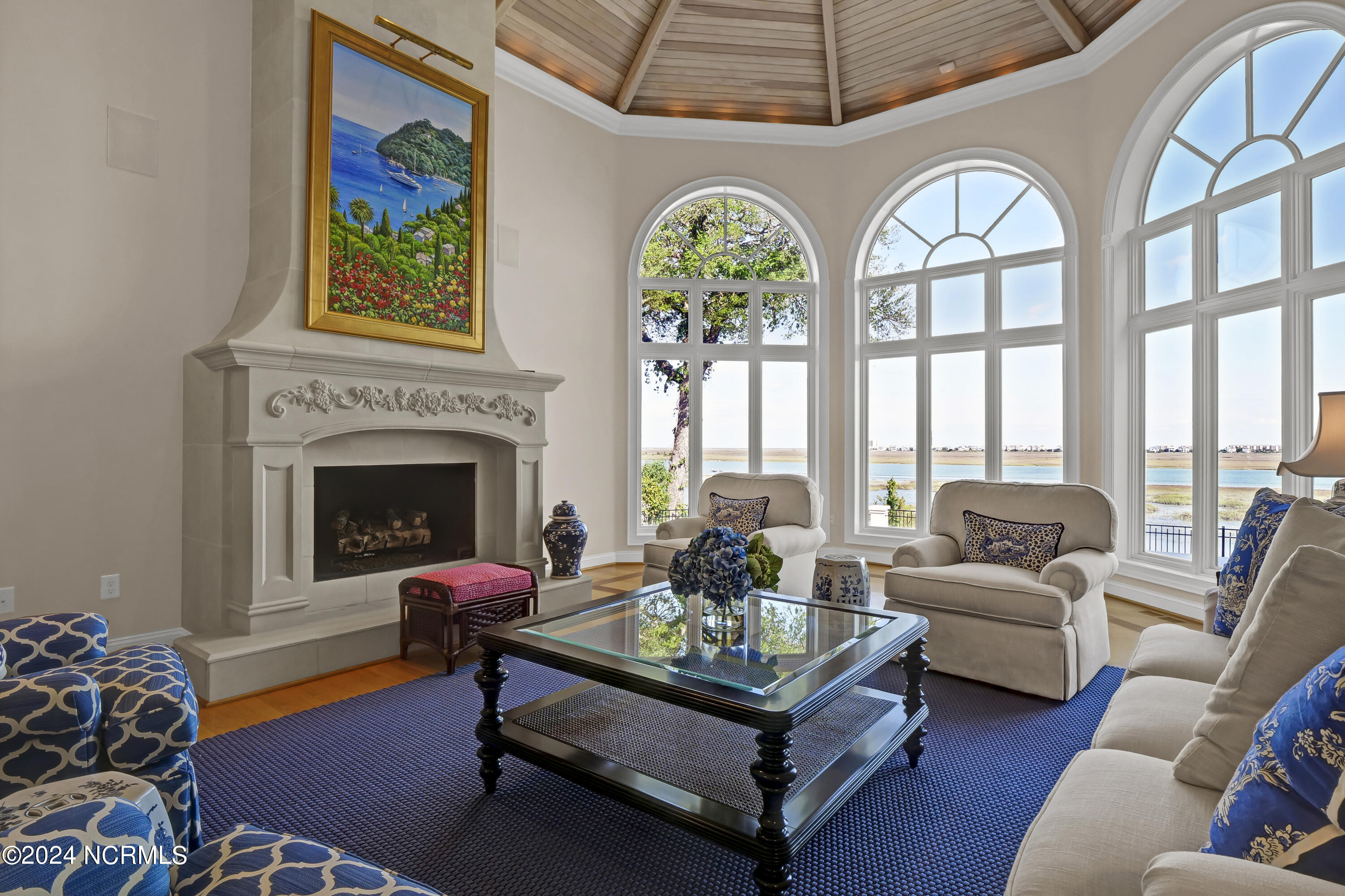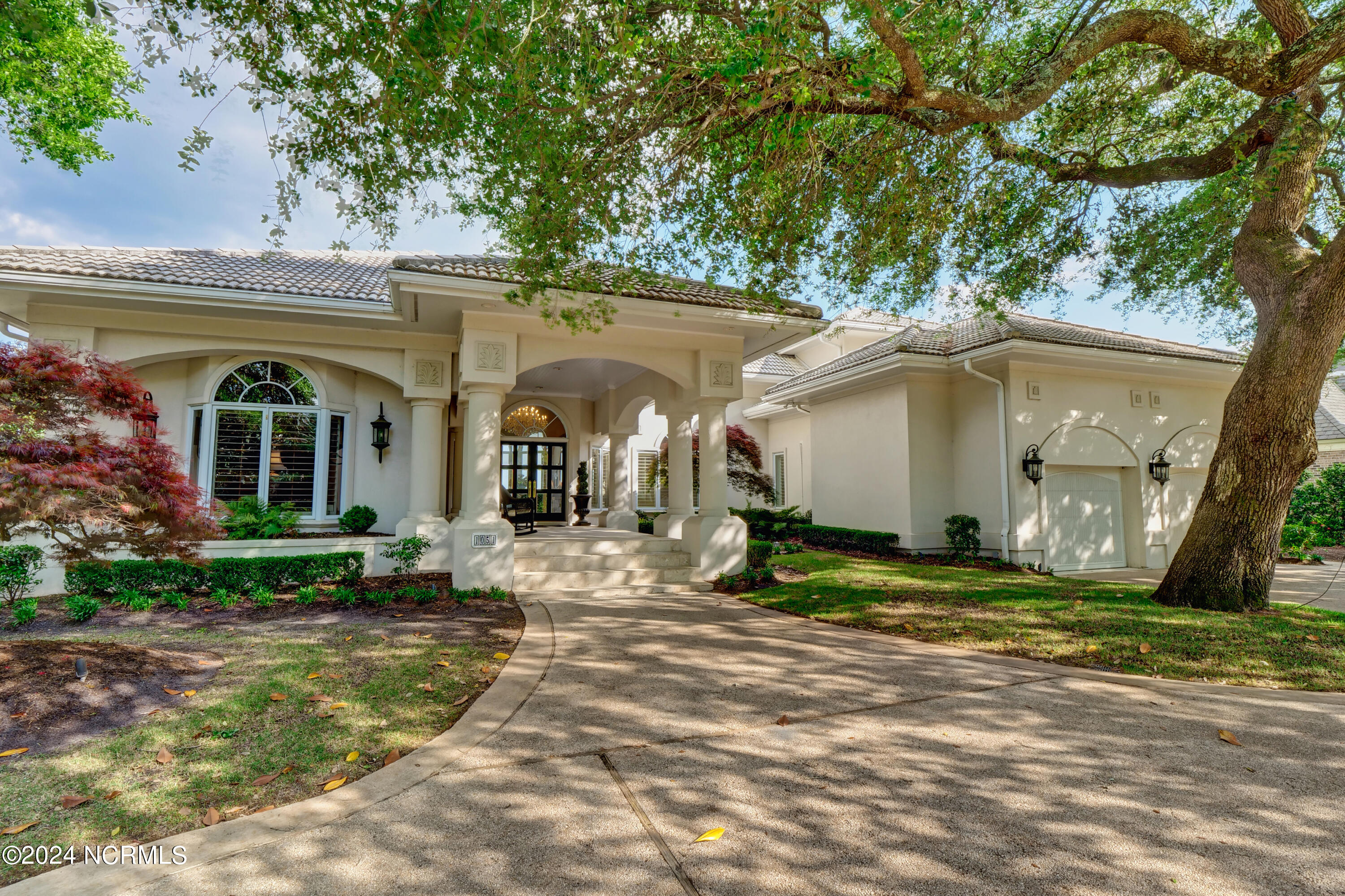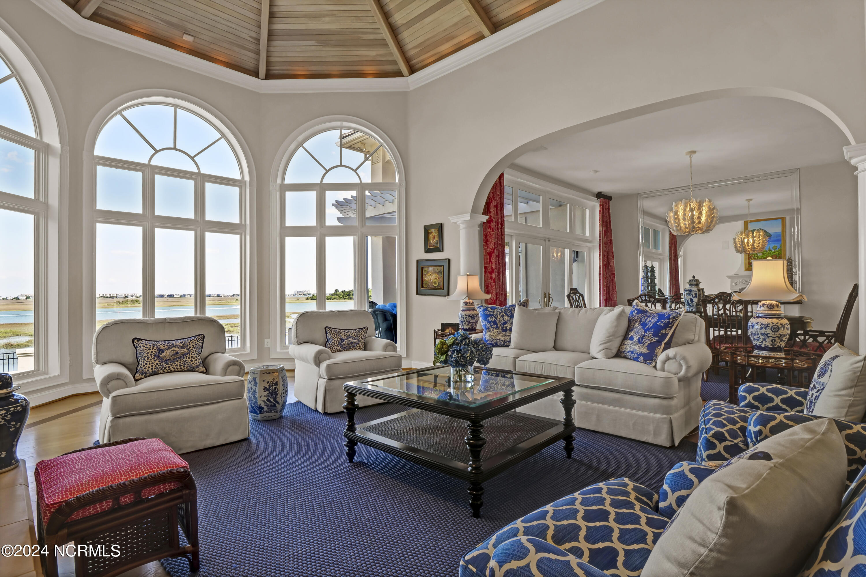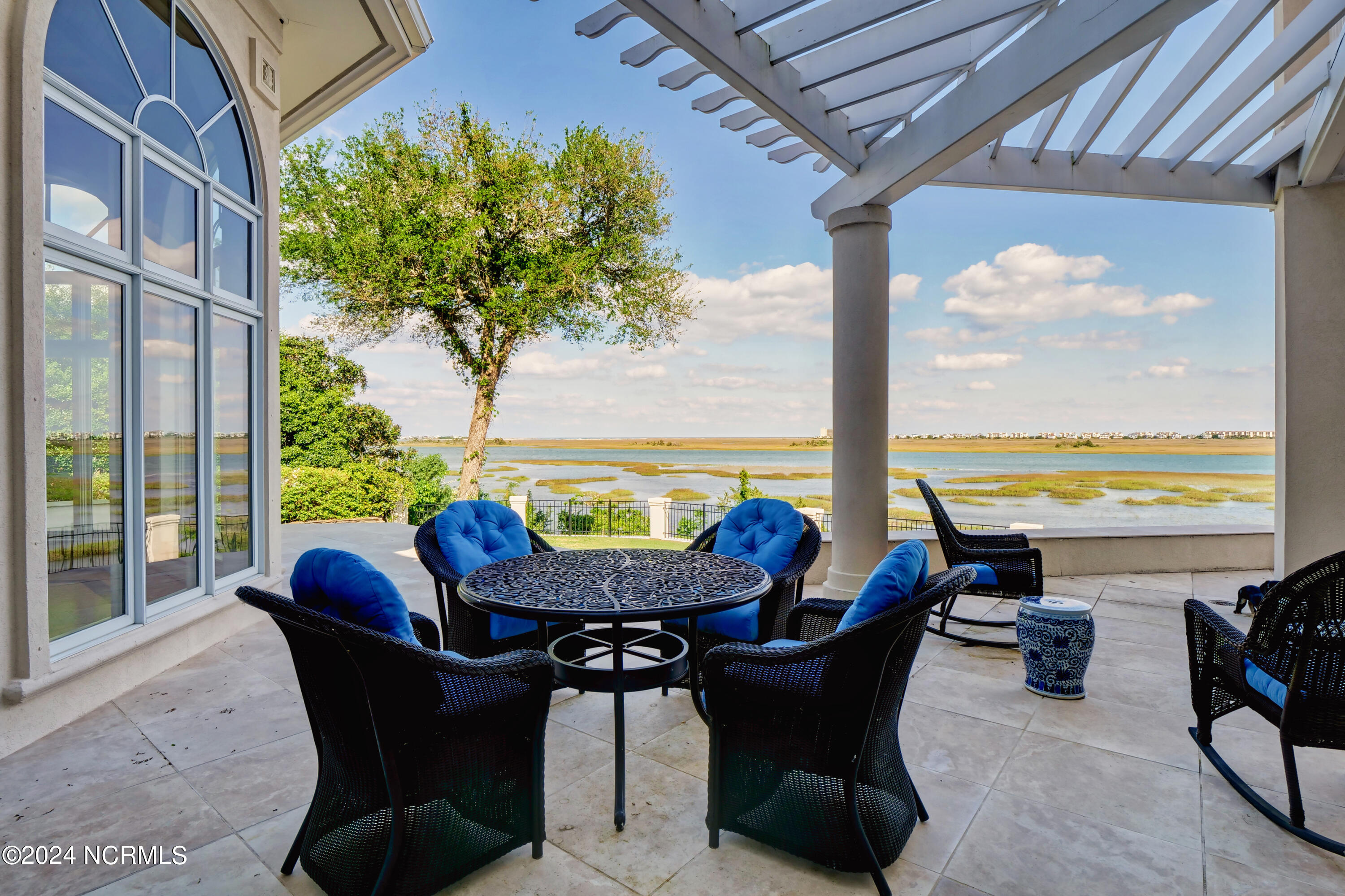 Situated on the Intracoastal Waterway in Landfall, with spectacular views of the ocean and Mason's Inlet, this home is an extraordinary Mediterranean-inspired masterpiece located on Ocean Ridge Drive. The grand entry foyer evokes warmth and luxury with its elegant marble floor, exquisite massive chandelier, and custom wood cathedral ceiling. Curved archways, stately columns, chandelier fixtures, detailed moldings, and gracious arched palladium windows frame the sweeping views of the Intracoastal Waterway, Wrightsville Beach, and Figure 8 Island. Outside, panoramic water views provide the perfect backdrop for outdoor entertaining on the expansive covered porch and patio. The kitchen features an oversized center island and breakfast nook, Thermador gas cooktop, Sub-Zero Designer Series refrigerator, and granite countertops. The kitchen opens up to an inviting sun and sitting room with marble fireplace and large windows overlooking the water views. The formal living great room features a custom wood burning, marble fireplace and walls of two-story palladium windows, a majestic wood cathedral ceiling, and formal dining area overlooking the water views. Entertain your guests from the adjoining full-sized custom bar area with beveled glass shelving, custom stained glass window, sink, cooler, and built-in wine rack. The generous sized main floor owner's suite has a tray ceiling with backlighting, crown molding, and wood-burning marble fireplace flanked by custom built-in cabinets and shelving, double walk-in closets. The marble tile bathroom features designer Sherle Wagner fixtures. Beautiful wallpaper accents the luxury ensuite as well as the two powder rooms and laundry room on the main floor. The three elegant guest rooms upstairs are also complemented with beautiful wall-papered ensuite baths, and one bedroom balcony overlooking water views. The second floor also boasts a beautiful custom walk-in closet and large bonus room.
