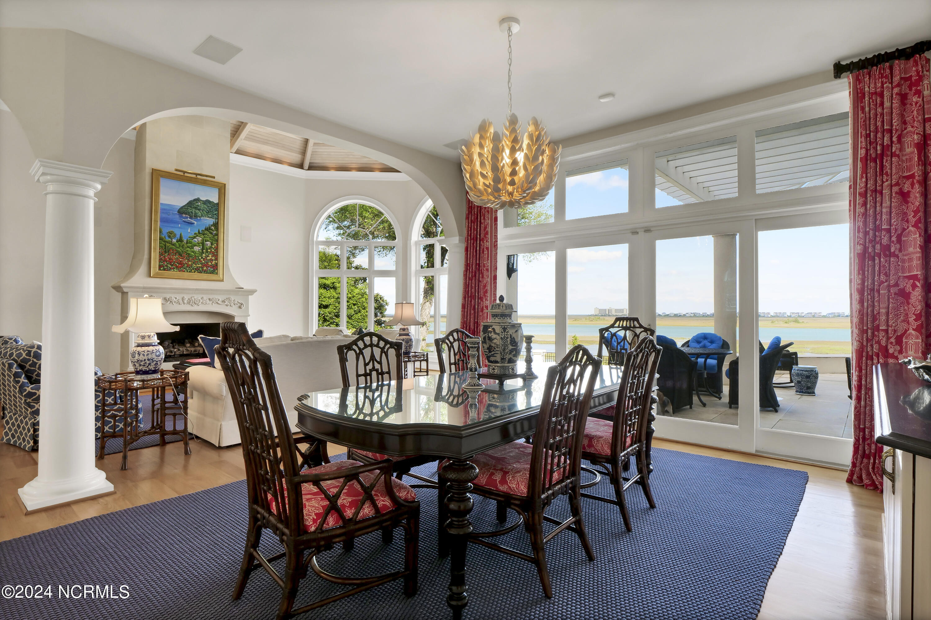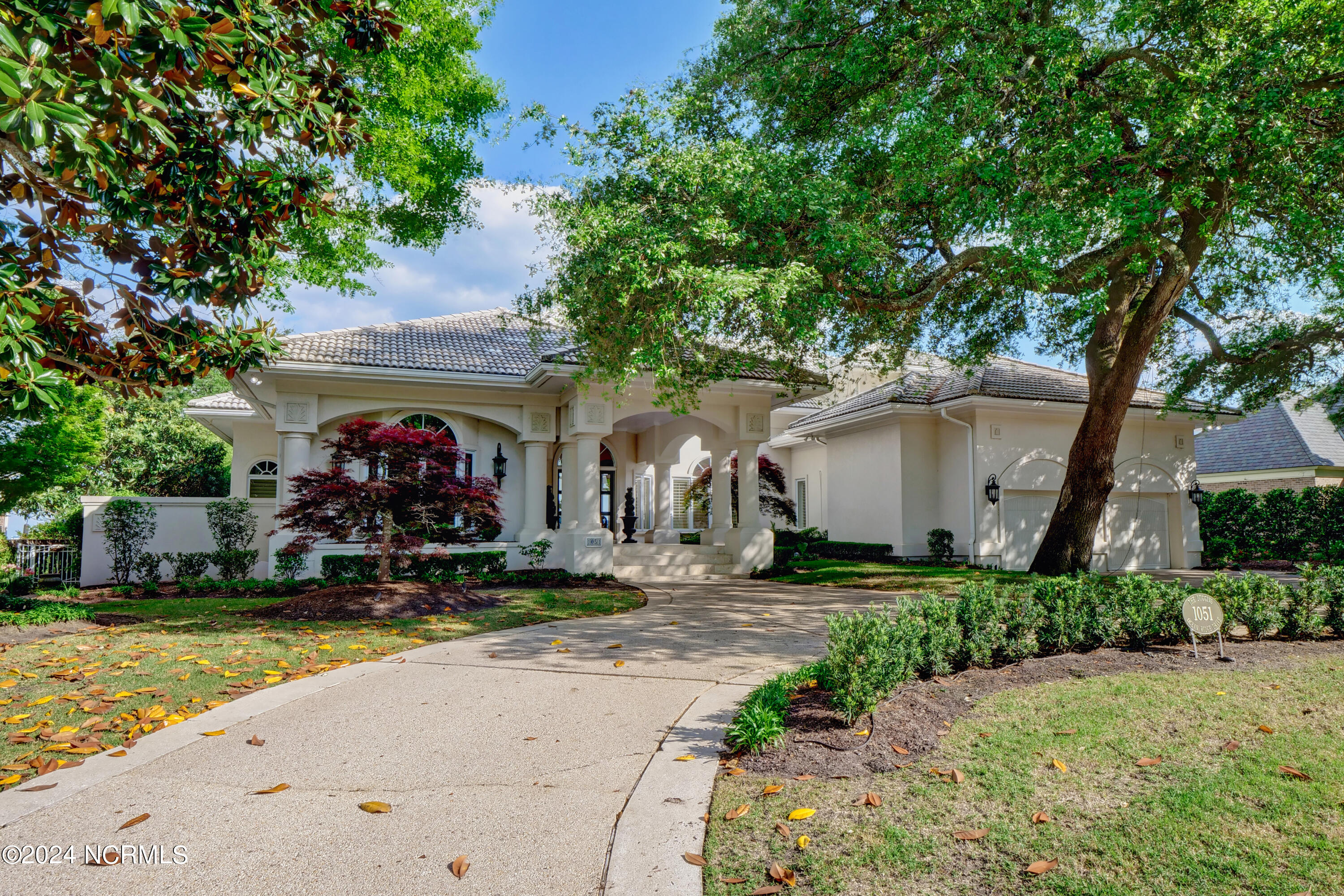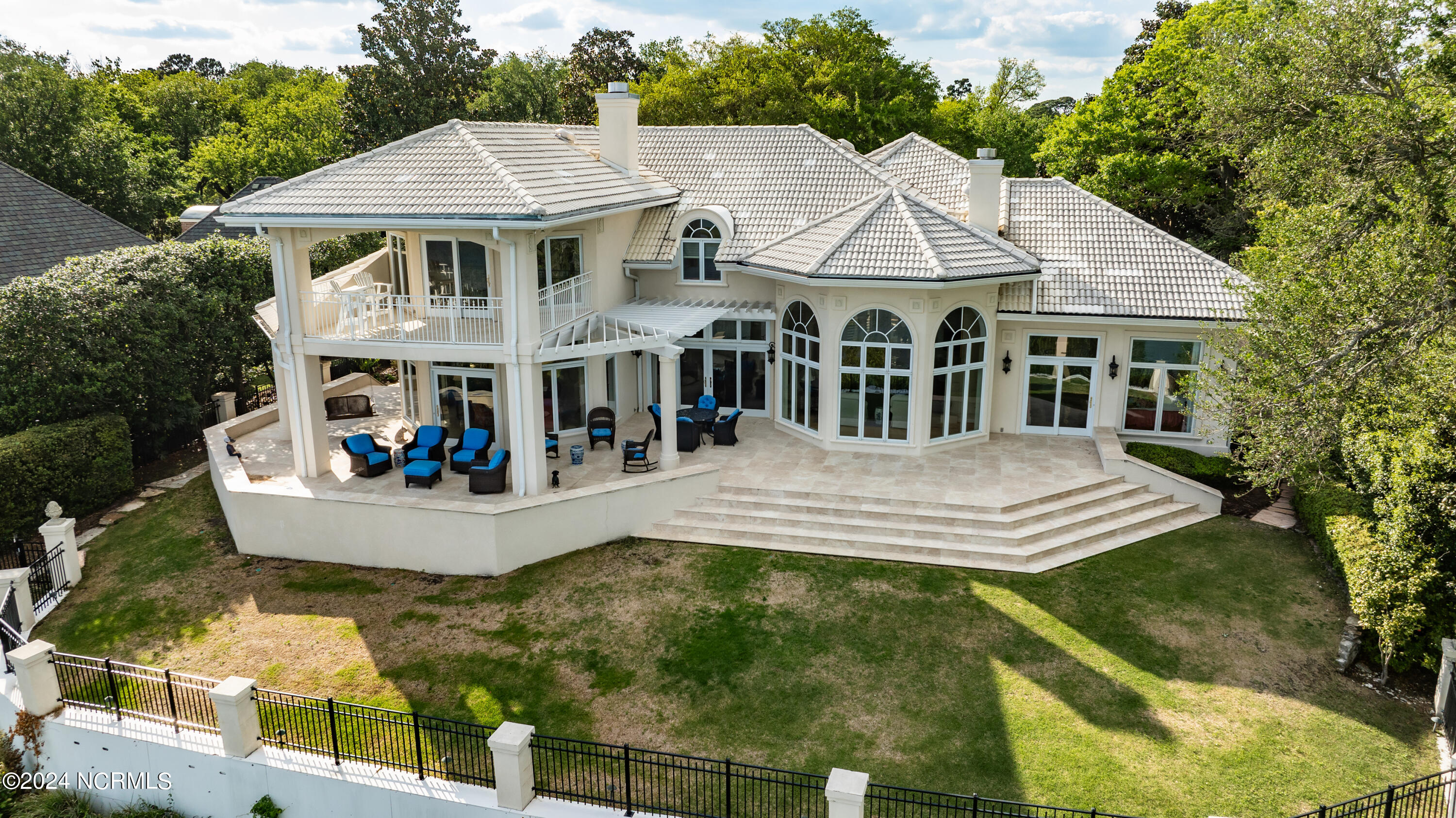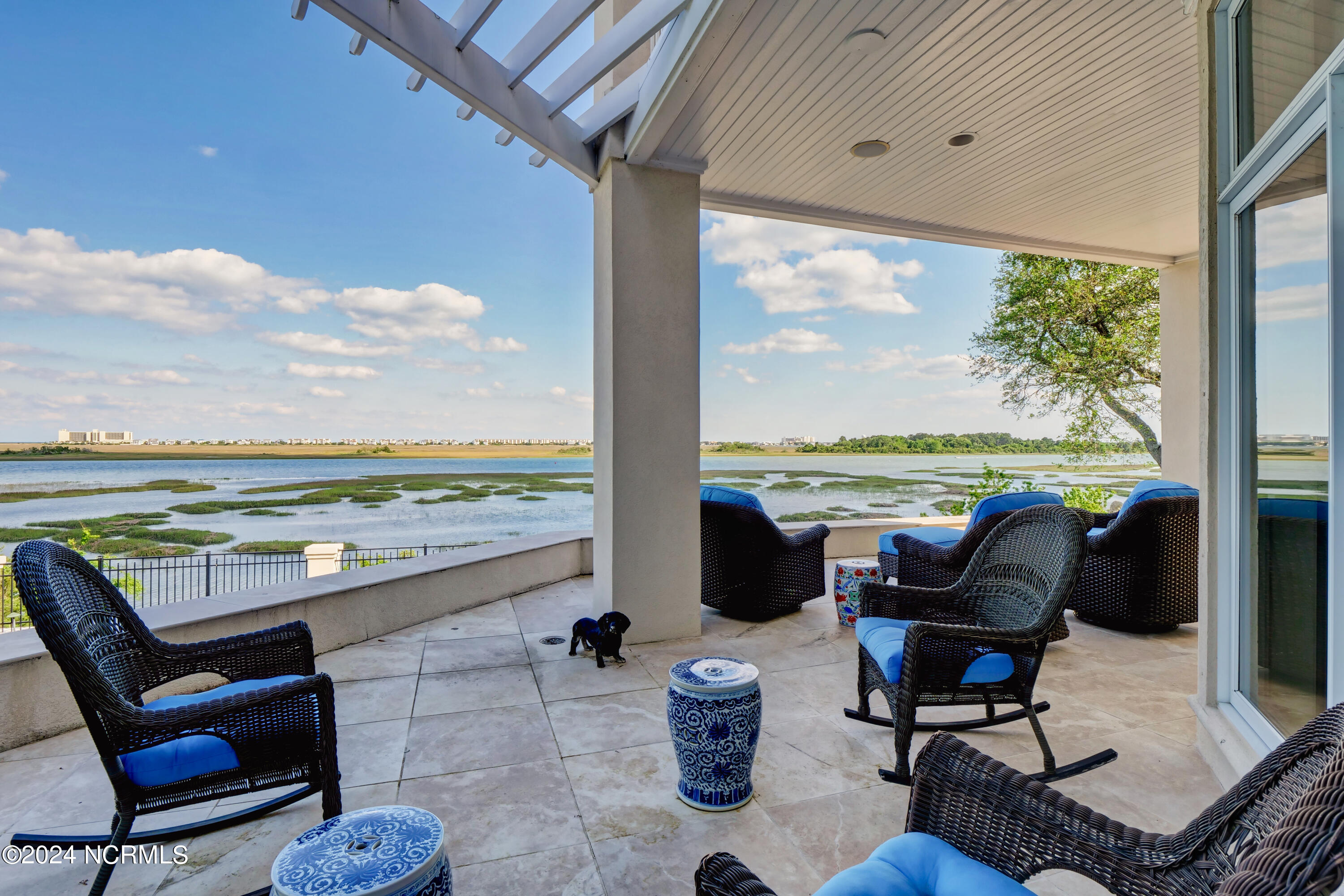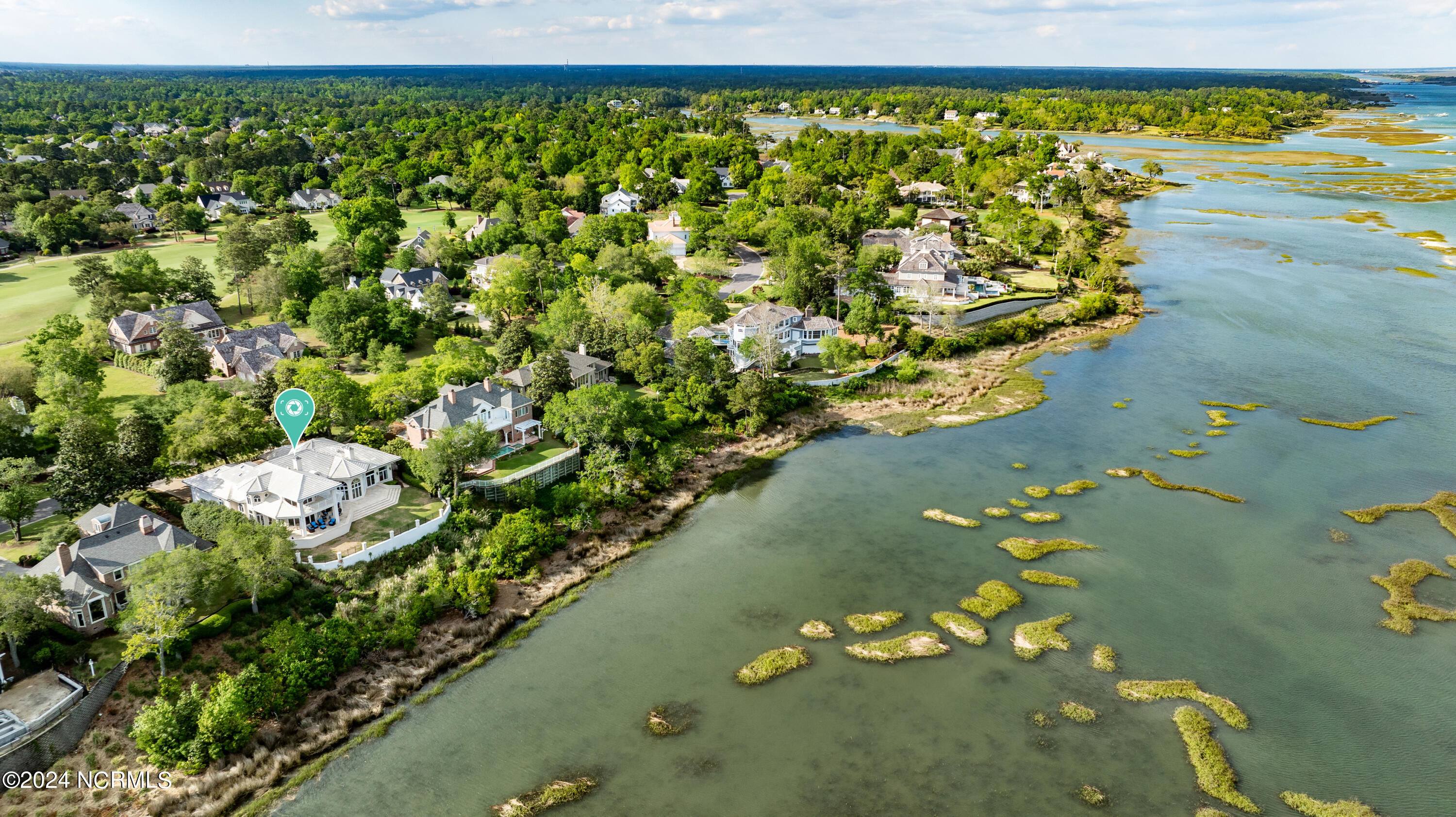 Situated on the Intracoastal Waterway in Landfall, with spectacular views of the ocean and Mason's Inlet, this home is an extraordinary Mediterranean-inspired masterpiece located on Ocean Ridge Drive. The grand entry foyer evokes warmth and luxury with its elegant marble floor, exquisite massive chandelier, and custom wood cathedral ceiling. Curved archways, stately columns, chandelier fixtures, detailed moldings, and gracious arched palladium windows frame the sweeping views of the Intracoastal Waterway, Wrightsville Beach, and Figure 8 Island. Outside, panoramic water views provide the perfect backdrop for outdoor entertaining on the expansive covered porch and patio. The kitchen features an oversized center island and breakfast nook, Thermador gas cooktop, Sub-Zero Designer Series refrigerator, and granite countertops. The kitchen opens up to an inviting sun and sitting room with marble fireplace and large windows overlooking the water views. The formal living great room features a custom wood burning, marble fireplace and walls of two-story palladium windows, a majestic wood cathedral ceiling, and formal dining area overlooking the water views. Entertain your guests from the adjoining full-sized custom bar area with beveled glass shelving, custom stained glass window, sink, cooler, and built-in wine rack. The generous sized main floor owner's suite has a tray ceiling with backlighting, crown molding, and wood-burning marble fireplace flanked by custom built-in cabinets and shelving, double walk-in closets. The marble tile bathroom features designer Sherle Wagner fixtures. Beautiful wallpaper accents the luxury ensuite as well as the two powder rooms and laundry room on the main floor. The three elegant guest rooms upstairs are also complemented with beautiful wall-papered ensuite baths, and one bedroom balcony overlooking water views. The second floor also boasts a beautiful custom walk-in closet and large bonus room.