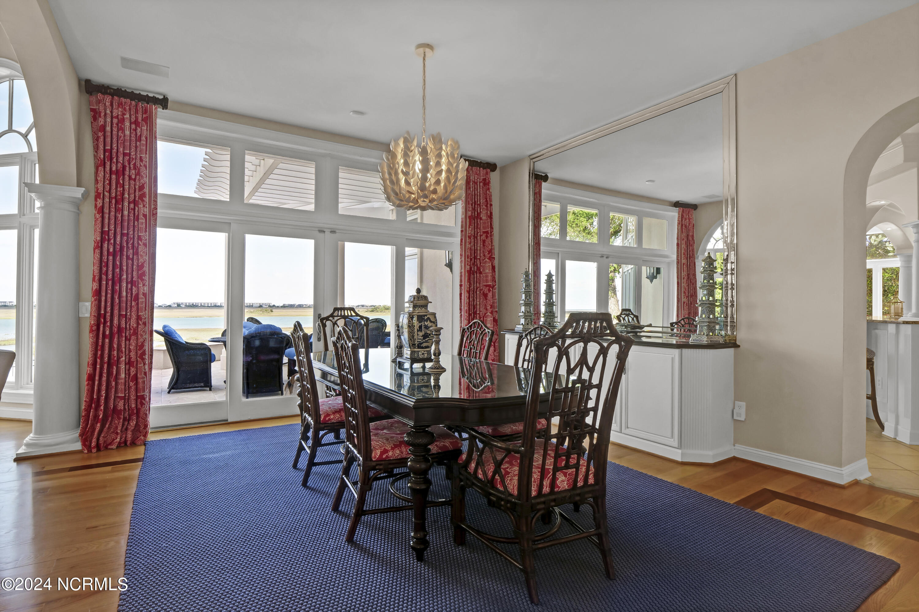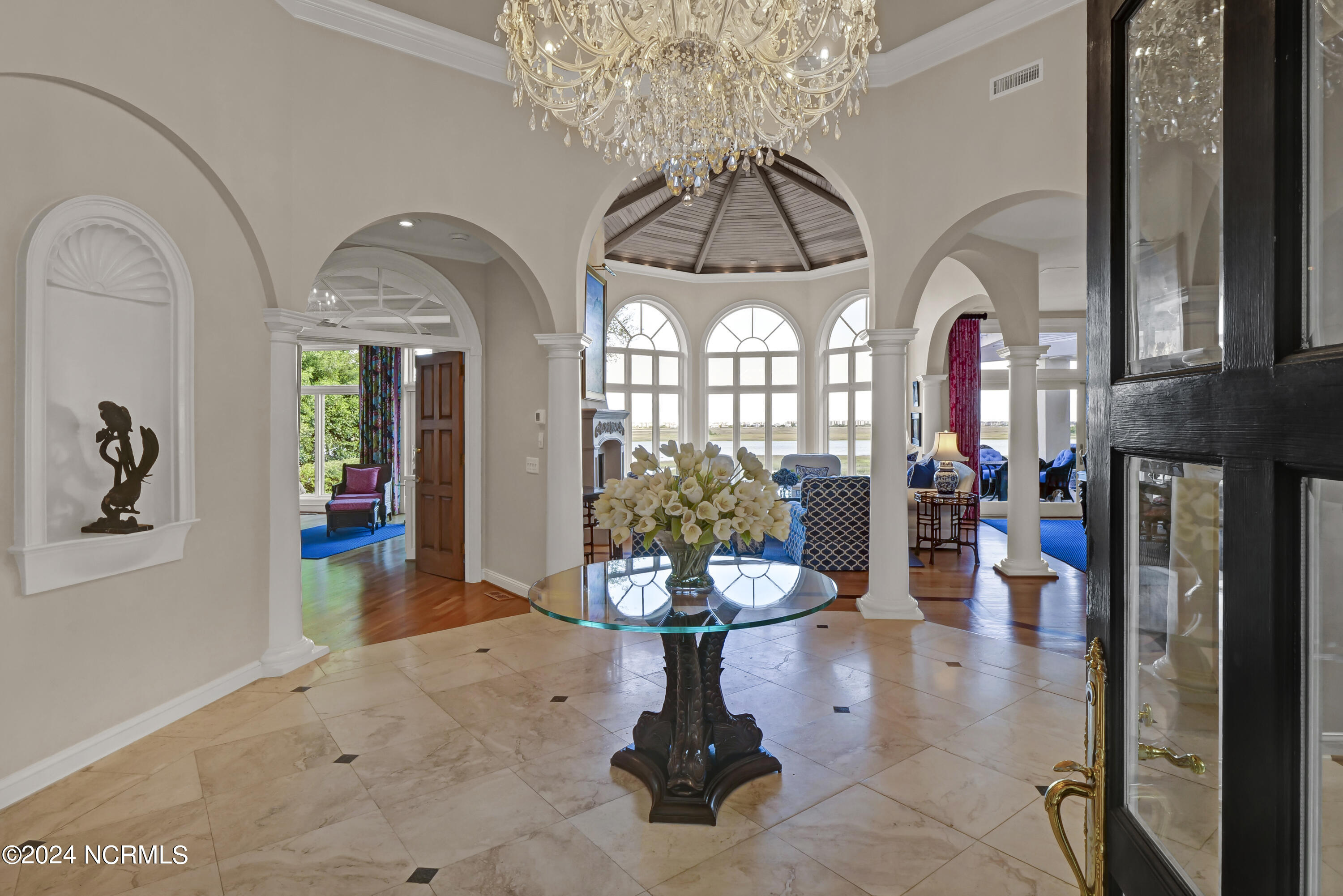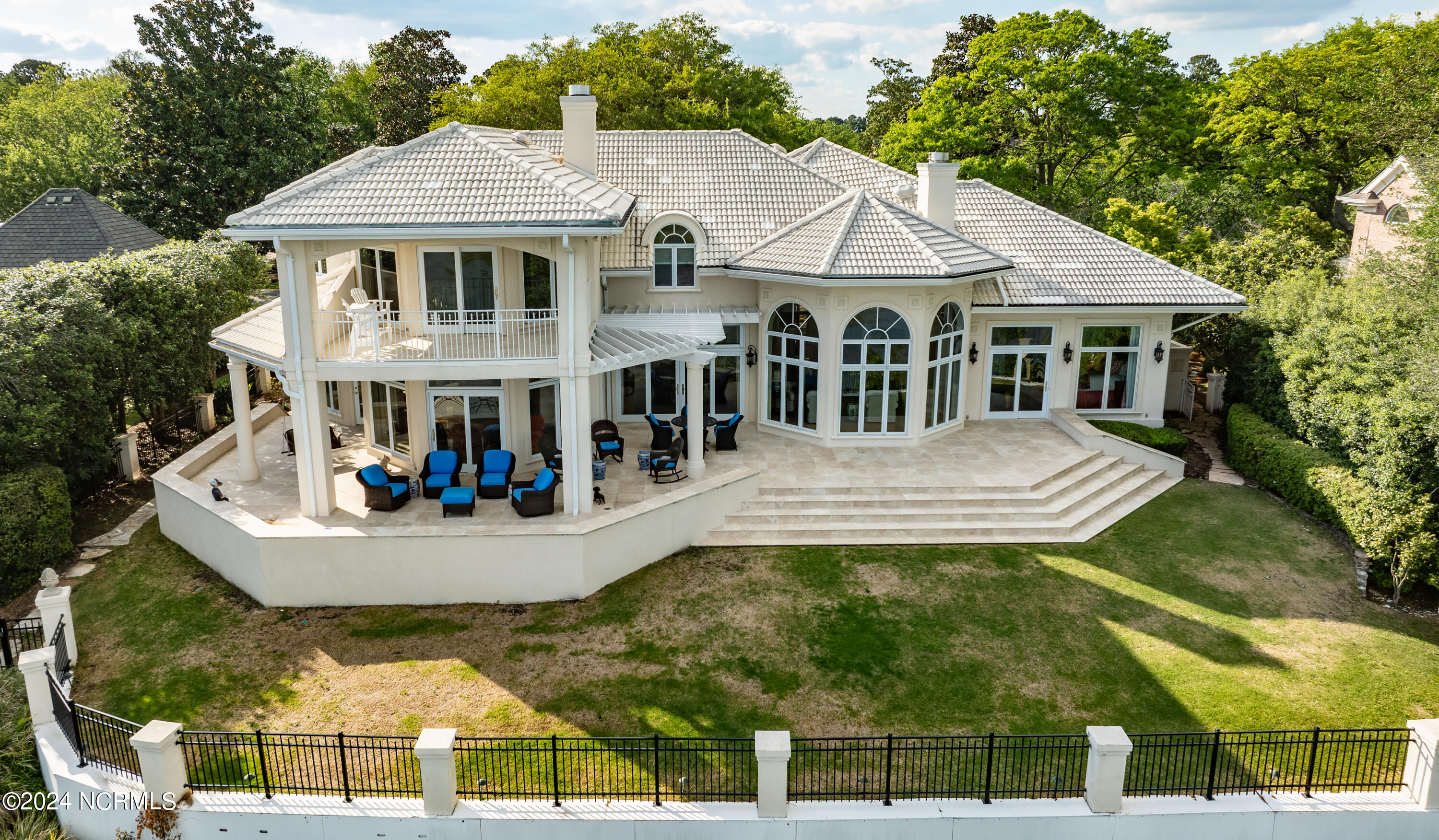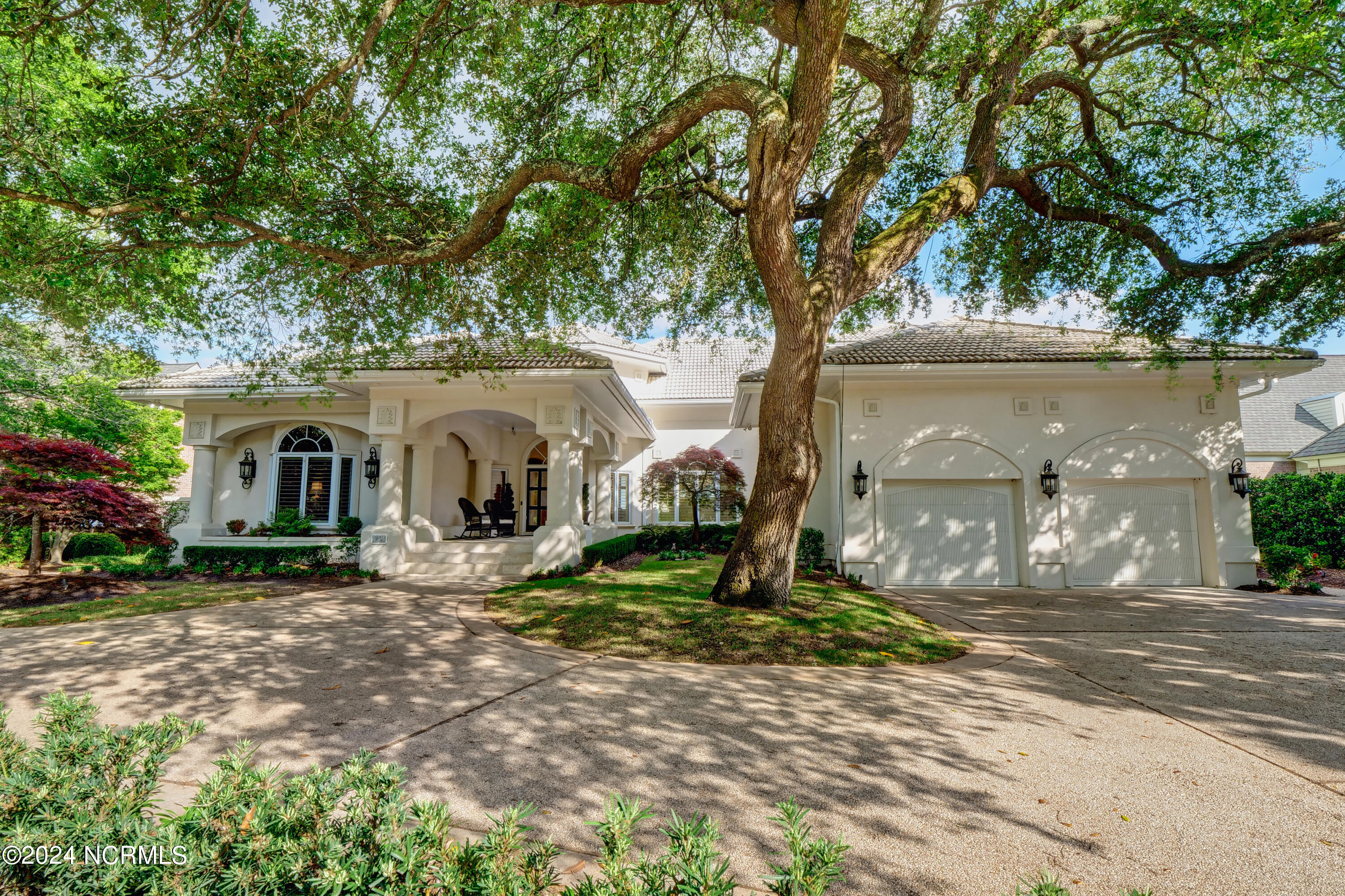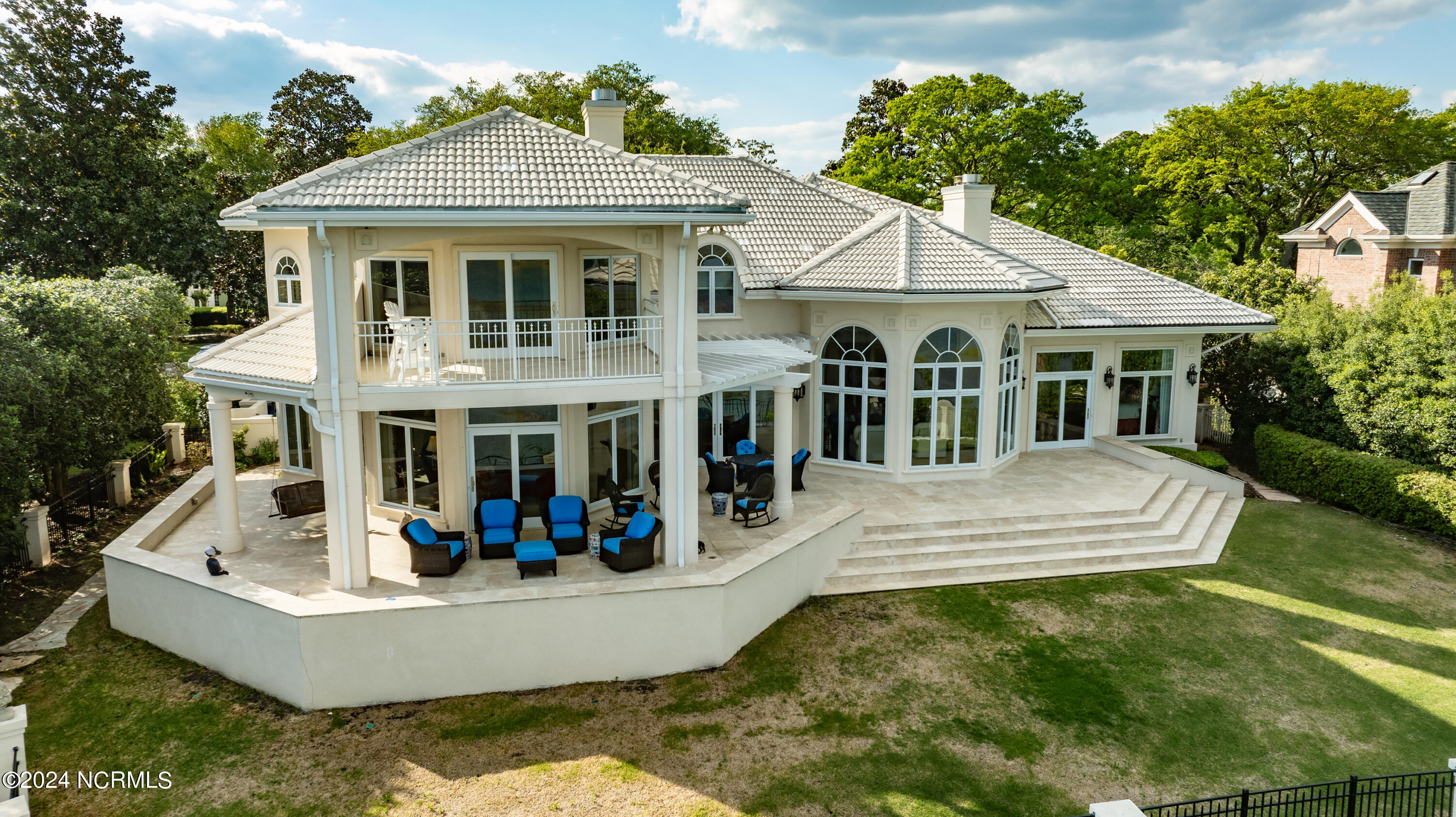Situated on the Intracoastal Waterway in Landfall, with spectacular views of the ocean and Mason's Inlet, this home is an extraordinary Mediterranean-inspired masterpiece located on Ocean Ridge Drive. The grand entry foyer evokes warmth and luxury with its elegant marble floor, exquisite massive chandelier, and custom wood cathedral ceiling. Curved archways, stately columns, chandelier fixtures, detailed moldings, and gracious arched palladium windows frame the sweeping views of the Intracoastal Waterway, Wrightsville Beach, and Figure 8 Island. Outside, panoramic water views provide the perfect backdrop for outdoor entertaining on the expansive covered porch and patio. The kitchen features an oversized center island and breakfast nook, Thermador gas cooktop, Sub-Zero Designer Series refrigerator, and granite countertops. The kitchen opens up to an inviting sun and sitting room with marble fireplace and large windows overlooking the water views. The formal living great room features a custom wood burning, marble fireplace and walls of two-story palladium windows, a majestic wood cathedral ceiling, and formal dining area overlooking the water views. Entertain your guests from the adjoining full-sized custom bar area with beveled glass shelving, custom stained glass window, sink, cooler, and built-in wine rack. The generous sized main floor owner's suite has a tray ceiling with backlighting, crown molding, and wood-burning marble fireplace flanked by custom built-in cabinets and shelving, double walk-in closets. The marble tile bathroom features designer Sherle Wagner fixtures. Beautiful wallpaper accents the luxury ensuite as well as the two powder rooms and laundry room on the main floor. The three elegant guest rooms upstairs are also complemented with beautiful wall-papered ensuite baths, and one bedroom balcony overlooking water views. The second floor also boasts a beautiful custom walk-in closet and large bonus room.