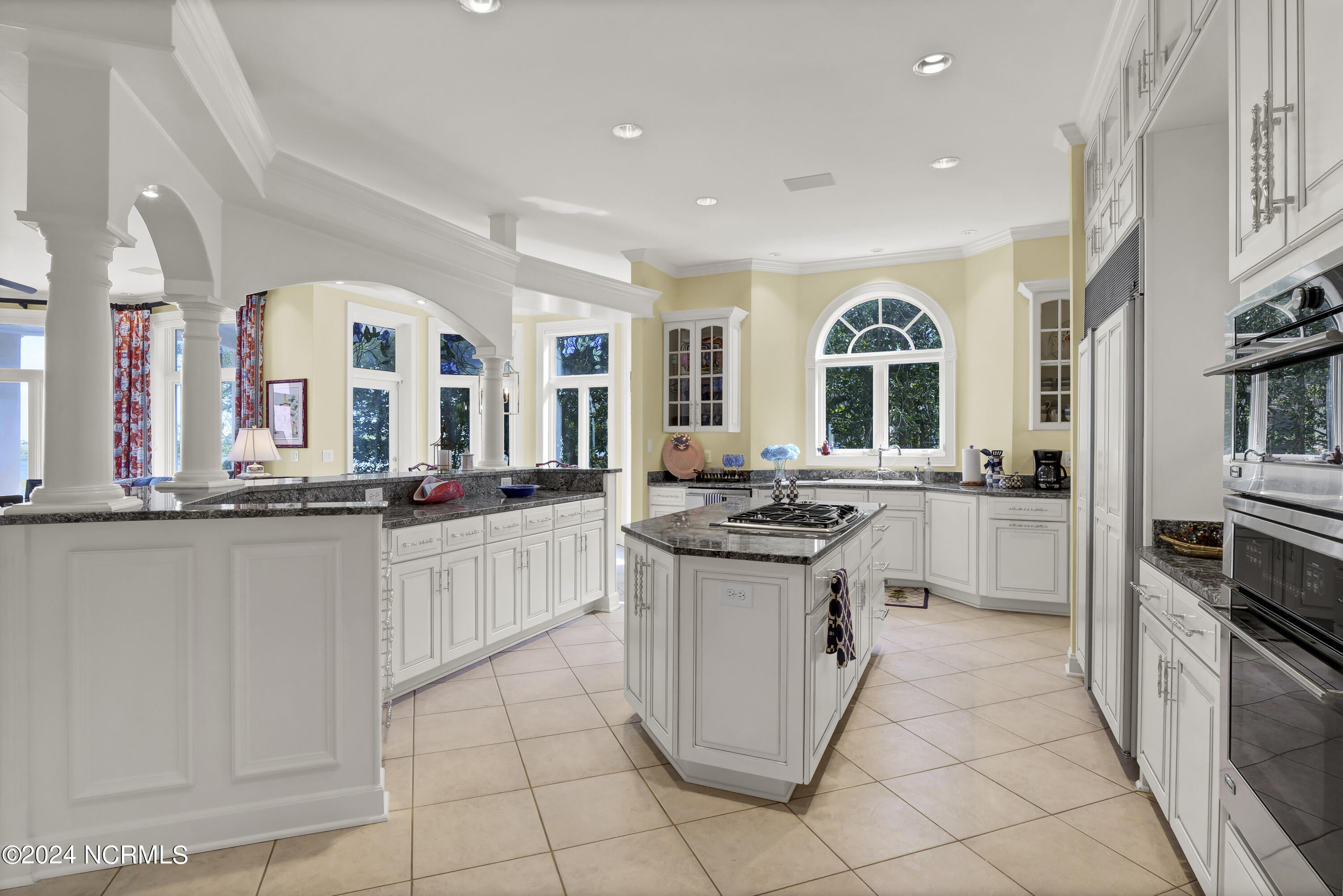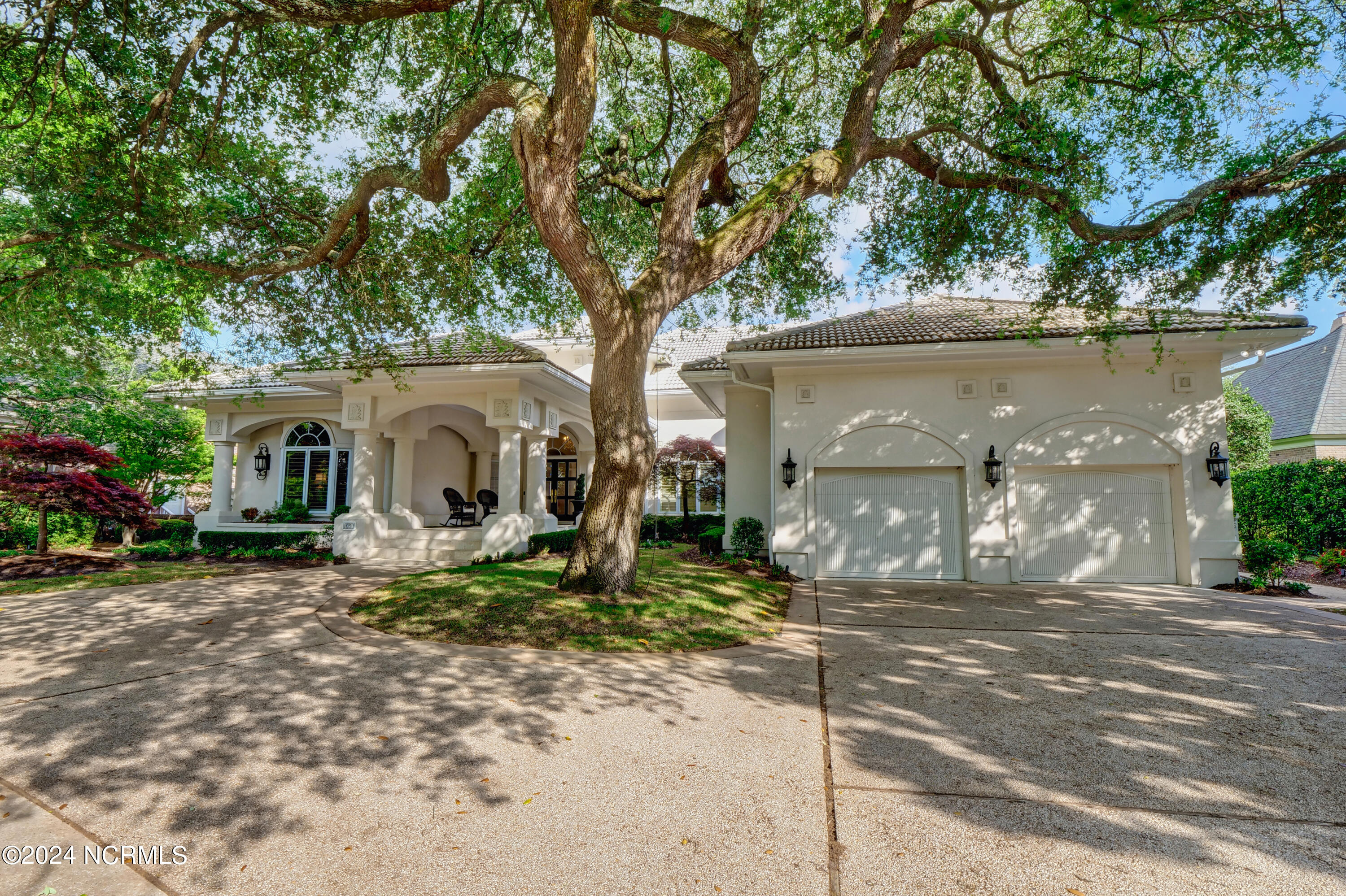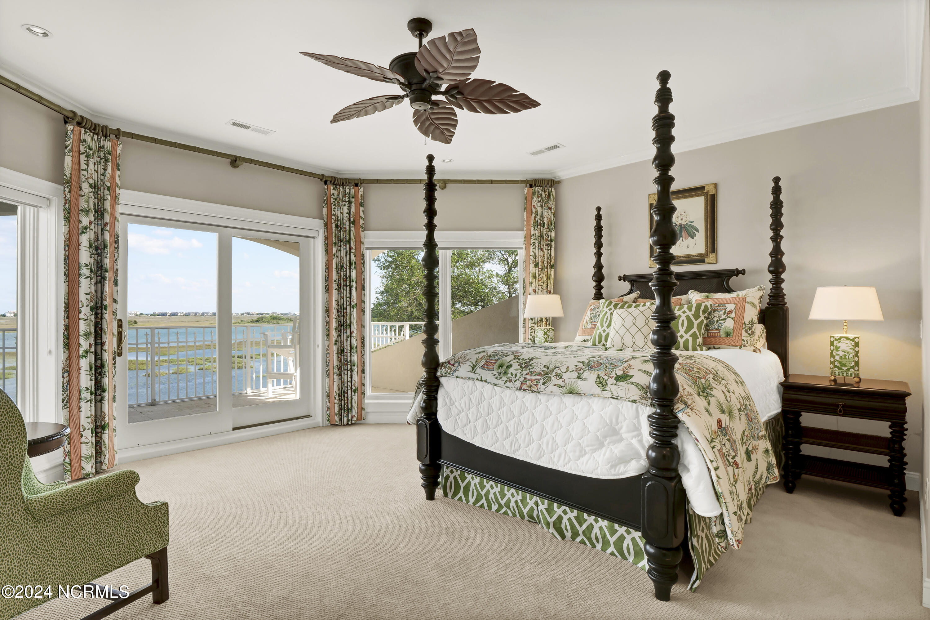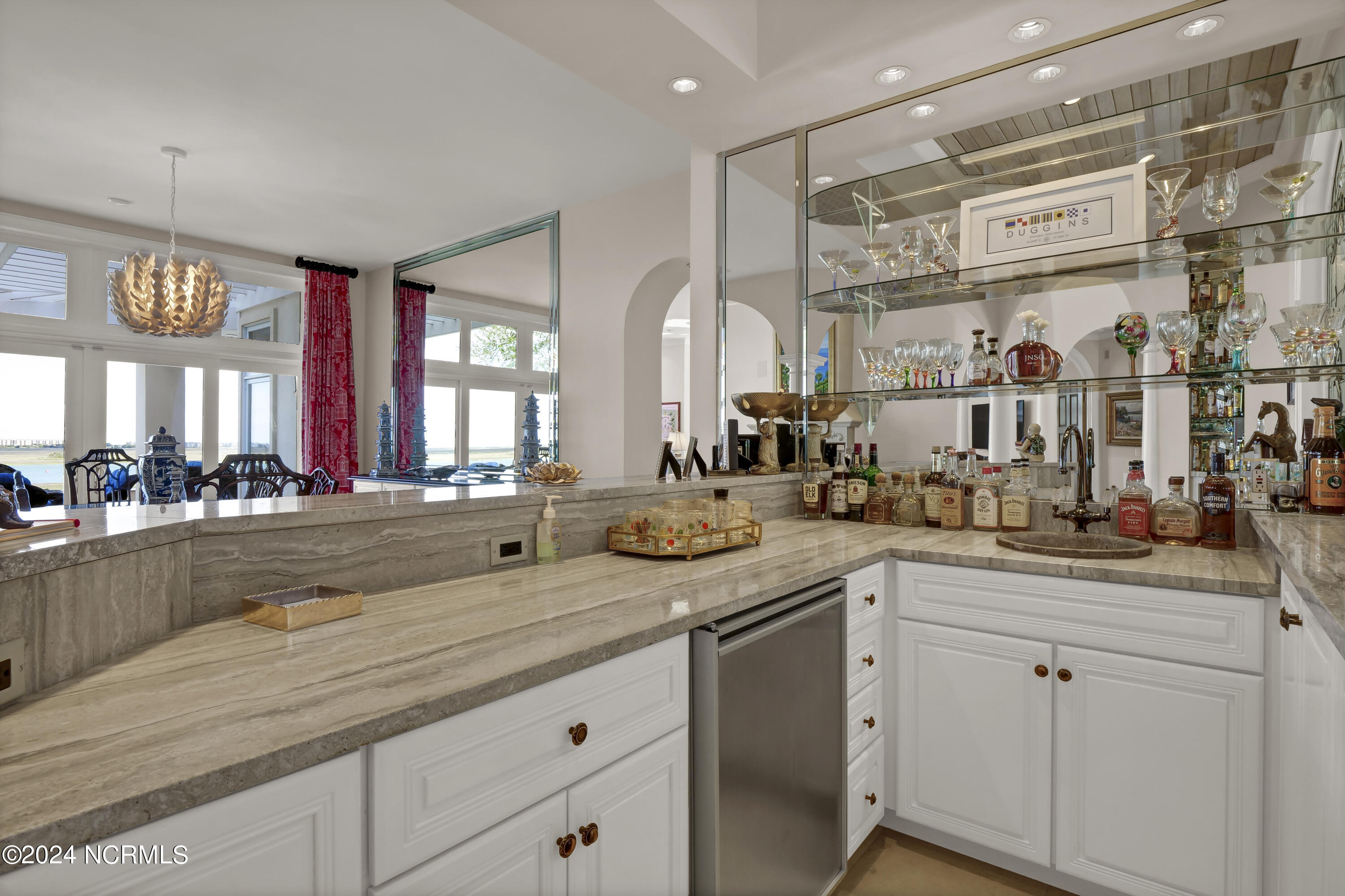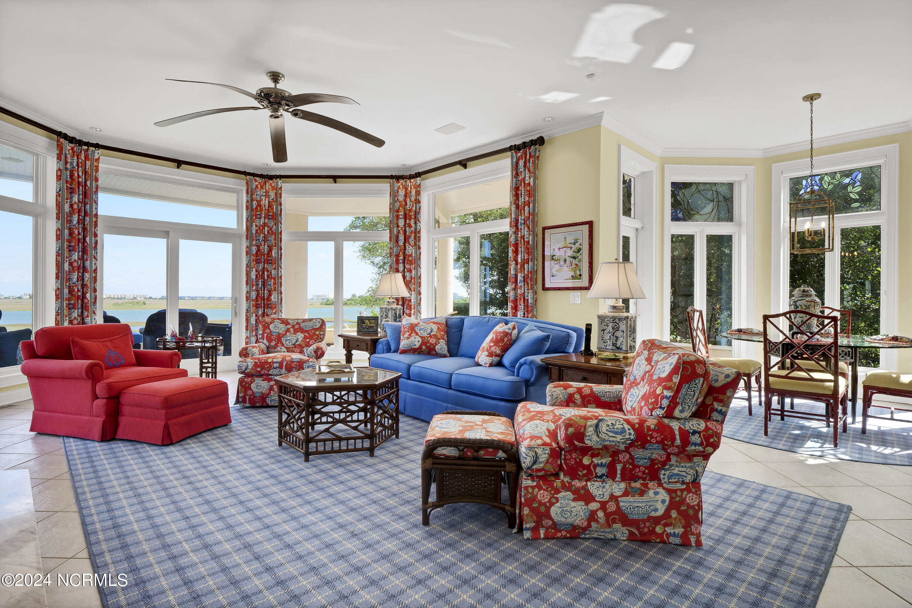 Situated on the Intracoastal Waterway in Landfall, with spectacular views of the ocean and Mason's Inlet, this home is an extraordinary Mediterranean-inspired masterpiece located on Ocean Ridge Drive. The grand entry foyer evokes warmth and luxury with its elegant marble floor, exquisite massive chandelier, and custom wood cathedral ceiling. Curved archways, stately columns, chandelier fixtures, detailed moldings, and gracious arched palladium windows frame the sweeping views of the Intracoastal Waterway, Wrightsville Beach, and Figure 8 Island. Outside, panoramic water views provide the perfect backdrop for outdoor entertaining on the expansive covered porch and patio. The kitchen features an oversized center island and breakfast nook, Thermador gas cooktop, Sub-Zero Designer Series refrigerator, and granite countertops. The kitchen opens up to an inviting sun and sitting room with marble fireplace and large windows overlooking the water views. The formal living great room features a custom wood burning, marble fireplace and walls of two-story palladium windows, a majestic wood cathedral ceiling, and formal dining area overlooking the water views. Entertain your guests from the adjoining full-sized custom bar area with beveled glass shelving, custom stained glass window, sink, cooler, and built-in wine rack. The generous sized main floor owner's suite has a tray ceiling with backlighting, crown molding, and wood-burning marble fireplace flanked by custom built-in cabinets and shelving, double walk-in closets. The marble tile bathroom features designer Sherle Wagner fixtures. Beautiful wallpaper accents the luxury ensuite as well as the two powder rooms and laundry room on the main floor. The three elegant guest rooms upstairs are also complemented with beautiful wall-papered ensuite baths, and one bedroom balcony overlooking water views. The second floor also boasts a beautiful custom walk-in closet and large bonus room.