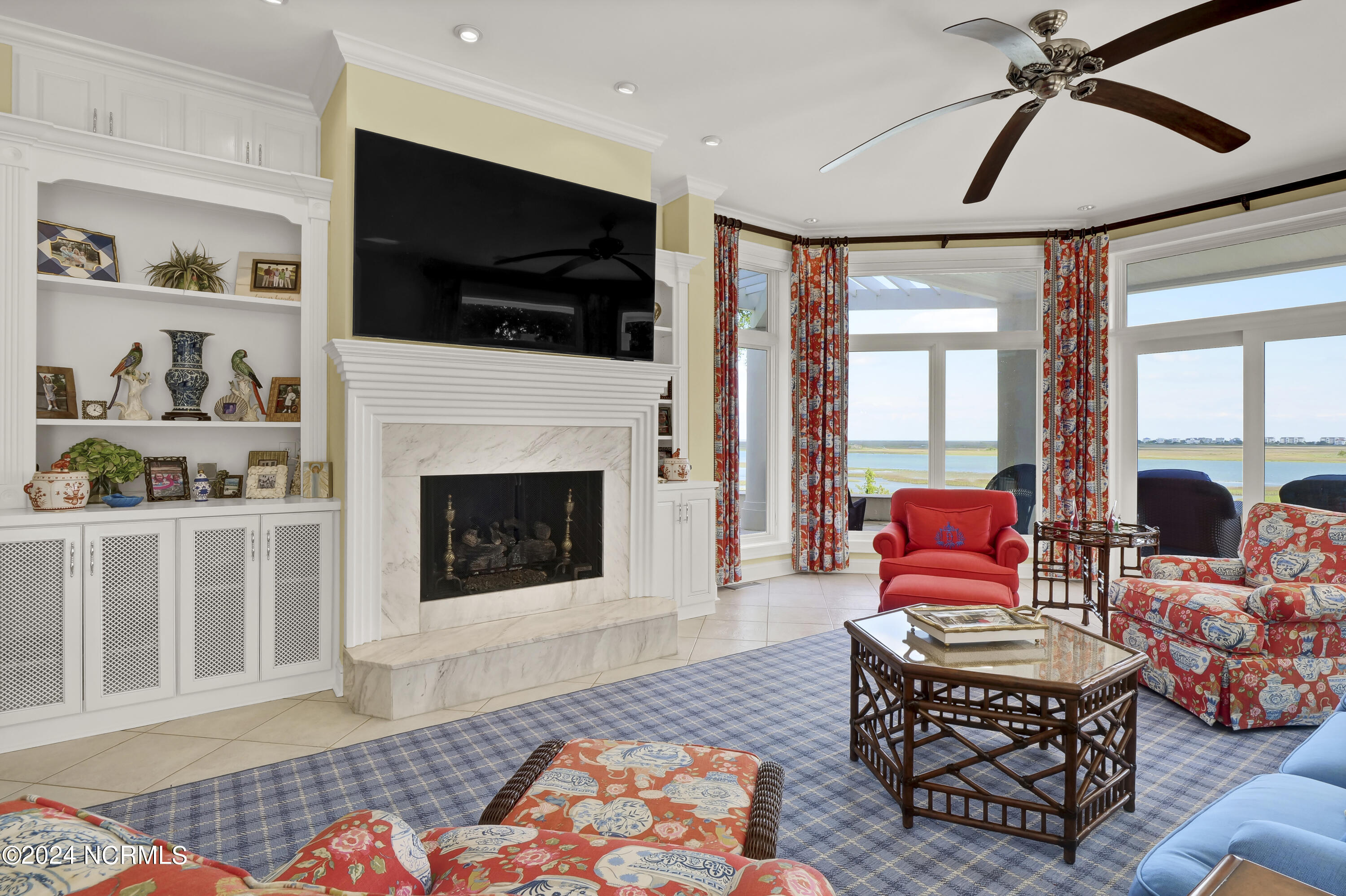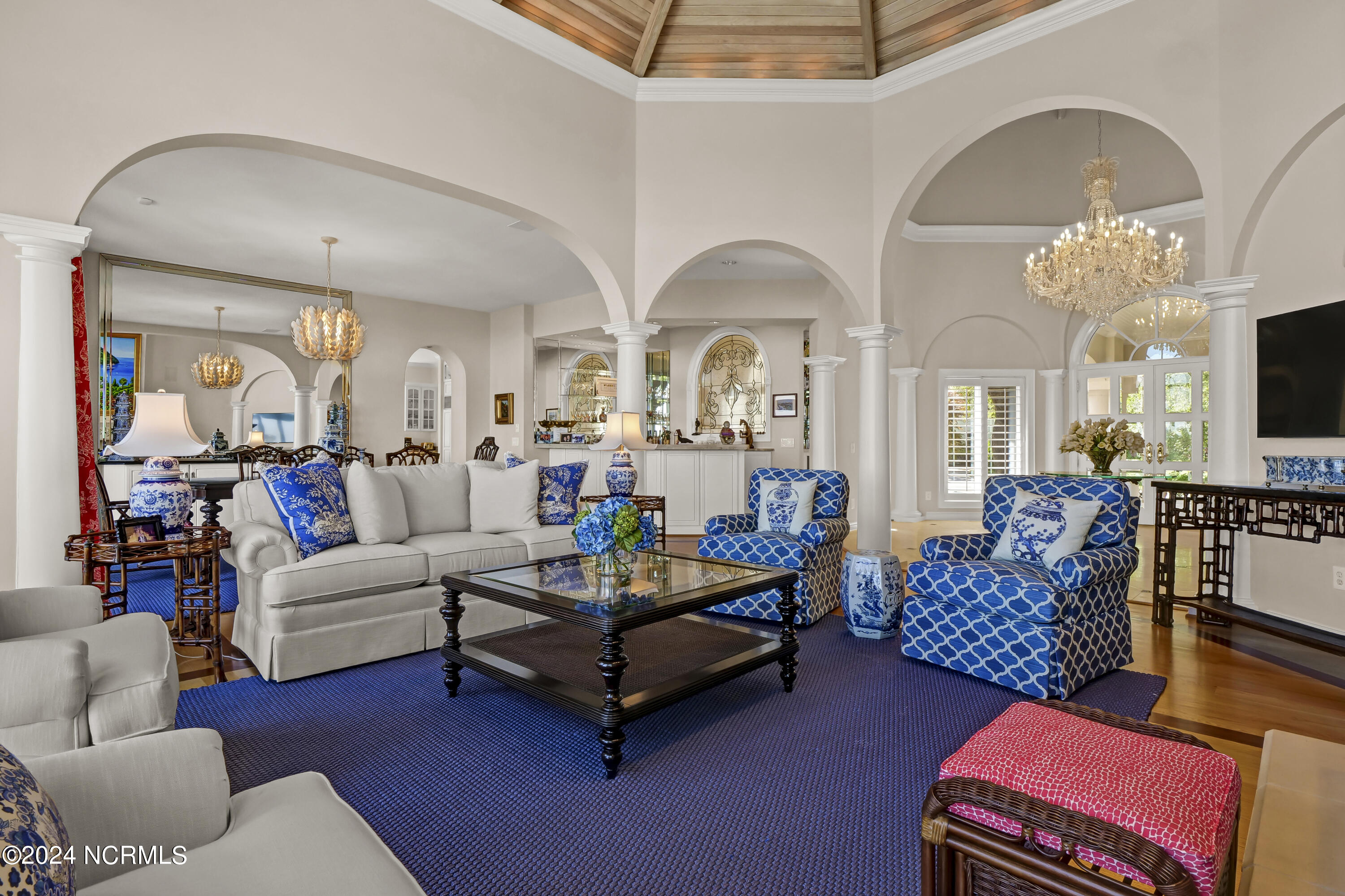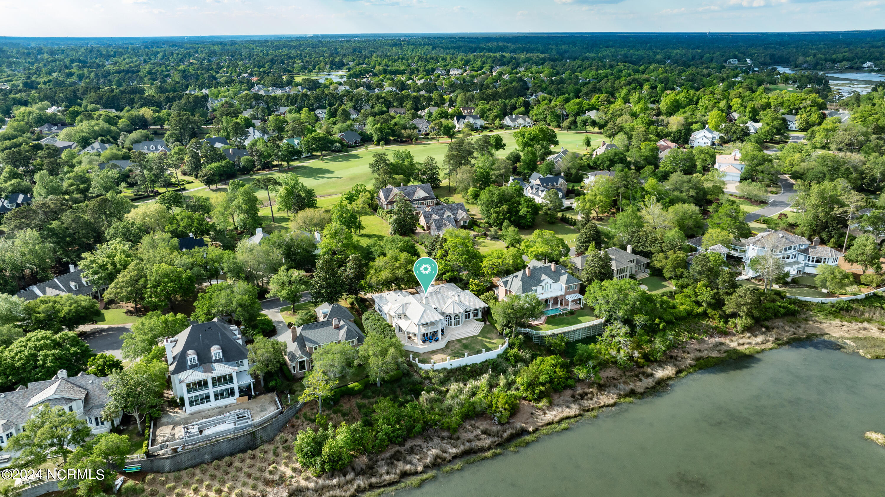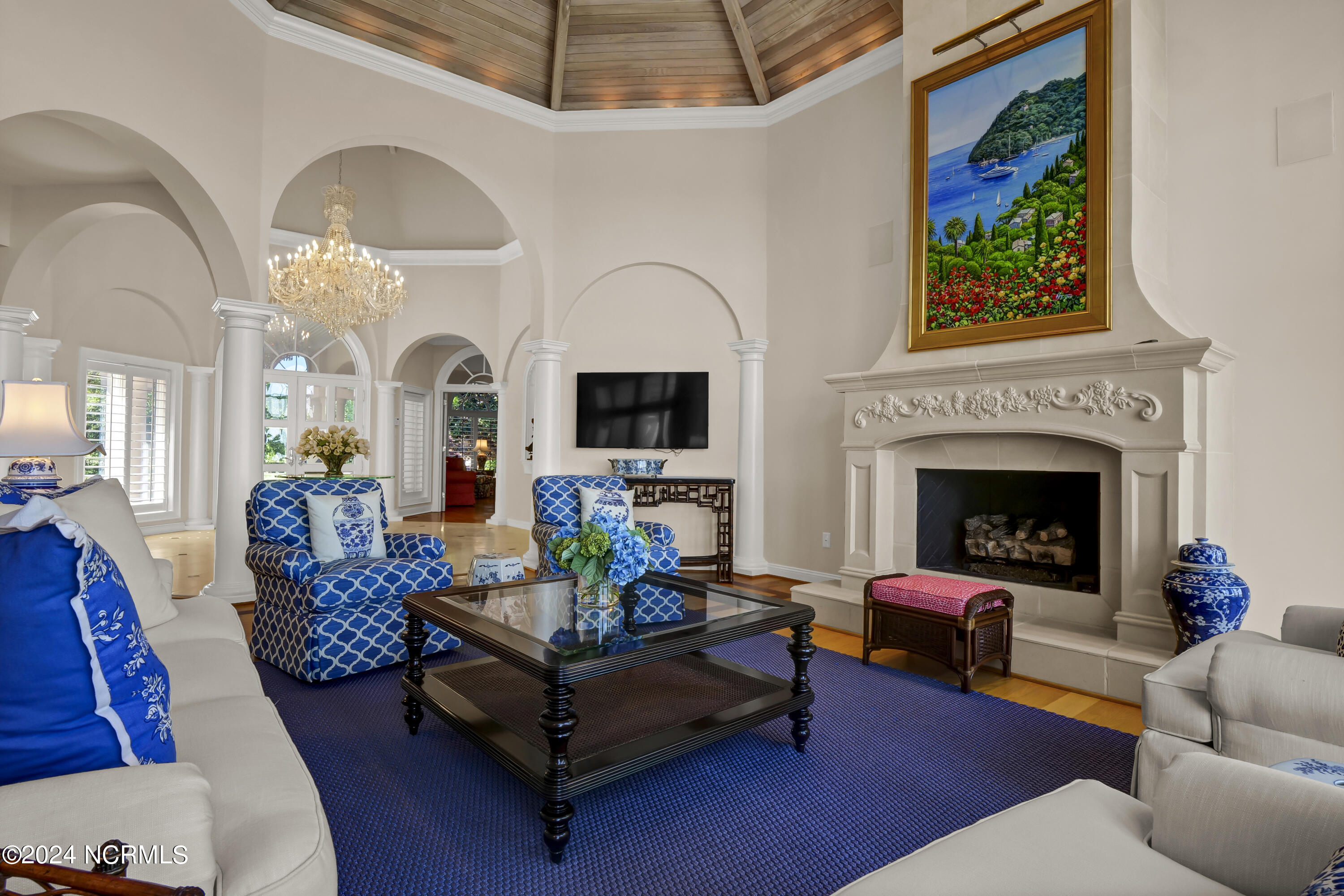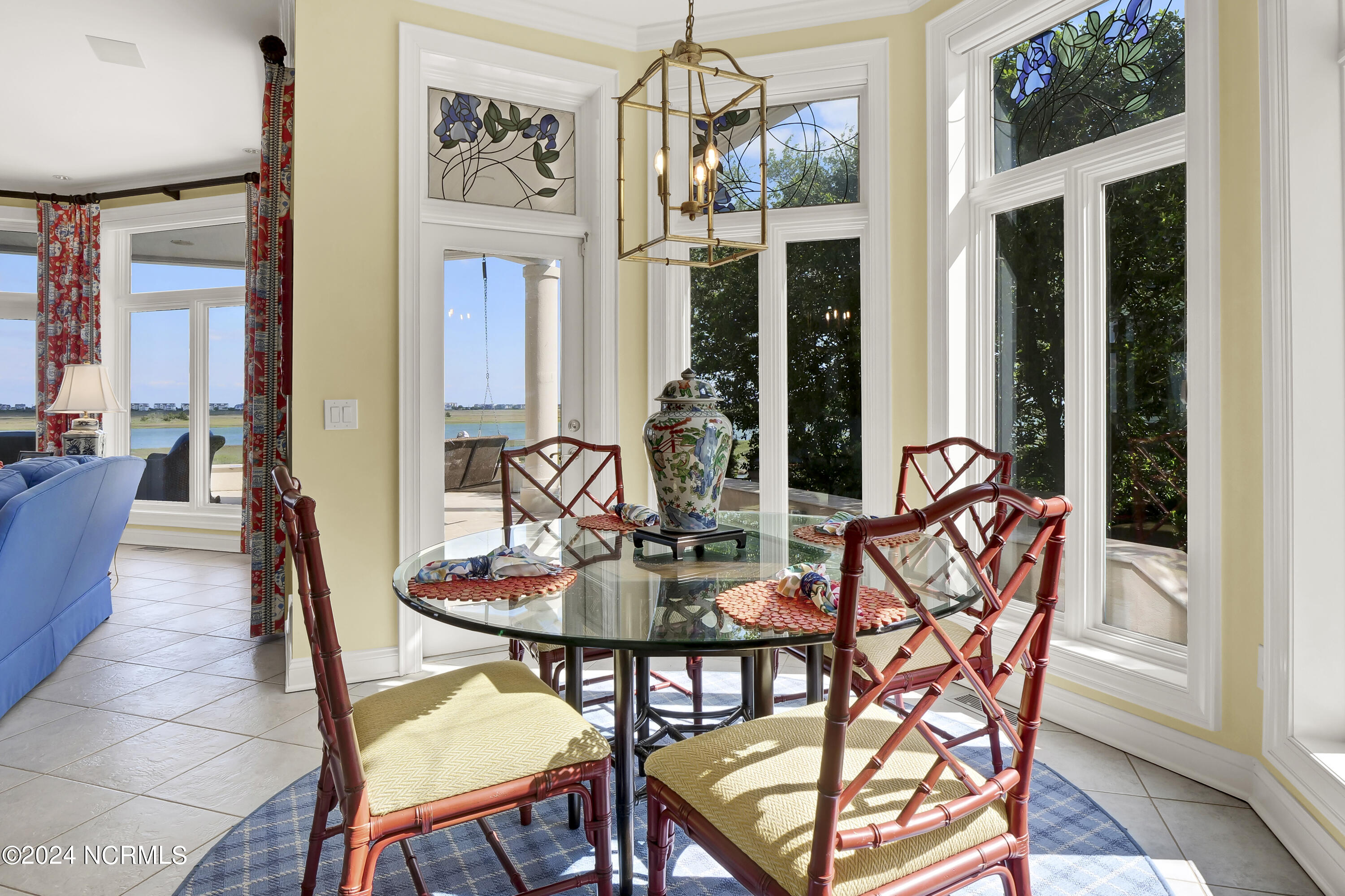 Situated on the Intracoastal Waterway in Landfall, with spectacular views of the ocean and Mason's Inlet, this home is an extraordinary Mediterranean-inspired masterpiece located on Ocean Ridge Drive. The grand entry foyer evokes warmth and luxury with its elegant marble floor, exquisite massive chandelier, and custom wood cathedral ceiling. Curved archways, stately columns, chandelier fixtures, detailed moldings, and gracious arched palladium windows frame the sweeping views of the Intracoastal Waterway, Wrightsville Beach, and Figure 8 Island. Outside, panoramic water views provide the perfect backdrop for outdoor entertaining on the expansive covered porch and patio. The kitchen features an oversized center island and breakfast nook, Thermador gas cooktop, Sub-Zero Designer Series refrigerator, and granite countertops. The kitchen opens up to an inviting sun and sitting room with marble fireplace and large windows overlooking the water views. The formal living great room features a custom wood burning, marble fireplace and walls of two-story palladium windows, a majestic wood cathedral ceiling, and formal dining area overlooking the water views. Entertain your guests from the adjoining full-sized custom bar area with beveled glass shelving, custom stained glass window, sink, cooler, and built-in wine rack. The generous sized main floor owner's suite has a tray ceiling with backlighting, crown molding, and wood-burning marble fireplace flanked by custom built-in cabinets and shelving, double walk-in closets. The marble tile bathroom features designer Sherle Wagner fixtures. Beautiful wallpaper accents the luxury ensuite as well as the two powder rooms and laundry room on the main floor. The three elegant guest rooms upstairs are also complemented with beautiful wall-papered ensuite baths, and one bedroom balcony overlooking water views. The second floor also boasts a beautiful custom walk-in closet and large bonus room.