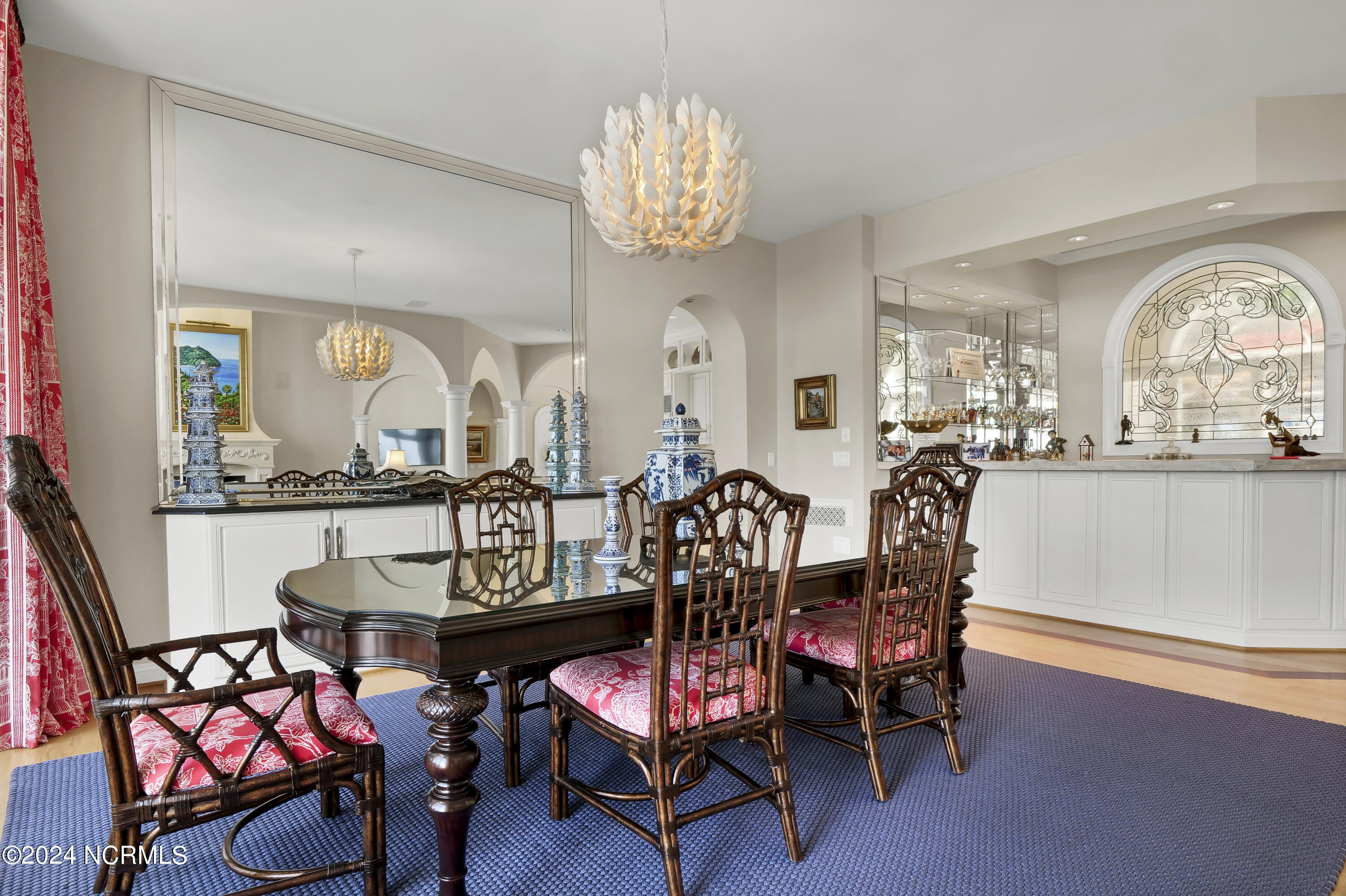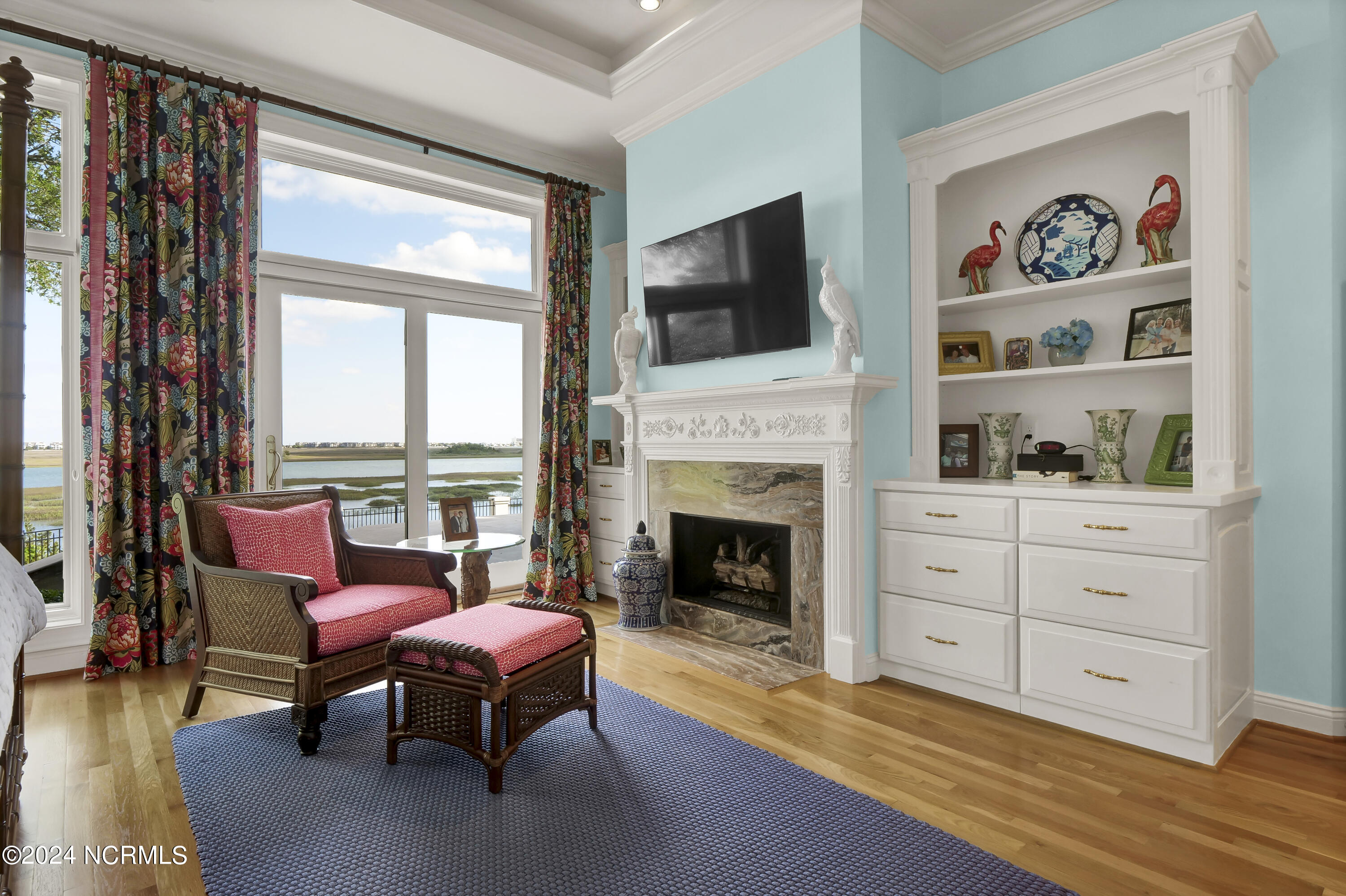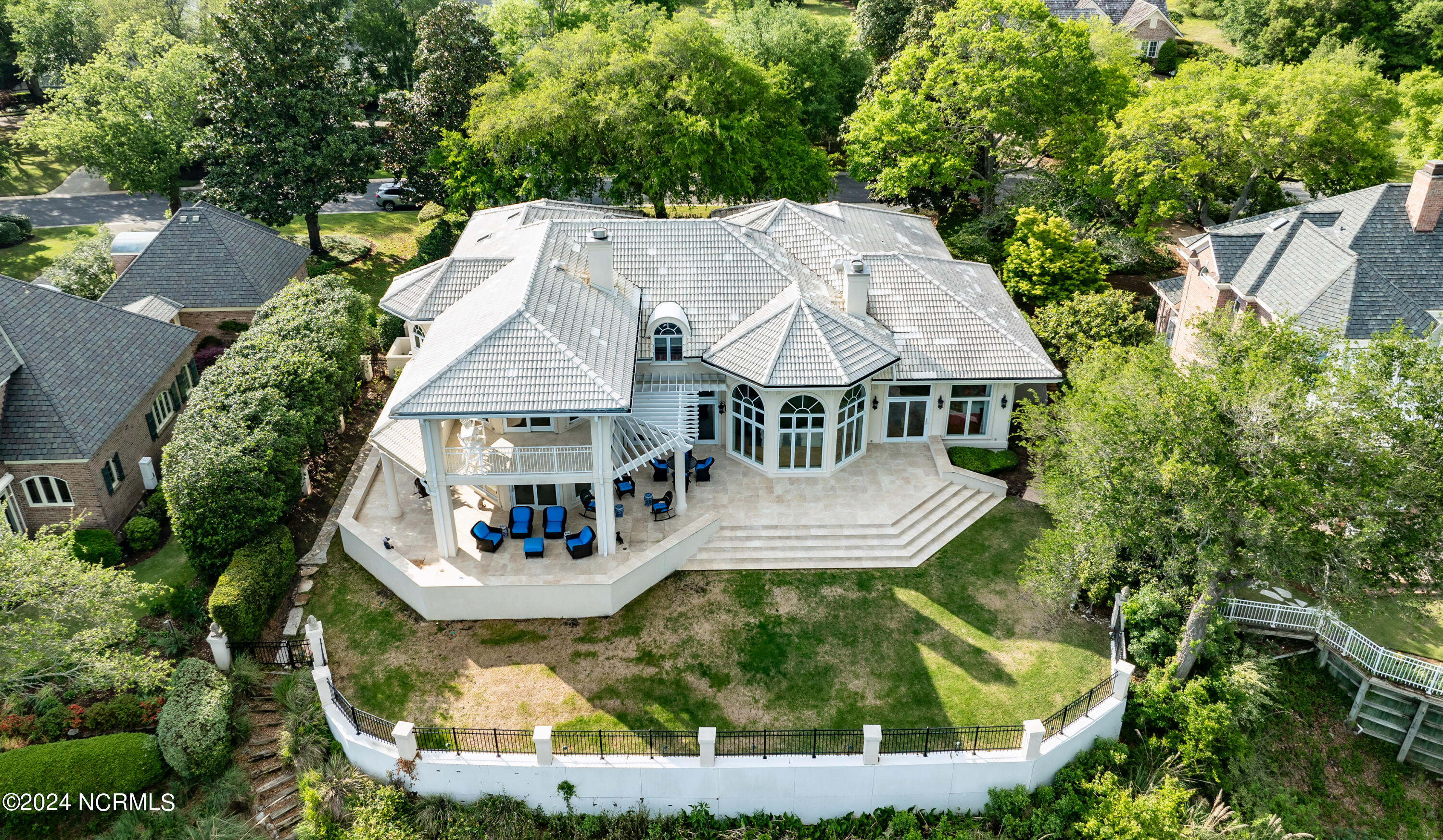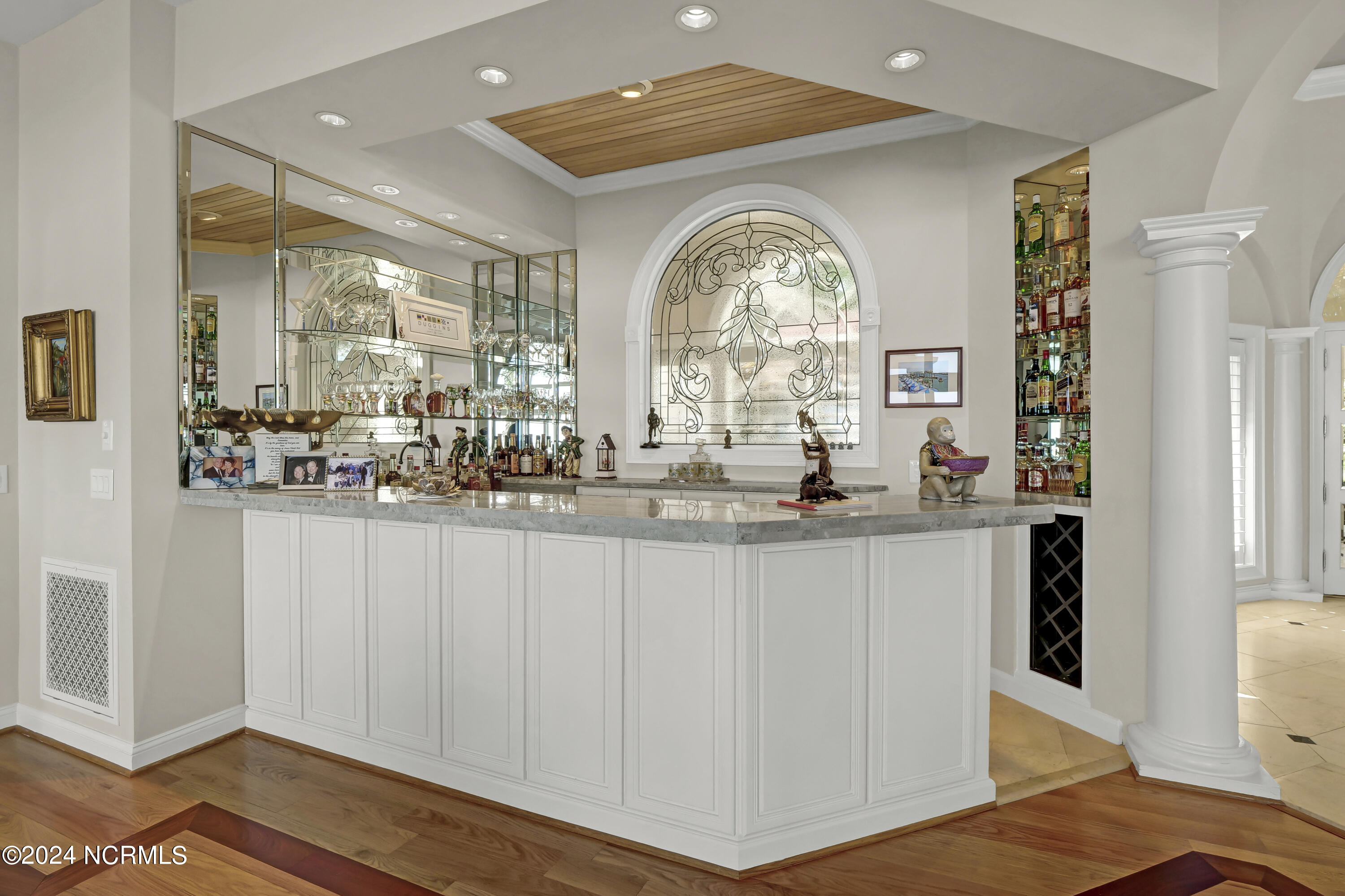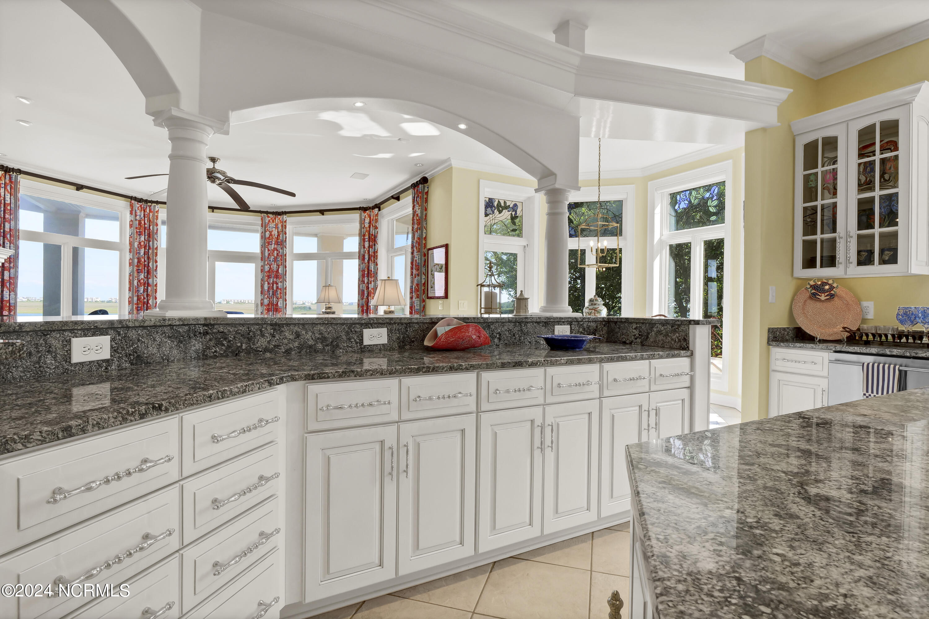 Situated on the Intracoastal Waterway in Landfall, with spectacular views of the ocean and Mason's Inlet, this home is an extraordinary Mediterranean-inspired masterpiece located on Ocean Ridge Drive. The grand entry foyer evokes warmth and luxury with its elegant marble floor, exquisite massive chandelier, and custom wood cathedral ceiling. Curved archways, stately columns, chandelier fixtures, detailed moldings, and gracious arched palladium windows frame the sweeping views of the Intracoastal Waterway, Wrightsville Beach, and Figure 8 Island. Outside, panoramic water views provide the perfect backdrop for outdoor entertaining on the expansive covered porch and patio. The kitchen features an oversized center island and breakfast nook, Thermador gas cooktop, Sub-Zero Designer Series refrigerator, and granite countertops. The kitchen opens up to an inviting sun and sitting room with marble fireplace and large windows overlooking the water views. The formal living great room features a custom wood burning, marble fireplace and walls of two-story palladium windows, a majestic wood cathedral ceiling, and formal dining area overlooking the water views. Entertain your guests from the adjoining full-sized custom bar area with beveled glass shelving, custom stained glass window, sink, cooler, and built-in wine rack. The generous sized main floor owner's suite has a tray ceiling with backlighting, crown molding, and wood-burning marble fireplace flanked by custom built-in cabinets and shelving, double walk-in closets. The marble tile bathroom features designer Sherle Wagner fixtures. Beautiful wallpaper accents the luxury ensuite as well as the two powder rooms and laundry room on the main floor. The three elegant guest rooms upstairs are also complemented with beautiful wall-papered ensuite baths, and one bedroom balcony overlooking water views. The second floor also boasts a beautiful custom walk-in closet and large bonus room.