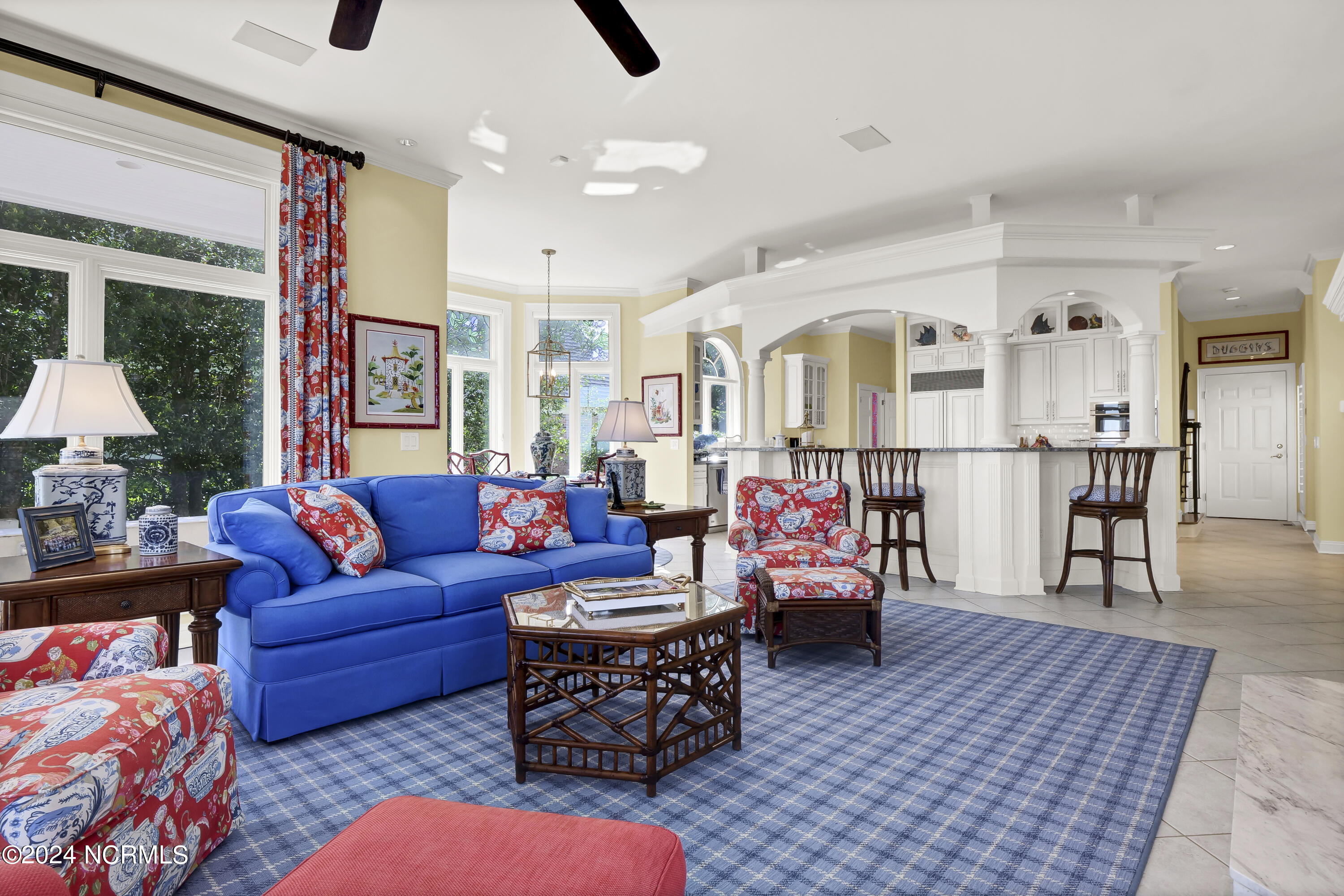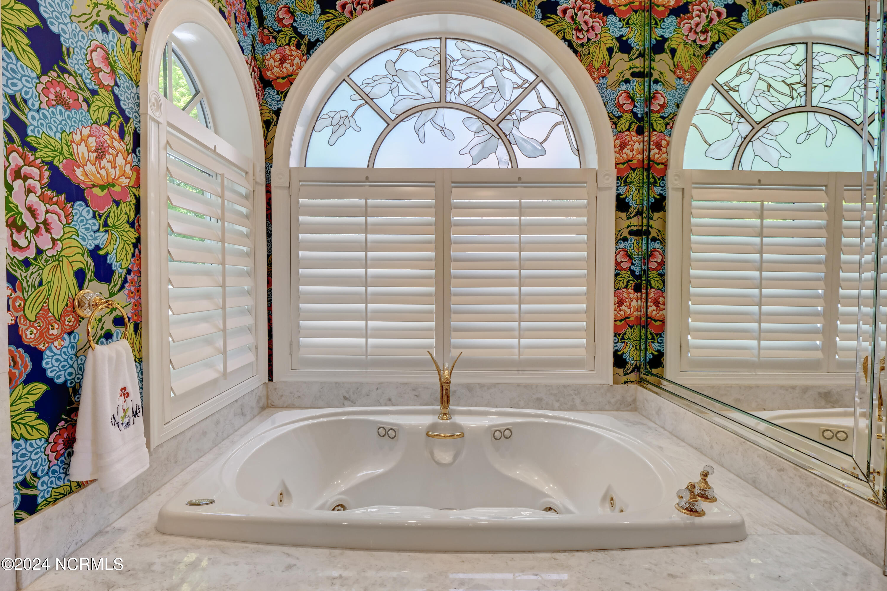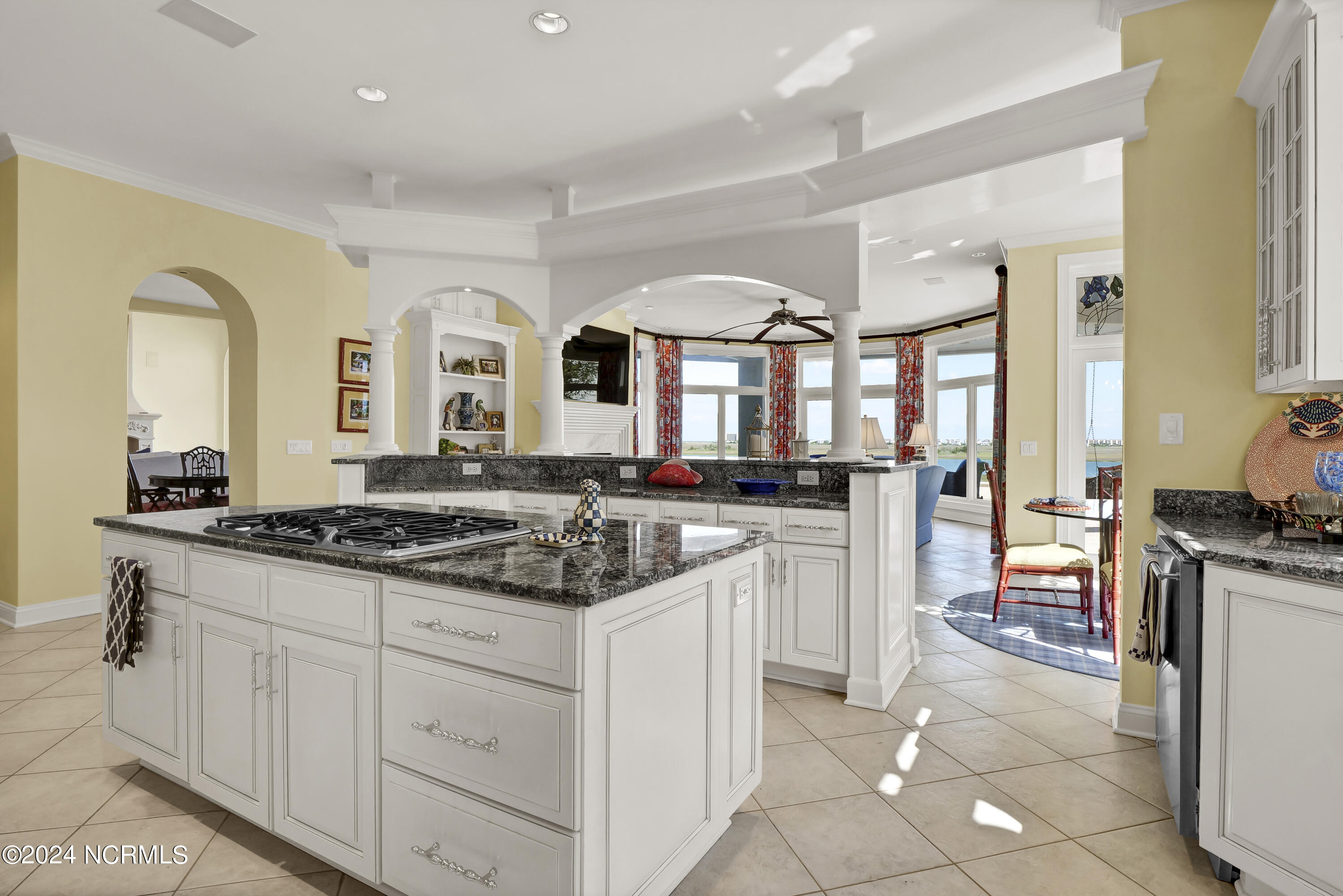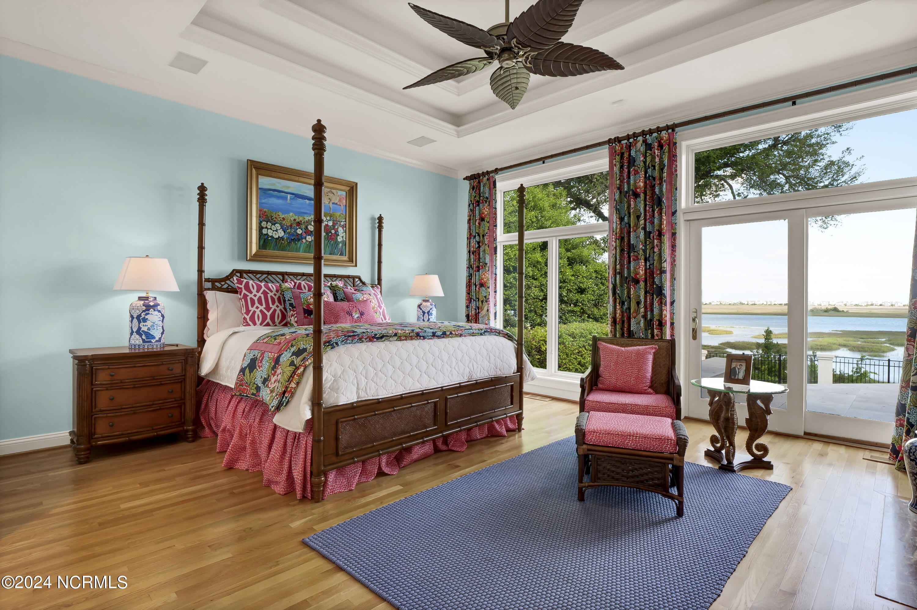 Situated on the Intracoastal Waterway in Landfall, with spectacular views of the ocean and Mason's Inlet, this home is an extraordinary Mediterranean-inspired masterpiece located on Ocean Ridge Drive. The grand entry foyer evokes warmth and luxury with its elegant marble floor, exquisite massive chandelier, and custom wood cathedral ceiling. Curved archways, stately columns, chandelier fixtures, detailed moldings, and gracious arched palladium windows frame the sweeping views of the Intracoastal Waterway, Wrightsville Beach, and Figure 8 Island. Outside, panoramic water views provide the perfect backdrop for outdoor entertaining on the expansive covered porch and patio. The kitchen features an oversized center island and breakfast nook, Thermador gas cooktop, Sub-Zero Designer Series refrigerator, and granite countertops. The kitchen opens up to an inviting sun and sitting room with marble fireplace and large windows overlooking the water views. The formal living great room features a custom wood burning, marble fireplace and walls of two-story palladium windows, a majestic wood cathedral ceiling, and formal dining area overlooking the water views. Entertain your guests from the adjoining full-sized custom bar area with beveled glass shelving, custom stained glass window, sink, cooler, and built-in wine rack. The generous sized main floor owner's suite has a tray ceiling with backlighting, crown molding, and wood-burning marble fireplace flanked by custom built-in cabinets and shelving, double walk-in closets. The marble tile bathroom features designer Sherle Wagner fixtures. Beautiful wallpaper accents the luxury ensuite as well as the two powder rooms and laundry room on the main floor. The three elegant guest rooms upstairs are also complemented with beautiful wall-papered ensuite baths, and one bedroom balcony overlooking water views. The second floor also boasts a beautiful custom walk-in closet and large bonus room.