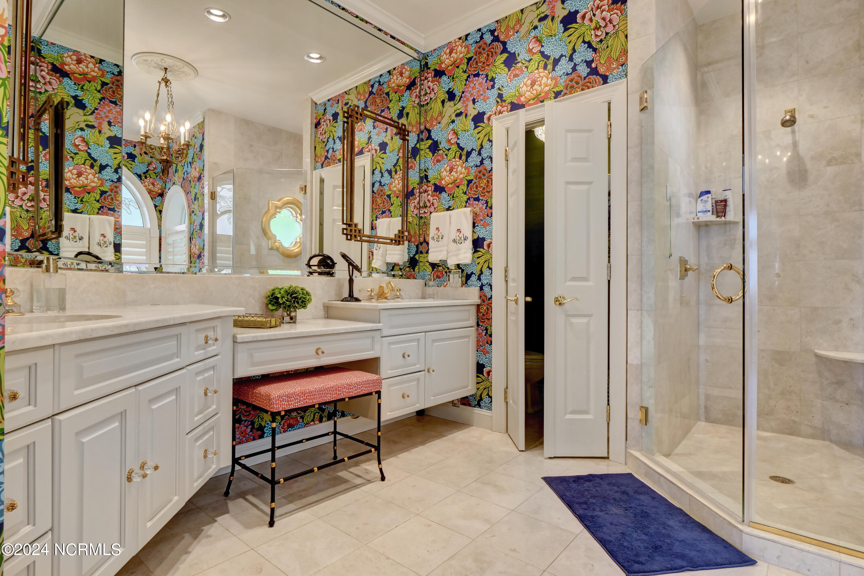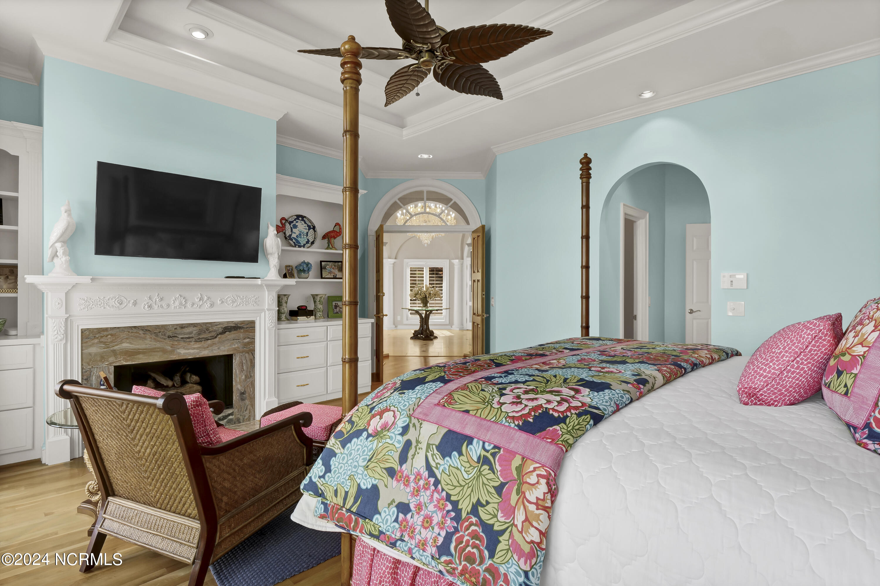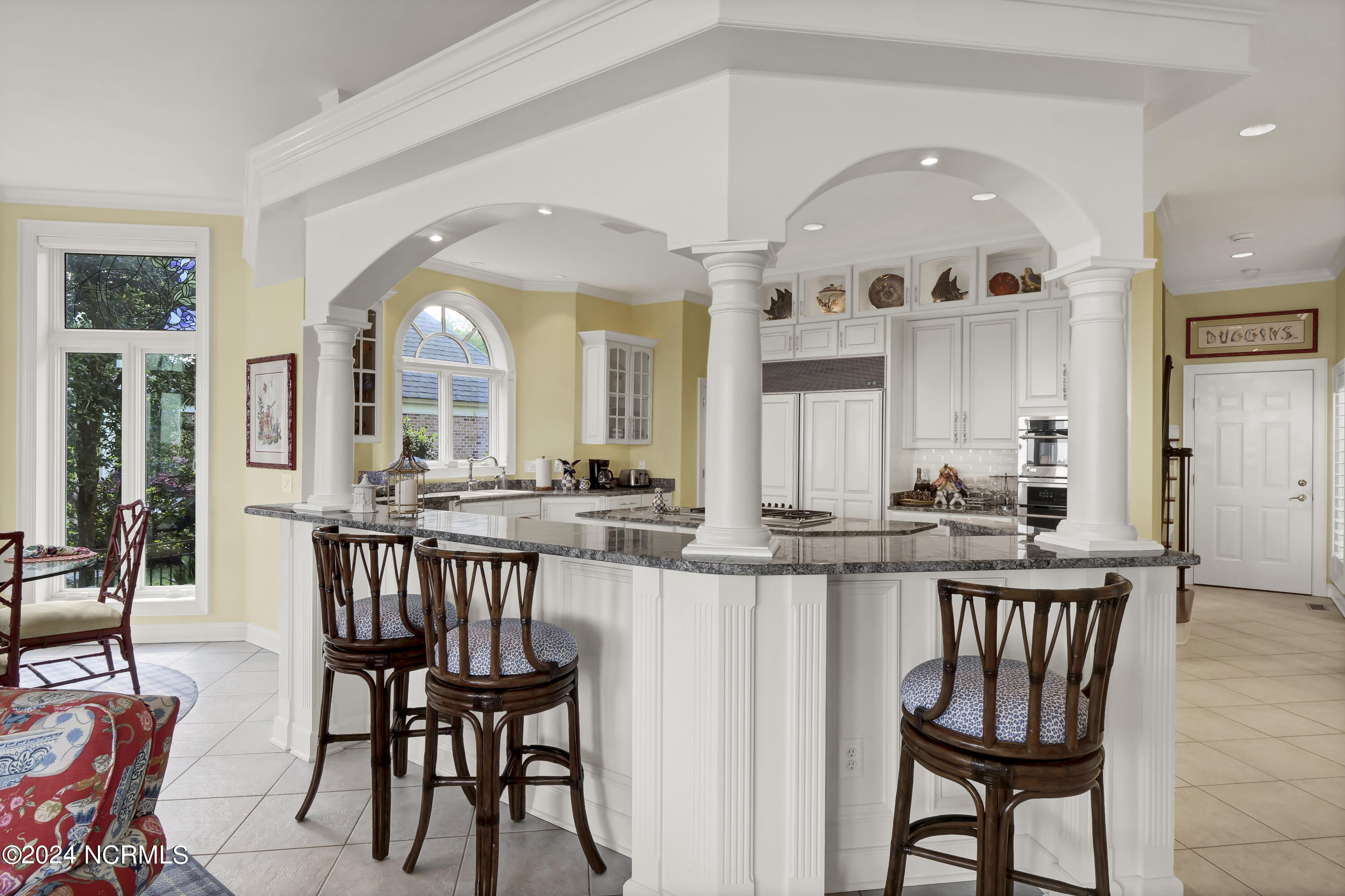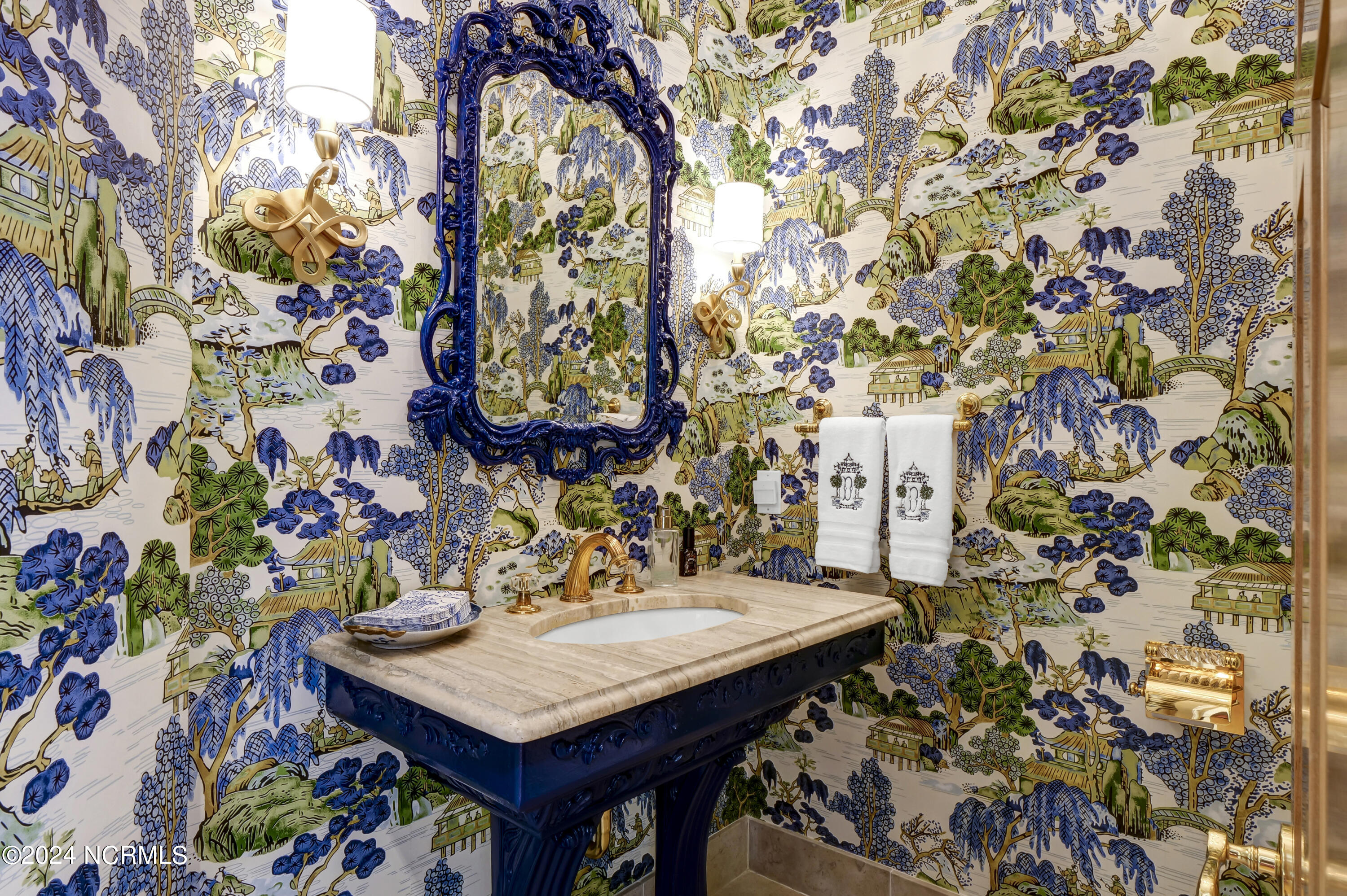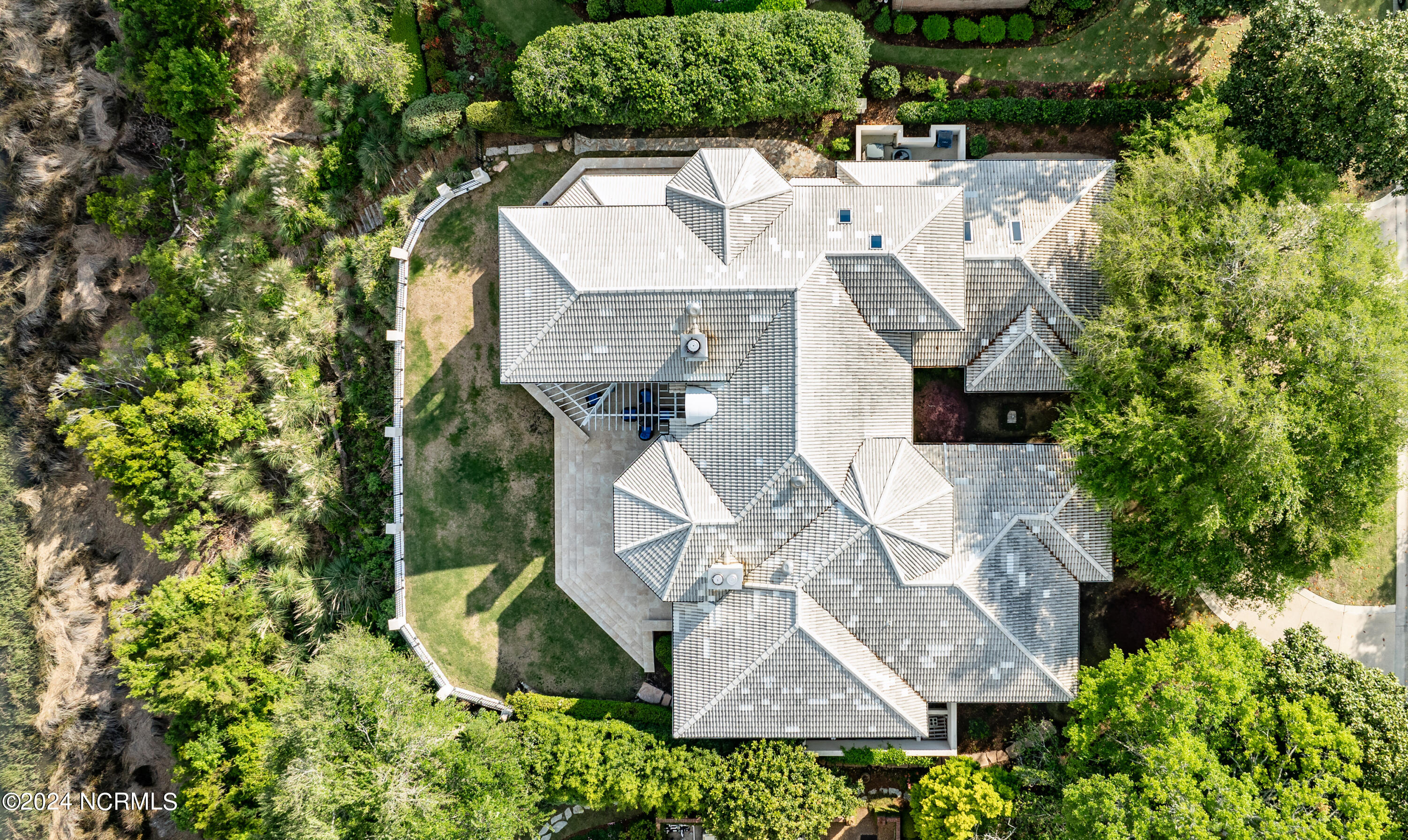 Situated on the Intracoastal Waterway in Landfall, with spectacular views of the ocean and Mason's Inlet, this home is an extraordinary Mediterranean-inspired masterpiece located on Ocean Ridge Drive. The grand entry foyer evokes warmth and luxury with its elegant marble floor, exquisite massive chandelier, and custom wood cathedral ceiling. Curved archways, stately columns, chandelier fixtures, detailed moldings, and gracious arched palladium windows frame the sweeping views of the Intracoastal Waterway, Wrightsville Beach, and Figure 8 Island. Outside, panoramic water views provide the perfect backdrop for outdoor entertaining on the expansive covered porch and patio. The kitchen features an oversized center island and breakfast nook, Thermador gas cooktop, Sub-Zero Designer Series refrigerator, and granite countertops. The kitchen opens up to an inviting sun and sitting room with marble fireplace and large windows overlooking the water views. The formal living great room features a custom wood burning, marble fireplace and walls of two-story palladium windows, a majestic wood cathedral ceiling, and formal dining area overlooking the water views. Entertain your guests from the adjoining full-sized custom bar area with beveled glass shelving, custom stained glass window, sink, cooler, and built-in wine rack. The generous sized main floor owner's suite has a tray ceiling with backlighting, crown molding, and wood-burning marble fireplace flanked by custom built-in cabinets and shelving, double walk-in closets. The marble tile bathroom features designer Sherle Wagner fixtures. Beautiful wallpaper accents the luxury ensuite as well as the two powder rooms and laundry room on the main floor. The three elegant guest rooms upstairs are also complemented with beautiful wall-papered ensuite baths, and one bedroom balcony overlooking water views. The second floor also boasts a beautiful custom walk-in closet and large bonus room.