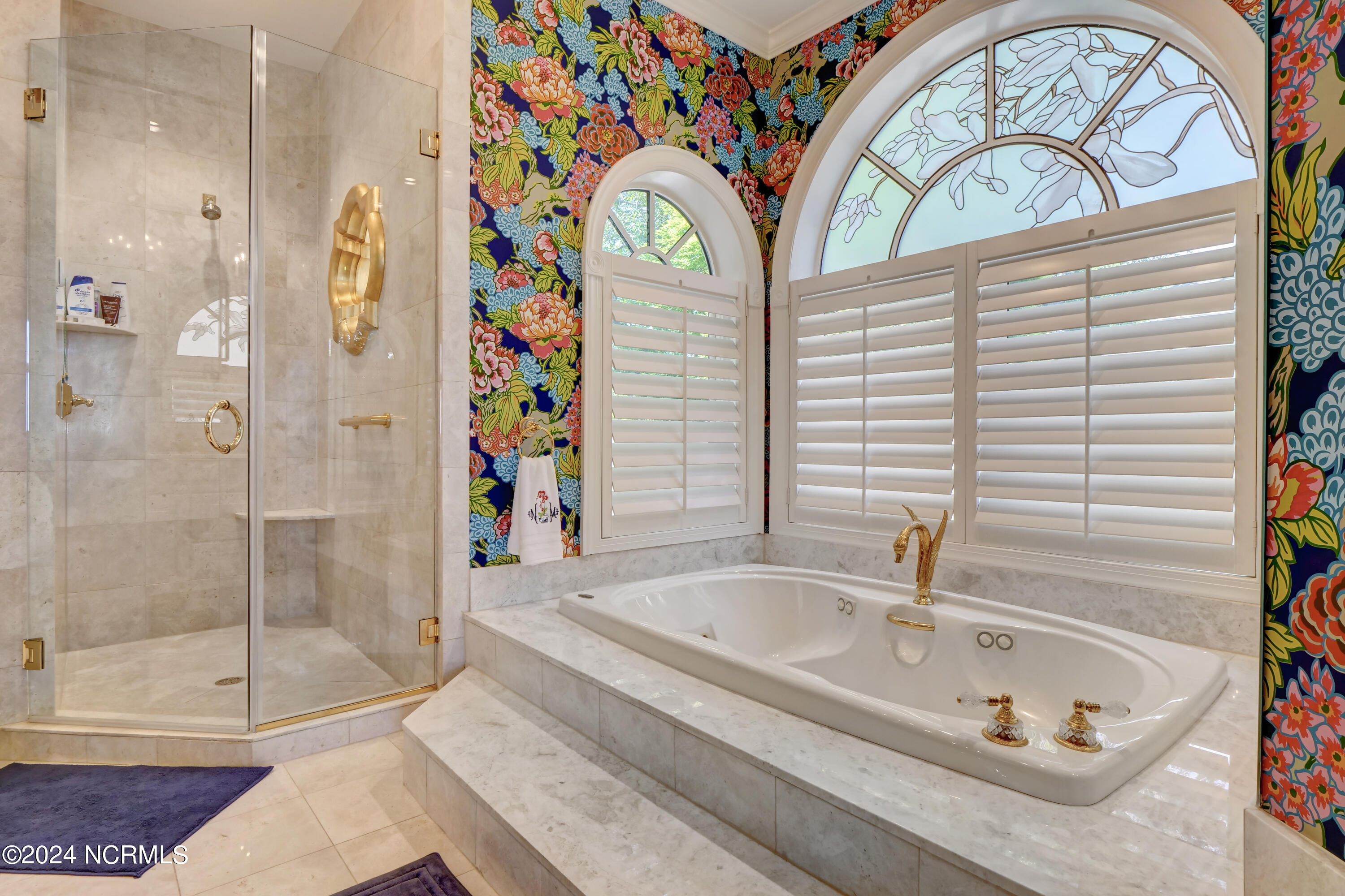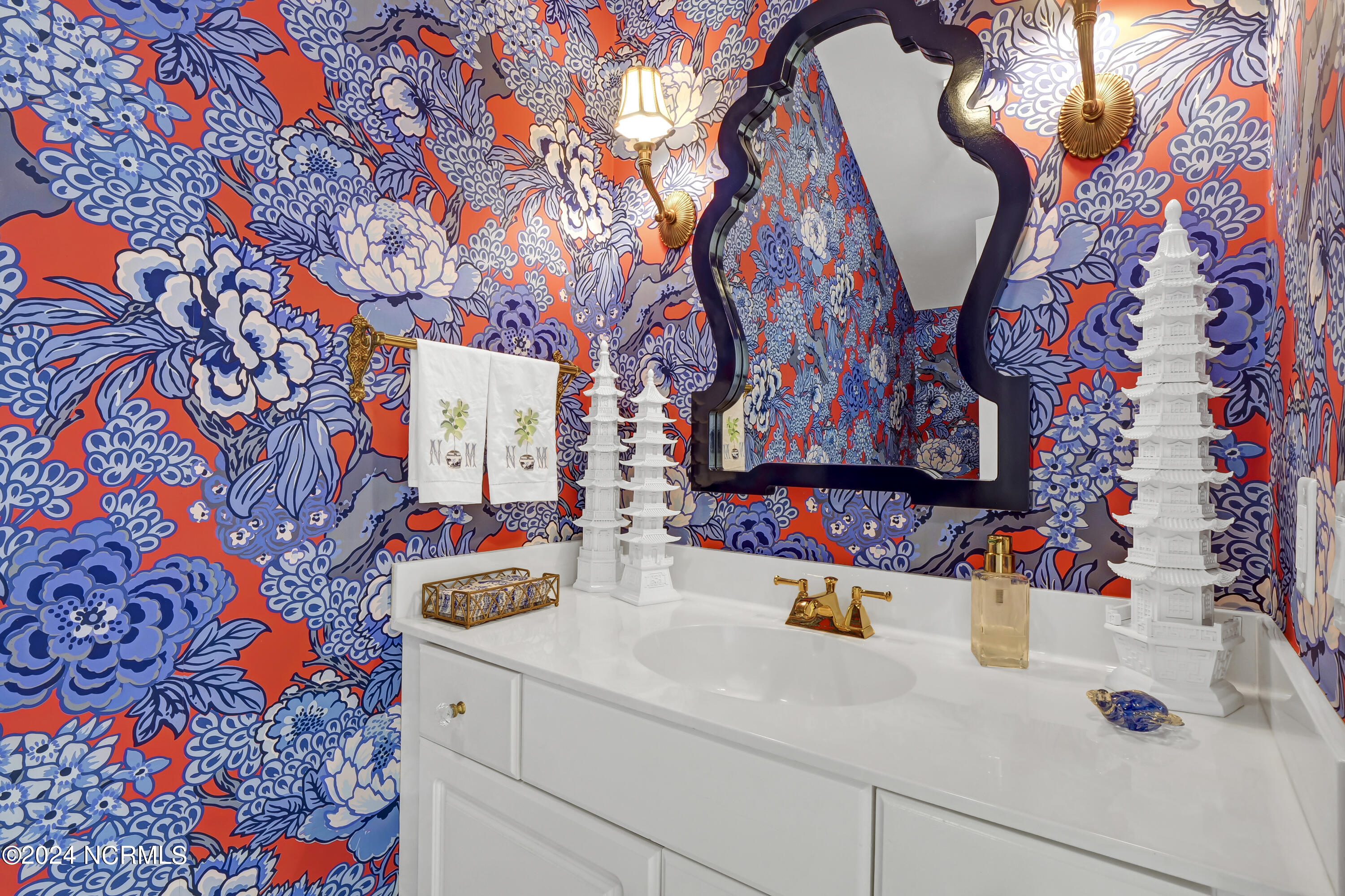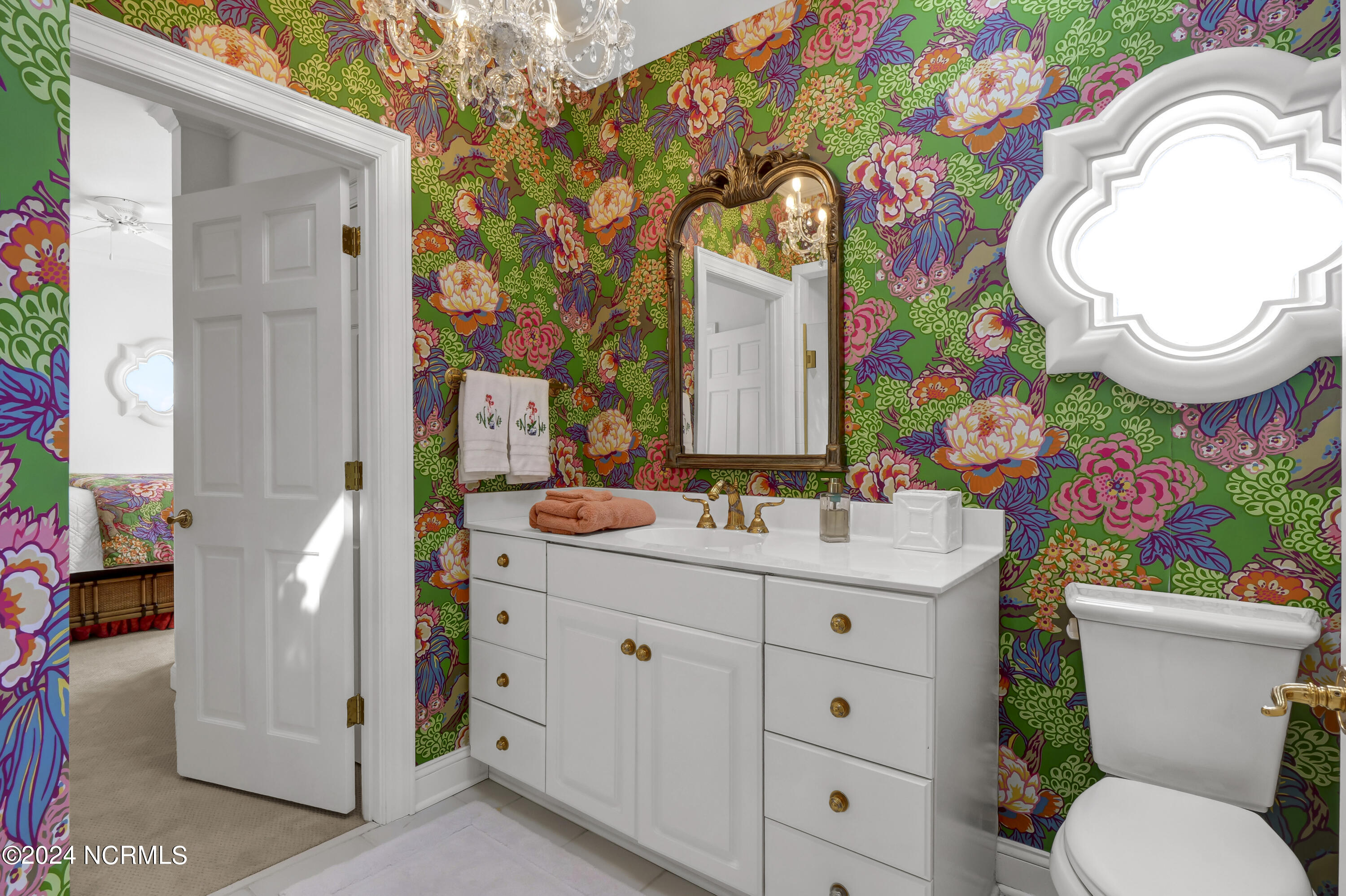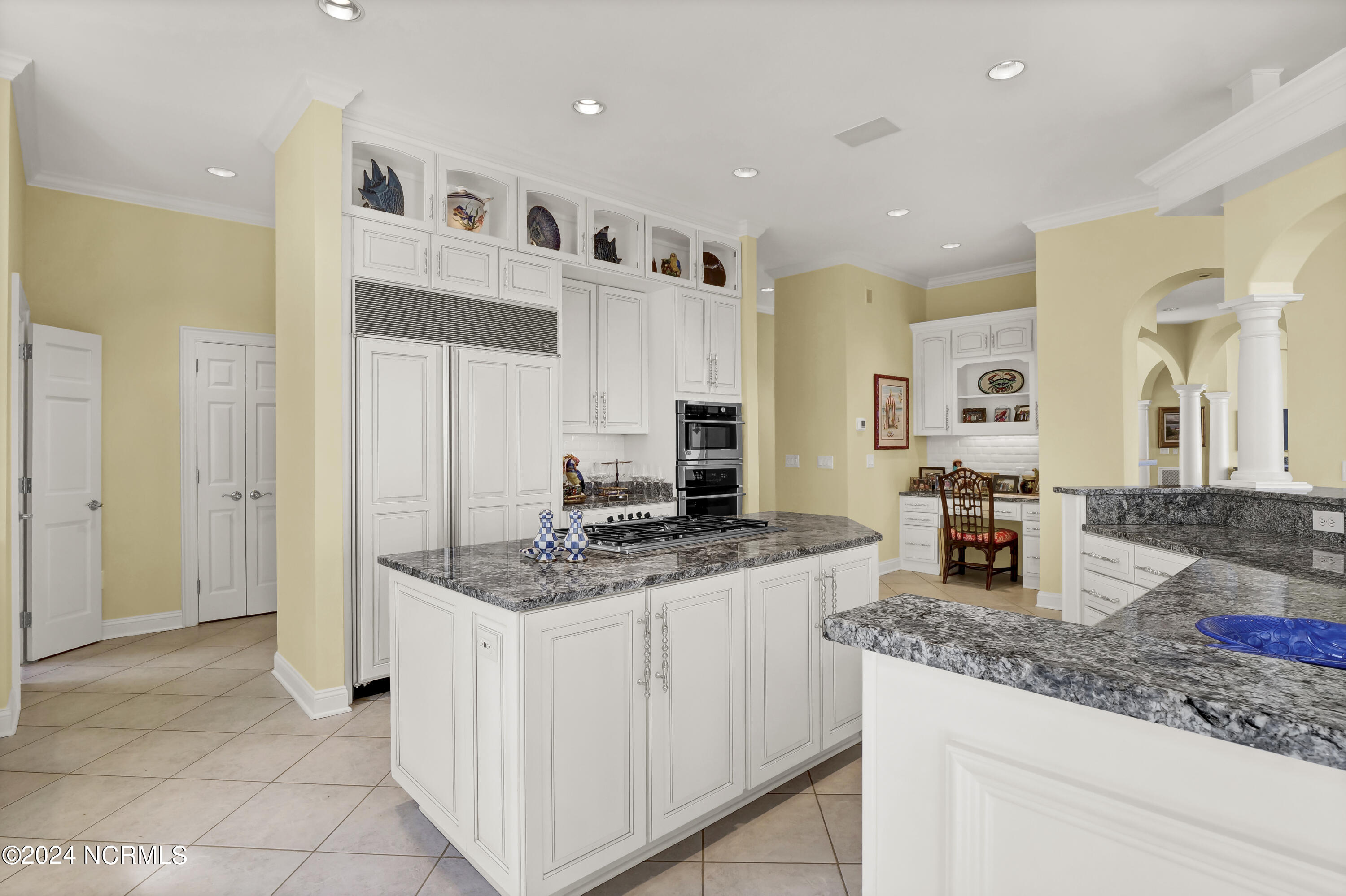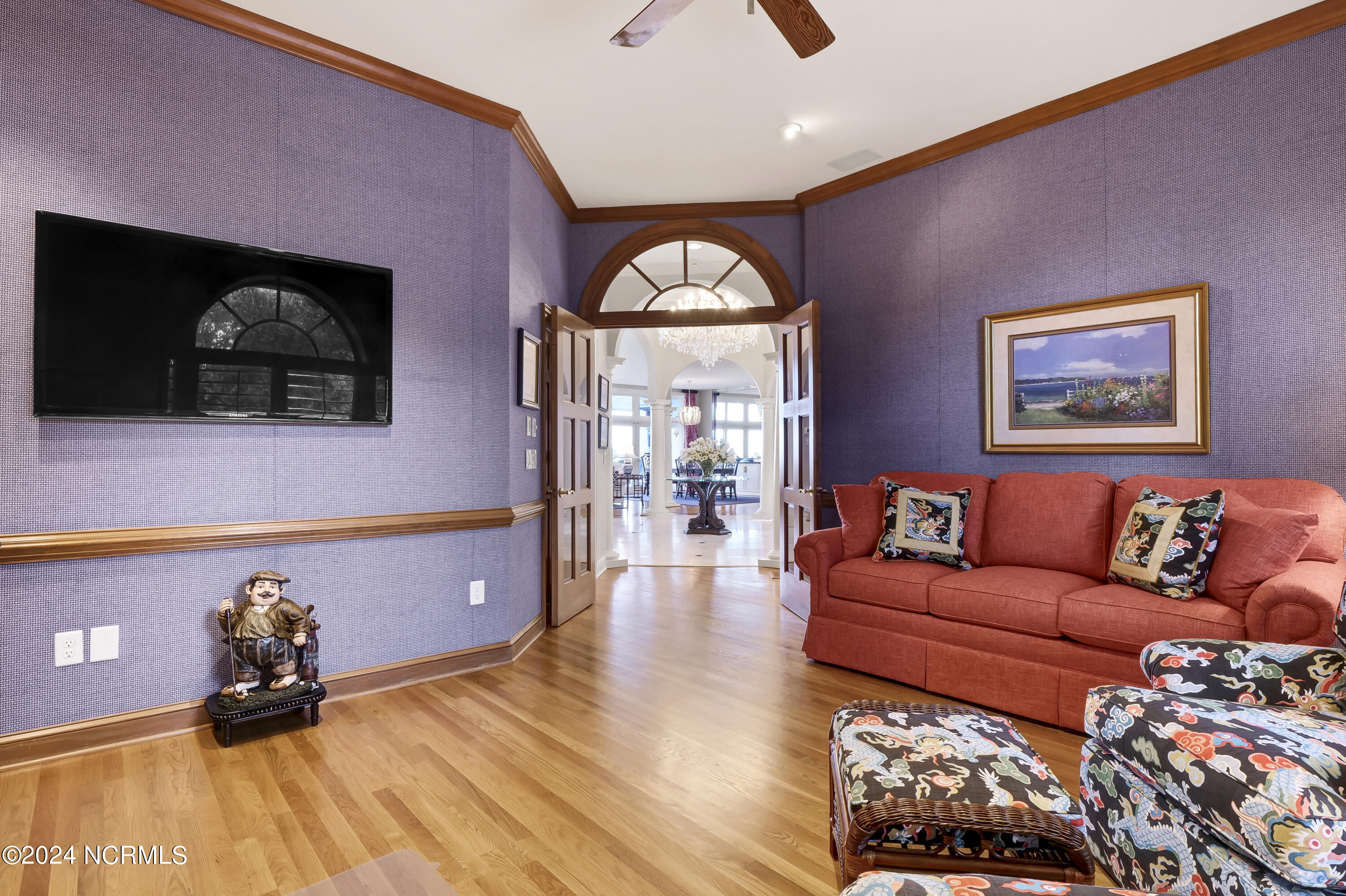 Situated on the Intracoastal Waterway in Landfall, with spectacular views of the ocean and Mason's Inlet, this home is an extraordinary Mediterranean-inspired masterpiece located on Ocean Ridge Drive. The grand entry foyer evokes warmth and luxury with its elegant marble floor, exquisite massive chandelier, and custom wood cathedral ceiling. Curved archways, stately columns, chandelier fixtures, detailed moldings, and gracious arched palladium windows frame the sweeping views of the Intracoastal Waterway, Wrightsville Beach, and Figure 8 Island. Outside, panoramic water views provide the perfect backdrop for outdoor entertaining on the expansive covered porch and patio. The kitchen features an oversized center island and breakfast nook, Thermador gas cooktop, Sub-Zero Designer Series refrigerator, and granite countertops. The kitchen opens up to an inviting sun and sitting room with marble fireplace and large windows overlooking the water views. The formal living great room features a custom wood burning, marble fireplace and walls of two-story palladium windows, a majestic wood cathedral ceiling, and formal dining area overlooking the water views. Entertain your guests from the adjoining full-sized custom bar area with beveled glass shelving, custom stained glass window, sink, cooler, and built-in wine rack. The generous sized main floor owner's suite has a tray ceiling with backlighting, crown molding, and wood-burning marble fireplace flanked by custom built-in cabinets and shelving, double walk-in closets. The marble tile bathroom features designer Sherle Wagner fixtures. Beautiful wallpaper accents the luxury ensuite as well as the two powder rooms and laundry room on the main floor. The three elegant guest rooms upstairs are also complemented with beautiful wall-papered ensuite baths, and one bedroom balcony overlooking water views. The second floor also boasts a beautiful custom walk-in closet and large bonus room.