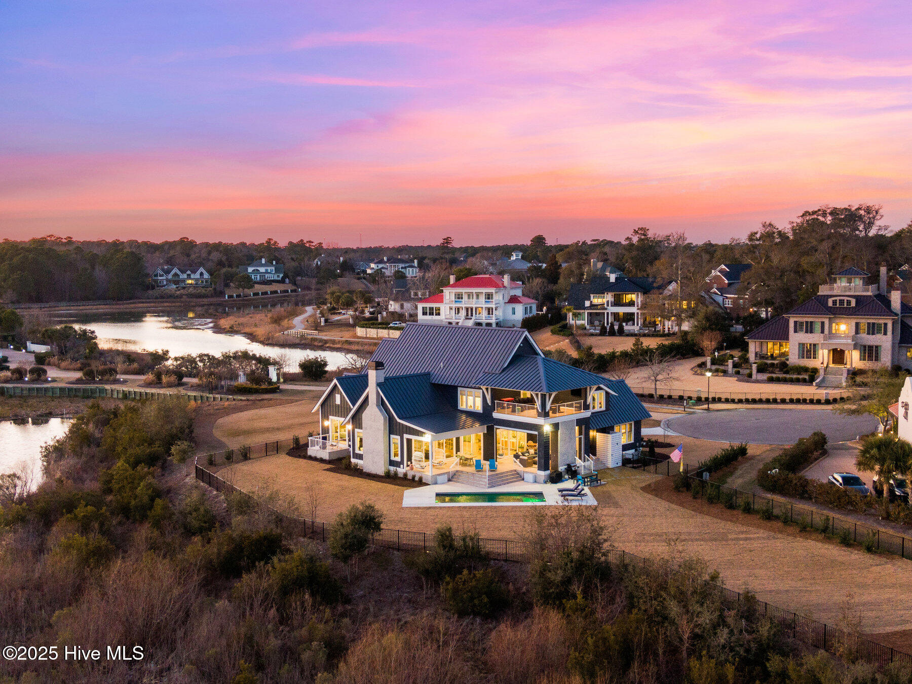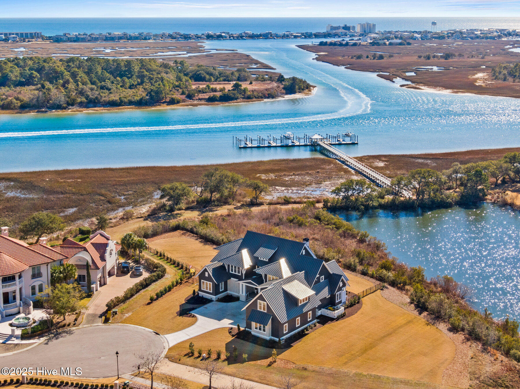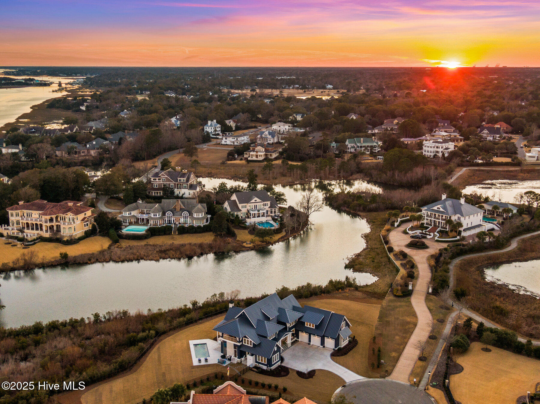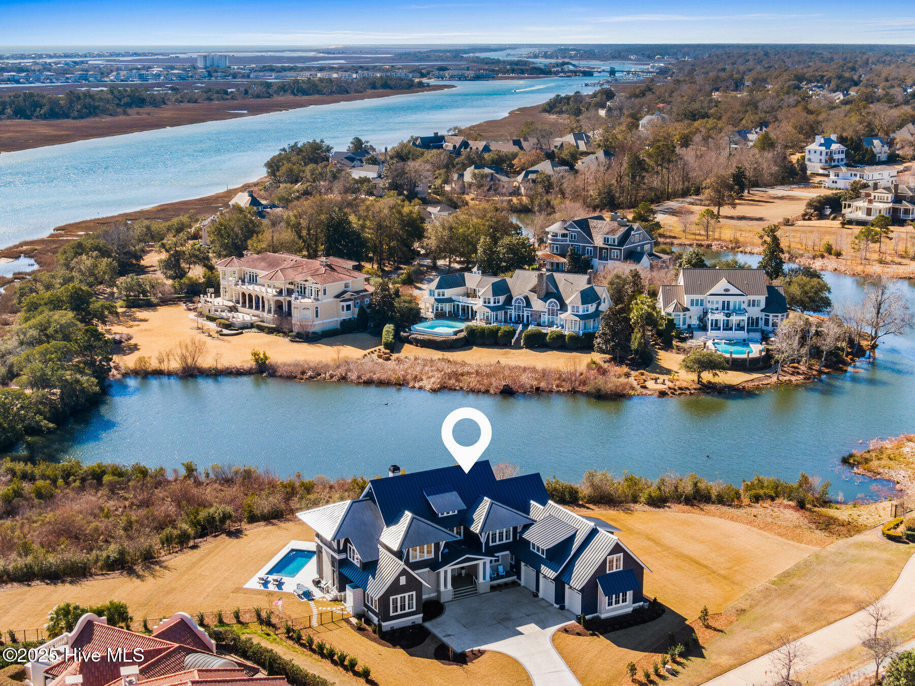 Nestled on one of the most coveted homesites in the prestigious gated community of Landfall, this newly constructed waterfront estate is a true masterpiece of modern coastal luxury. Perfectly positioned between the Intracoastal Waterway and the tranquil waters of Landfall Lake, this breathtaking residence offers unparalleled water views, capturing sunrises over the Intracoastal and the soft glow of sunset reflections over Landfall Lake. Designed for the discerning homeowner, this 6-bed, 6-bath estate showcases refined elegance and contemporary coastal sophistication. An open, light-filled floor plan creates an inviting ambiance, complemented by bespoke finishes, conditioned wine cellar, designer lighting, and high-end appliances throughout. The home is truly turnkey, blending coastal style with effortless livability. Featuring exceptional outdoor living & private boating access, this is one of only ten residences in Landfall with a private boat slip and dock, complete with power, water, and a storage locker, a rare and highly sought-after amenity. Just a brief walk from the home, the newly renovated dock offers effortless access to the Intracoastal Waterway and Atlantic Ocean. Imagine stepping from your home onto your boat for a sunset cruise or watching dolphins and herons from your outdoor patio. The resort-style outdoor living areas are designed for both grand entertaining and intimate relaxation. A covered patio overlooking the pool and boat dock features a kegerator, outdoor fireplace, retractable screens, and an unrivaled waterfront backdrop. A second-floor covered terrace provides yet another inviting space to take in sweeping water views. A sanctuary of sophisticated comfort, the expansive primary suite is a true retreat, featuring a private balcony with serene views over the water, spacious his-and-hers closets, a spa-like bath with a soaking tub, and private outdoor shower. Upstairs, three additional bedrooms, all with en-suite baths, offer luxurious accommodations, and a secluded additional guest suite on the second floor ensures privacy and comfort. With unparalleled amenities & thoughtful design, every detail of this home has been meticulously curated to offer both luxury and functionality: gourmet kitchen and scullery with top-tier appliances and a filtered water bottle filler; private second-floor office with adjacent workout space; workout/fitness room; conditioned wine cellar; coffee and bar station featuring a wine fridge, beverage fridge, and a rapid crushed ice maker; spacious kids' bonus room with a cozy movie nook; sixth bedroom that can serve as a second office; three-car garage with 9 foot doors; and so much more.