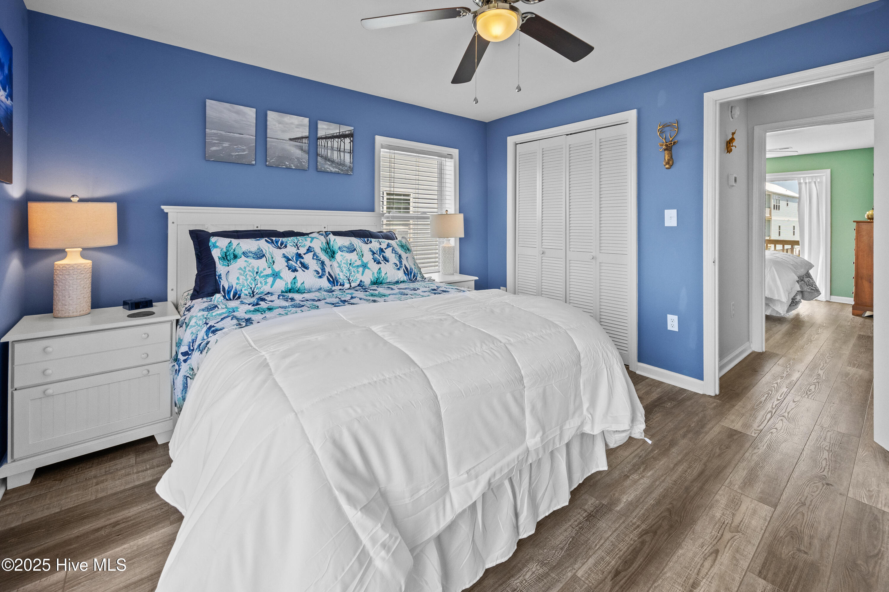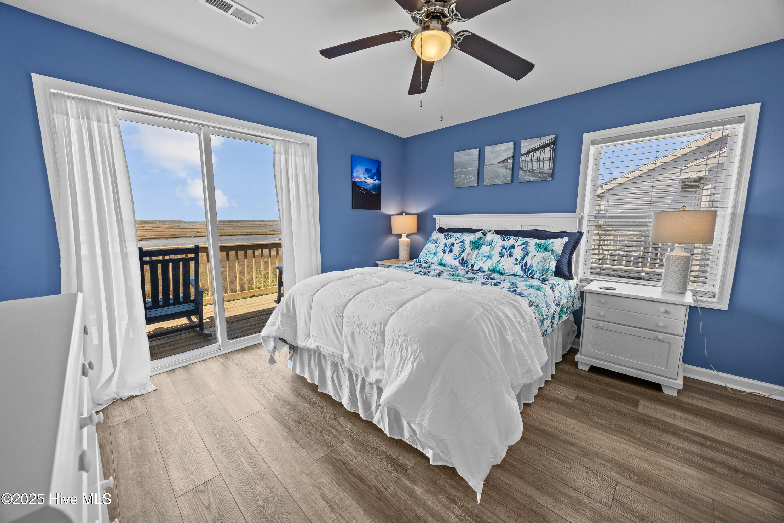 Upstairs, both bedrooms are bright and inviting, with large windows framing serene water views. Each room features a queen bed and an additional twin roll-out, while a second full bath completes the upper floor. A queen sleeper sofa in the living room provides extra space for guests, allowing this home to comfortably sleep up to eight.