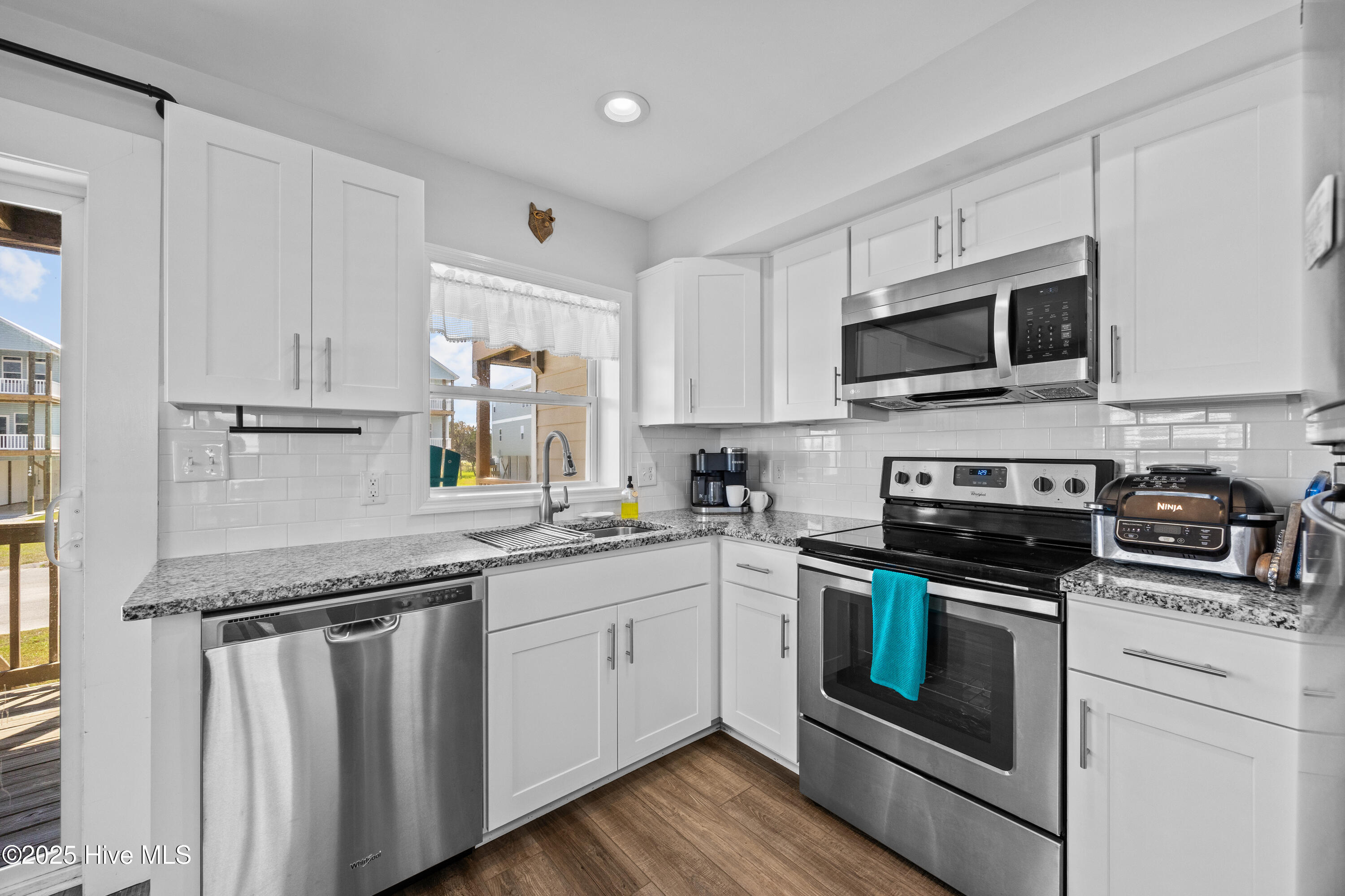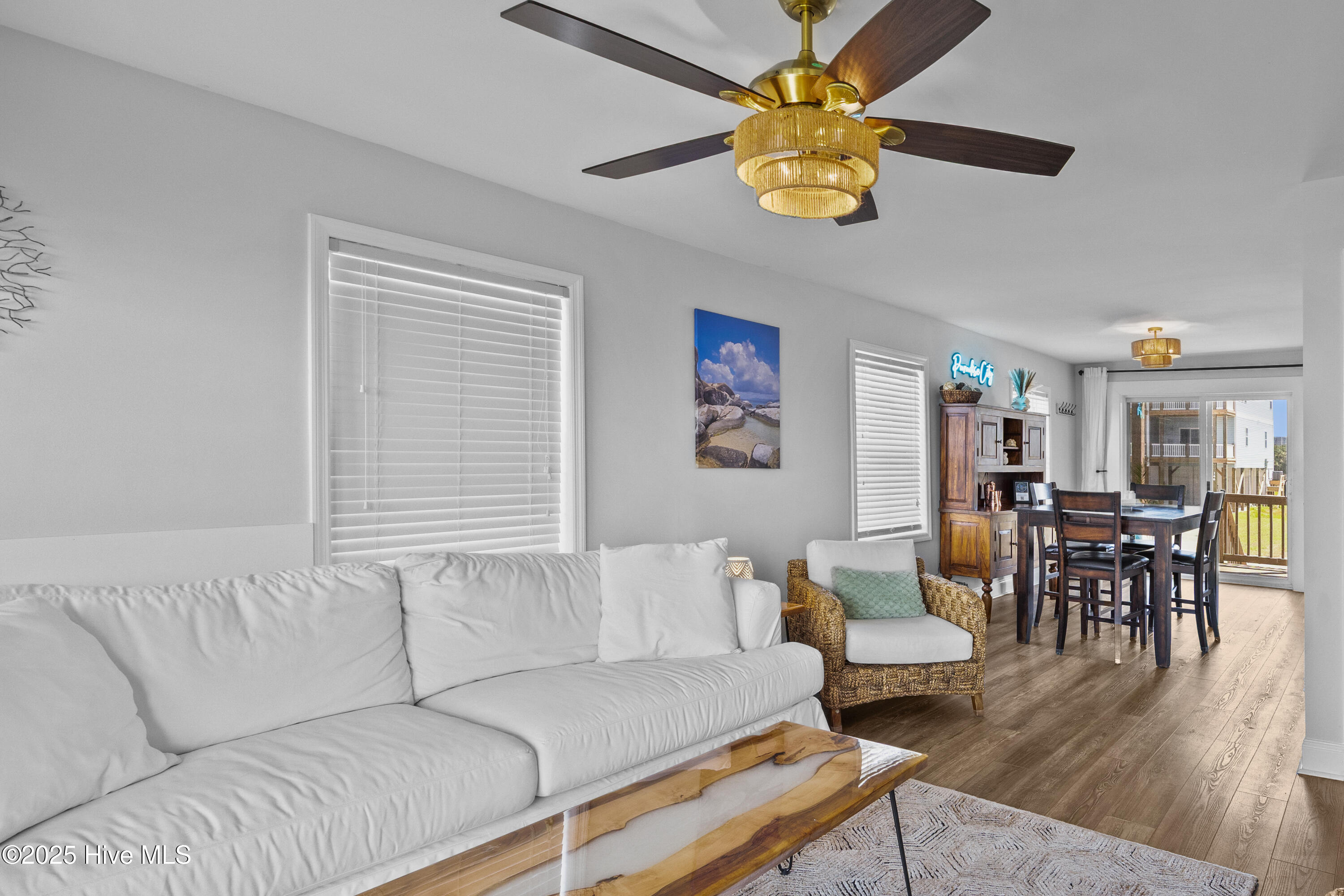 Inside, the open-concept main level blends coastal comfort with modern design. Luxury vinyl plank flooring and fresh paint create a light, durable, low-maintenance space designed for beachside living. The kitchen is equipped with sleek stainless steel appliances, generous counter space, and a dining area that seats six comfortably--perfect for family meals or casual gatherings. A full bathroom is also located on this level for convenience.