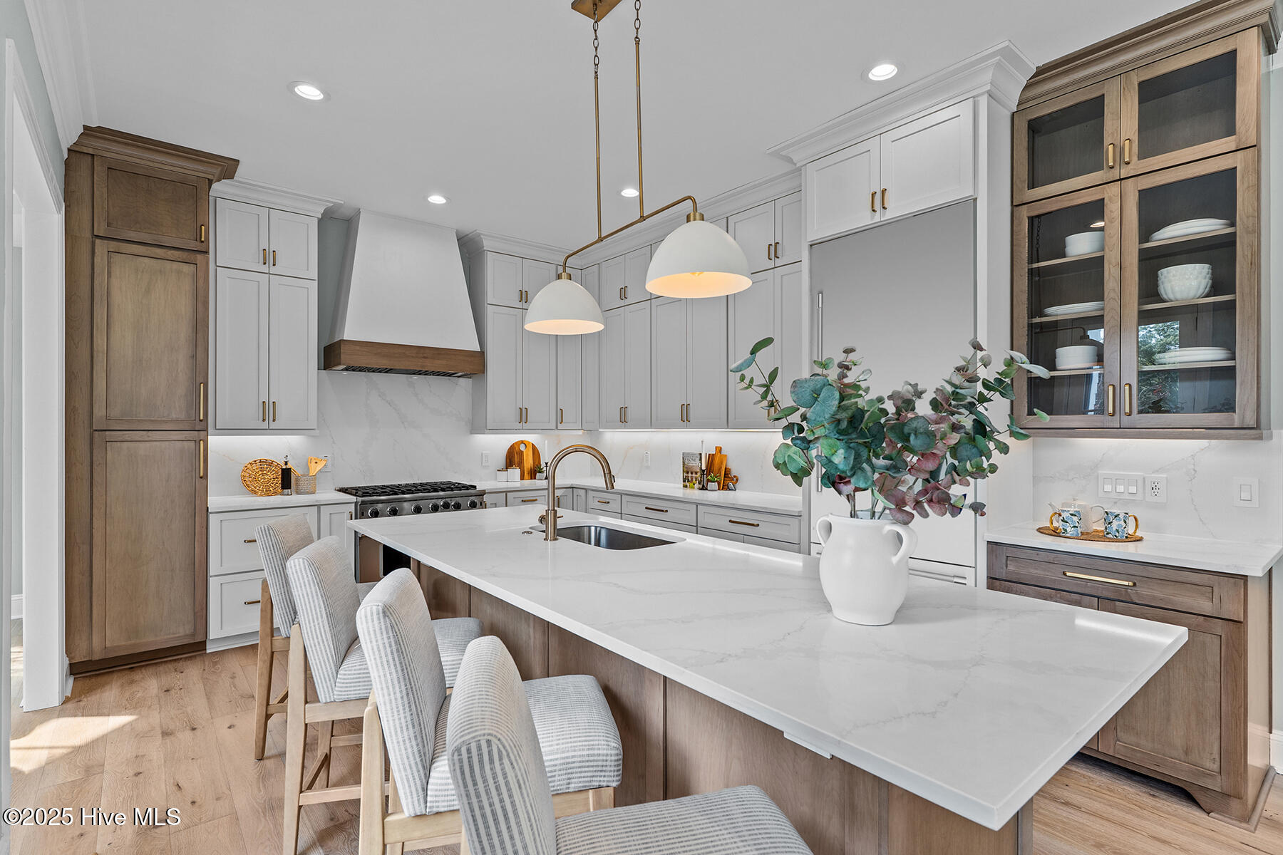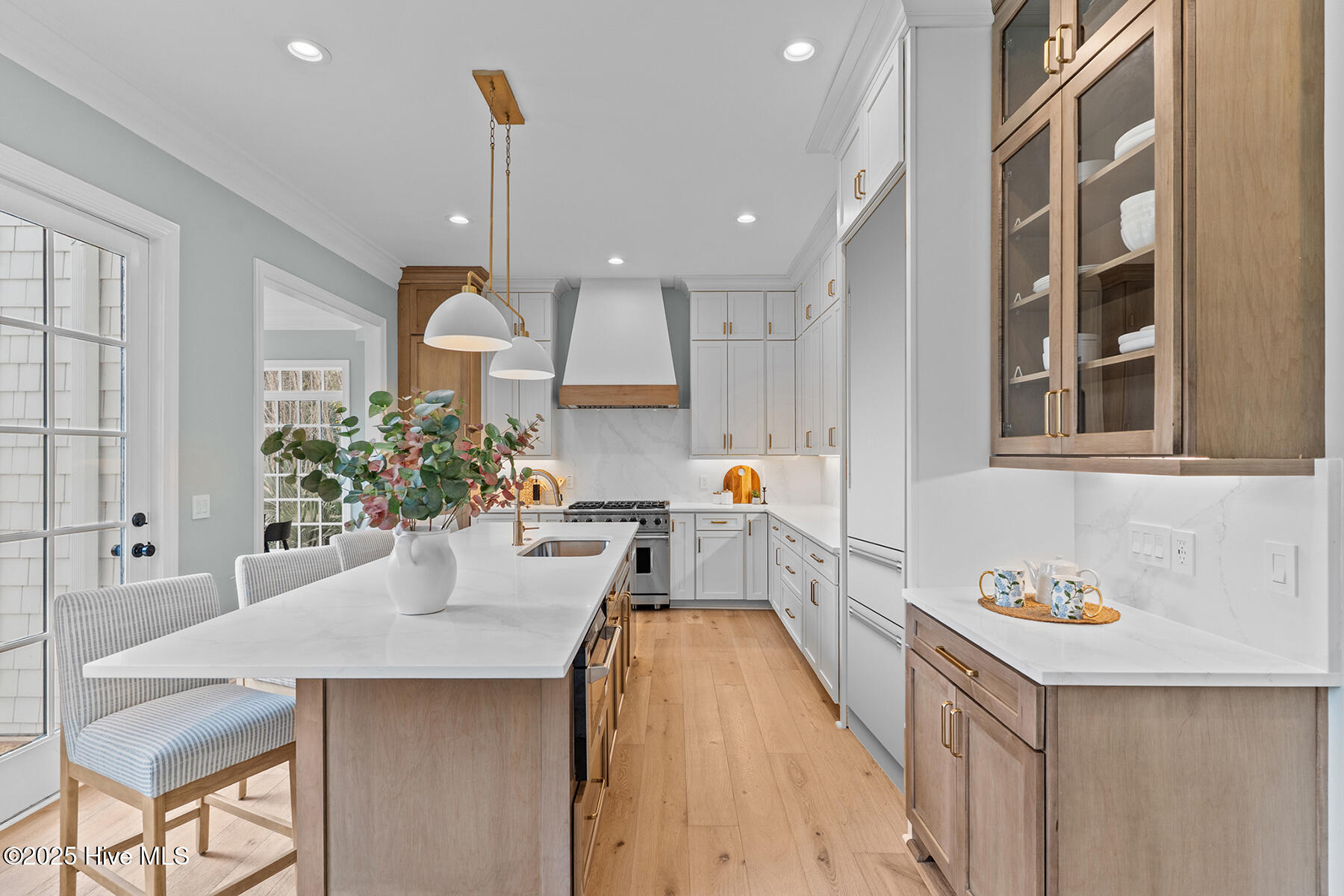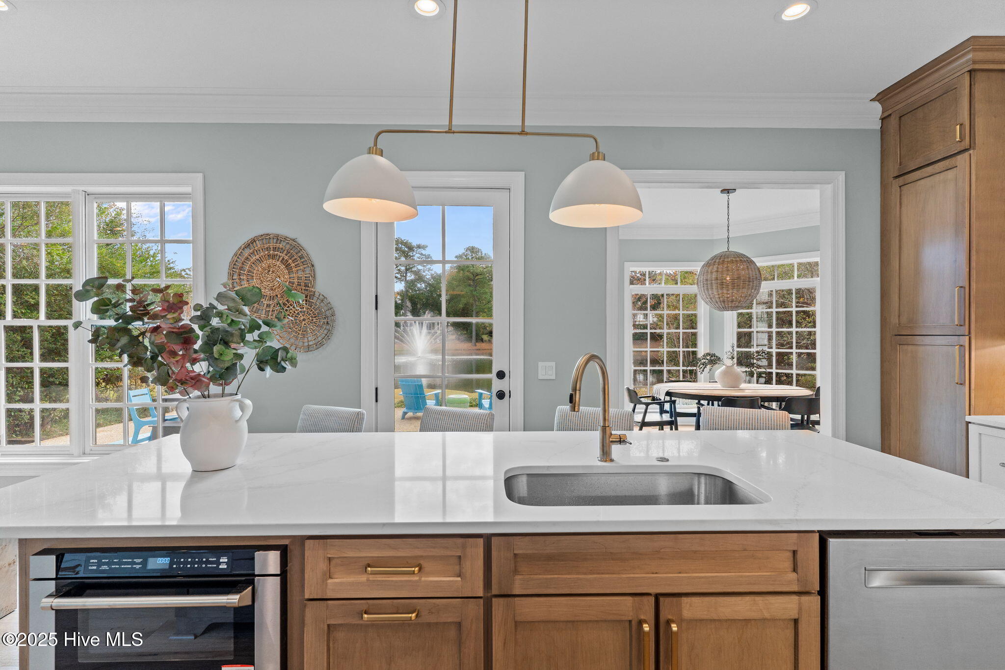 The main living room captures sweeping pond views and includes a refined wet bar with wine refrigeration. A dramatic two story study with soaring windows and a fireplace anchors the home. A cheerful dining area overlooks the water and connects to the renovated kitchen and an additional living space. The custom kitchen features quartz surfaces, a large island, and brand new luxury appliances, including a Viking gas range and Thermador refrigerator.