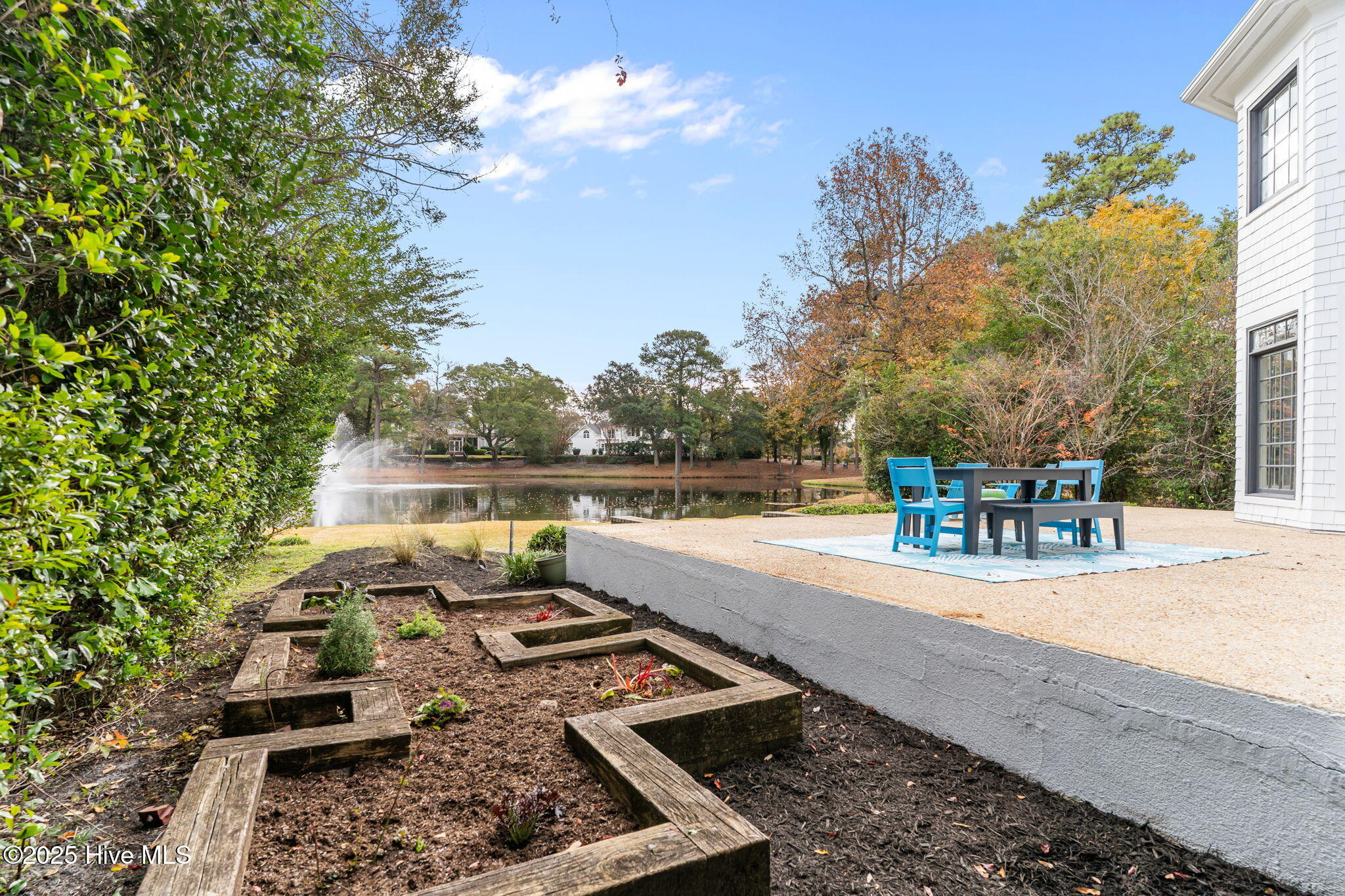 The backyard includes a charming herb garden and a peaceful patio with retractable shade overlooking the pond.