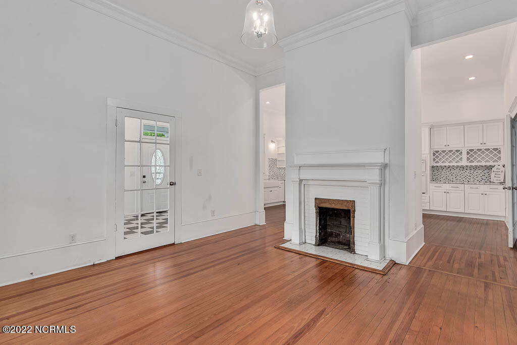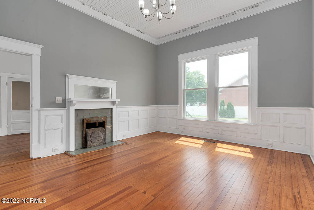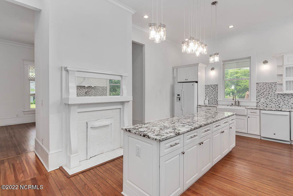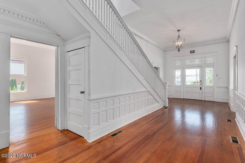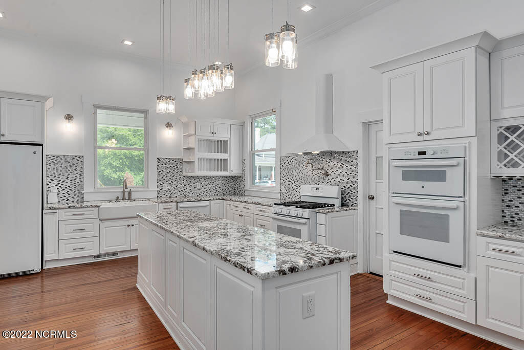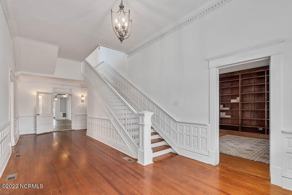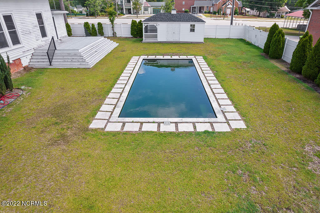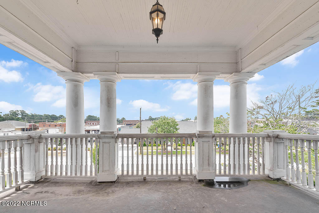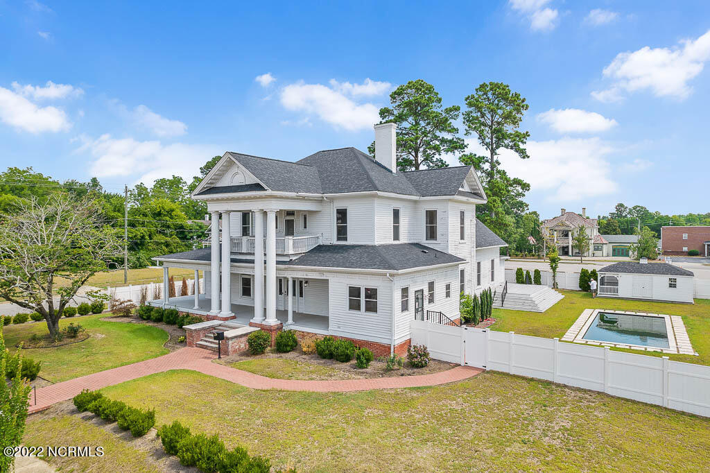 Recently sanded and painted! Check out this imposing two-story, double-pile framed house offers a unique blend of southern charm with modern upgrades. Its historic ''T'' shape comes with a hip roof above the front portion and gables on either side. The home's fluted Corinthian columns create an amazing curb appeal. The seemingly endless wraparound porch serves its guests an opportunity for relaxation. Entering the home, you immediately encounter beautiful wooden floors, elegant wainscoting and dentil crown molding. The impressive new kitchen offers granite counter tops, light fixtures, new appliances and an island that serves as an ideal gathering place. Off the study, there is a bedroom with a newly-added kitchenette equipped with a sink, microwave, mini-fridge and stovetop. There are several bedrooms on the first floor, an oversized laundry room and a powder room. The stately stairwell with white wooden spindles leads to the second floor where you will find three more bedrooms including the primary. The bathrooms have tile throughout and new clawfoot tubs. The primary bath features double shower heads, two sinks and mirrors. A second story balustraded balcony is on the front and in the rear are the tympanums of the pediment. Venturing up another flight of heart pine treads to the third floor, you will find a carpeted area perfect for a recreational room. On one side of the home, there is a private screened-in porch with an astounding 16-person spa. On the other side, you will enter a private area surrounded by a new white vinyl fence that offers a recently-added in-ground saltwater pool. This layout is perfect for cooling off during NC's warm summers and entertaining guests. This home can serve as the perfect primary residence; however, opportunistic entrepreneurs should take notice as well.