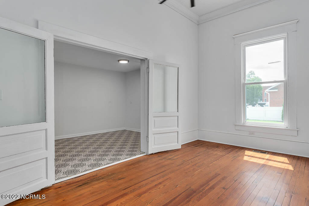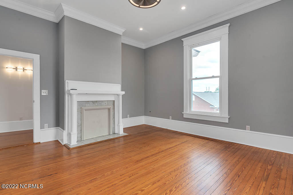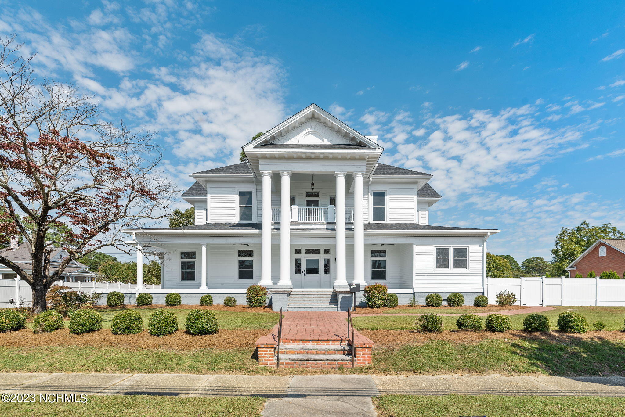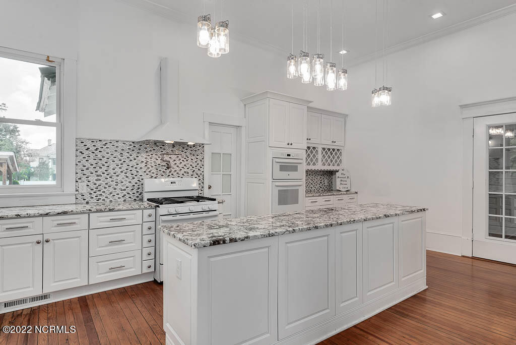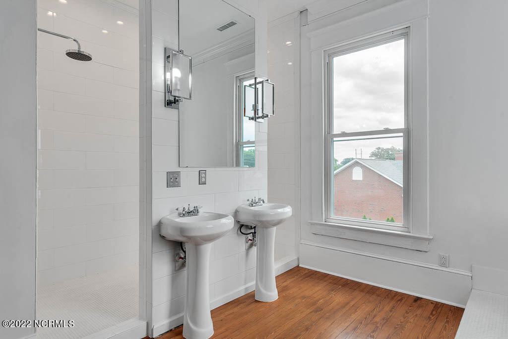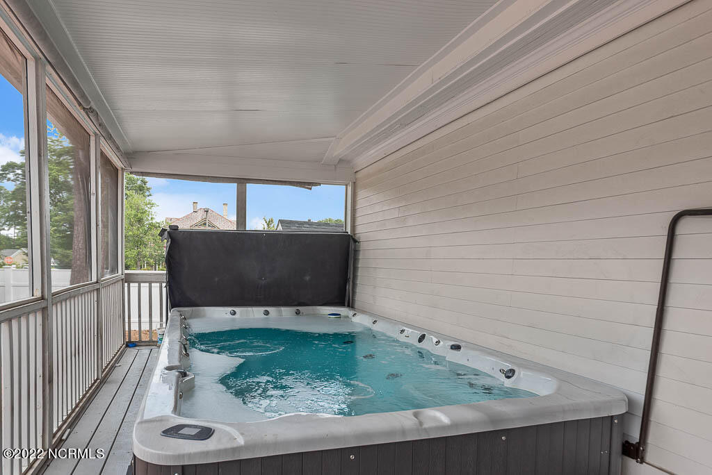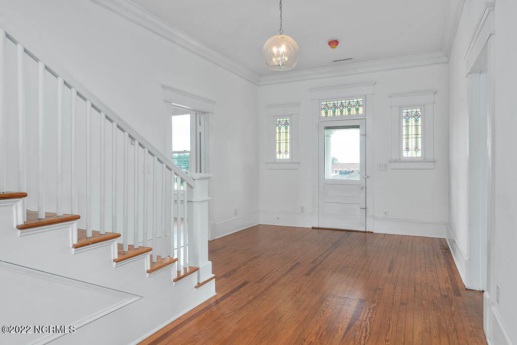 Recently sanded and painted! Check out this imposing two-story, double-pile framed house offers a unique blend of southern charm with modern upgrades. Its historic ''T'' shape comes with a hip roof above the front portion and gables on either side. The home's fluted Corinthian columns create an amazing curb appeal. The seemingly endless wraparound porch serves its guests an opportunity for relaxation. Entering the home, you immediately encounter beautiful wooden floors, elegant wainscoting and dentil crown molding. The impressive new kitchen offers granite counter tops, light fixtures, new appliances and an island that serves as an ideal gathering place. Off the study, there is a bedroom with a newly-added kitchenette equipped with a sink, microwave, mini-fridge and stovetop. There are several bedrooms on the first floor, an oversized laundry room and a powder room. The stately stairwell with white wooden spindles leads to the second floor where you will find three more bedrooms including the primary. The bathrooms have tile throughout and new clawfoot tubs. The primary bath features double shower heads, two sinks and mirrors. A second story balustraded balcony is on the front and in the rear are the tympanums of the pediment. Venturing up another flight of heart pine treads to the third floor, you will find a carpeted area perfect for a recreational room. On one side of the home, there is a private screened-in porch with an astounding 16-person spa. On the other side, you will enter a private area surrounded by a new white vinyl fence that offers a recently-added in-ground saltwater pool. This layout is perfect for cooling off during NC's warm summers and entertaining guests. This home can serve as the perfect primary residence; however, opportunistic entrepreneurs should take notice as well.