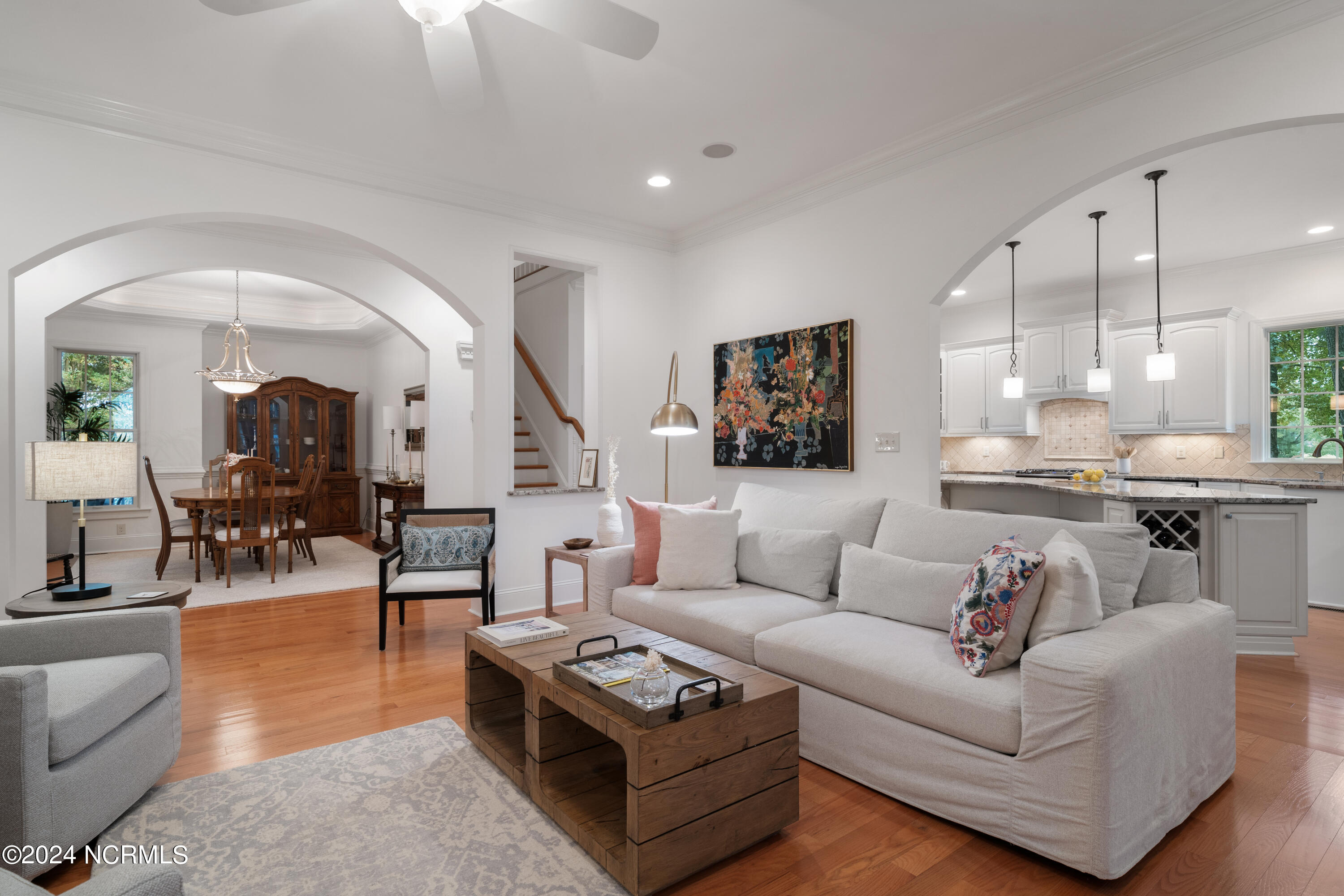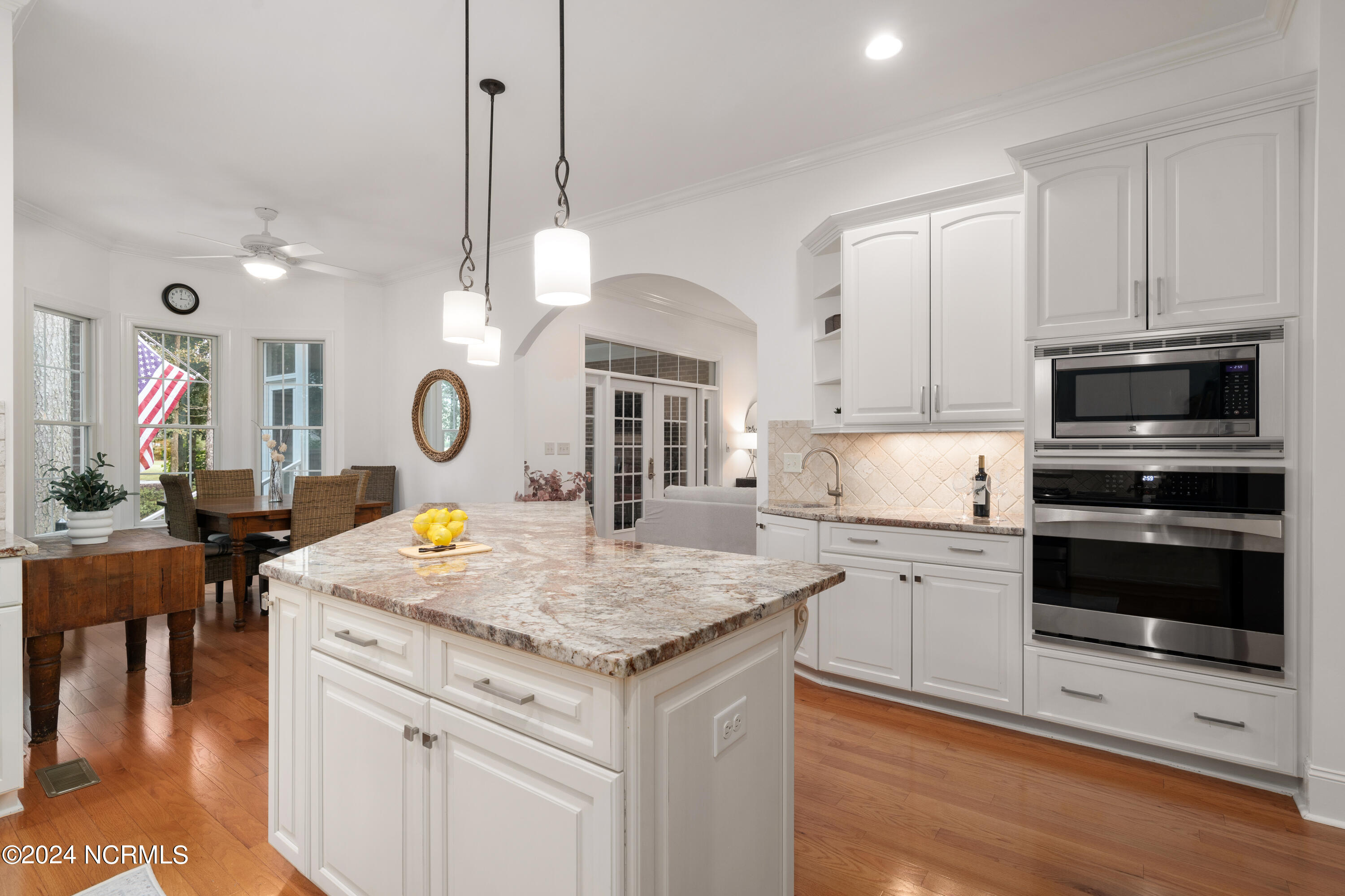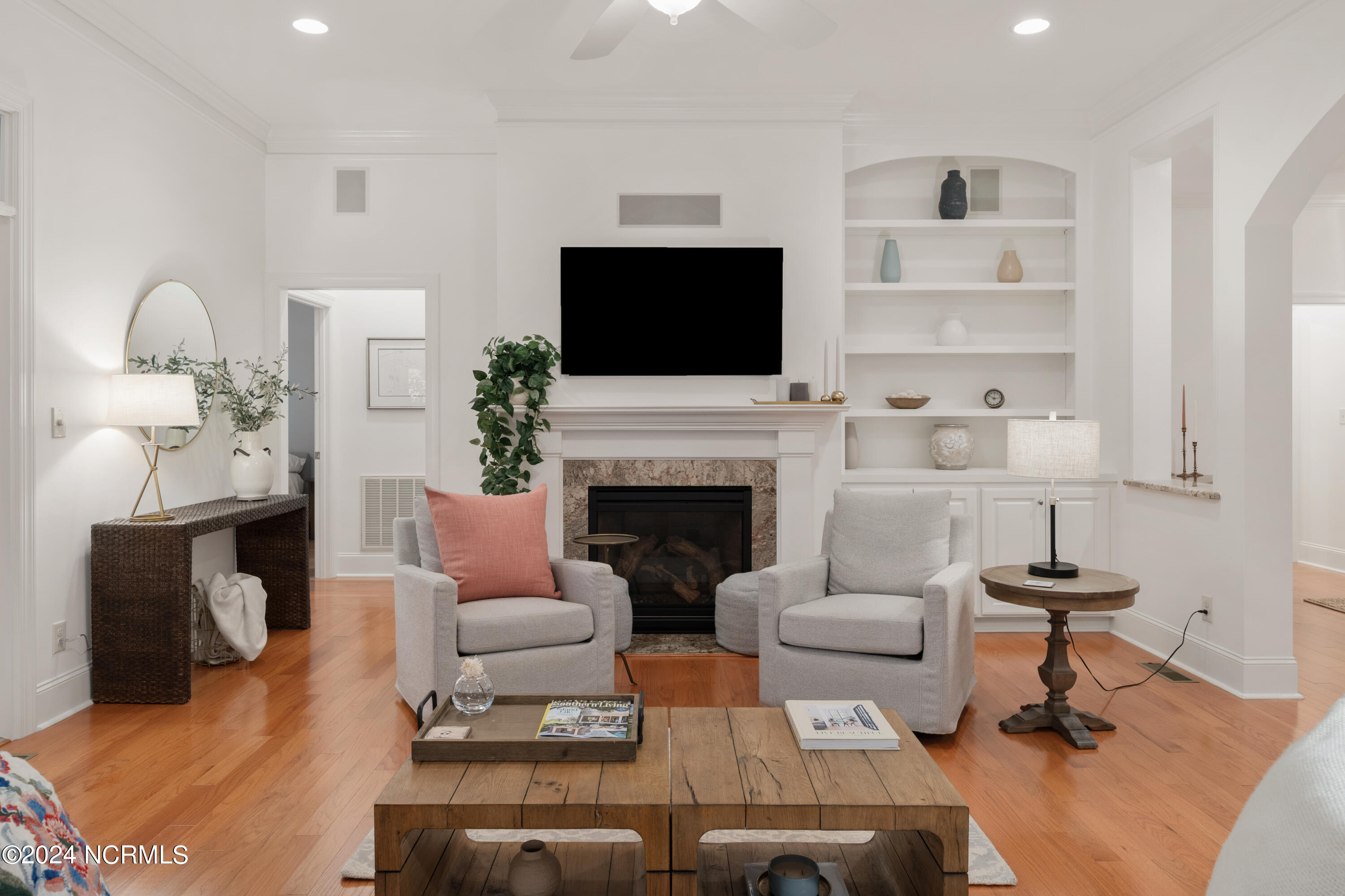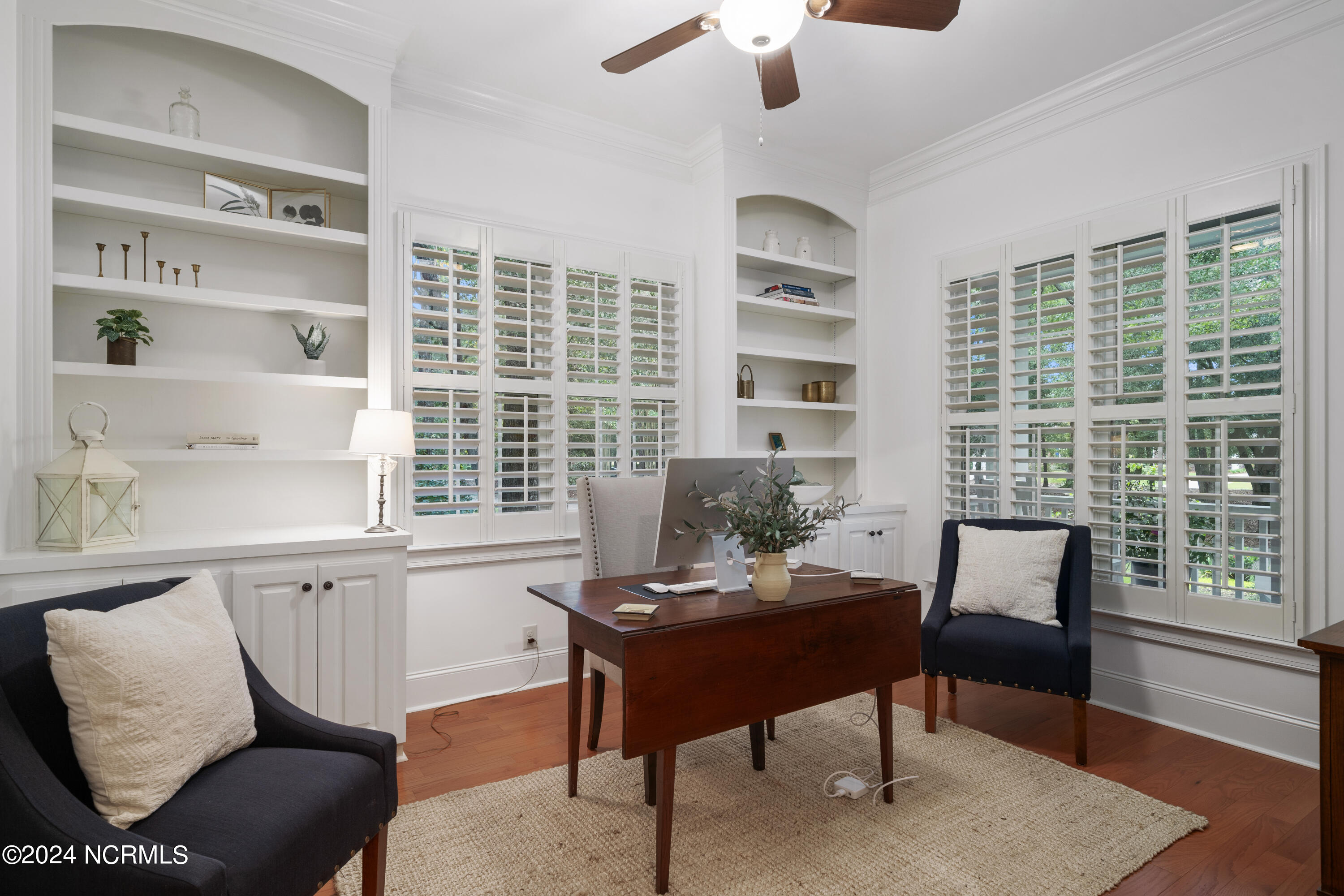 Elegant columns and archways enhance the home's clean, neutral aesthetic, while a fireplace framed by built-in shelving adds warmth and sophistication to the living area. Modern conveniences such as leaf filter gutters, a humidifier, and a surround sound system--including on the porch--complete the home. Upstairs, you'll find two oversized, multi-purpose rooms, two additional bedrooms with two full bathrooms, and storage space, perfect for accommodating any lifestyle. The kitchen is a chef's dream, combining style and functionality for everyday living and entertaining. This exceptional home, unaffected by any storms, offers a rare blend of luxury, tranquility, and comfort.''