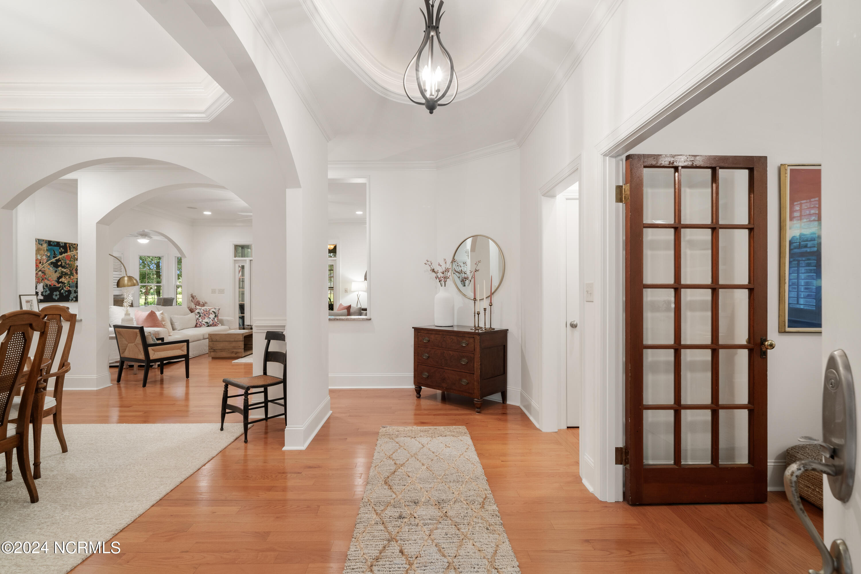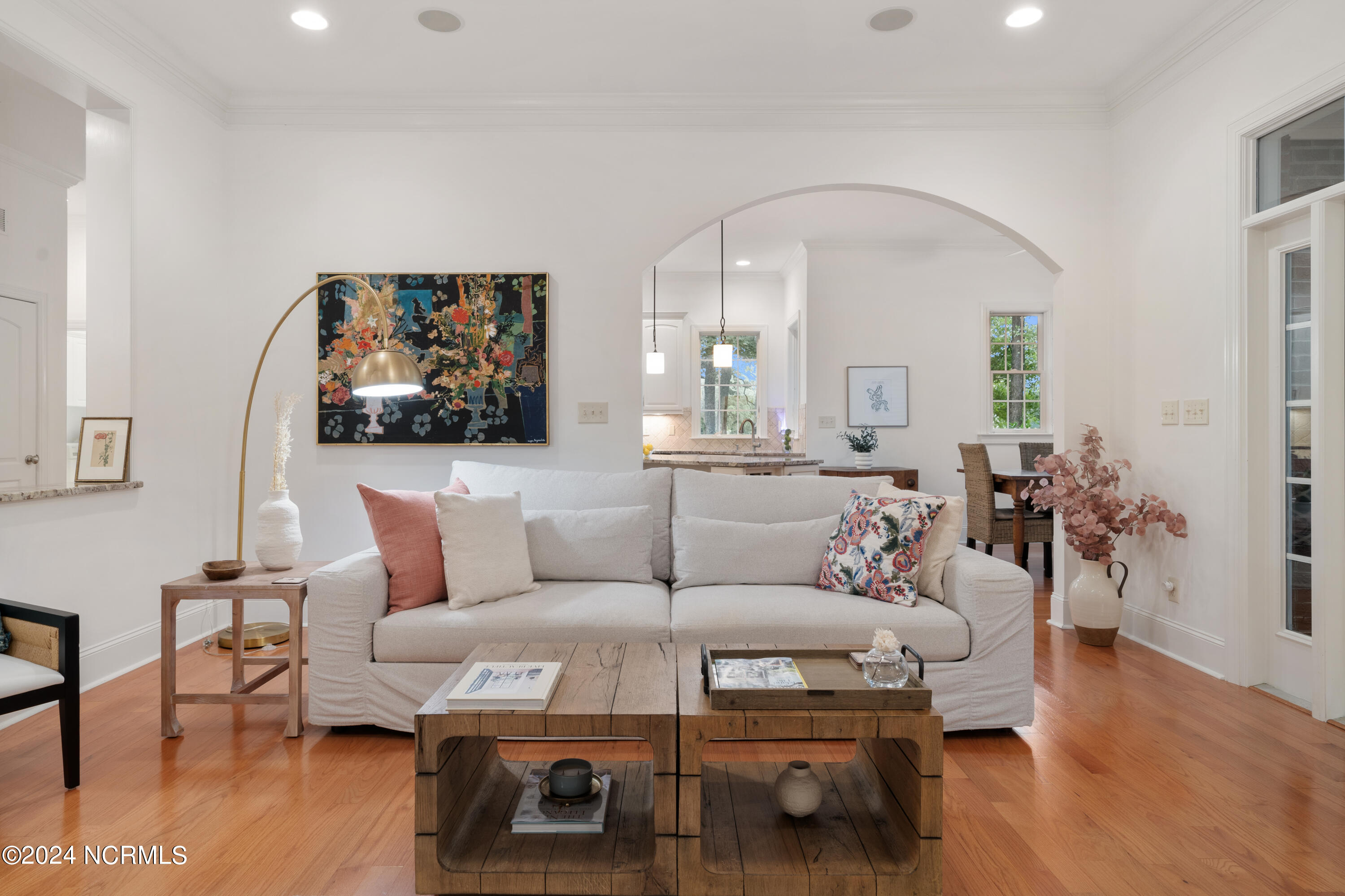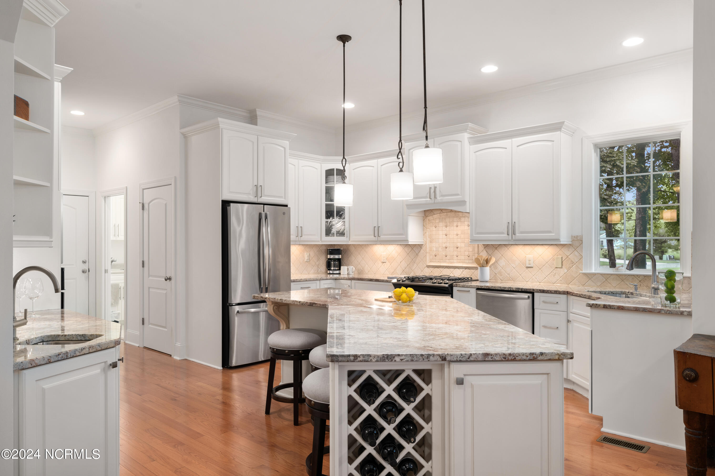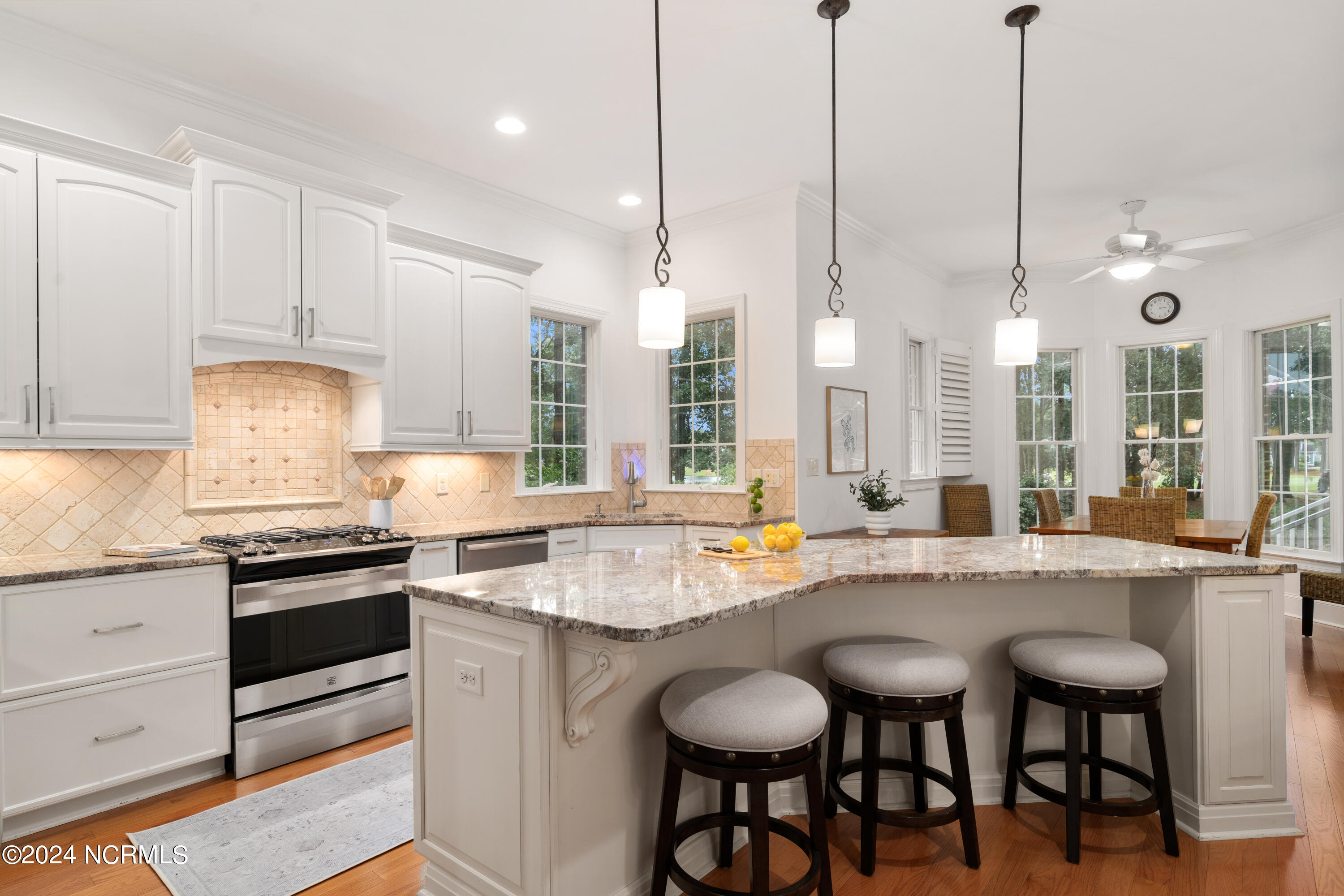 Elegant columns and archways enhance the home's clean, neutral aesthetic, while a fireplace framed by built-in shelving adds warmth and sophistication to the living area. Modern conveniences such as leaf filter gutters, a humidifier, and a surround sound system--including on the porch--complete the home. Upstairs, you'll find two oversized, multi-purpose rooms, two additional bedrooms with two full bathrooms, and storage space, perfect for accommodating any lifestyle. The kitchen is a chef's dream, combining style and functionality for everyday living and entertaining. This exceptional home, unaffected by any storms, offers a rare blend of luxury, tranquility, and comfort.''