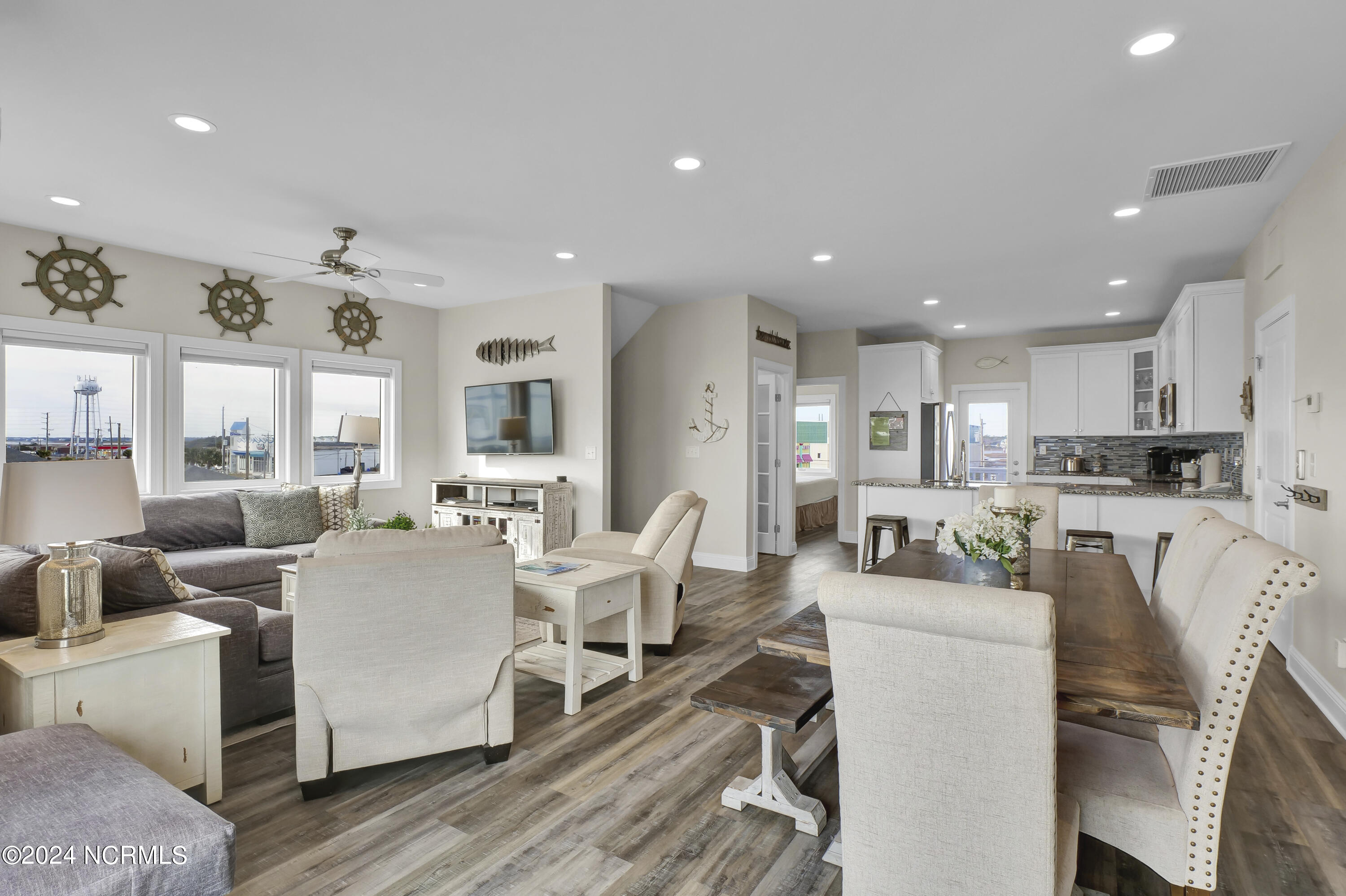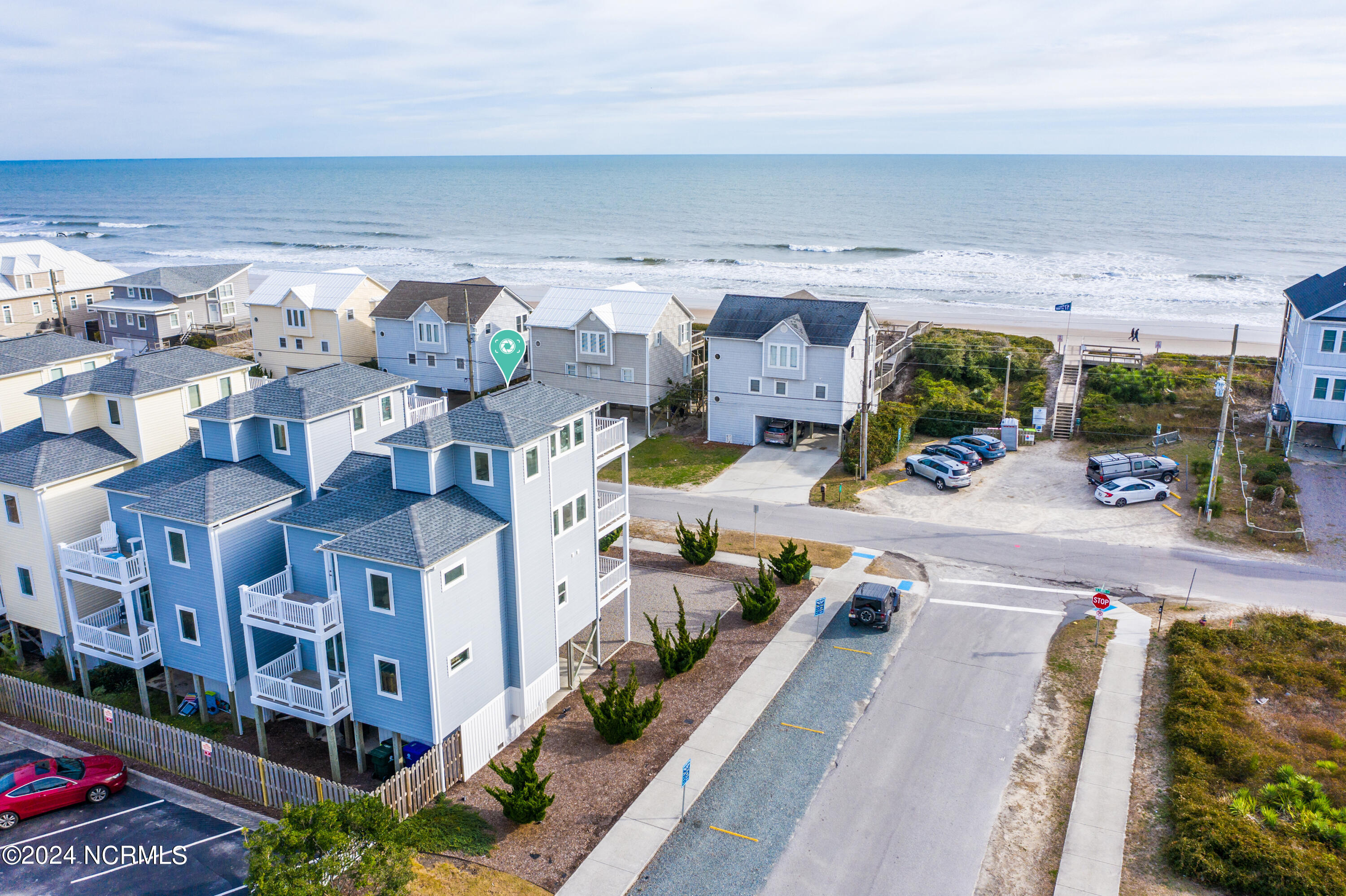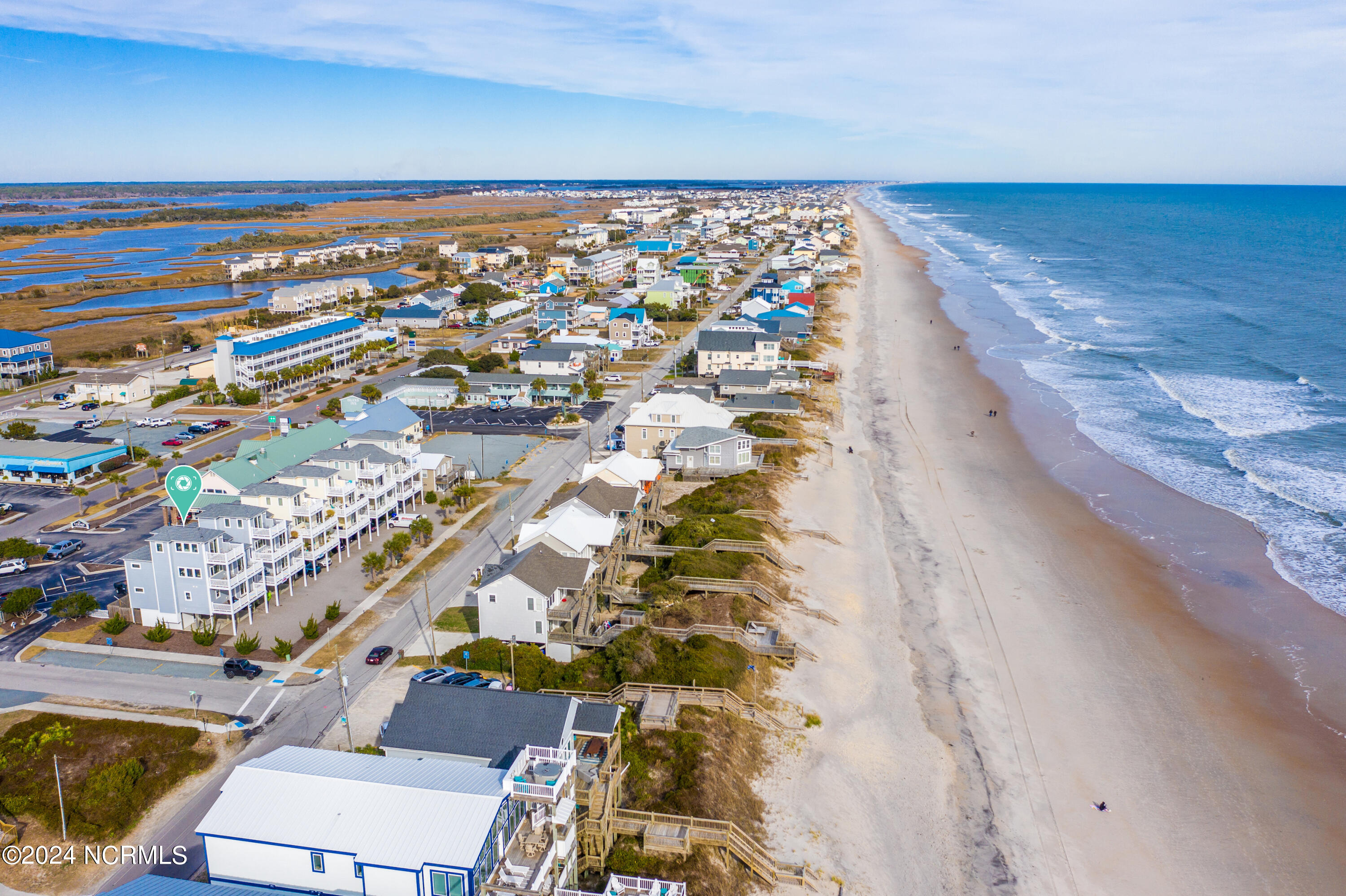 Enjoy the best 2nd row location on Topsail Island from this quality, custom built and fully furnished townhome, by one of the region's most highly acclaimed builders. Built in 2018, this end unit has additional windows that offer views of both the Atlantic Ocean and Intracoastal Waterway, and the 3 levels of decking design gives incredible viewing opportunities. Walk directly across a quiet, low-traffic street to the beach access, or casually stroll to the best of Topsail's restaurants, marina facilities, and shopping venues all within a block of your door. The home's interior boasts an open floorplan with walls of windows to bring in the views and natural light. Spacious kitchen features custom cabinetry, granite countertops, LVT flooring throughout, and state of the art appliances perfect for entertaining guests at the beach. The elevator provides easy access from the ground to the 1st and 2nd levels of the home. Interior freshly painted top to bottom in January 2024.