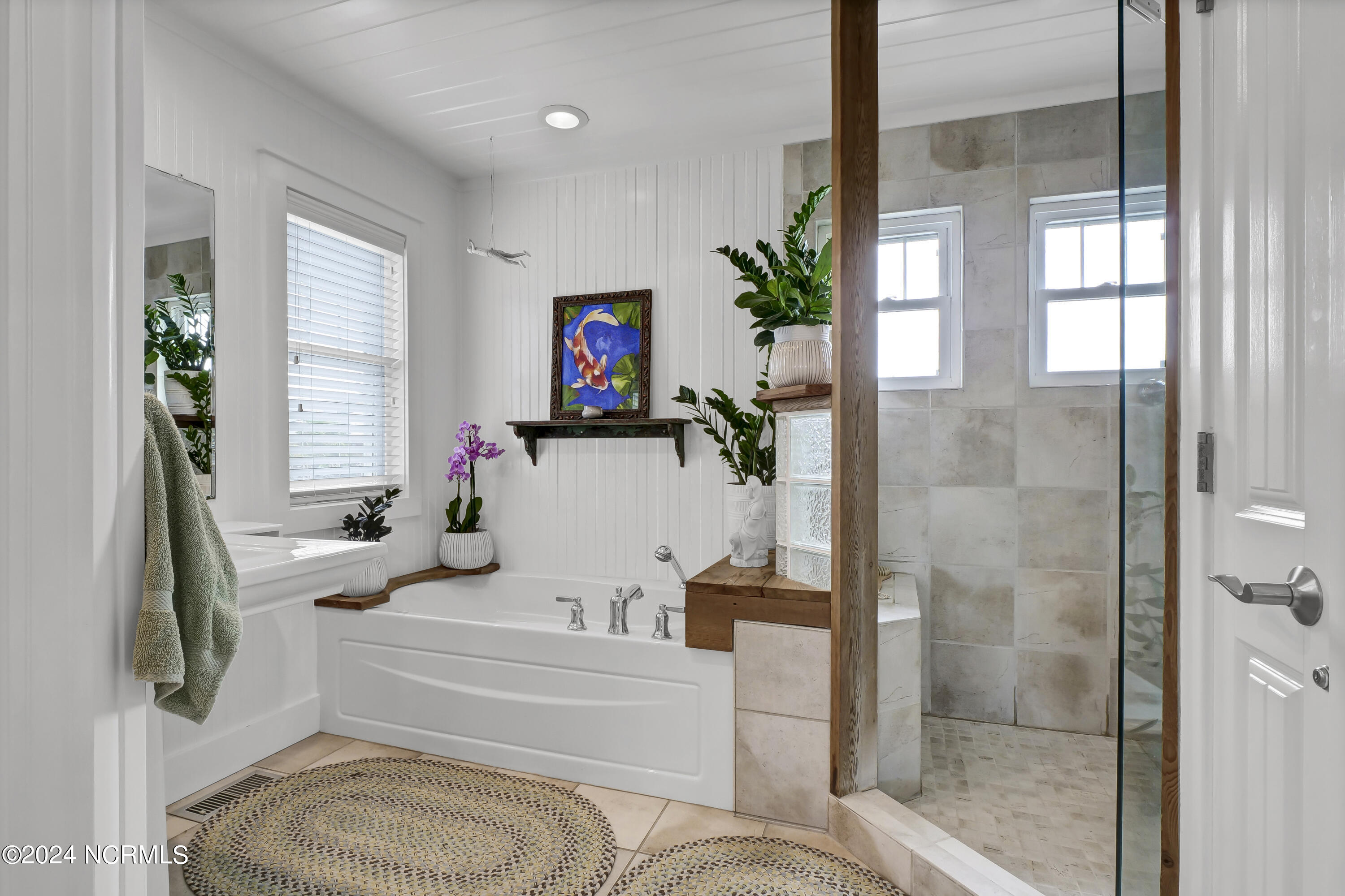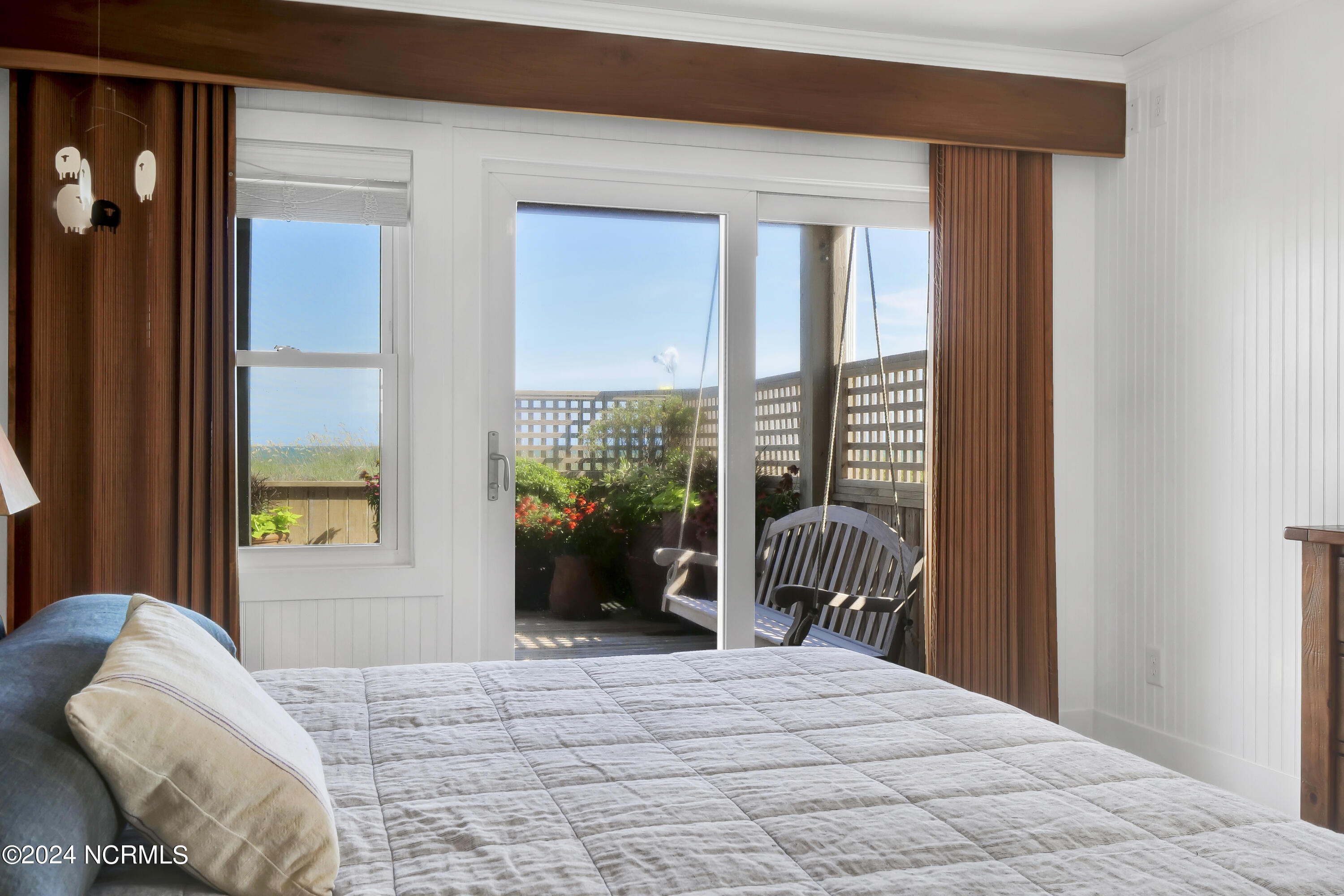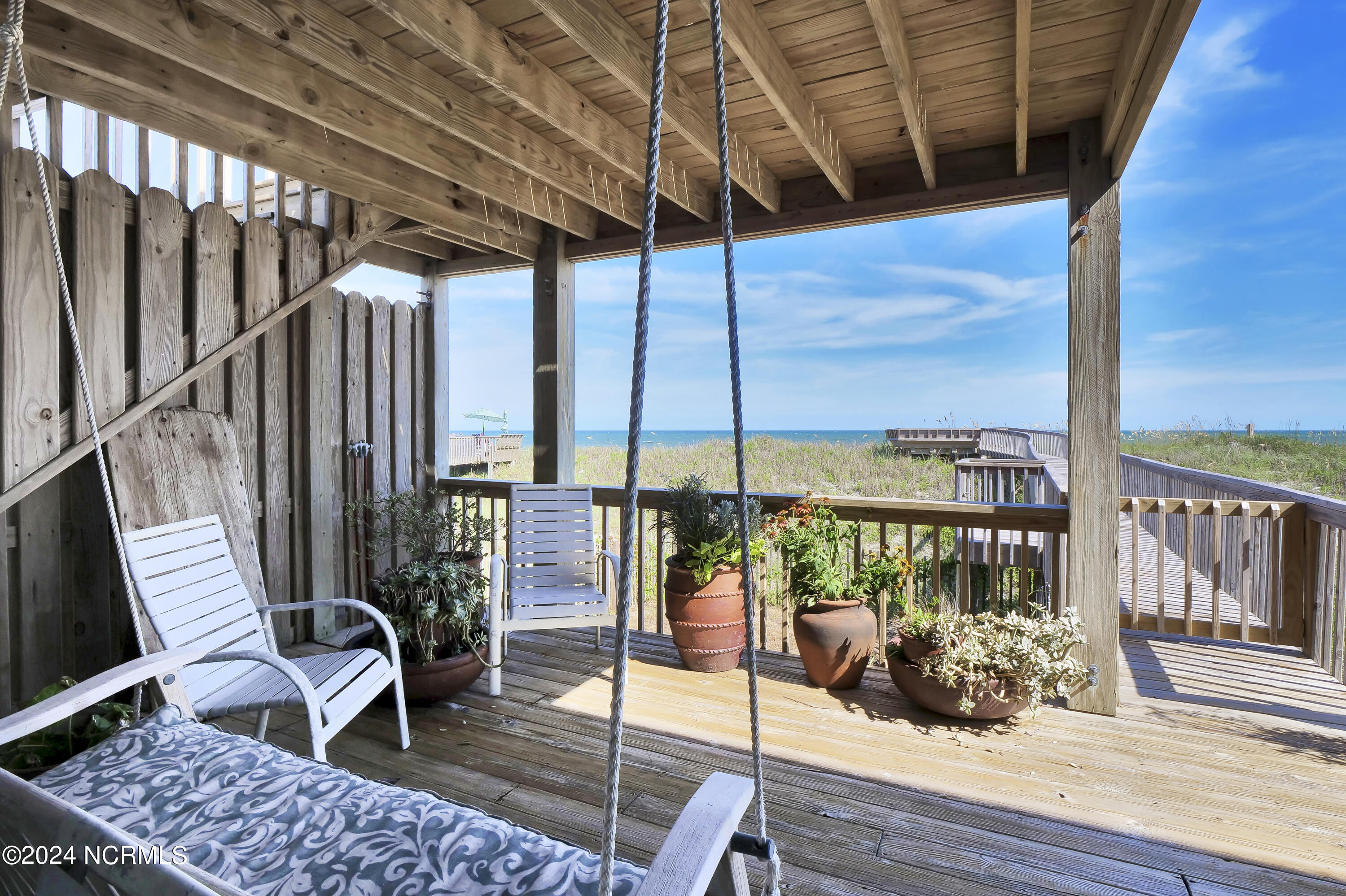 On the bedroom level you will find three beds opening toward the ocean with sliding doors onto an expansive zen-like porch with a uniquely beautiful layout and a peaceful swing area to take in the view. On either end you will find a primary; both with spacious baths that will make you feel like you're in a spa, w/ walk-in beautifully tiled showers, a generous soaking tub, and gorgeous trim details.
