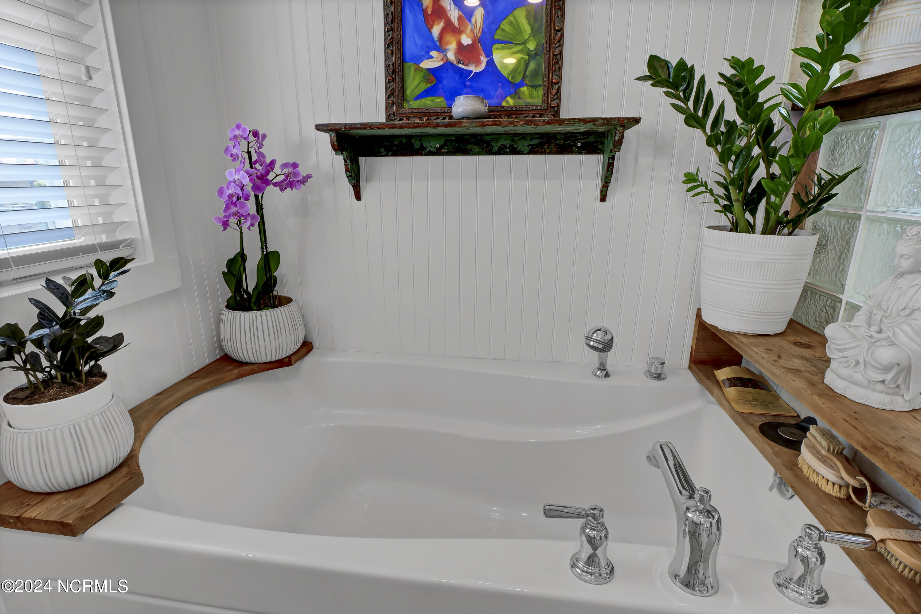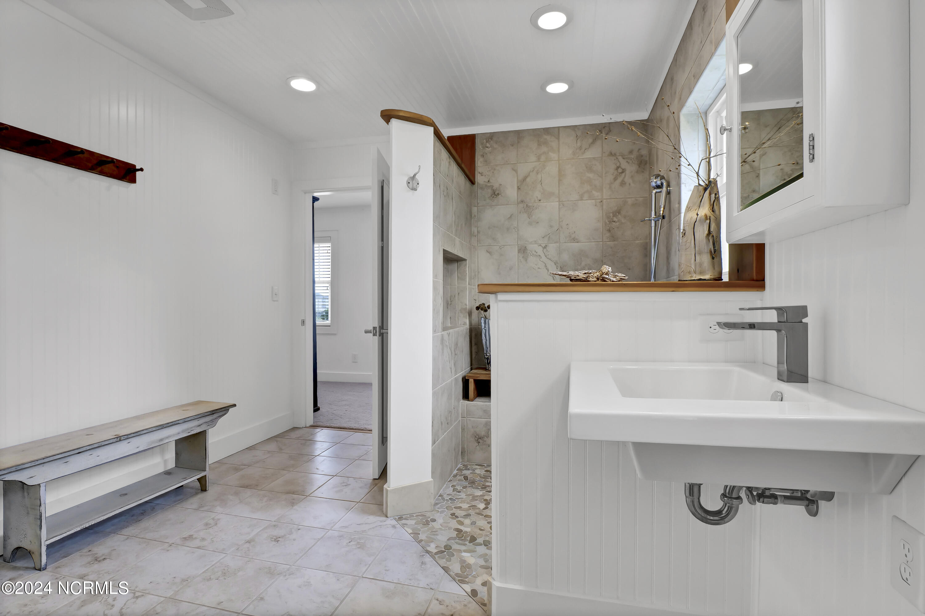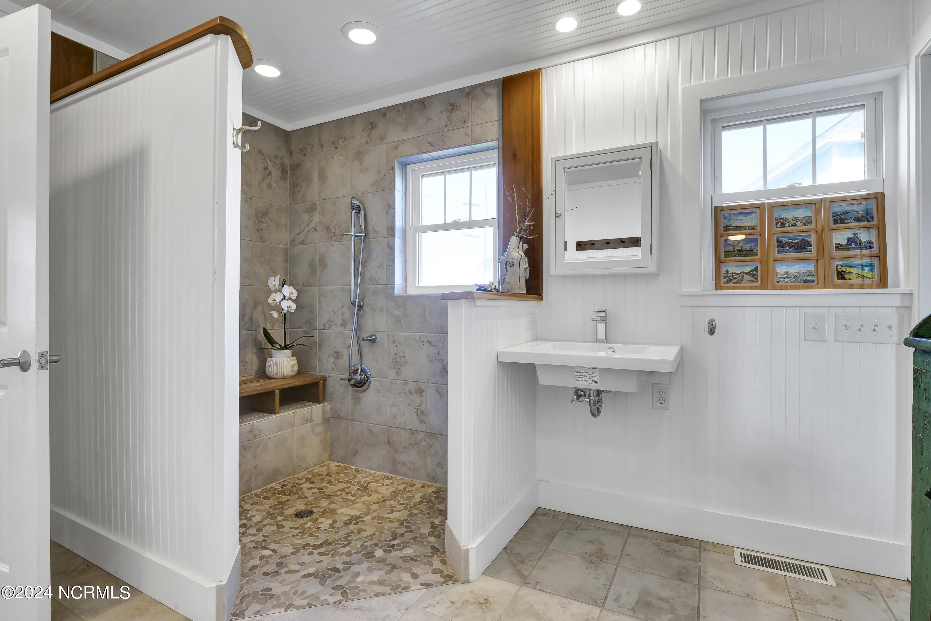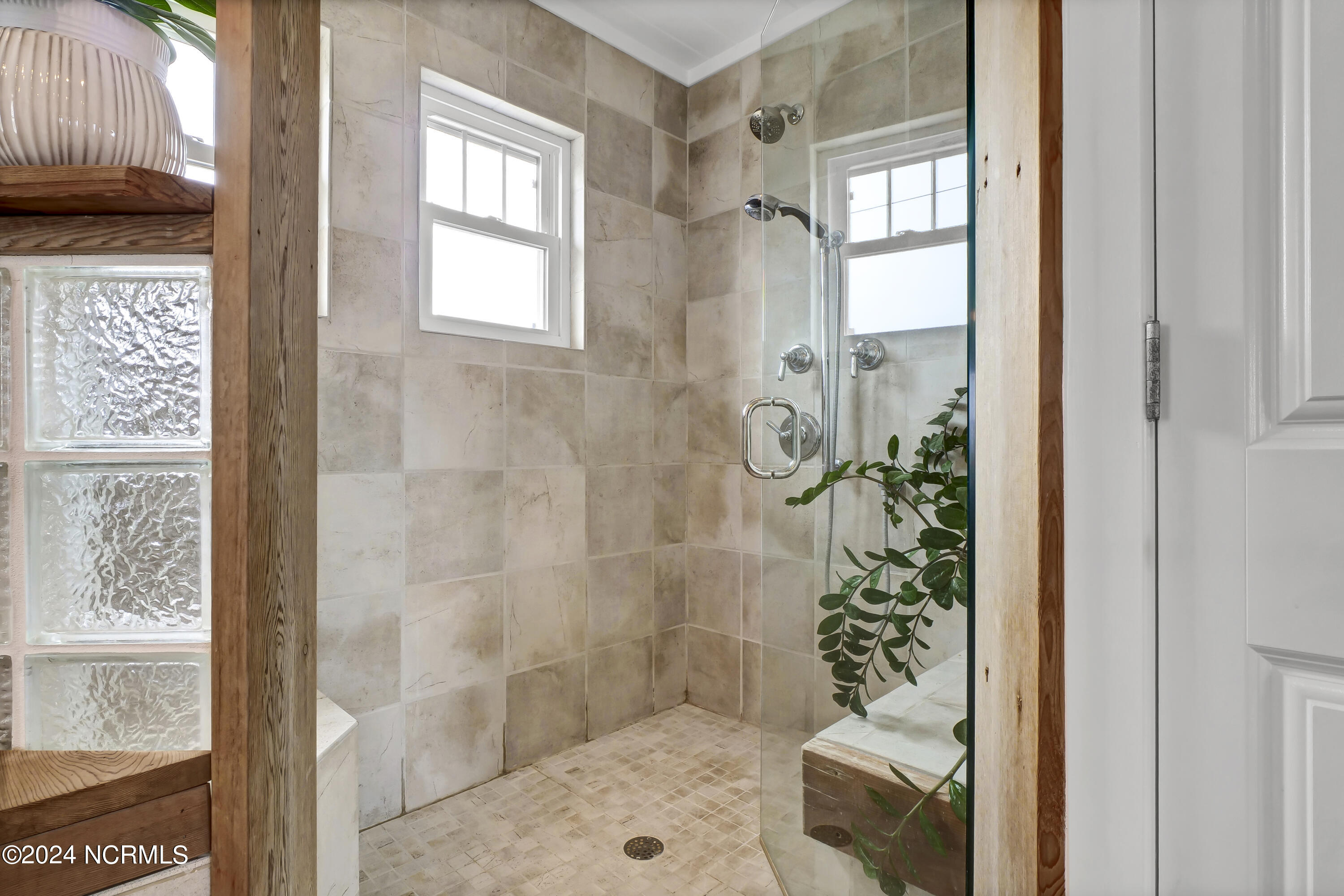 On the bedroom level you will find three beds opening toward the ocean with sliding doors onto an expansive zen-like porch with a uniquely beautiful layout and a peaceful swing area to take in the view. On either end you will find a primary; both with spacious baths that will make you feel like you're in a spa, w/ walk-in beautifully tiled showers, a generous soaking tub, and gorgeous trim details.