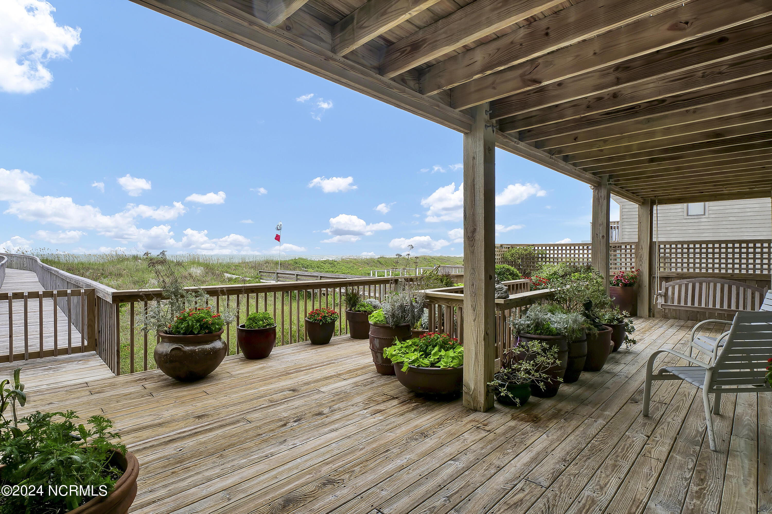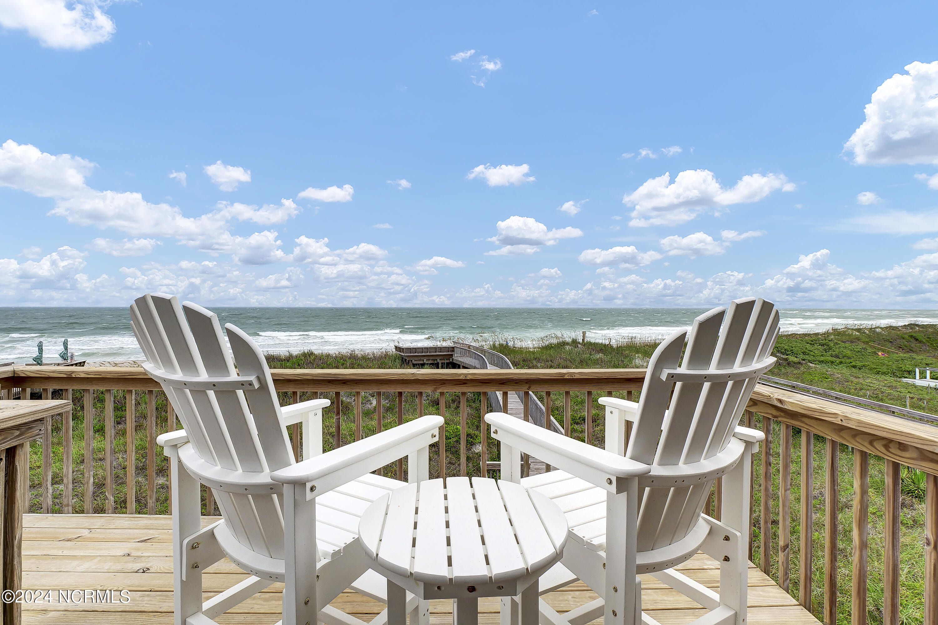 The upper level offers the warmest welcome you'll find at the beach; with golden woods, soaring ceilings, and sweeping views; a large dining area gazes toward the ocean, a comfortable living area invites, and a beautifully constructed custom kitchen with high-end stainless appliances looks toward the ocean or the sound You will find an generous office space on this level and a comfortable bedroom, full bath, and sound-side porch....yet, you will find yourself spending all of your time on the gorgeous oceanfront porch, looking toward your beautifully curved walkway and oceanfront deck; the perfect location for morning coffee or an evening cocktail.