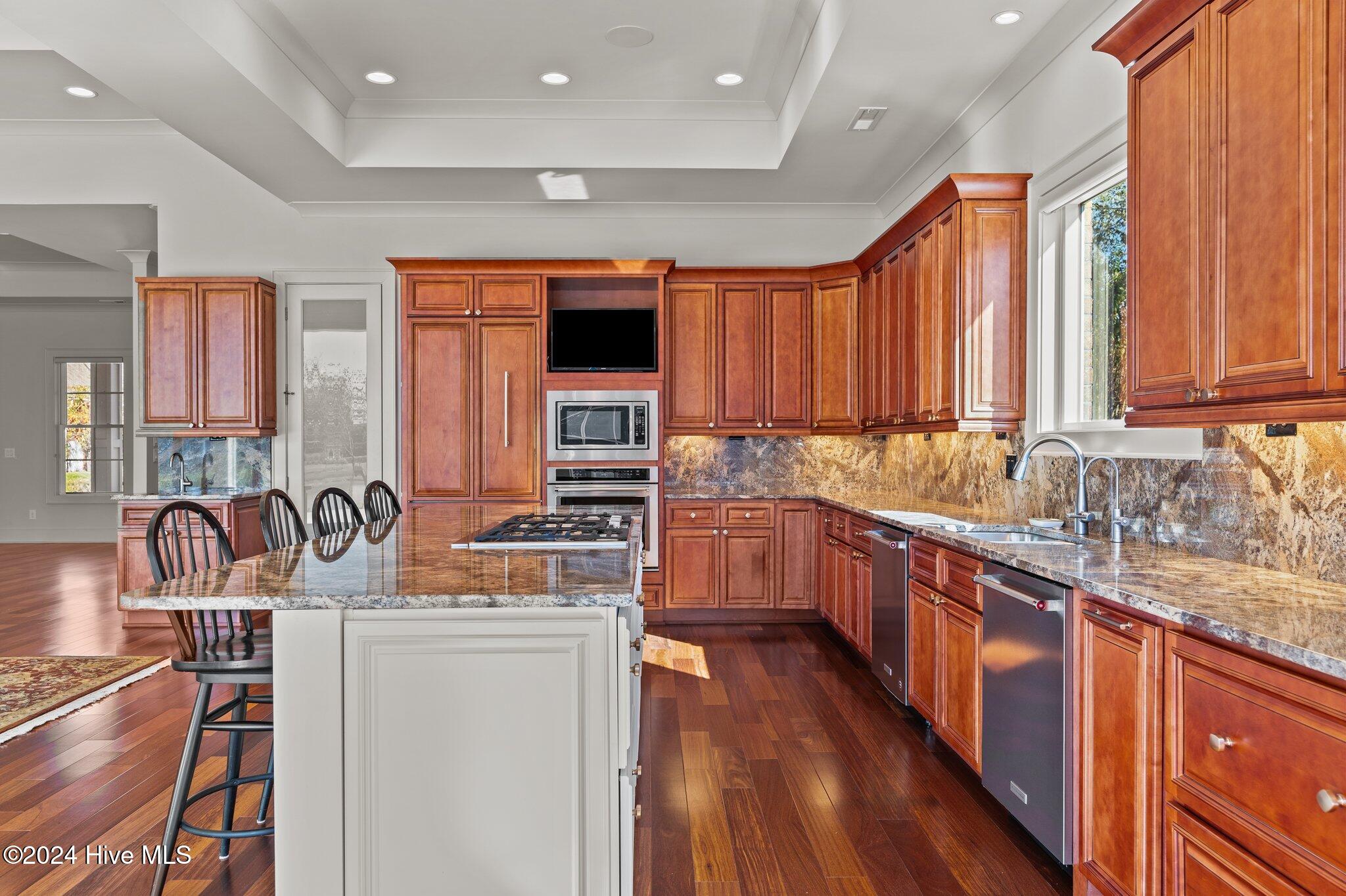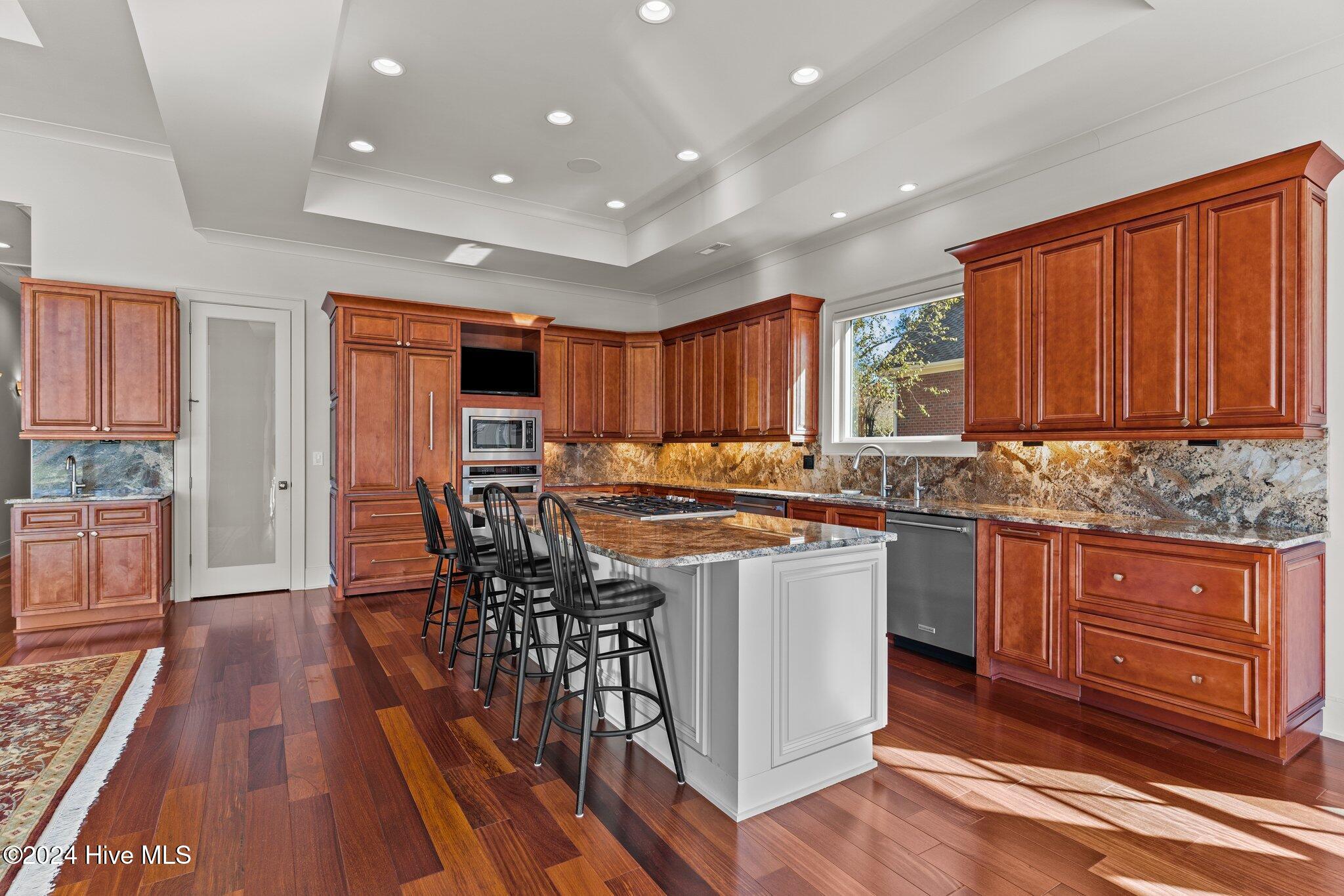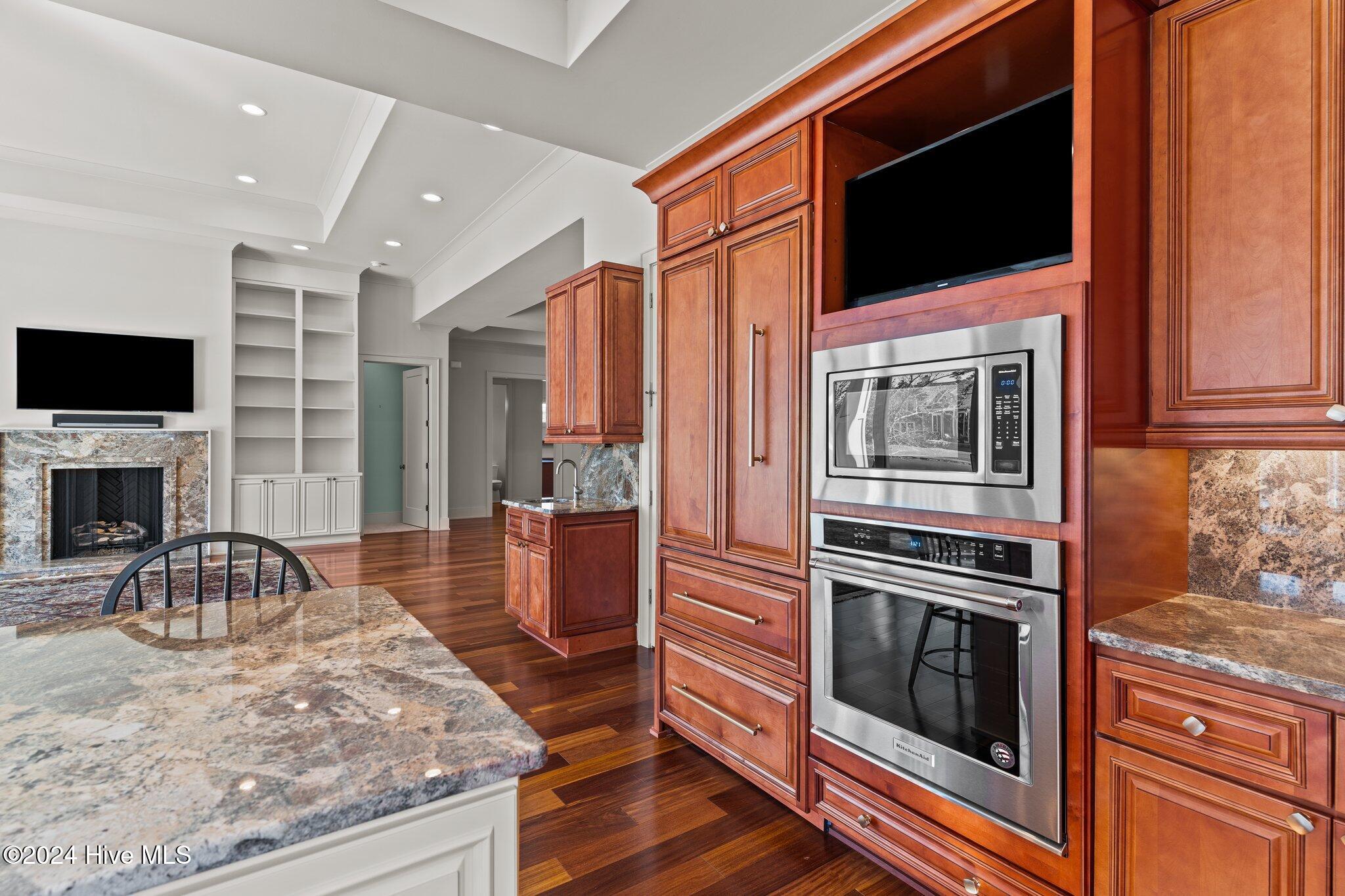 The heart of the home is its expansive kitchen, complete with a large island, Sub-Zero refrigerator/freezer, Thermador gas cooktop, premium KitchenAid appliances, and two dishwashers creating a chef's dream environment. The main level also includes a spacious breakfast nook, dining room, gracious family room, luxurious primary suite with an impressive walk-in closet and spa-like bath, a generous home office or study, a guest bedroom, laundry room, and a wine fridge for easy entertaining.