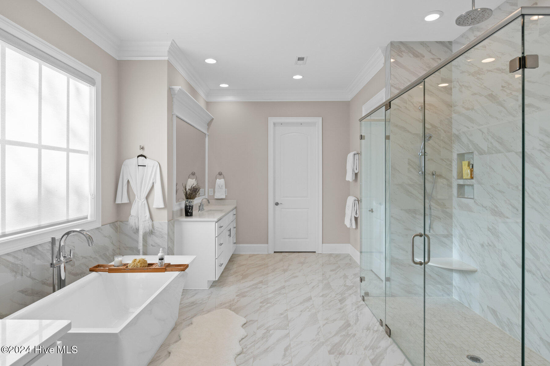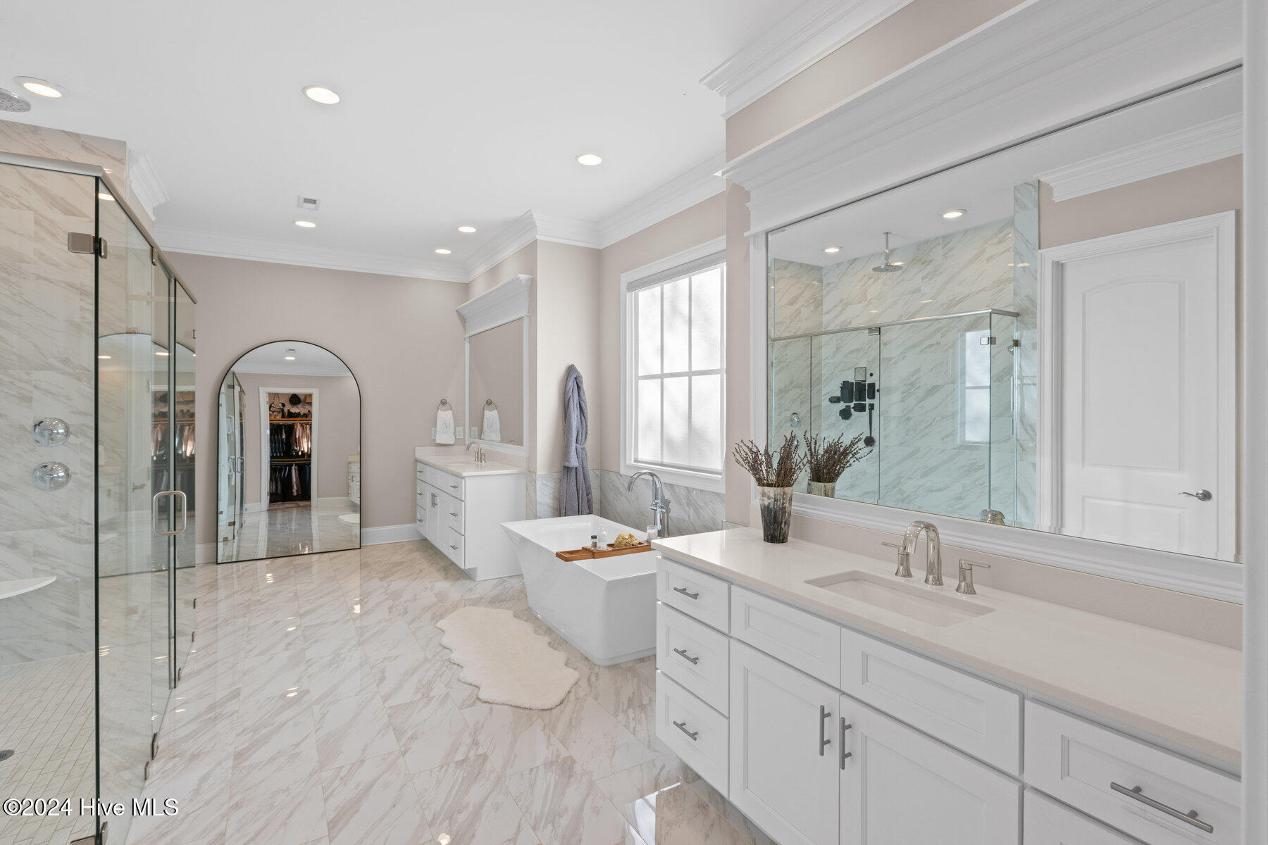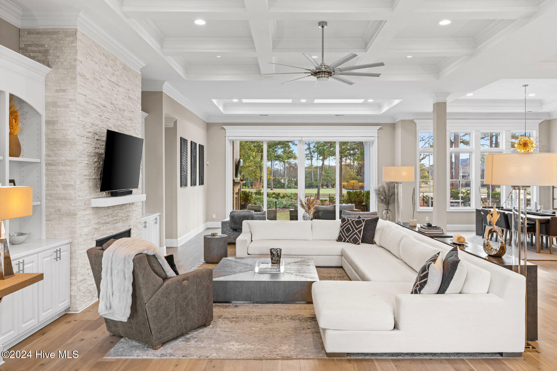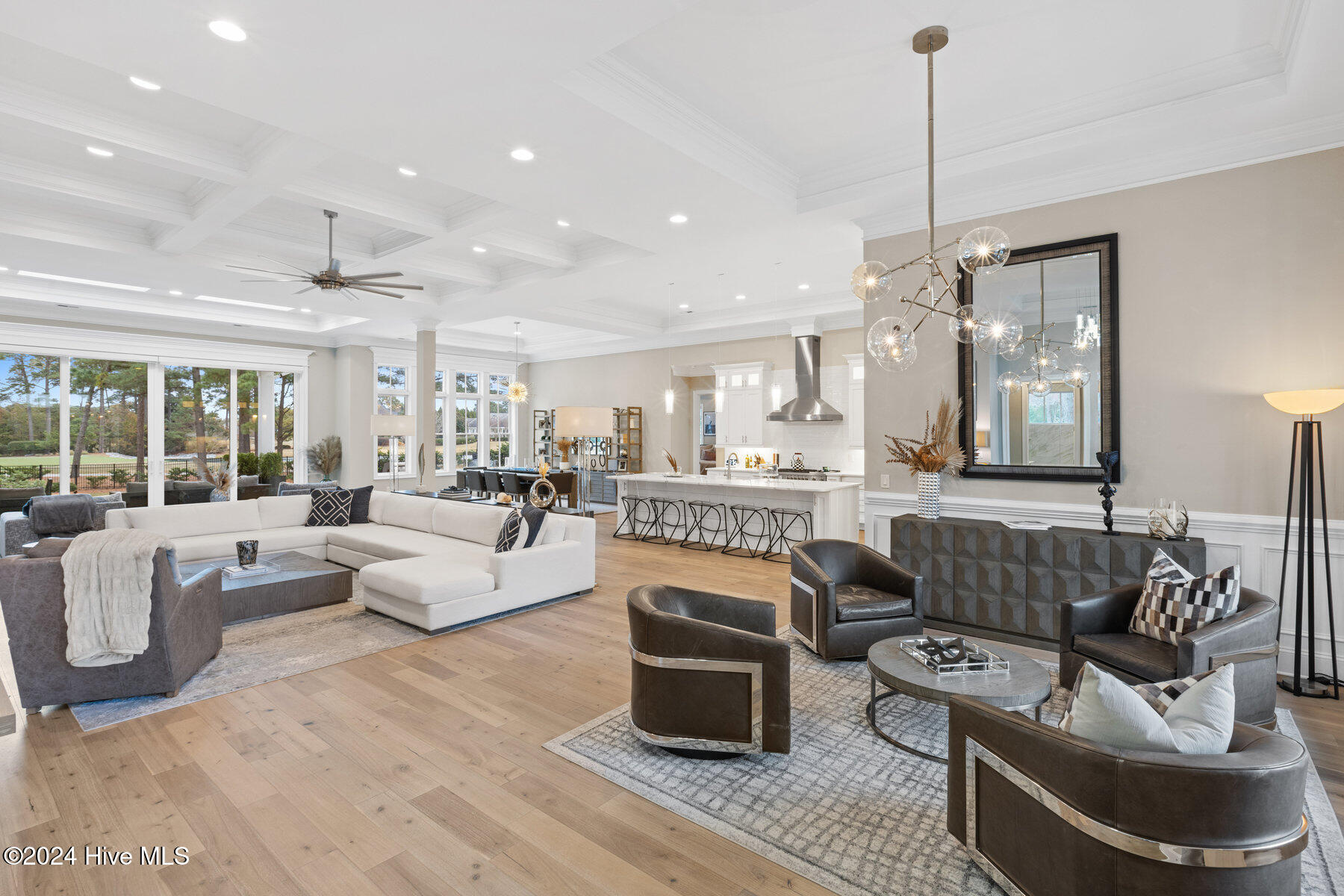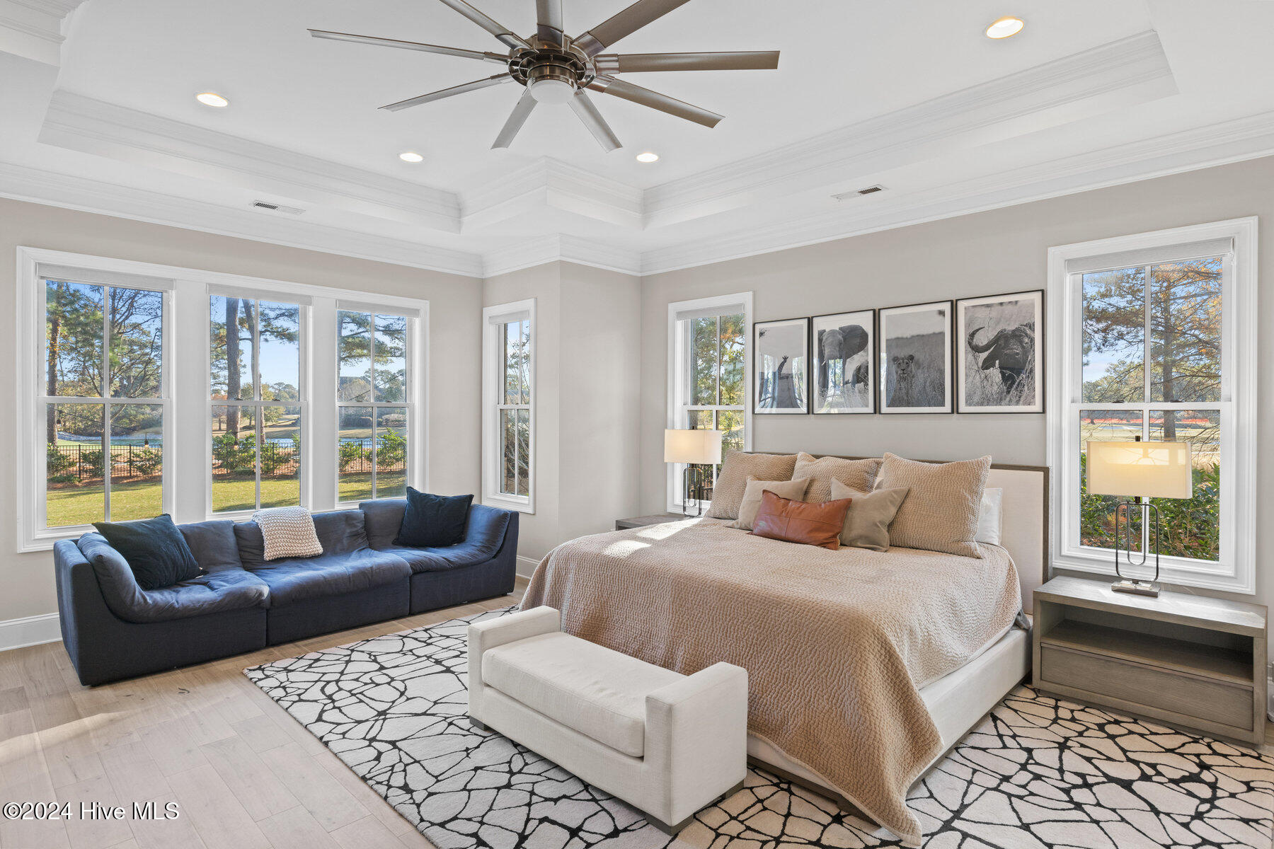 The home features four generously sized main-level bedrooms, including a primary suite with sweeping views of the golf course. The luxurious suite includes a spa-like bathroom with separate vanities, walk-in shower, a soaking tub, and two walk-in closets, offering a serene retreat after a long day.