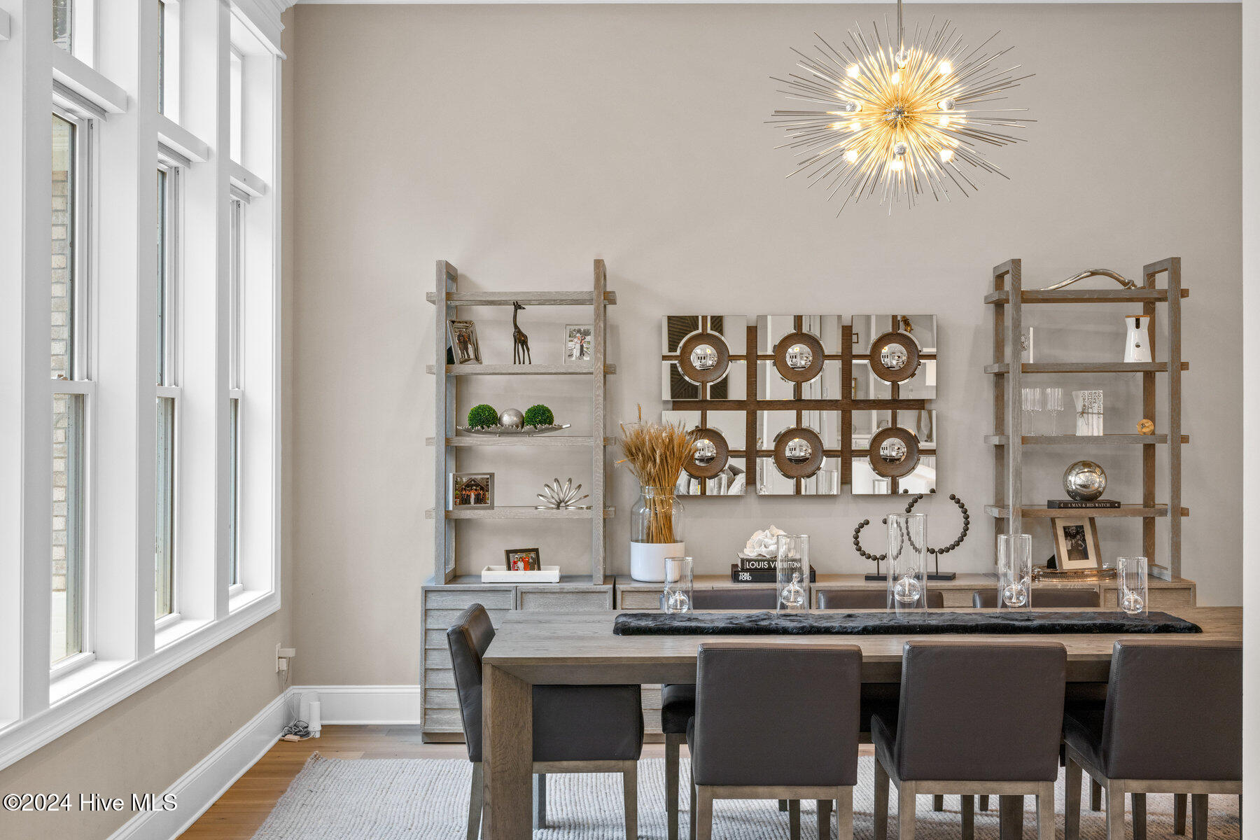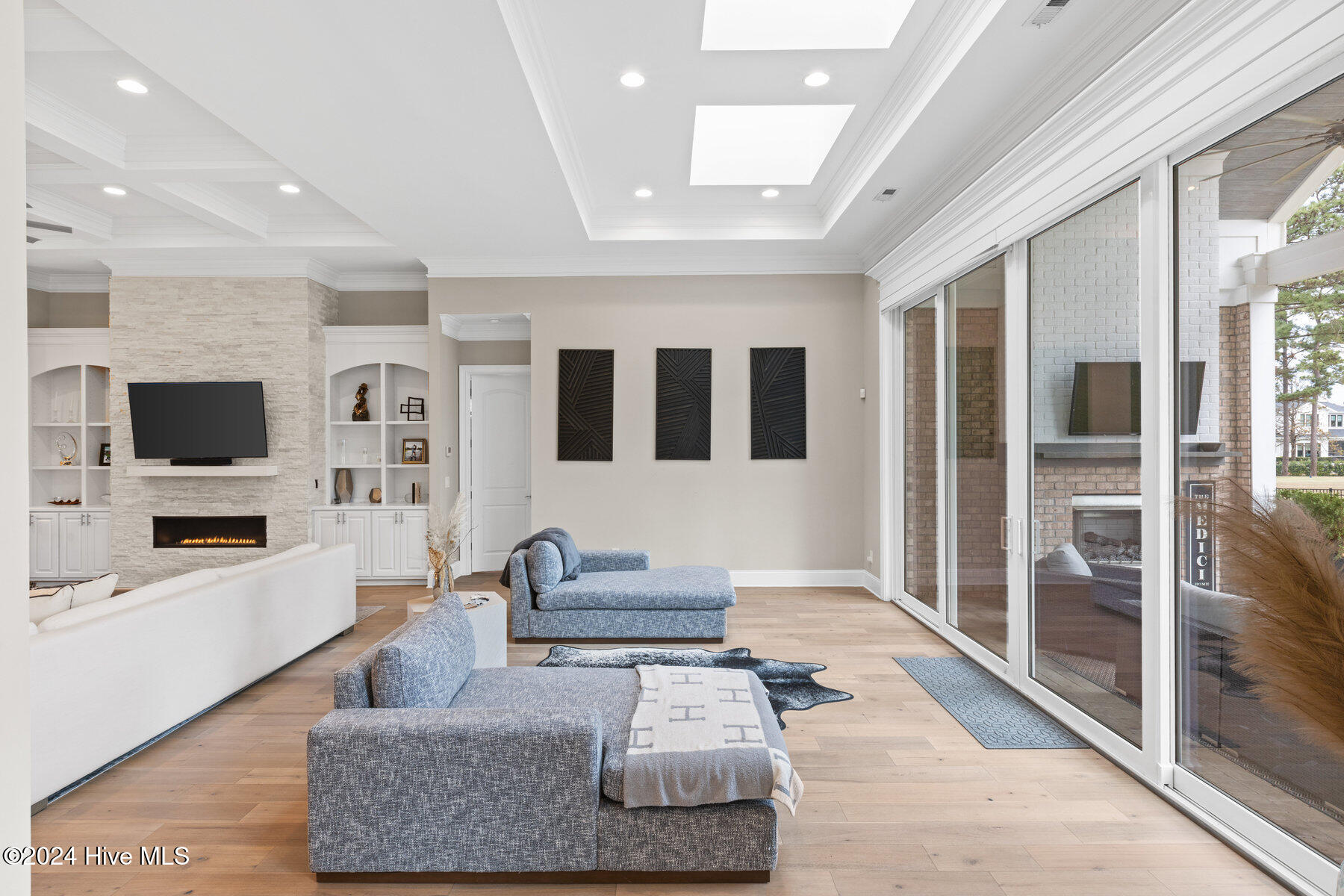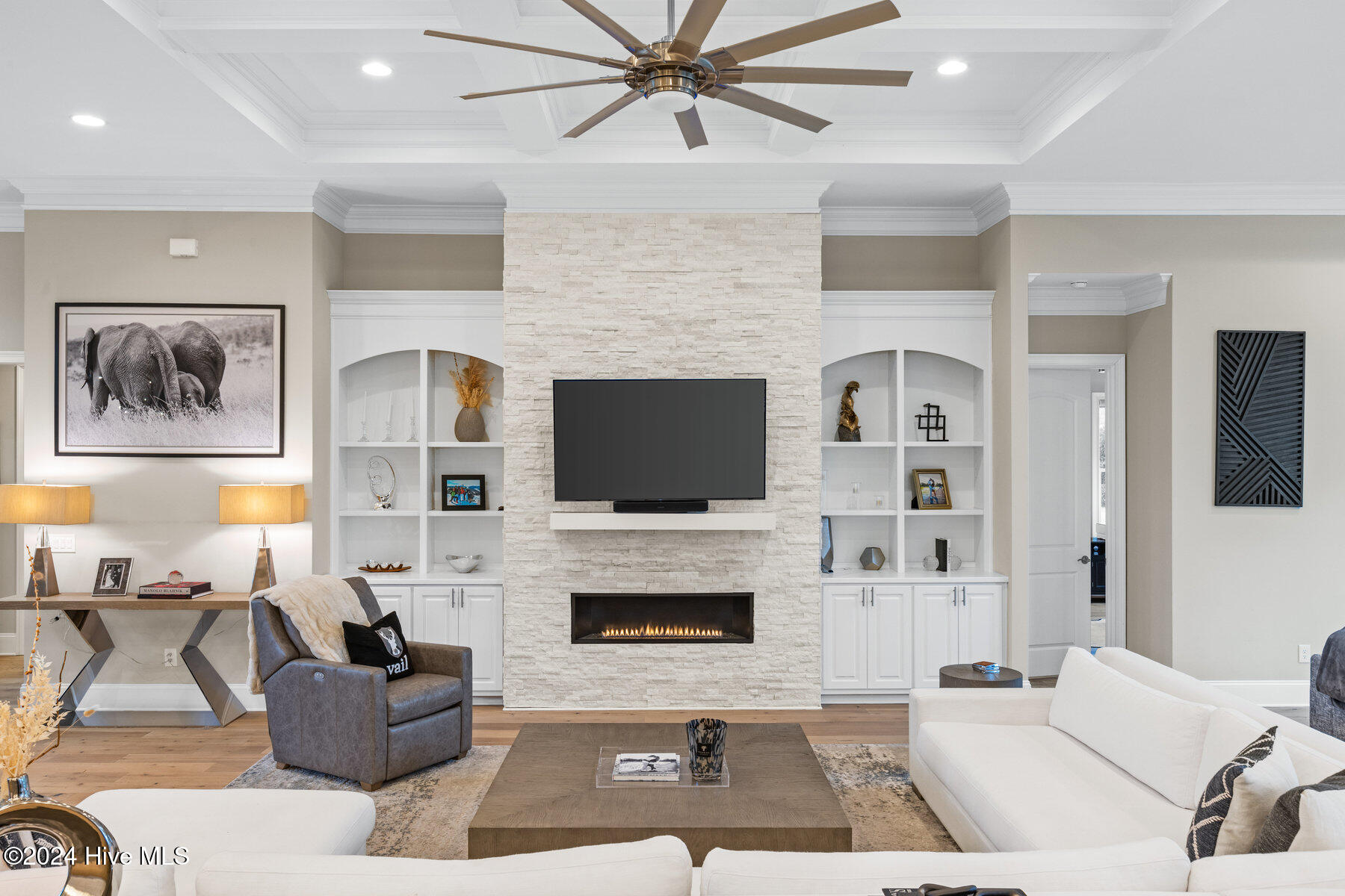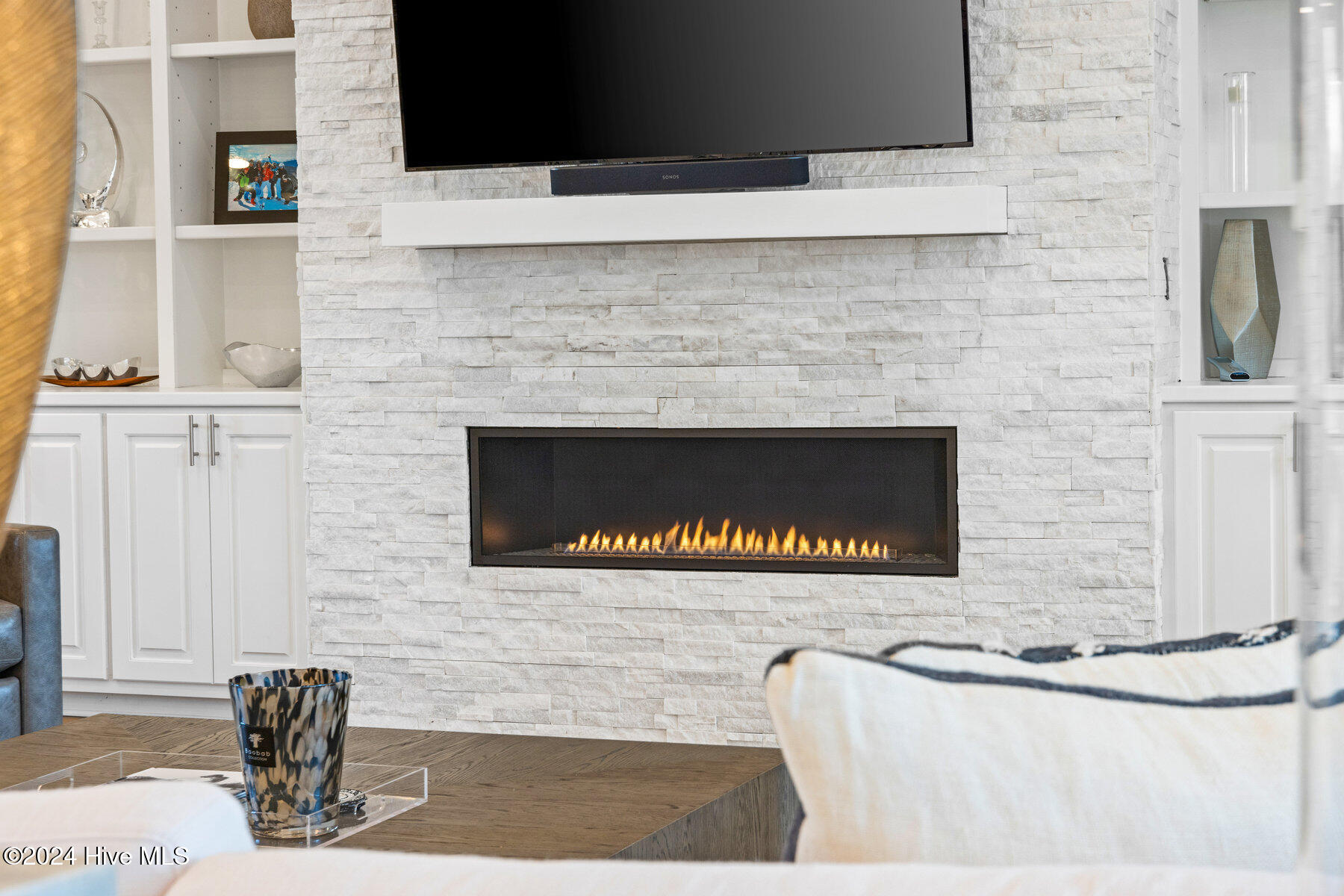 The coastal-contemporary gas fireplace, flanked by custom-built cabinets and bookshelves, provides the perfect backdrop for cozy evenings at home.