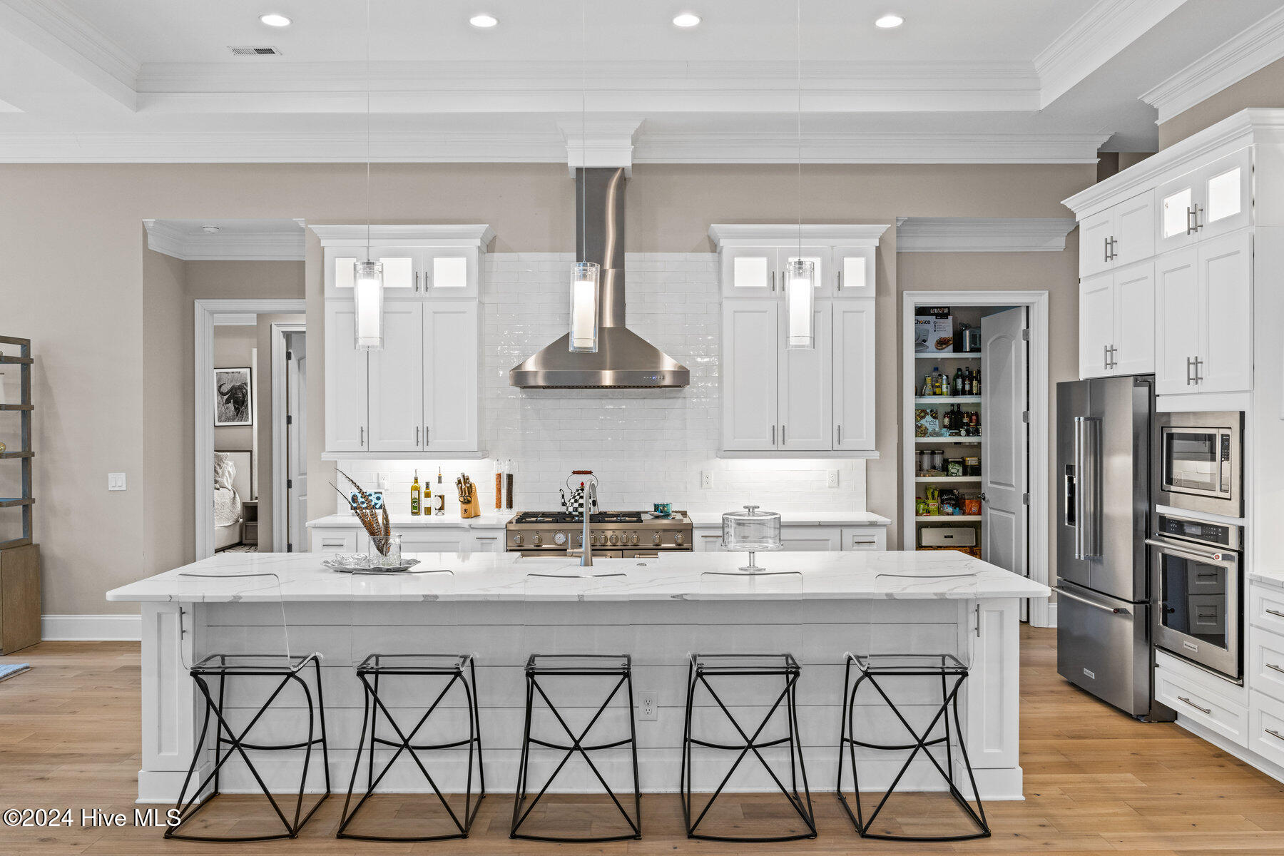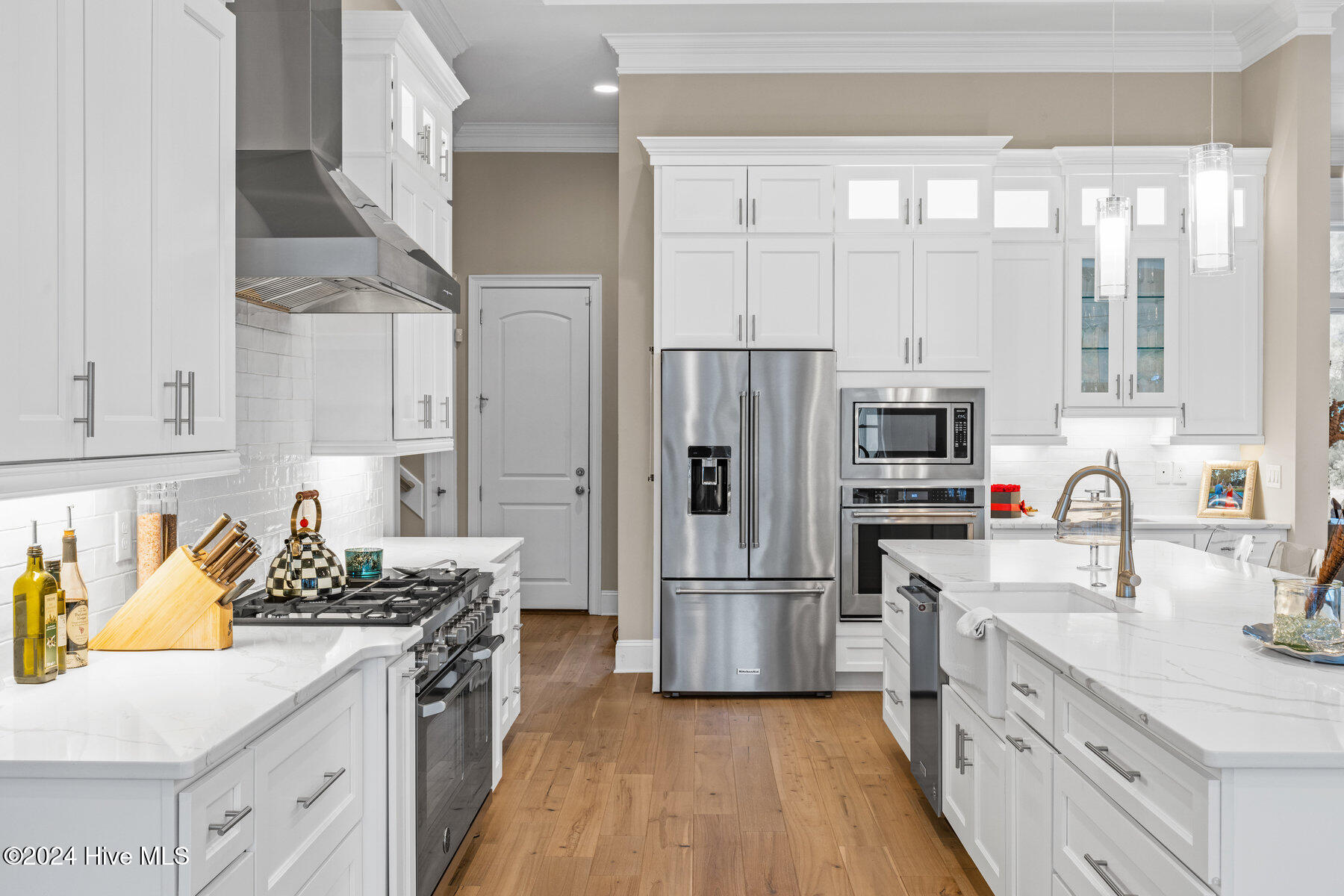 Whether you're preparing a casual meal or hosting a dinner party, this gourmet Shaker-style kitchen is a chef's dream, complete with an oversized island and high-end Bertazzoni and KitchenAid appliances.