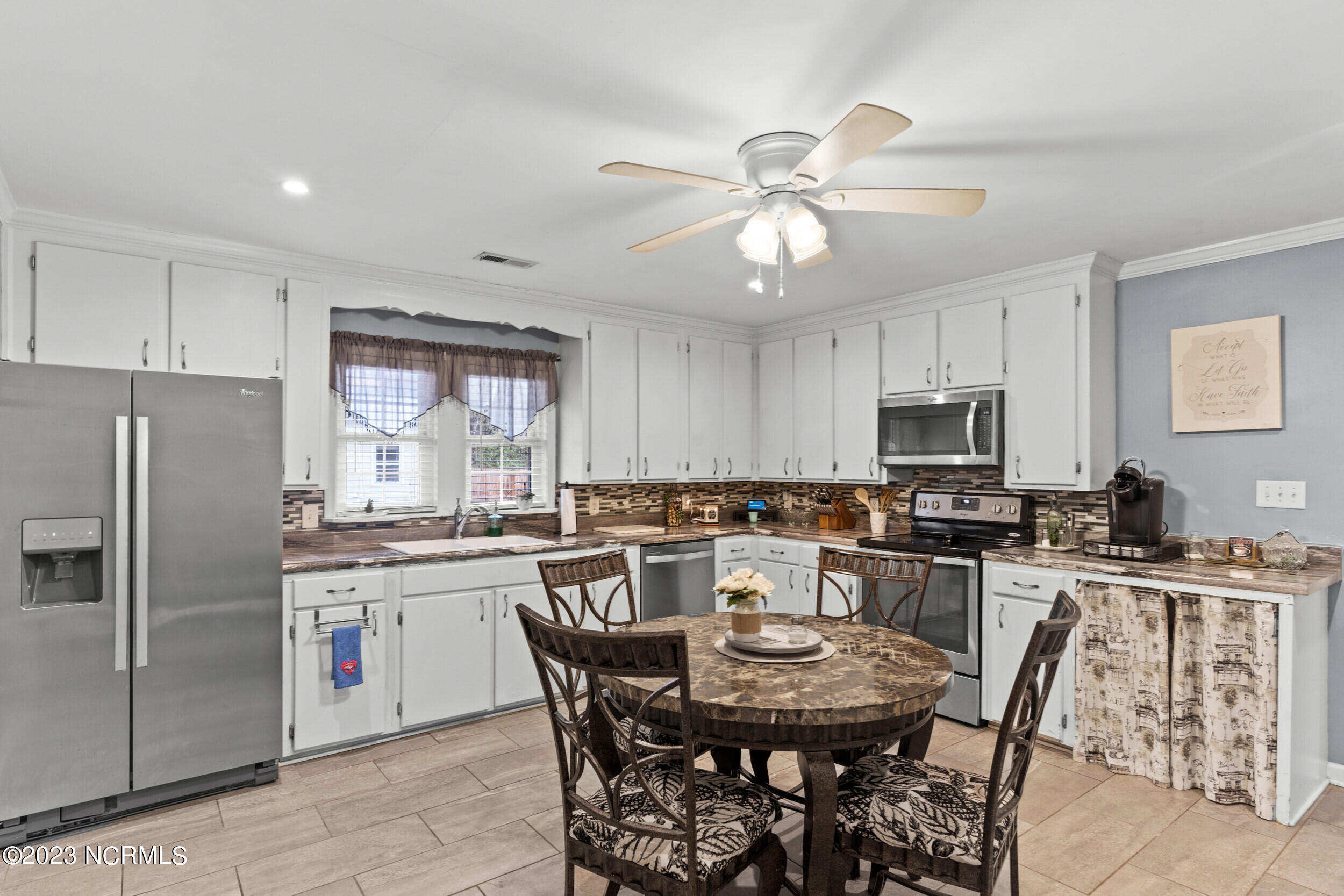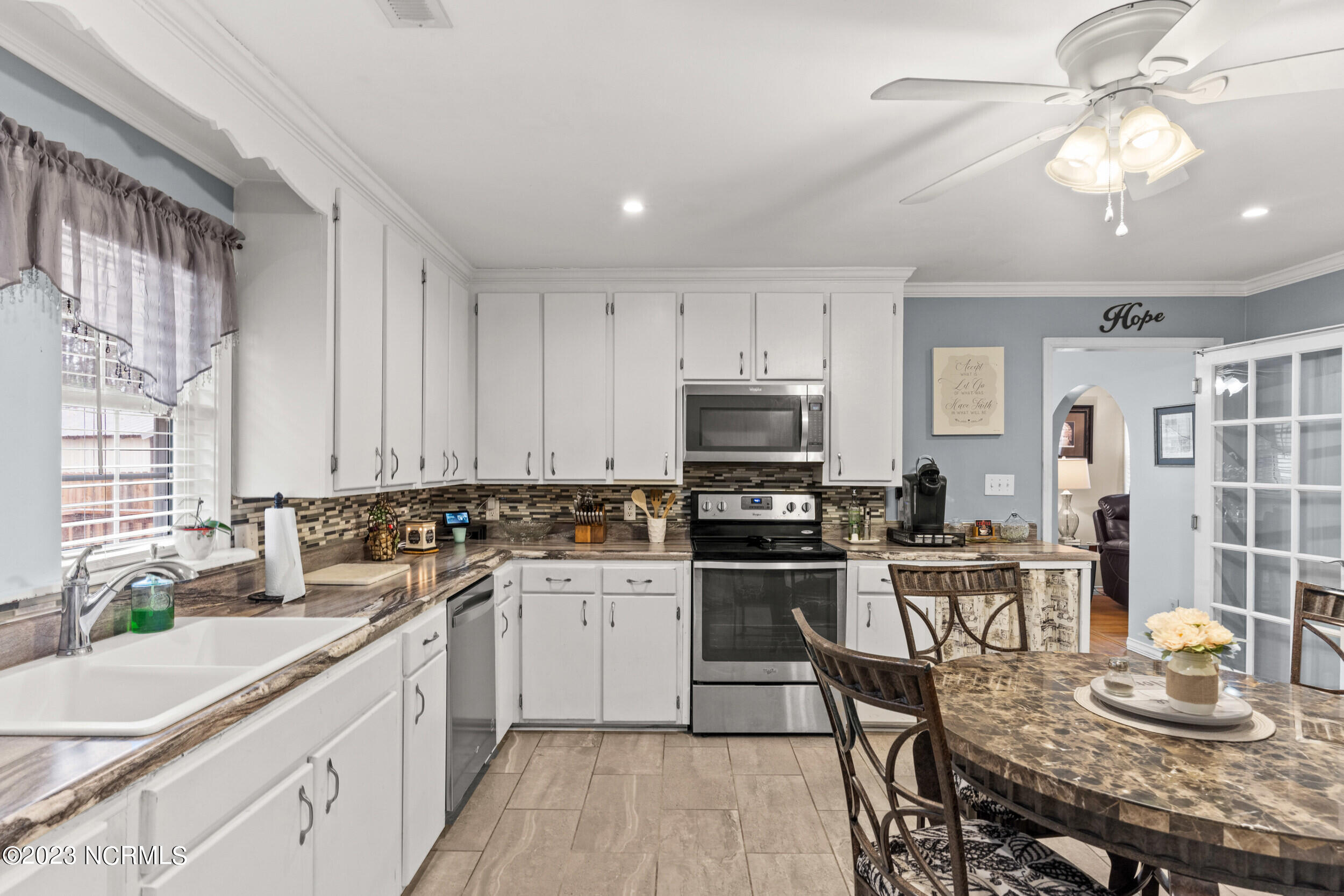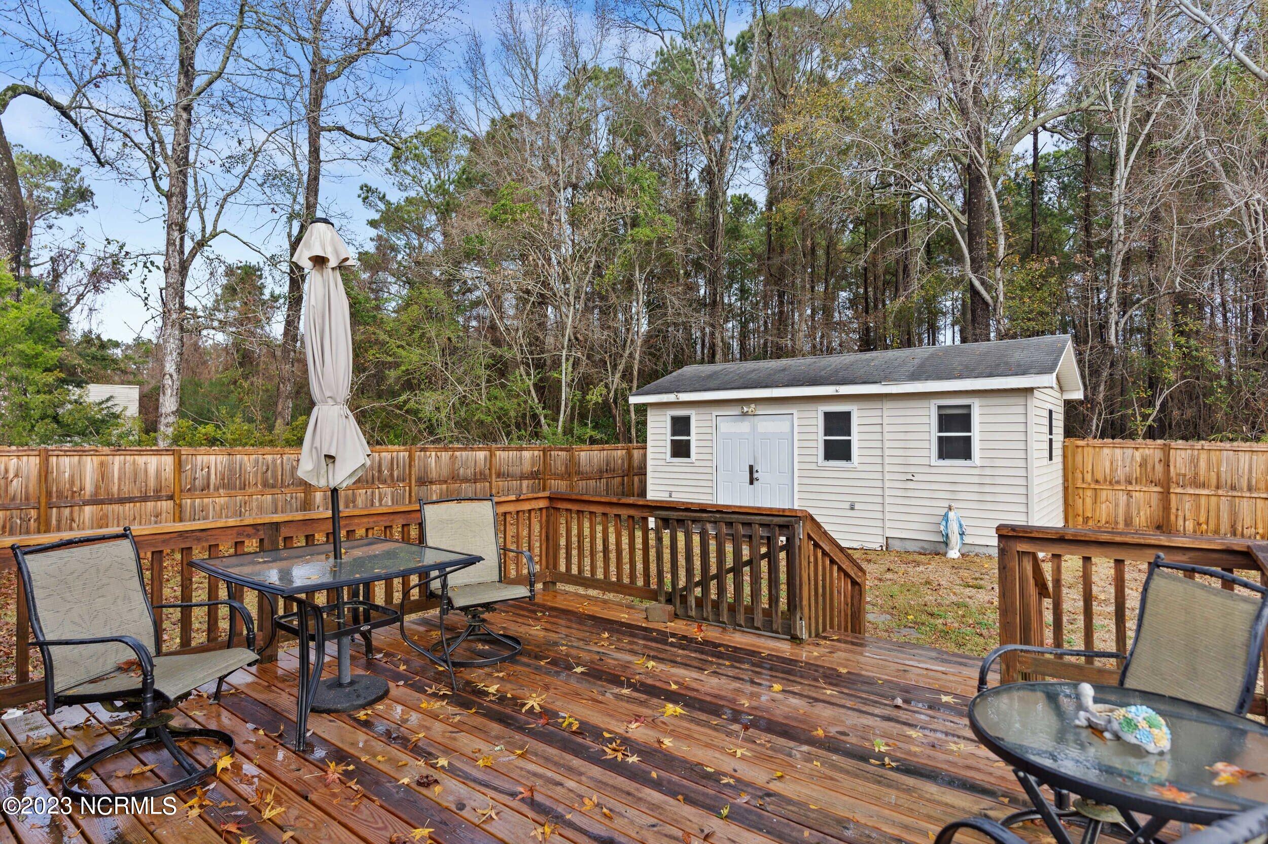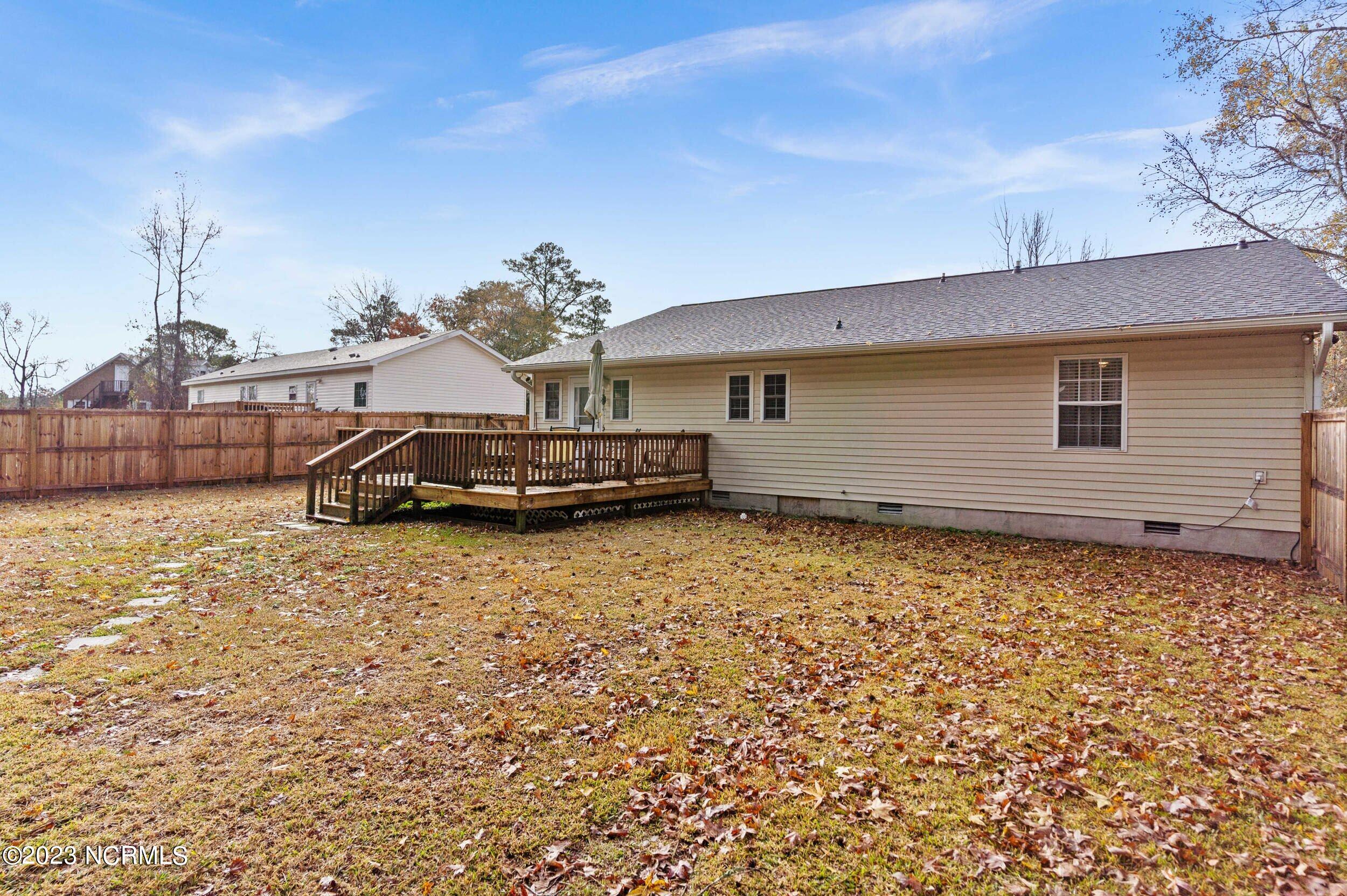 Welcome to 27 East Drive, Jacksonville, NC - your perfect home awaits! This charming 3-bedroom, 2-bathroom house is a true gem, offering a blend of modern updates and classic features. Step inside to discover a beautifully updated kitchen, where culinary dreams come to life. The sleek design and contemporary finishes create a stylish space that is both functional and inviting. The original hardwood floors have been refinished, preserving the timeless elegance of the home while providing a warm and welcoming atmosphere. Located just 2 miles from the Camp Lejeune main gate, this home is perfect for military families seeking convenience and accessibility. A new roof was installed in 2022 with a transferrable warranty so you can enjoy peace of mind knowing that your investment is well-maintained and ready to withstand the elements. The backyard has a spacious shed with 532 square feet. This versatile space is equipped with both electrical and plumbing, making it an ideal workshop, studio, or even a potential guest suite. Complete with a full bathroom, this additional dwelling expands the possibilities for your new home.