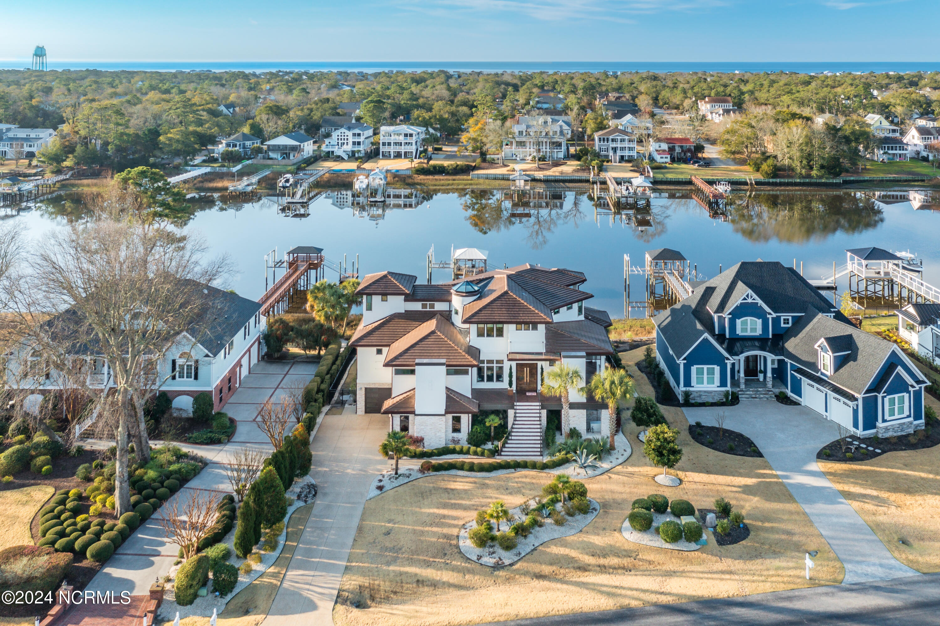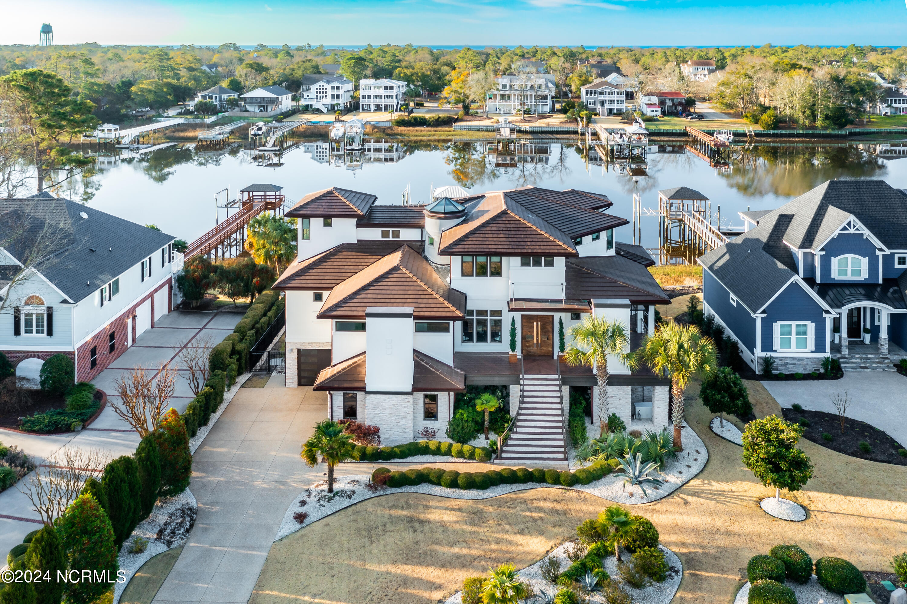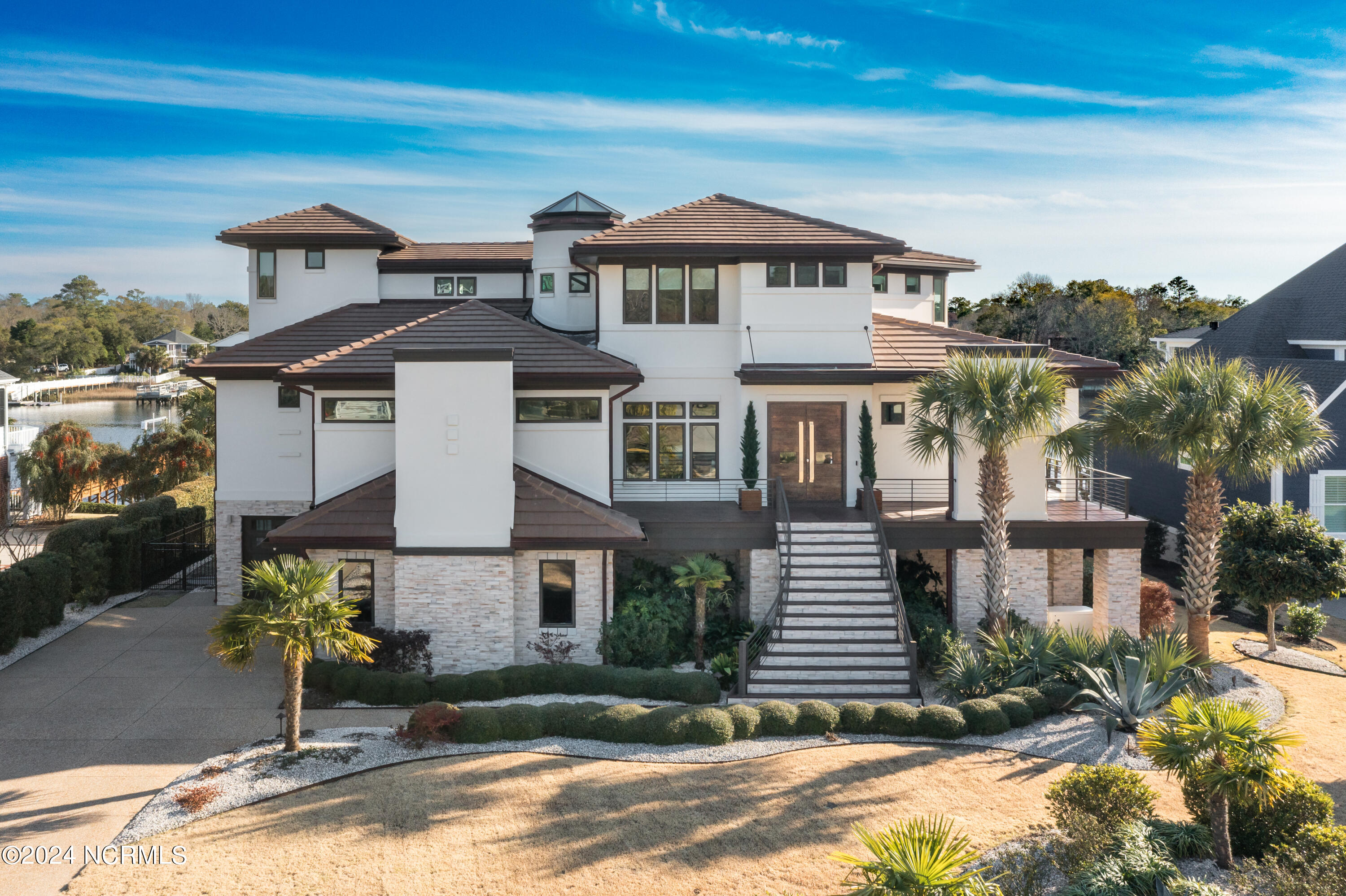 Discover the pinnacle of luxury living at 2751 Pinecrest Drive, an exquisite property that sits perfectly along the serene expanse of the Intracoastal Waterway, within the esteemed St. James community. Meticulously designed by the acclaimed Whitney Blair Custom Homes, this coastal contemporary marvel stretches across 6300 sqft, offering 5 bedrooms and 5.5 bathrooms. Its architecture thoughtfully showcases spectacular views of the waterway, incorporating four inviting outdoor seating areas to ensure a seamless blend of luxury and the captivating beauty of the surrounding nature. Featuring an Italian Scavolini kitchen equipped with high-end Wolf and Sub-Zero appliances, commercial-grade semi-polished porcelain tiles in main living areas, and a climate-controlled wine room, this home redefines sophistication. An elevator ensures effortless access across all three levels. The Master Suite, a grand sanctuary, is notably vast, offering a luxurious indoor sauna and steam room, further enhancing the home's spa-like ambiance. Outdoor amenities impress with a pier and covered dock equipped with a 16,000 lb boat lift, an EZ dock for two jet skis, and an 8-person hot tub, ideal for both entertaining and tranquil relaxation. The extensive garage is designed to accommodate up to four vehicles easily. The St. James community enhances the luxurious lifestyle by offering residents an array of amenities, including an 81-hole championship golf course, four distinctive clubs with restaurants, a marina, a private beach club, picturesque walking trails, state-of-the-art fitness centers, swimming pools, tennis and pickleball courts, and a waterway park. This residence isn't just a home; it's an entry into a life of unmatched luxury and picturesque tranquility.