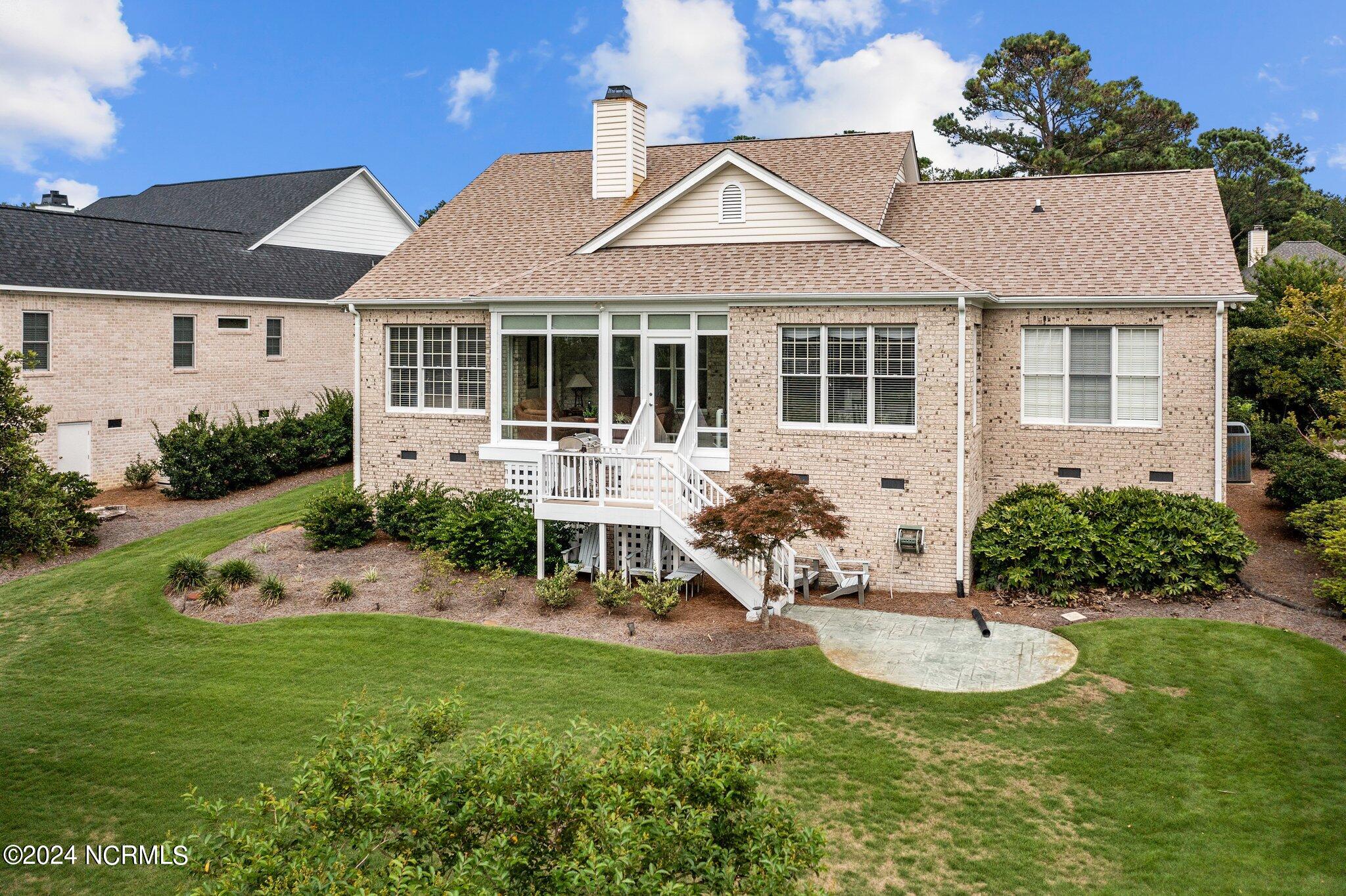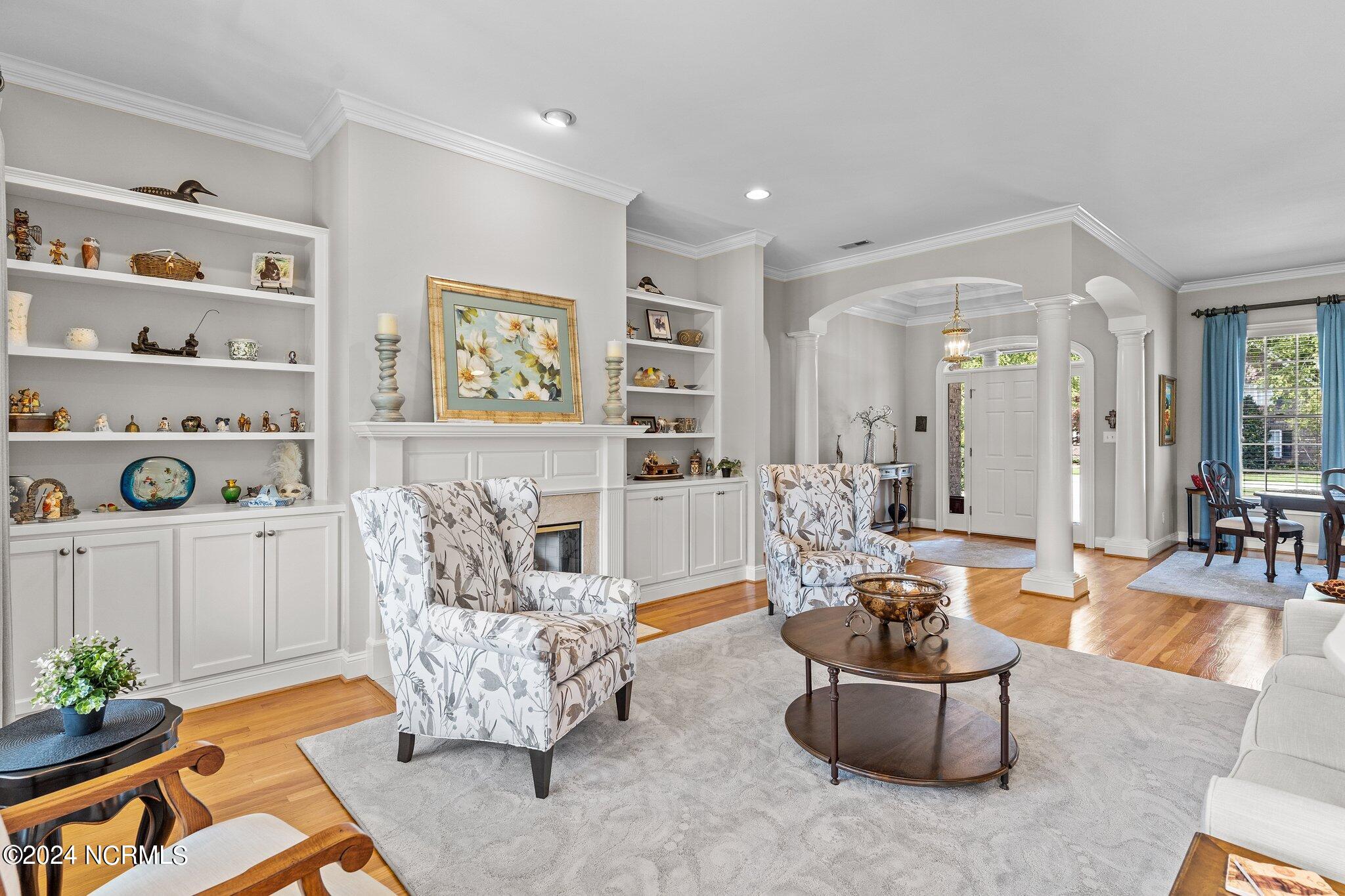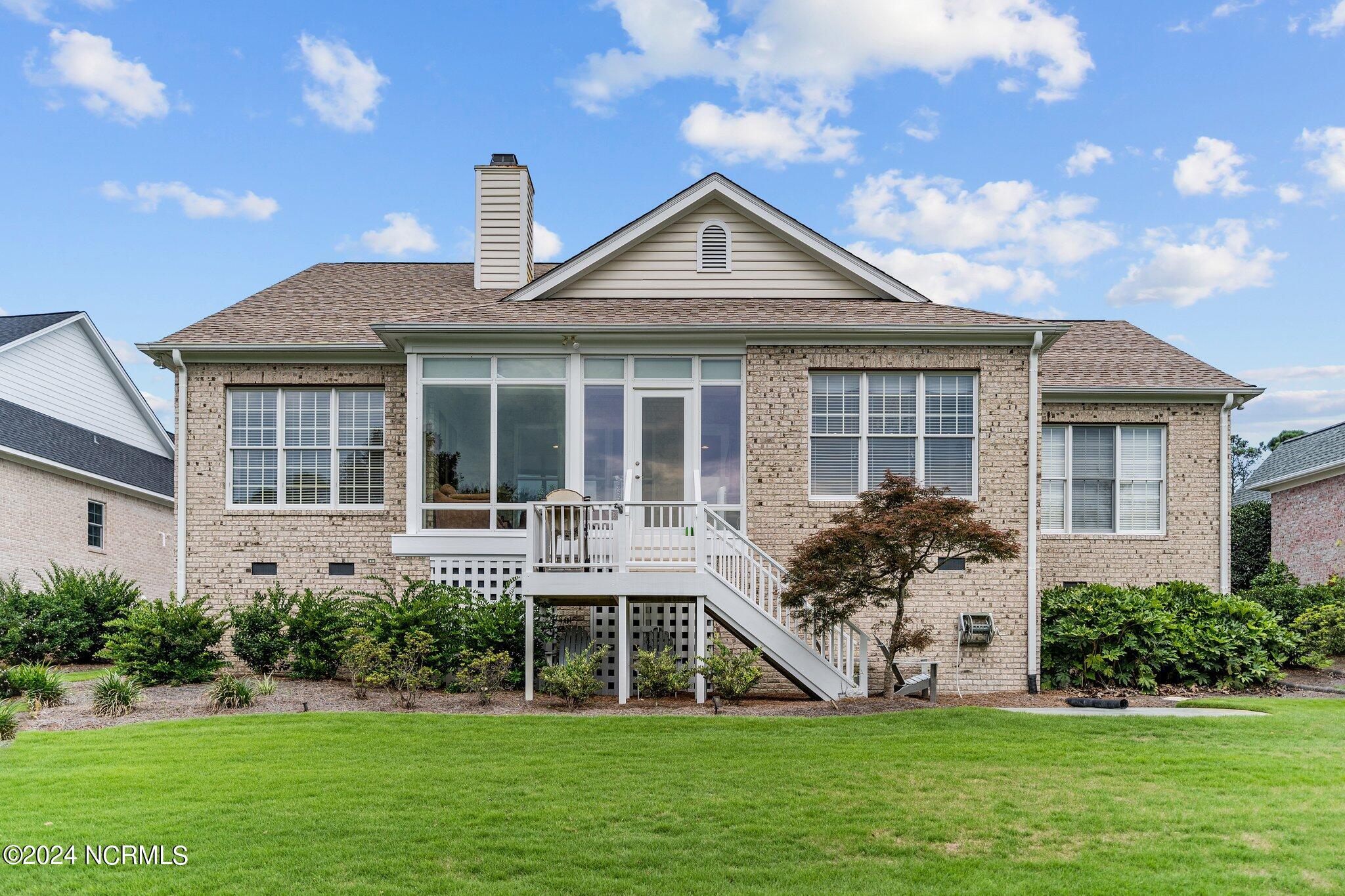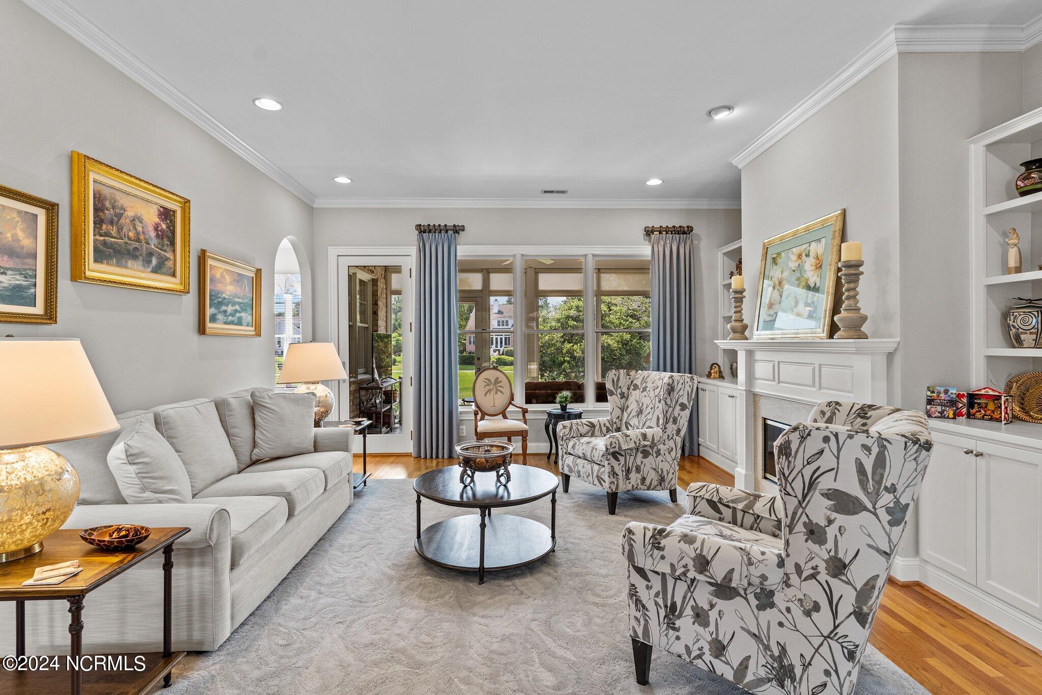 This elegant brick home, situated on the 17th hole within the exclusive gated community of Porters Neck Plantation, offers a luxurious and serene lifestyle. With 4 bedrooms and 3 1/2 bathrooms, this residence has been freshly painted and features new carpet in the bedrooms, and hardwood floors throughout the living spaces. The welcoming foyer opens to a cozy living room, complete with a fireplace and built-in bookshelves, creating a warm and inviting atmosphere.