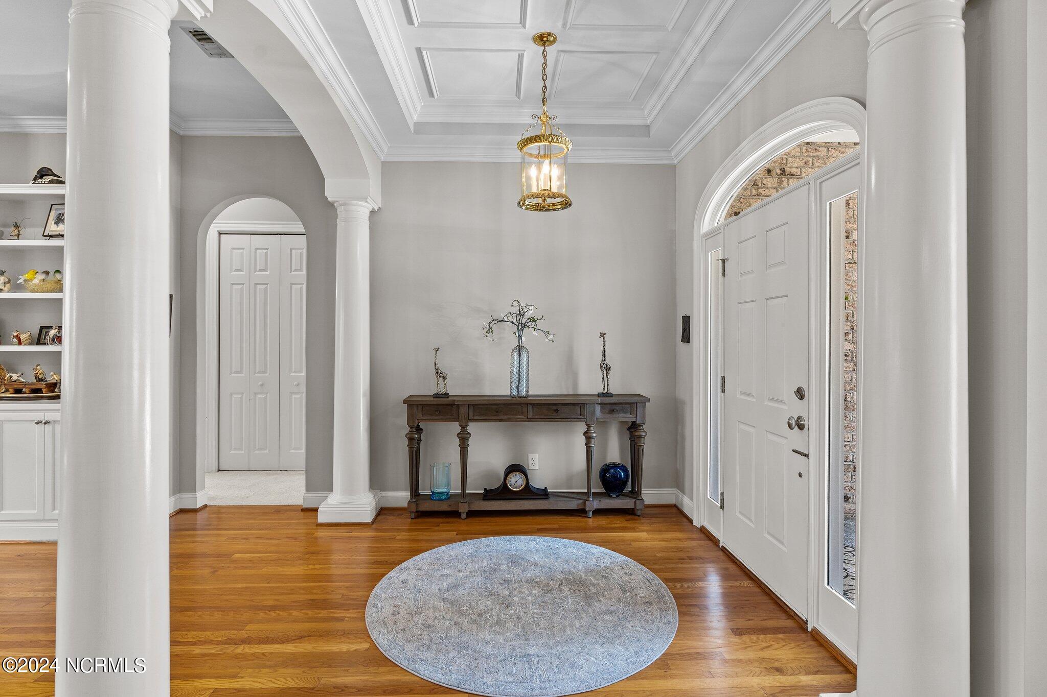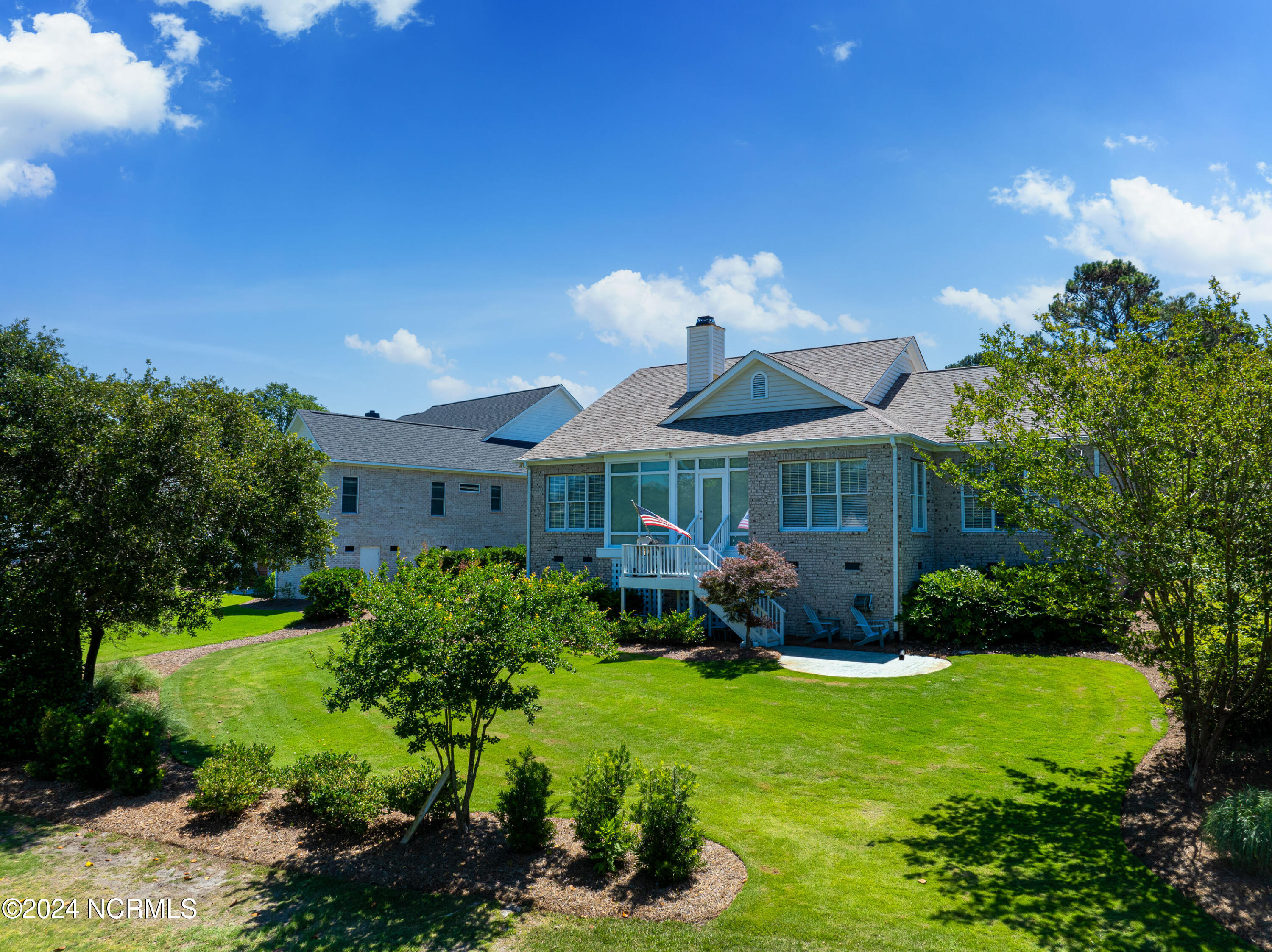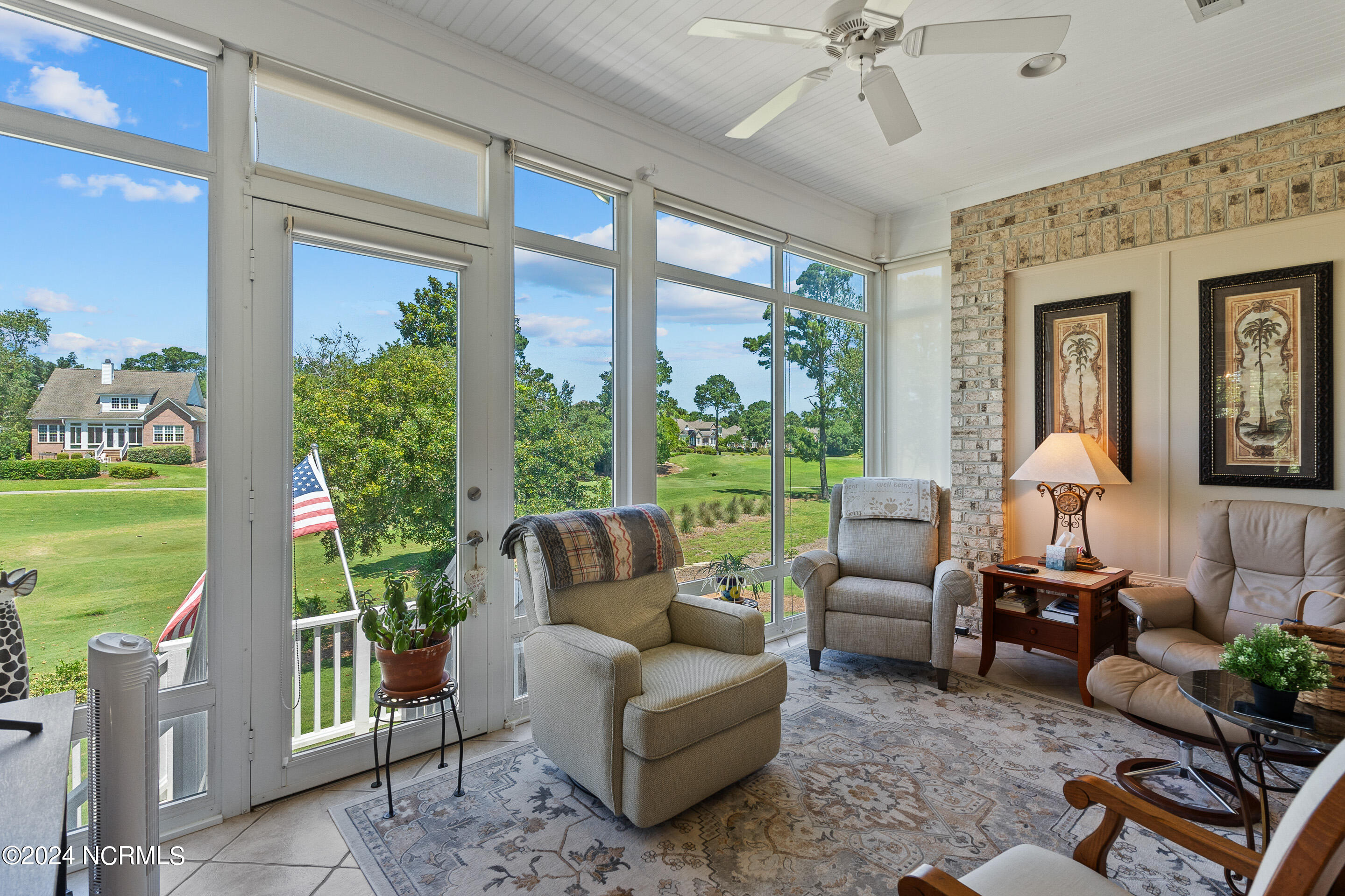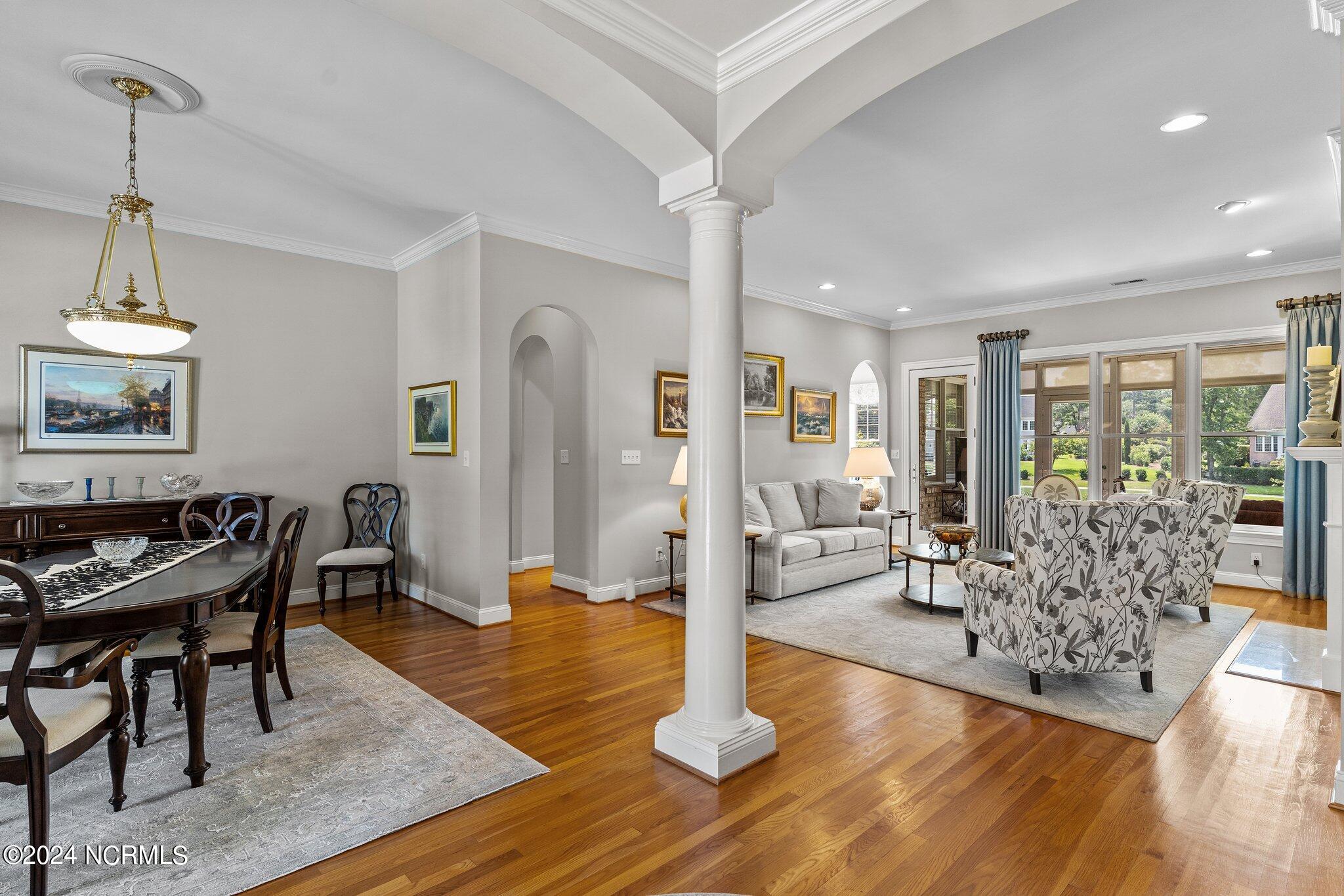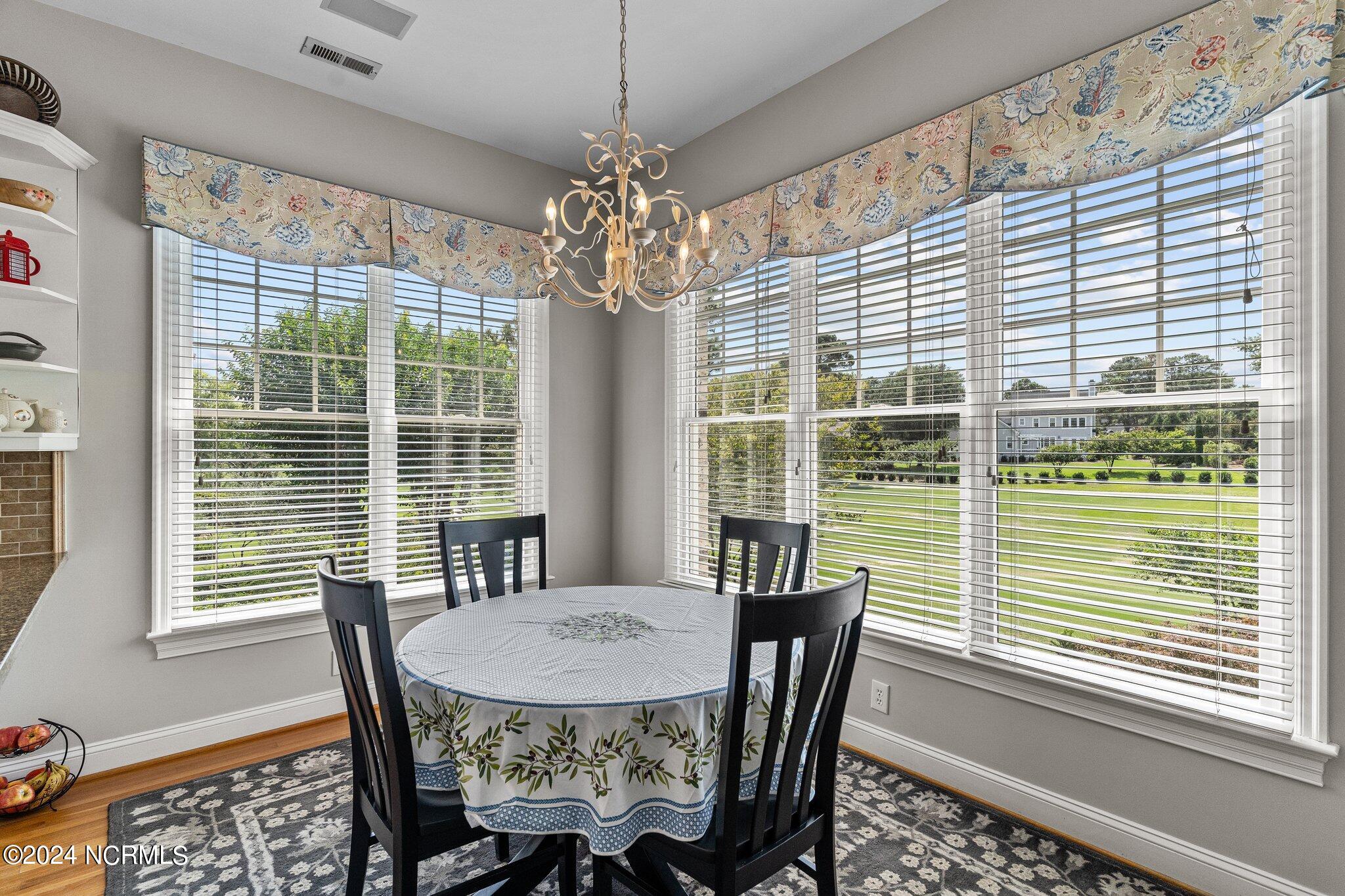 This elegant brick home, situated on the 17th hole within the exclusive gated community of Porters Neck Plantation, offers a luxurious and serene lifestyle. With 4 bedrooms and 3 1/2 bathrooms, this residence has been freshly painted and features new carpet in the bedrooms, and hardwood floors throughout the living spaces. The welcoming foyer opens to a cozy living room, complete with a fireplace and built-in bookshelves, creating a warm and inviting atmosphere.