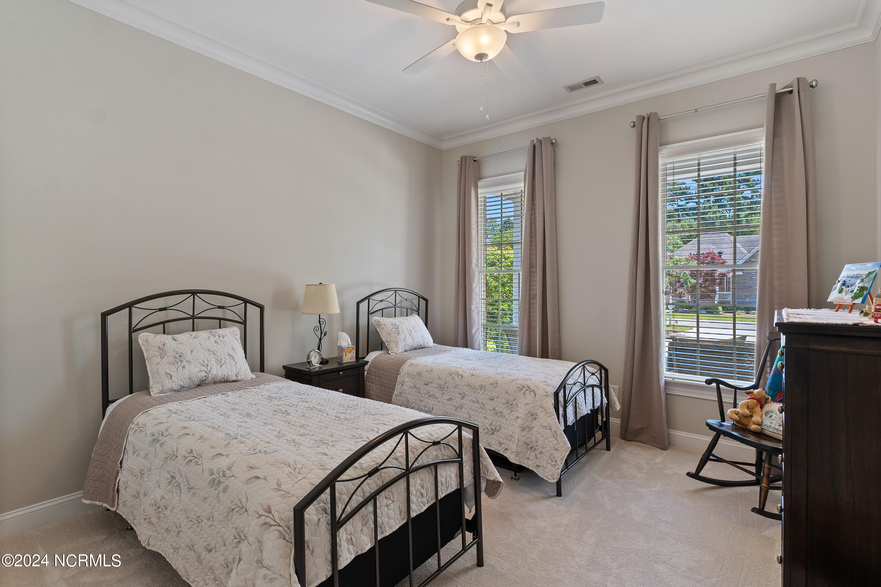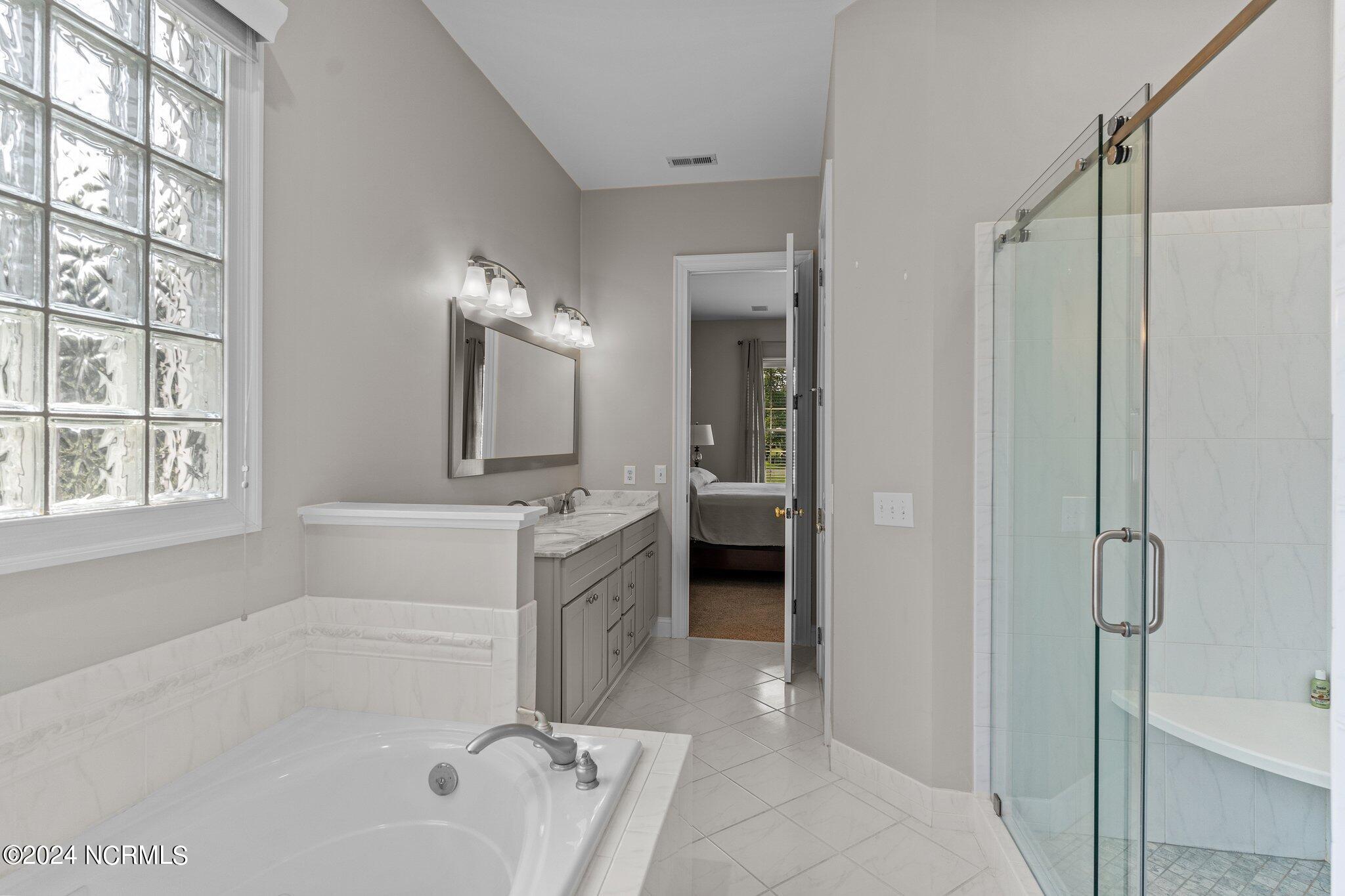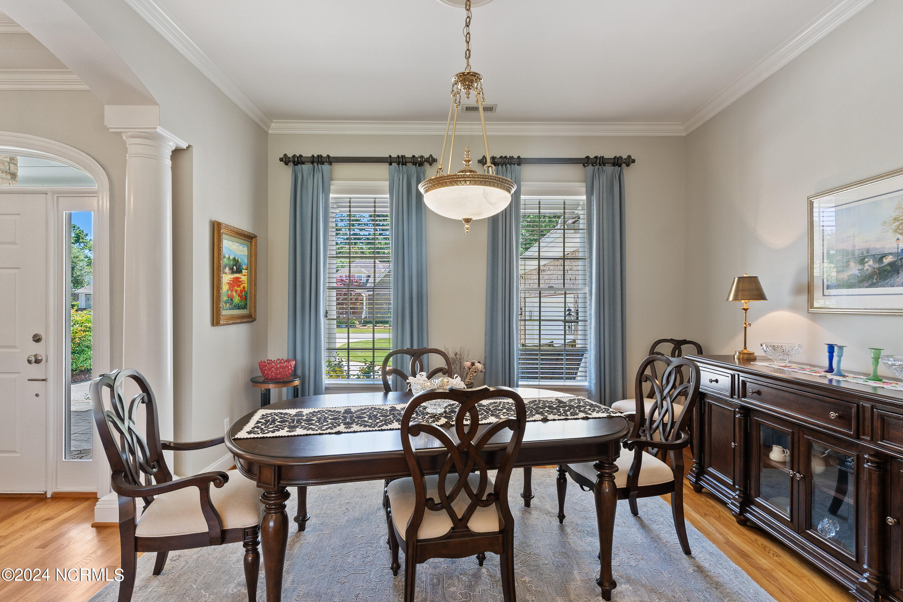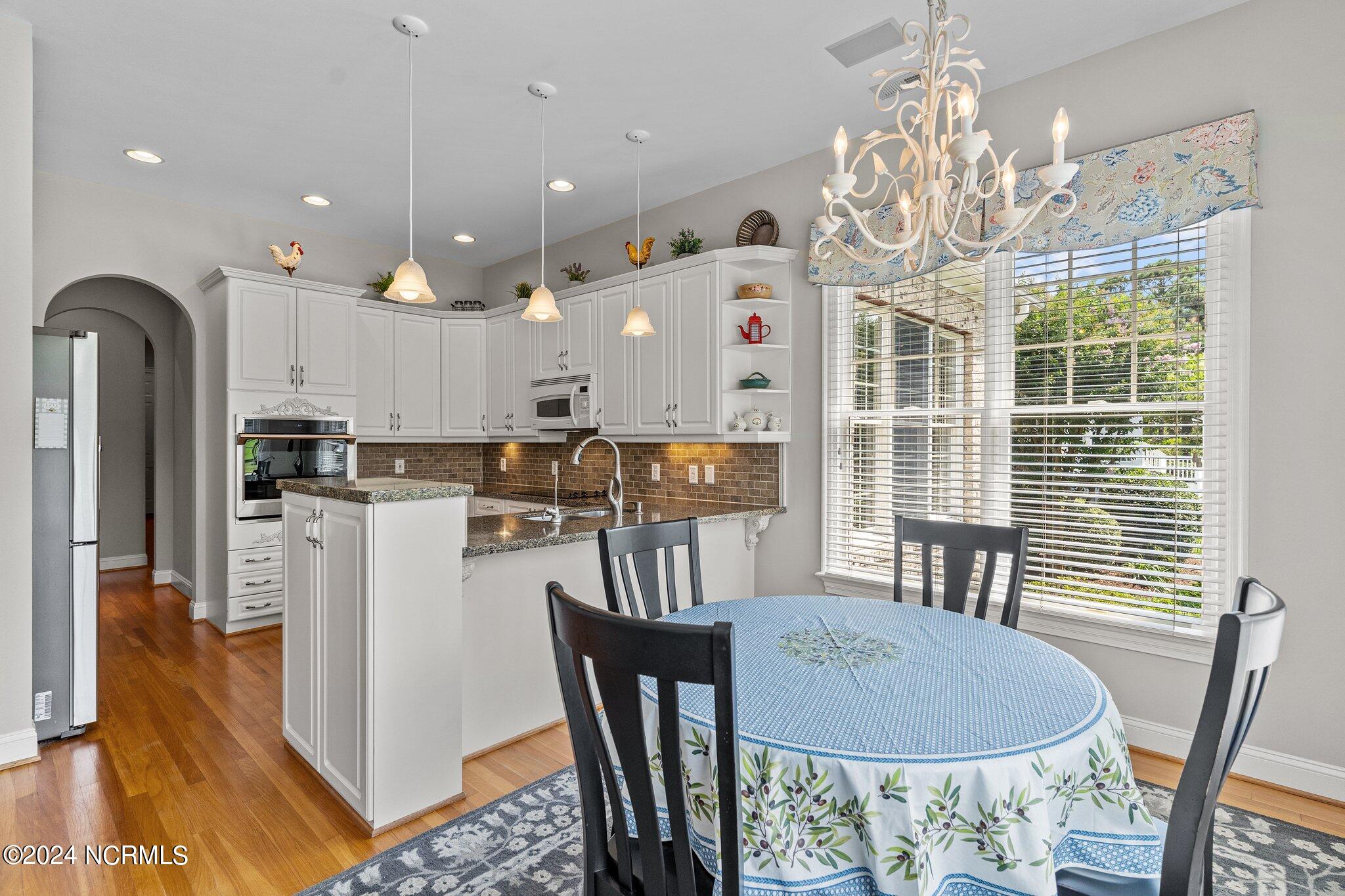This elegant brick home, situated on the 17th hole within the exclusive gated community of Porters Neck Plantation, offers a luxurious and serene lifestyle. With 4 bedrooms and 3 1/2 bathrooms, this residence has been freshly painted and features new carpet in the bedrooms, and hardwood floors throughout the living spaces. The welcoming foyer opens to a cozy living room, complete with a fireplace and built-in bookshelves, creating a warm and inviting atmosphere.