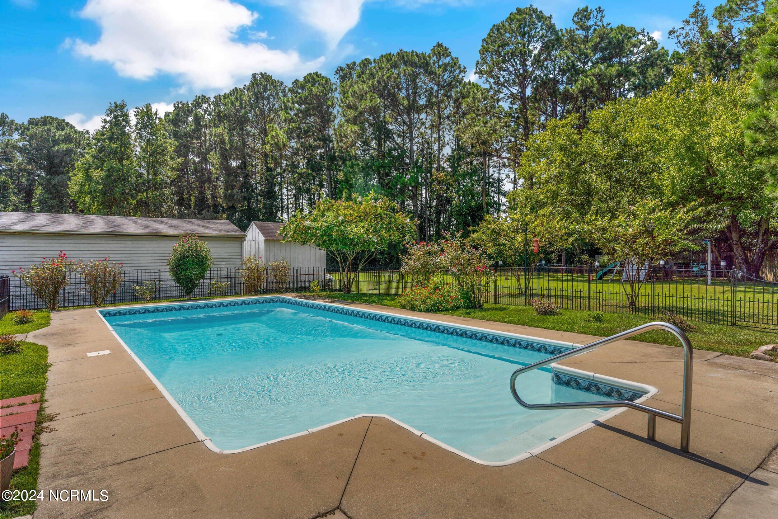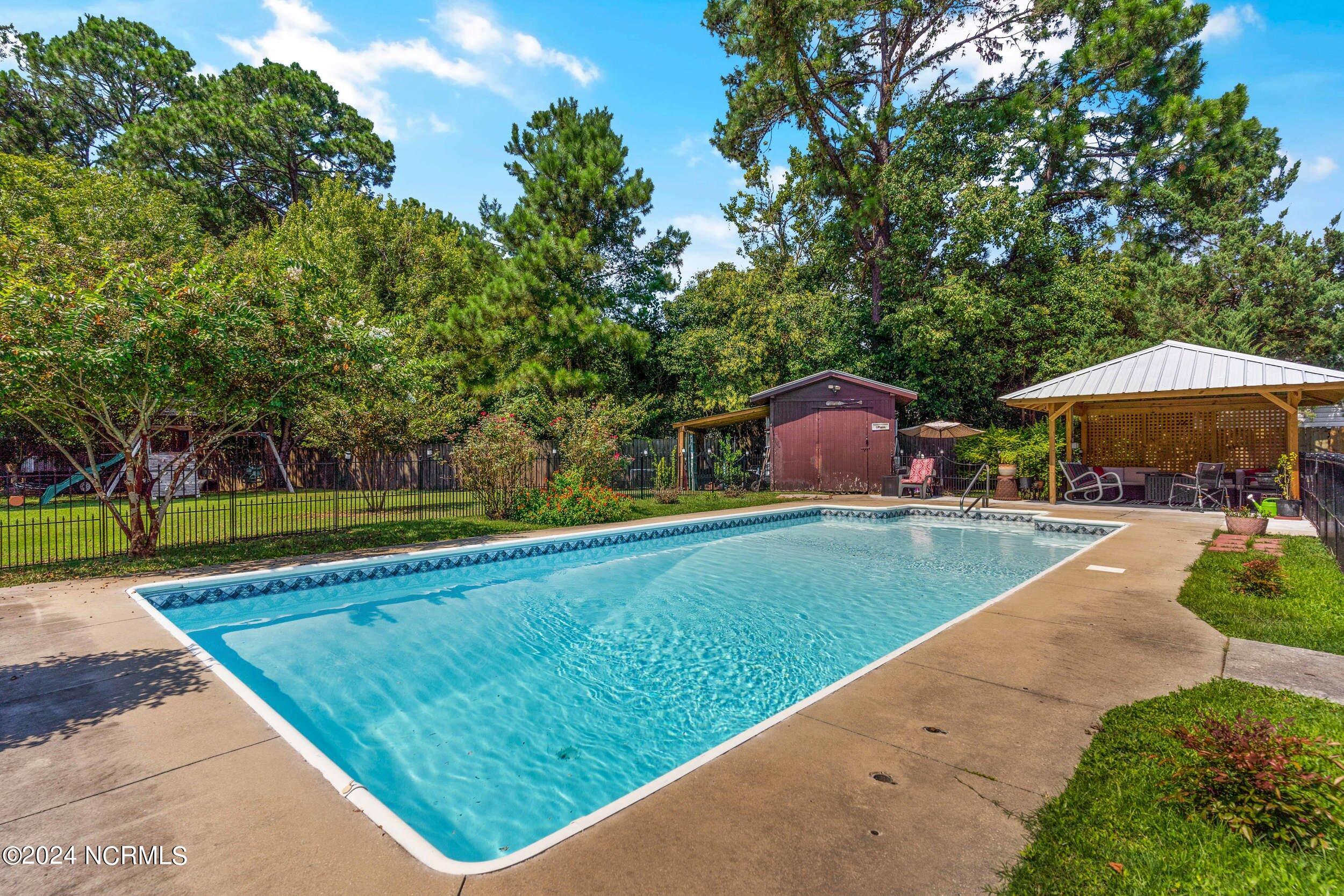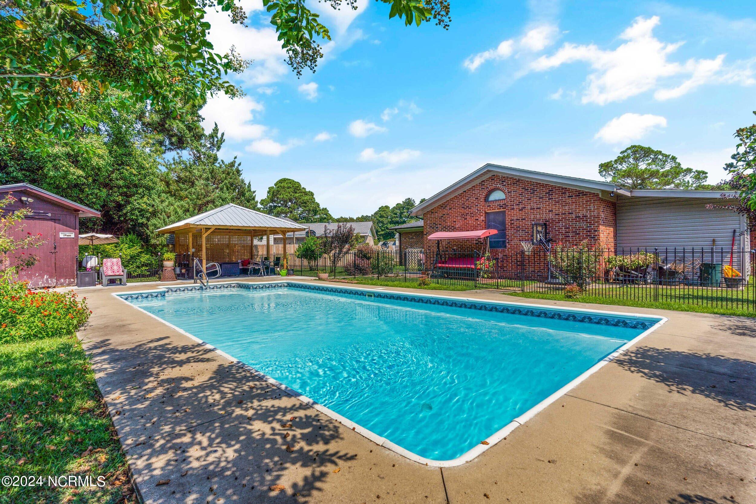 The backyard is an entertainer's paradise, featuring a sparkling in-ground pool measuring 16 x 34 feet with a depth of 8 feet, perfect for cooling off on hot summer days or hosting poolside gatherings.
