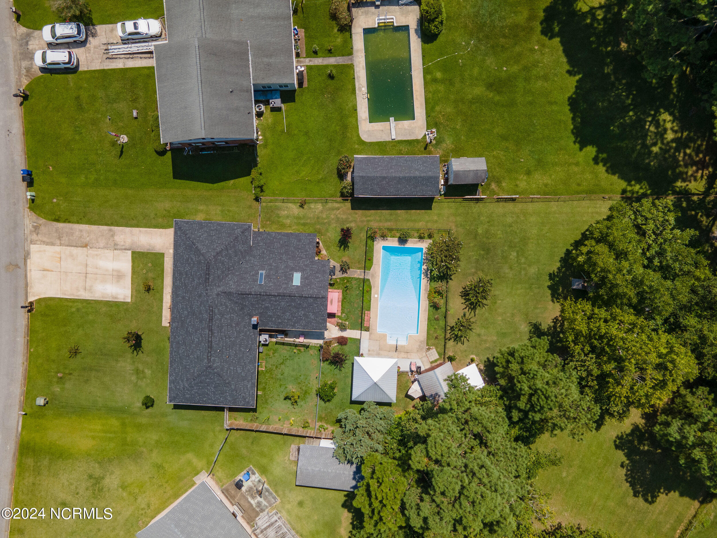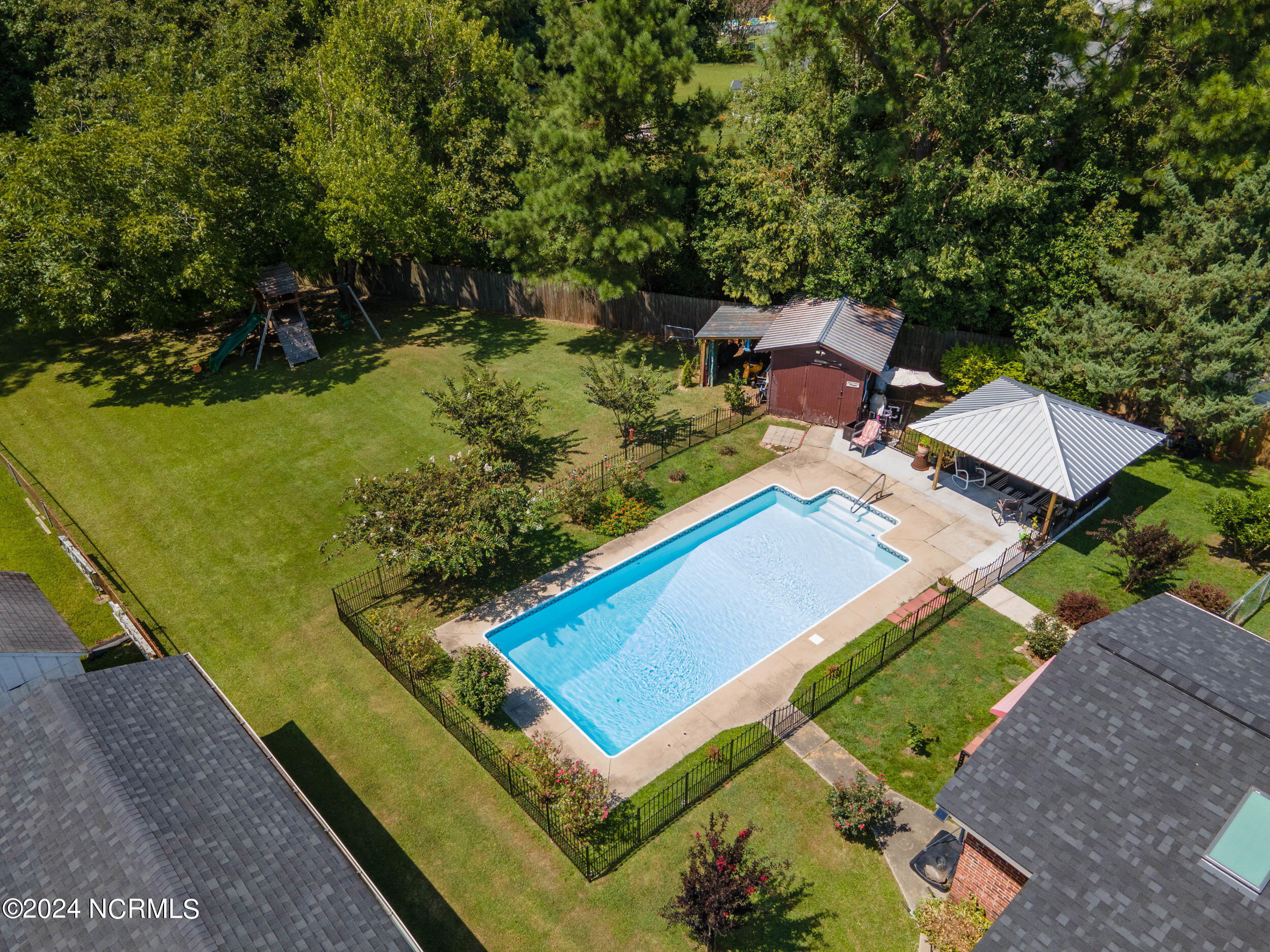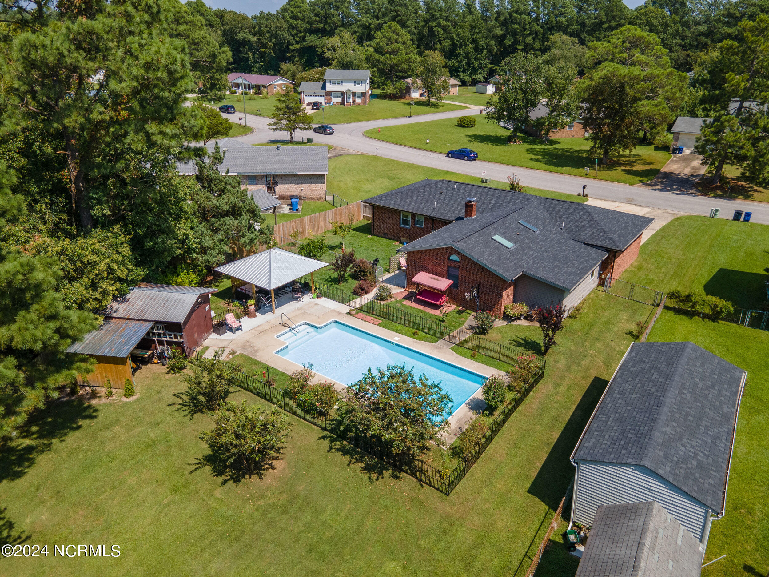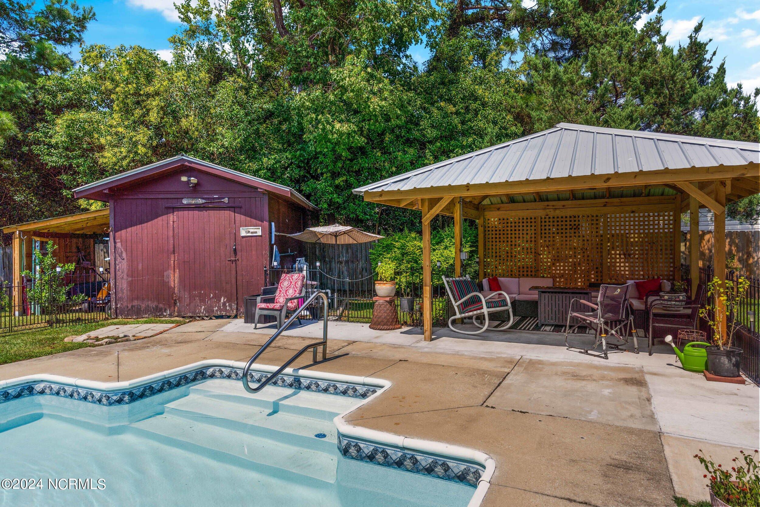 The backyard is an entertainer's paradise, featuring a sparkling in-ground pool measuring 16 x 34 feet with a depth of 8 feet, perfect for cooling off on hot summer days or hosting poolside gatherings.
