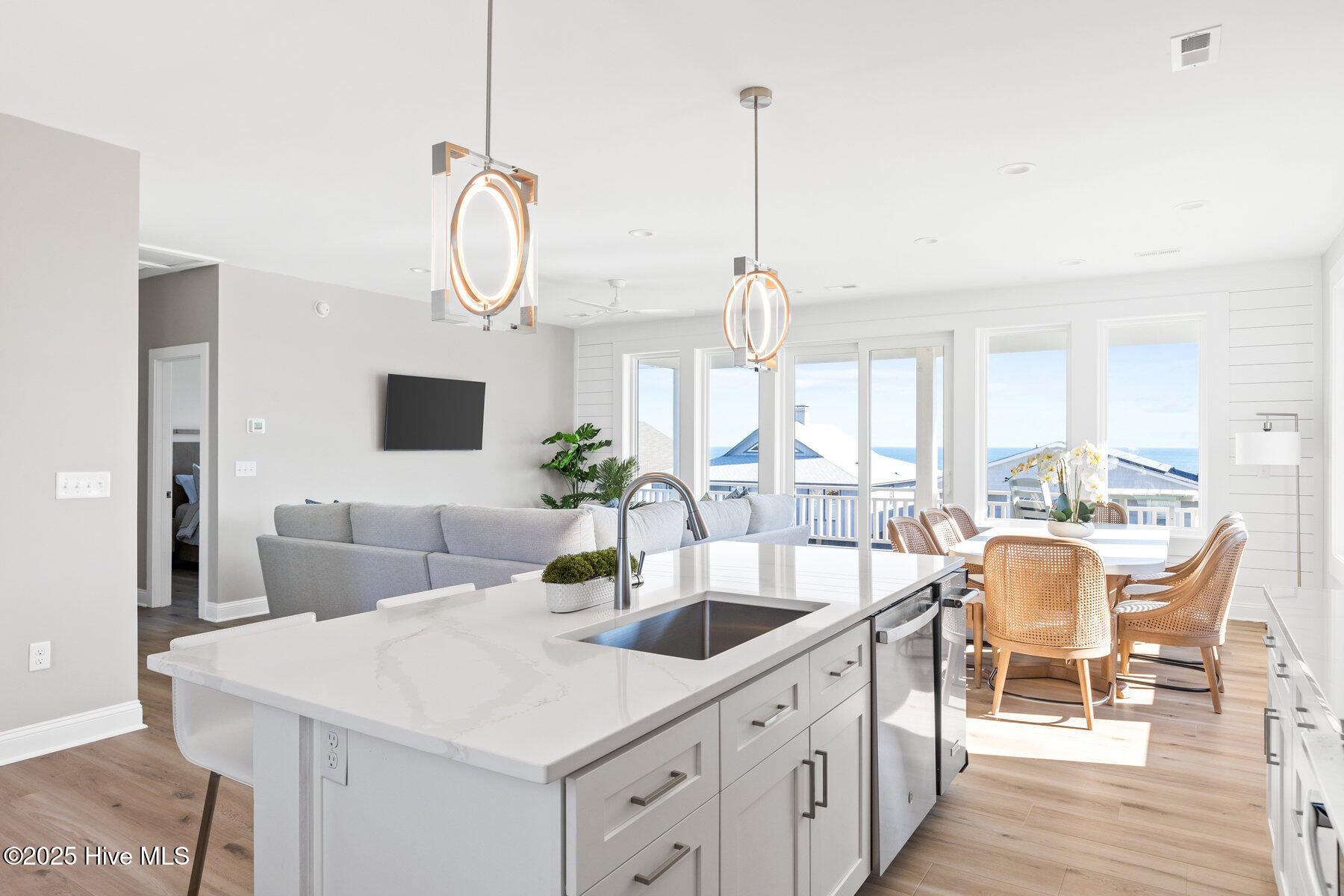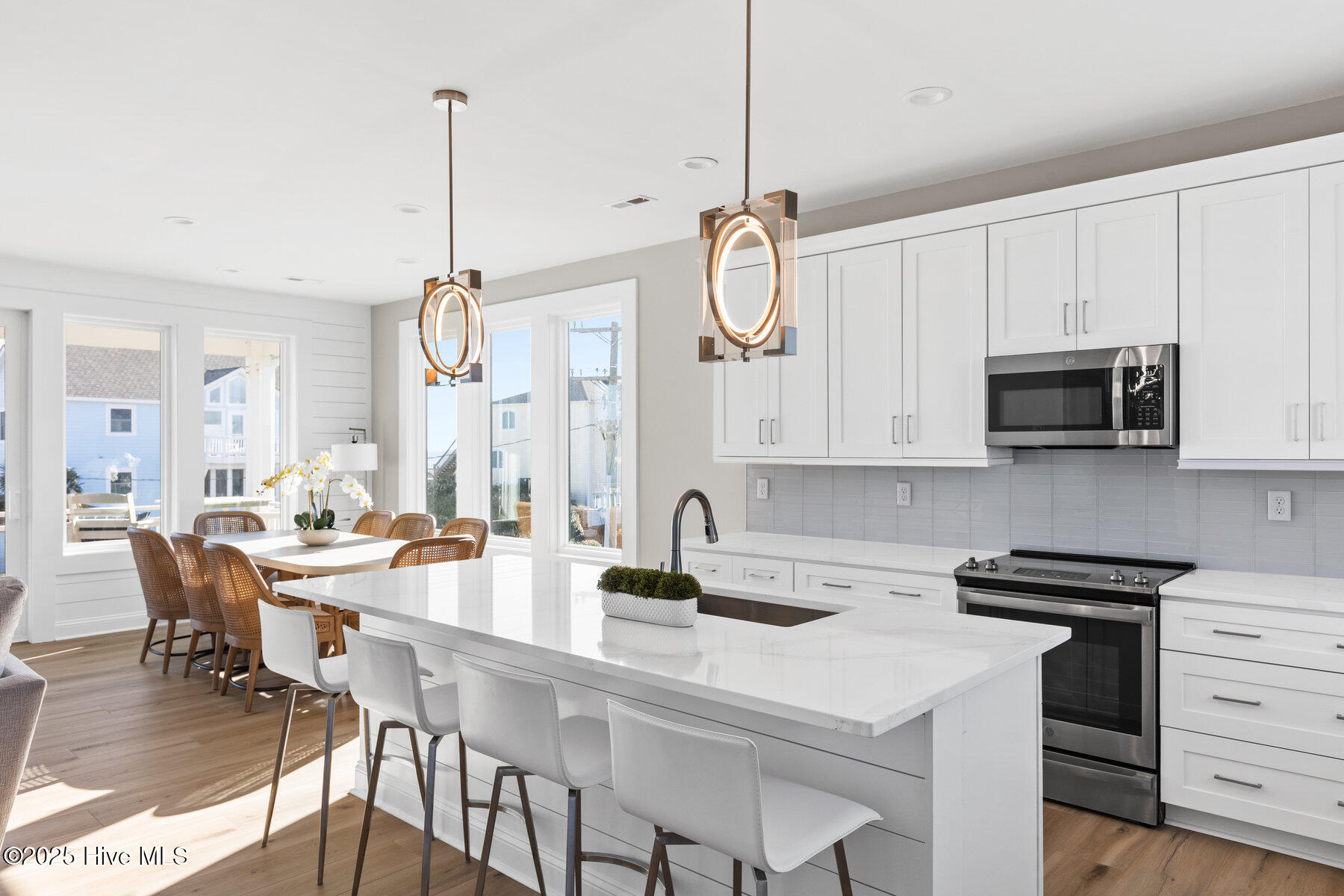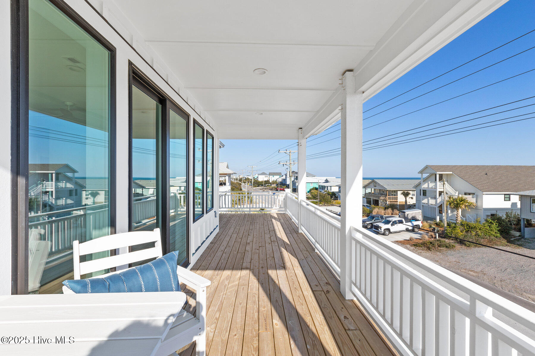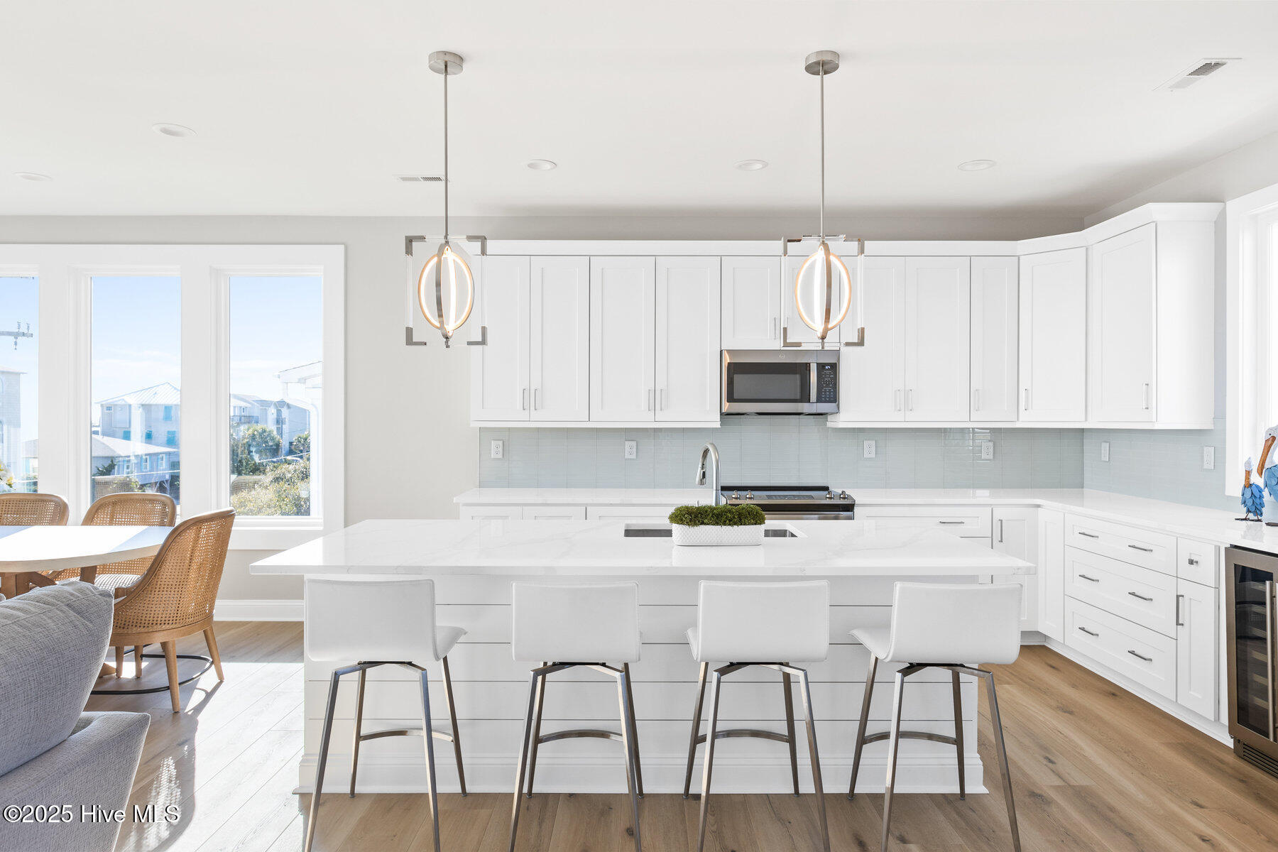 Second row new construction home by Ridgestone Construction features an open airy floorplan with impact glass windows, hardieplank siding, and sprawling porches with ocean views. The contemporary kitchen features custom cabinets, quartz counters and stainless appliances including under counter ice maker and wine cooler. Public beach access is located just a short walk from the door.