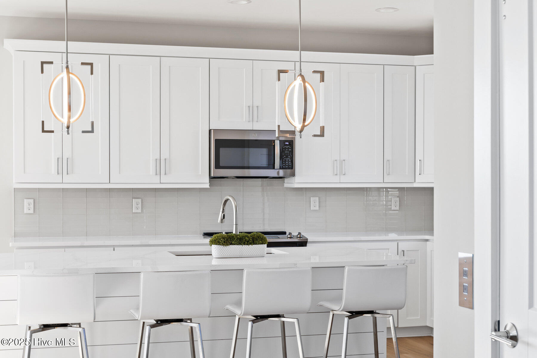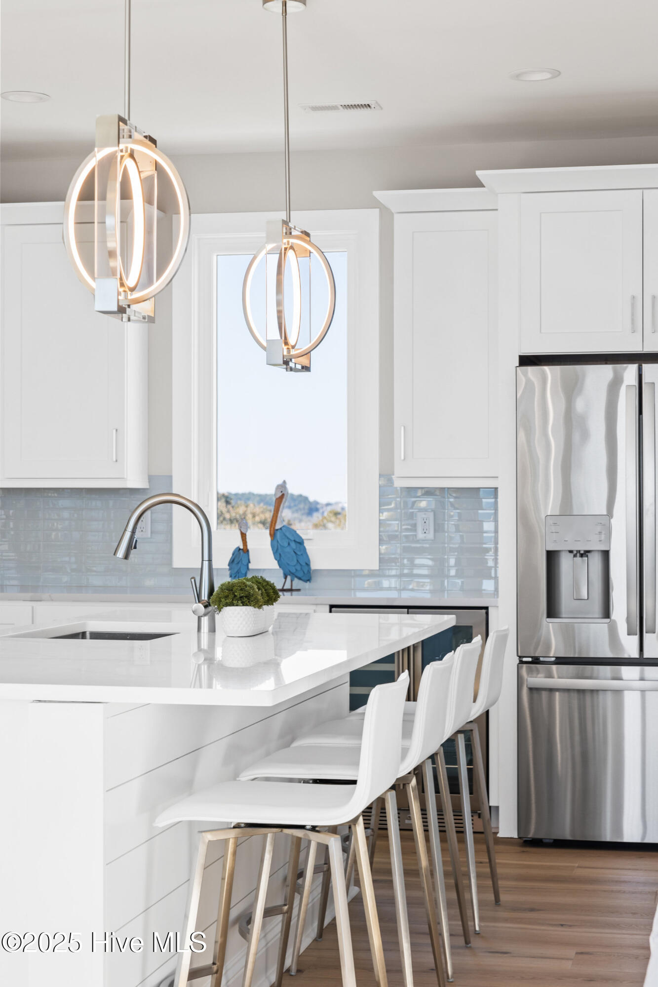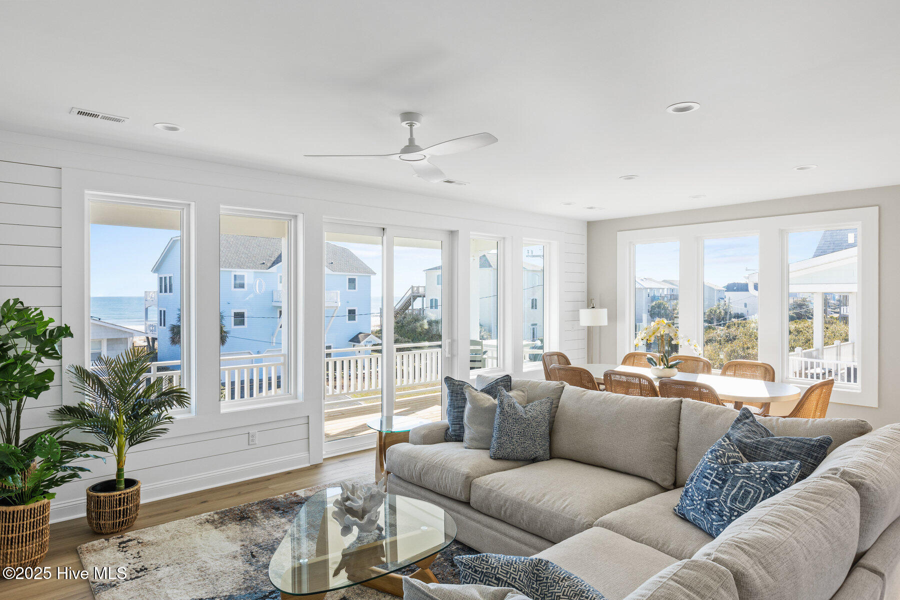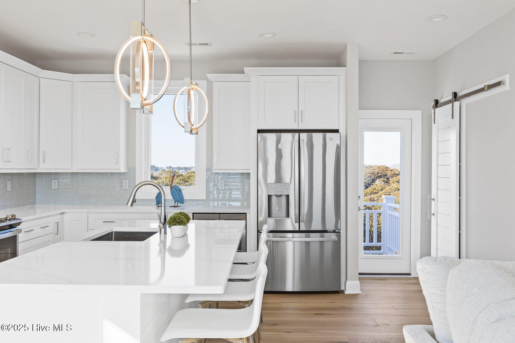Second row new construction home by Ridgestone Construction features an open airy floorplan with impact glass windows, hardieplank siding, and sprawling porches with ocean views. The contemporary kitchen features custom cabinets, quartz counters and stainless appliances including under counter ice maker and wine cooler. Public beach access is located just a short walk from the door.