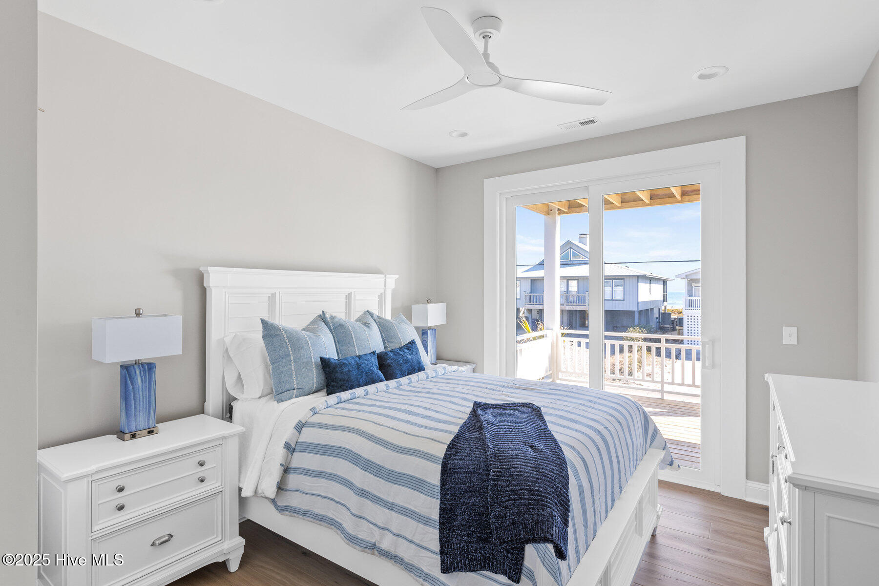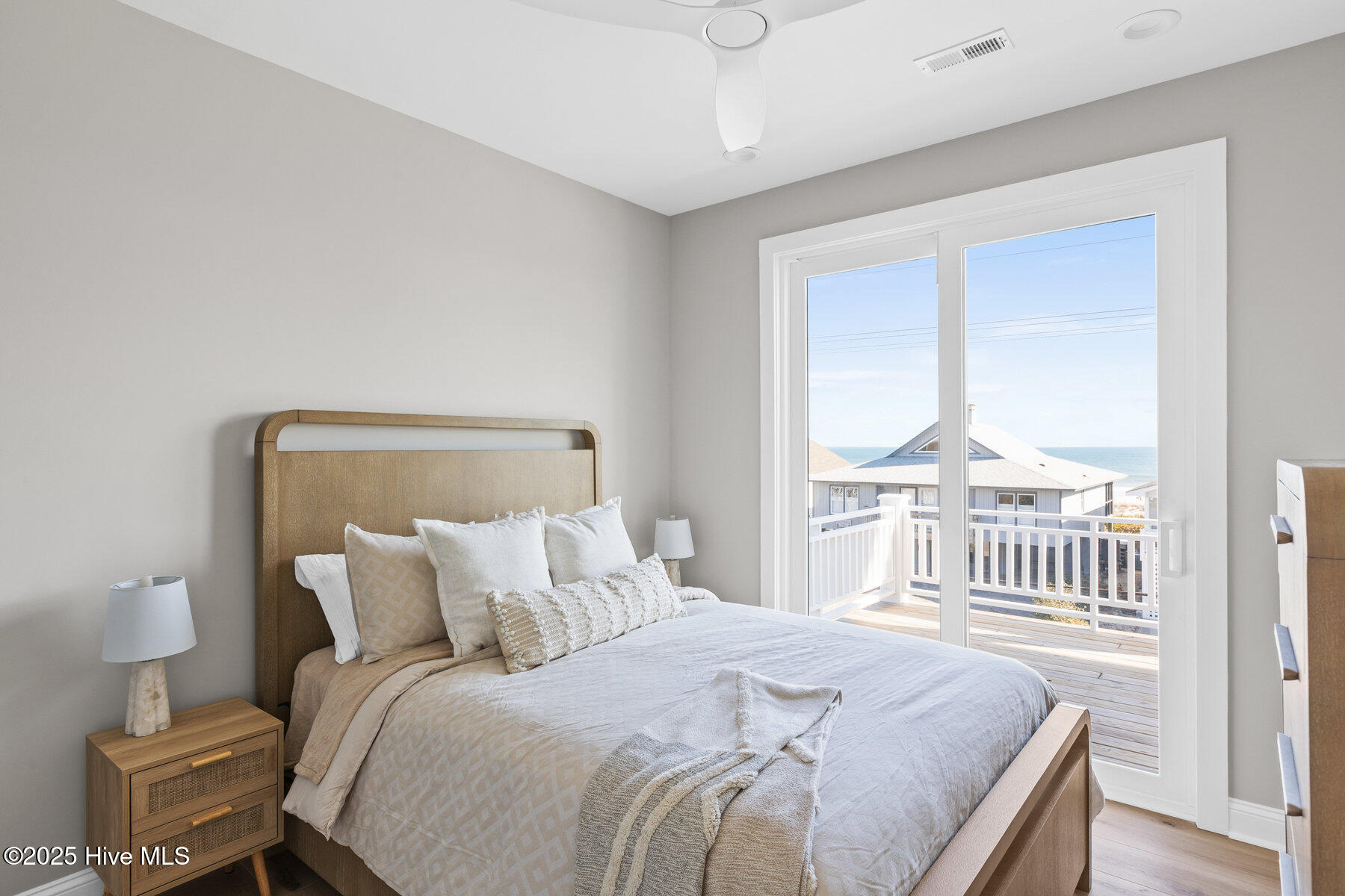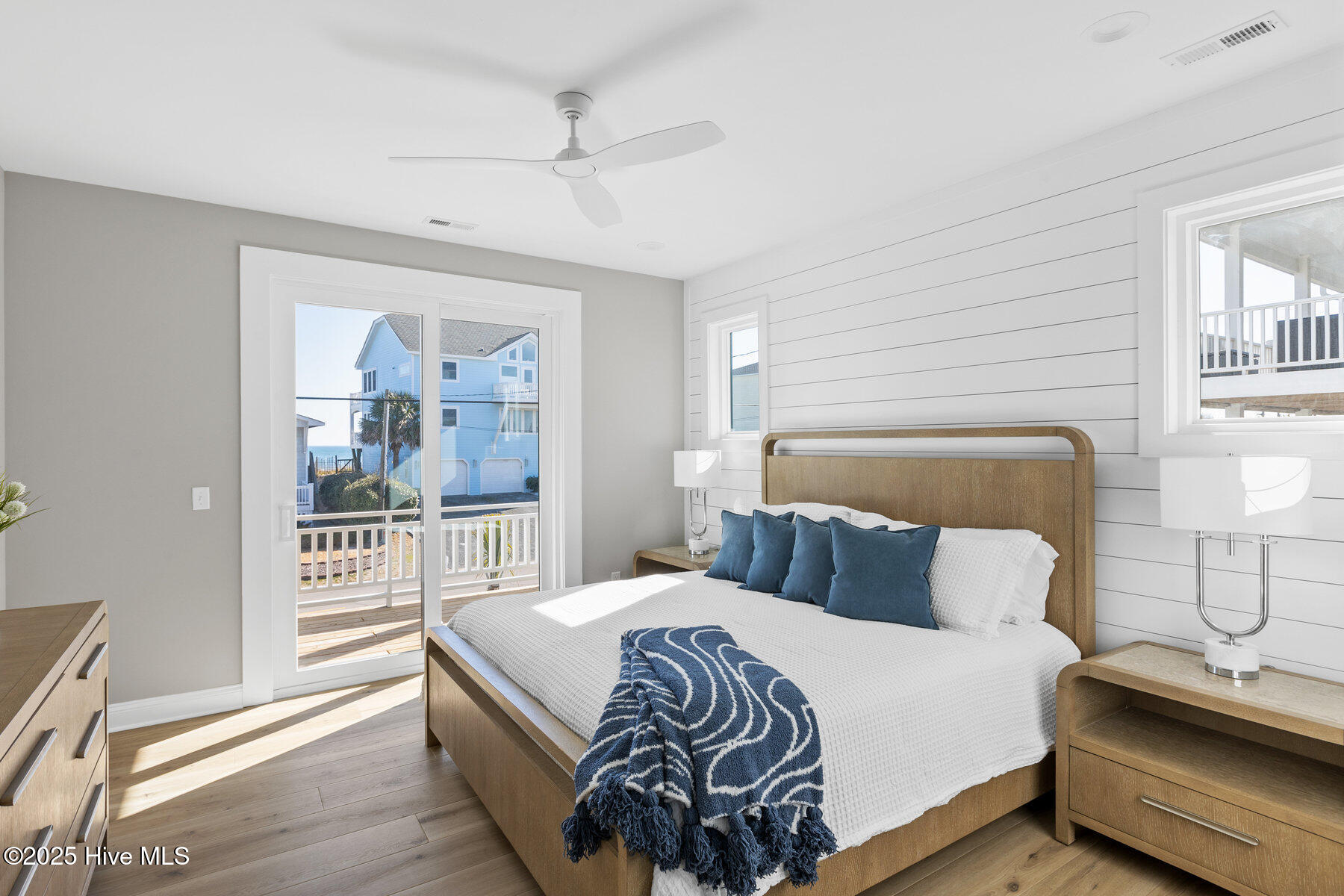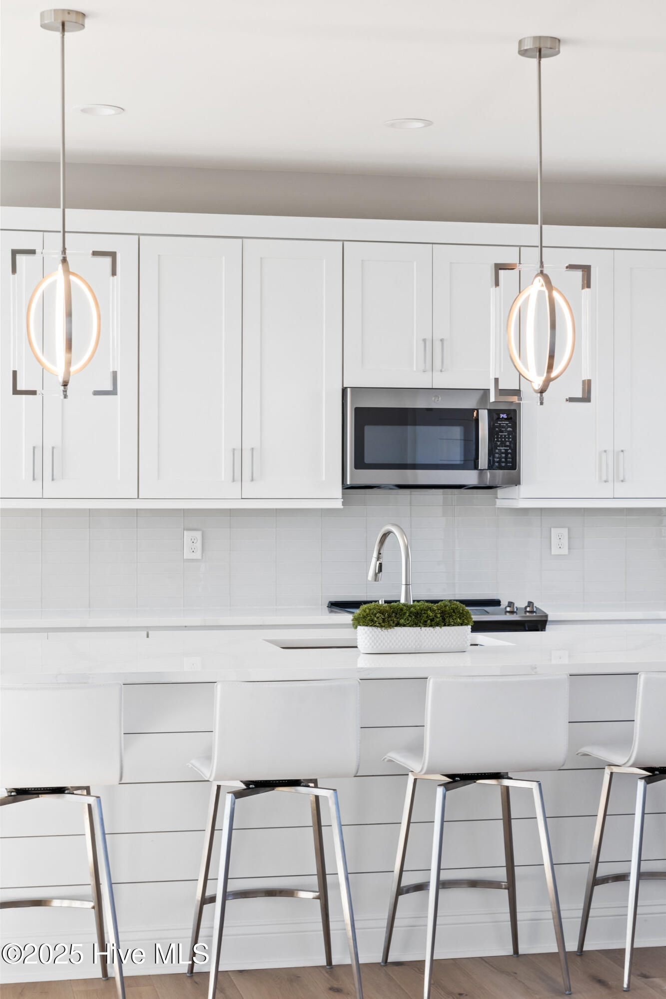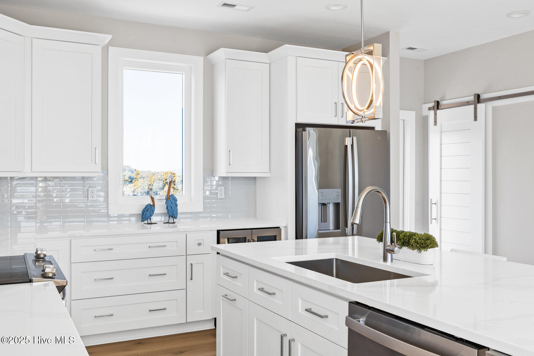 Second row new construction home by Ridgestone Construction features an open airy floorplan with impact glass windows, hardieplank siding, and sprawling porches with ocean views. The contemporary kitchen features custom cabinets, quartz counters and stainless appliances including under counter ice maker and wine cooler. Public beach access is located just a short walk from the door.