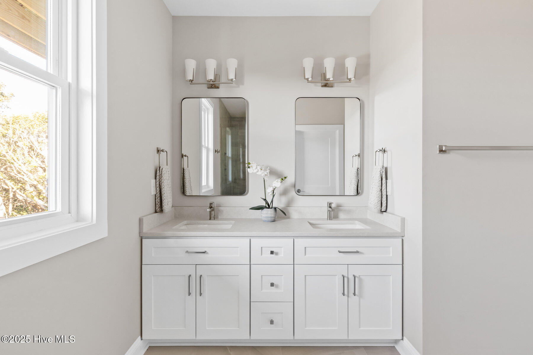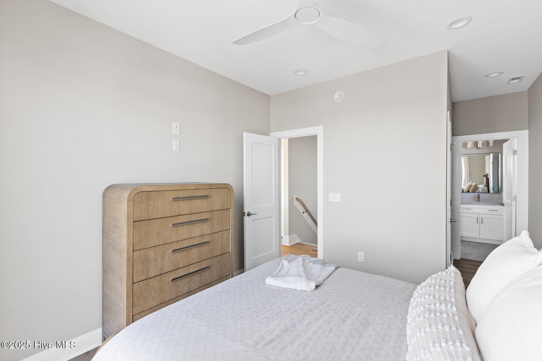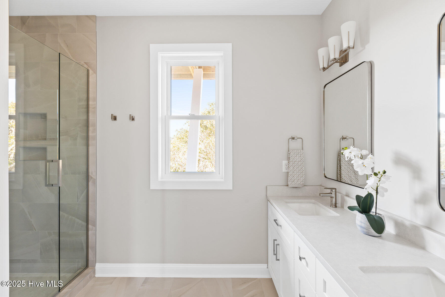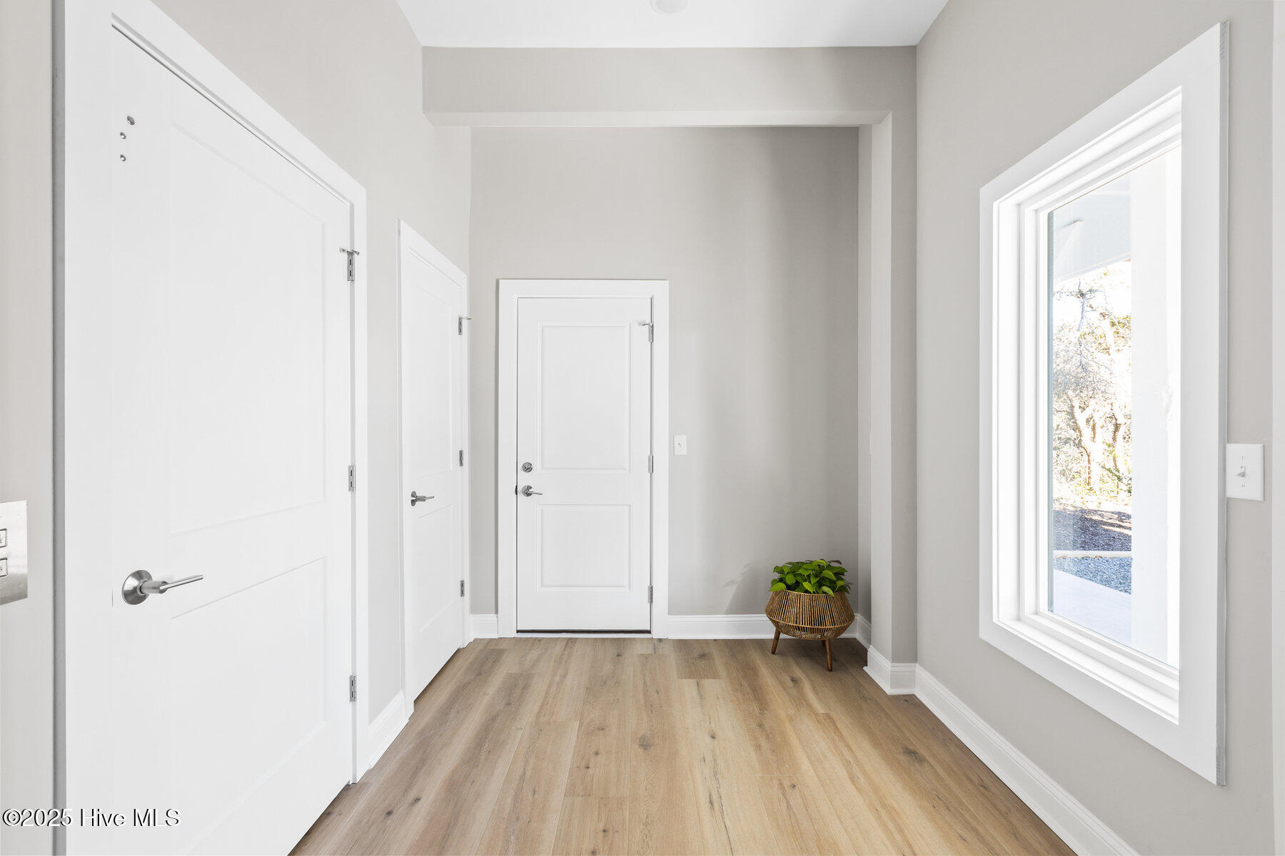 Second row new construction home by Ridgestone Construction features an open airy floorplan with impact glass windows, hardieplank siding, and sprawling porches with ocean views. The contemporary kitchen features custom cabinets, quartz counters and stainless appliances including under counter ice maker and wine cooler. Public beach access is located just a short walk from the door.